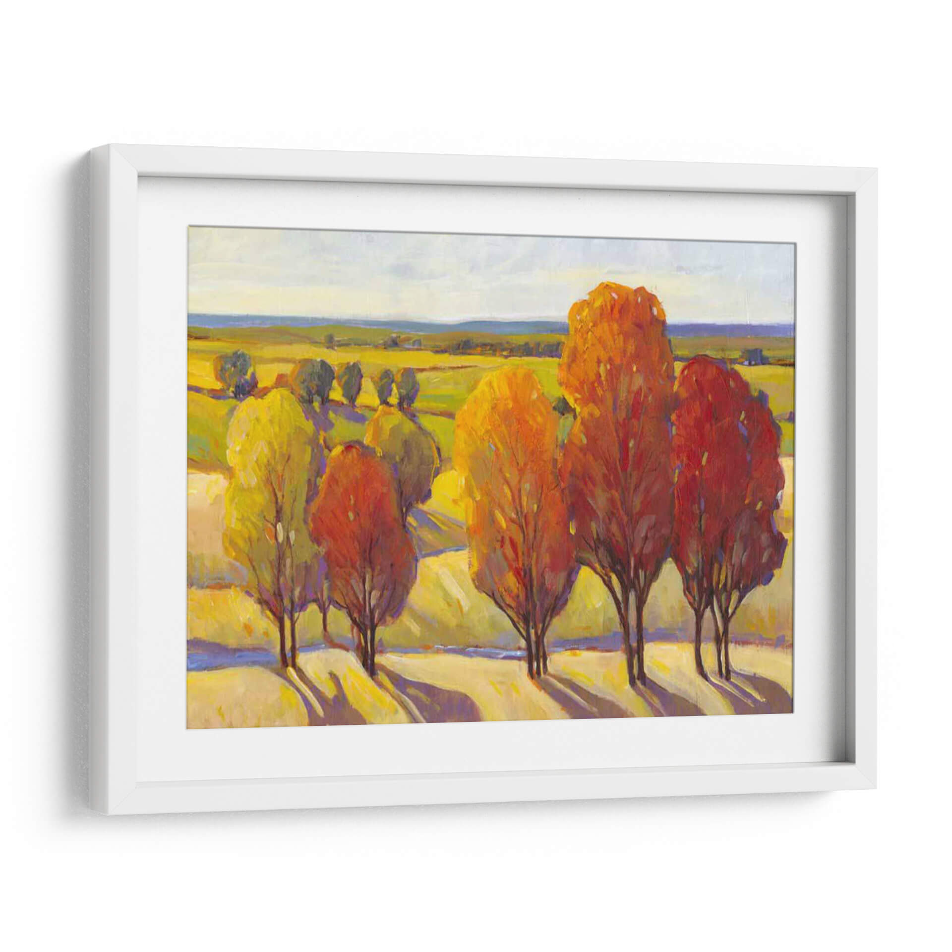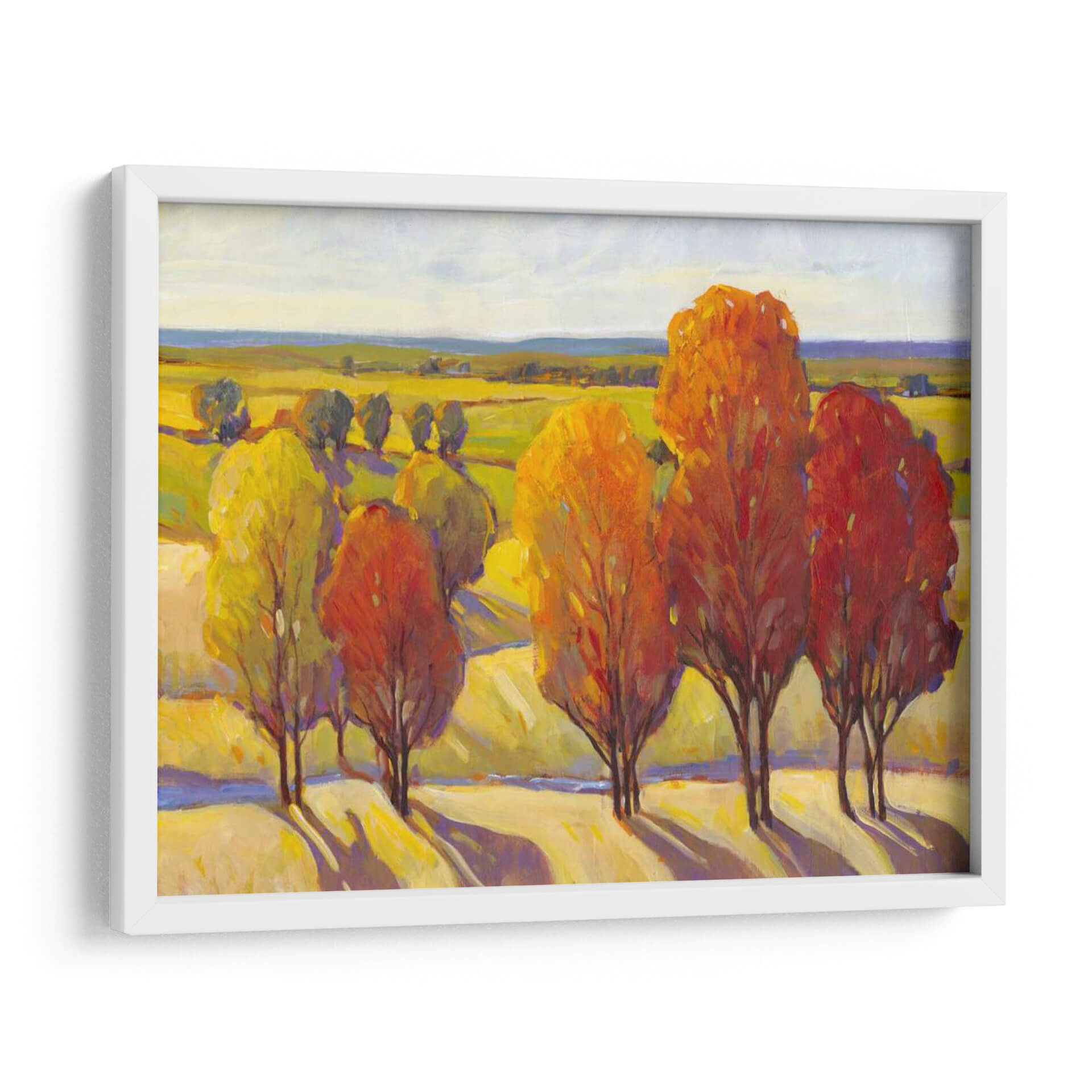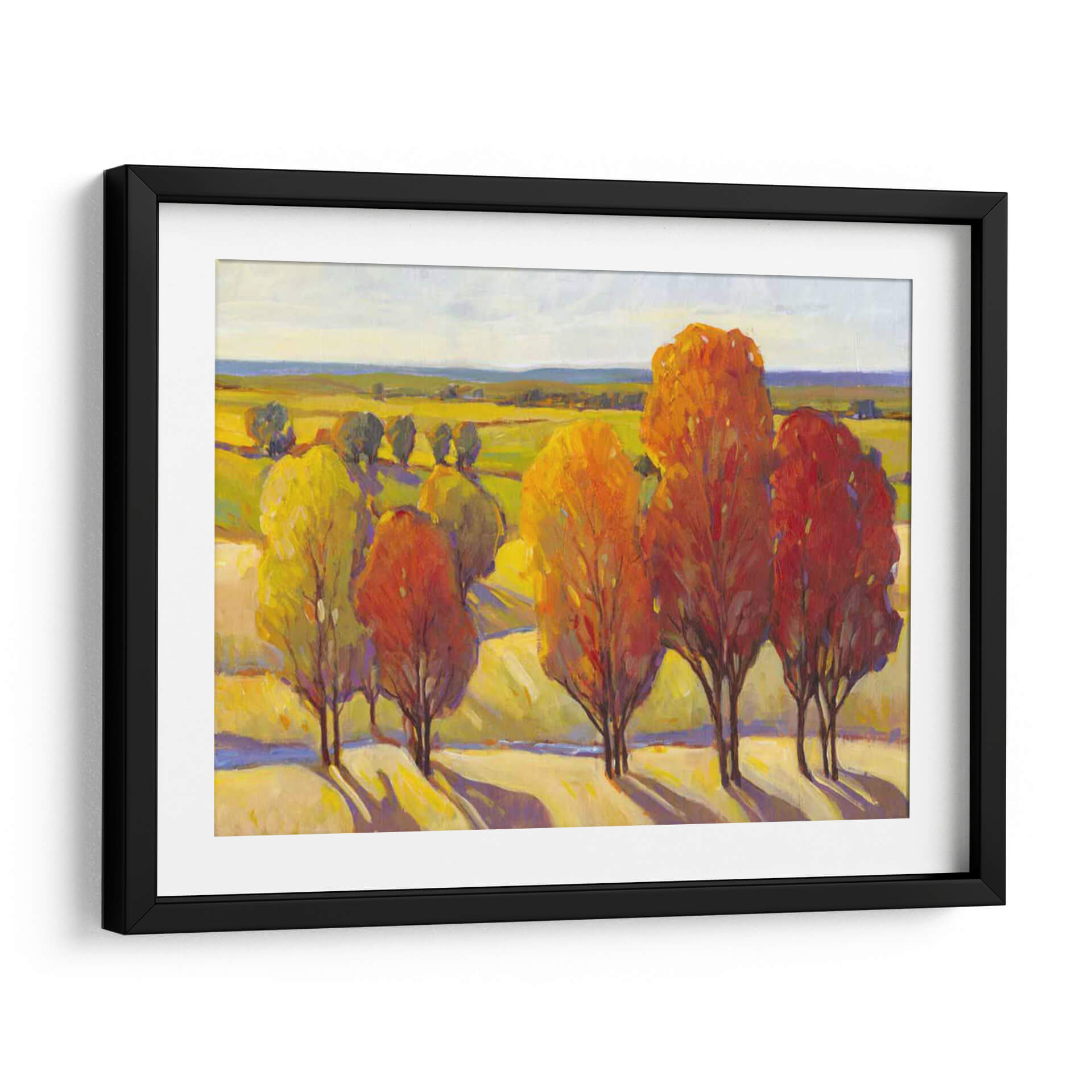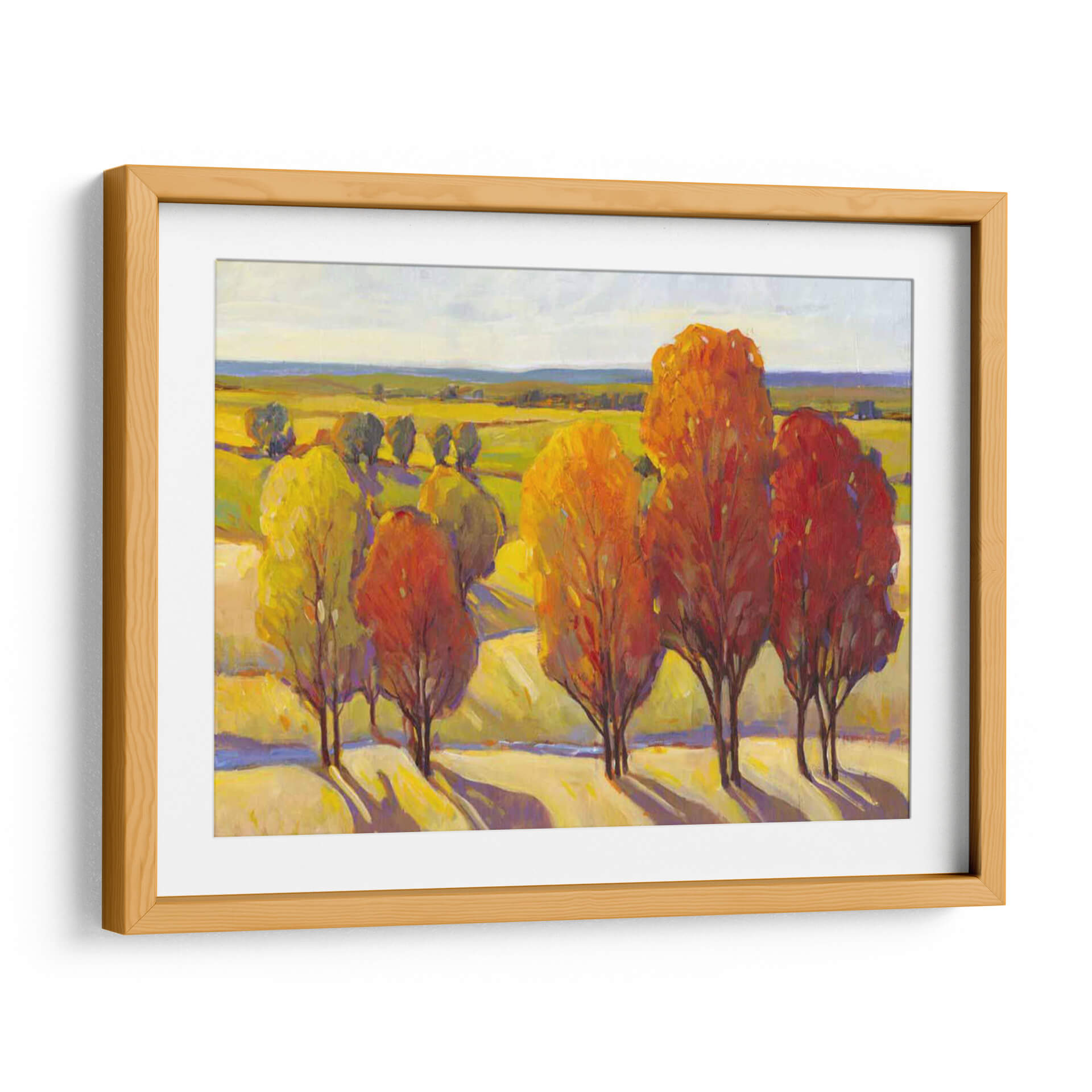 Sumérgete en la calidez y la vitalidad de "Día Resplandor I", una obra de arte contemporáneo que captura la esencia del otoño con una explosión de colores vibrantes. Este cuadro decorativo presenta un paisaje rural bañado por la luz dorada de una tarde soleada, donde los árboles se alzan con sus copas teñidas de ocres, naranjas intensos y rojos profundos. La pincelada audaz y expresiva del artista Tim O'Toole da vida a cada elemento, desde las formas suaves de las colinas hasta las sombras alargadas que se proyectan sobre el terreno, creando una sensación de profundidad y movimiento. La paleta de colores, dominada por tonos tierra cálidos y acentos de azul cielo, evoca una atmósfera de serenidad y optimismo. "Día Resplandor I" es la pieza perfecta para añadir un toque de naturaleza y energía a tu hogar u oficina, transformando cualquier espacio en un refugio acogedor y lleno de luz. Ideal para salones modernos, recibidores o estudios que buscan una inyección de color y una conexión con la belleza del paisaje otoñal. Un cuadro que inspira contemplación y renueva el espíritu.