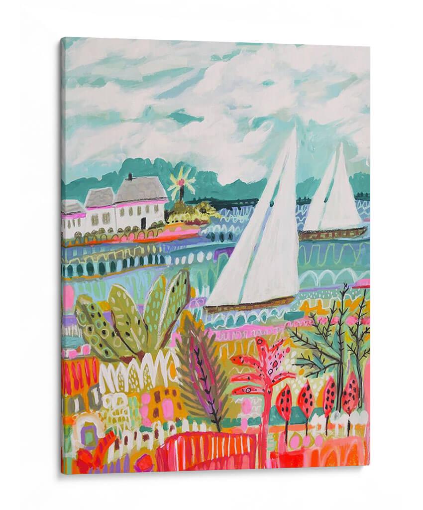 Adéntrate en un mundo de color y serenidad con "Dos Veleros Y Casa De Campo II", una obra de arte que captura la esencia de un día costero idílico. Esta pieza vibrante, creada por Karen Fields, te transportará a un paisaje marítimo lleno de vida y alegría. La composición presenta dos veleros con sus velas blancas desplegadas, navegando en aguas turquesas, mientras que a lo lejos se vislumbra una encantadora casa de campo con detalles rosados y un molino de viento. El primer plano está adornado con una explosión de flora colorida, con tonos verdes exuberantes, rosas vibrantes, naranjas y amarillos que crean una textura rica y un ambiente alegre. La paleta de colores es audaz y refrescante, dominada por el azul del cielo y el mar, contrastando con la vitalidad de la vegetación. El estilo, con pinceladas sueltas y una representación semi-abstracta, añade un toque moderno y artístico. Este cuadro decorativo es ideal para infundir calma y un toque de escapismo en tu hogar u oficina, funcionando perfectamente como punto focal en una sala de estar, comedor o dormitorio, aportando una atmósfera de vacaciones y tranquilidad.