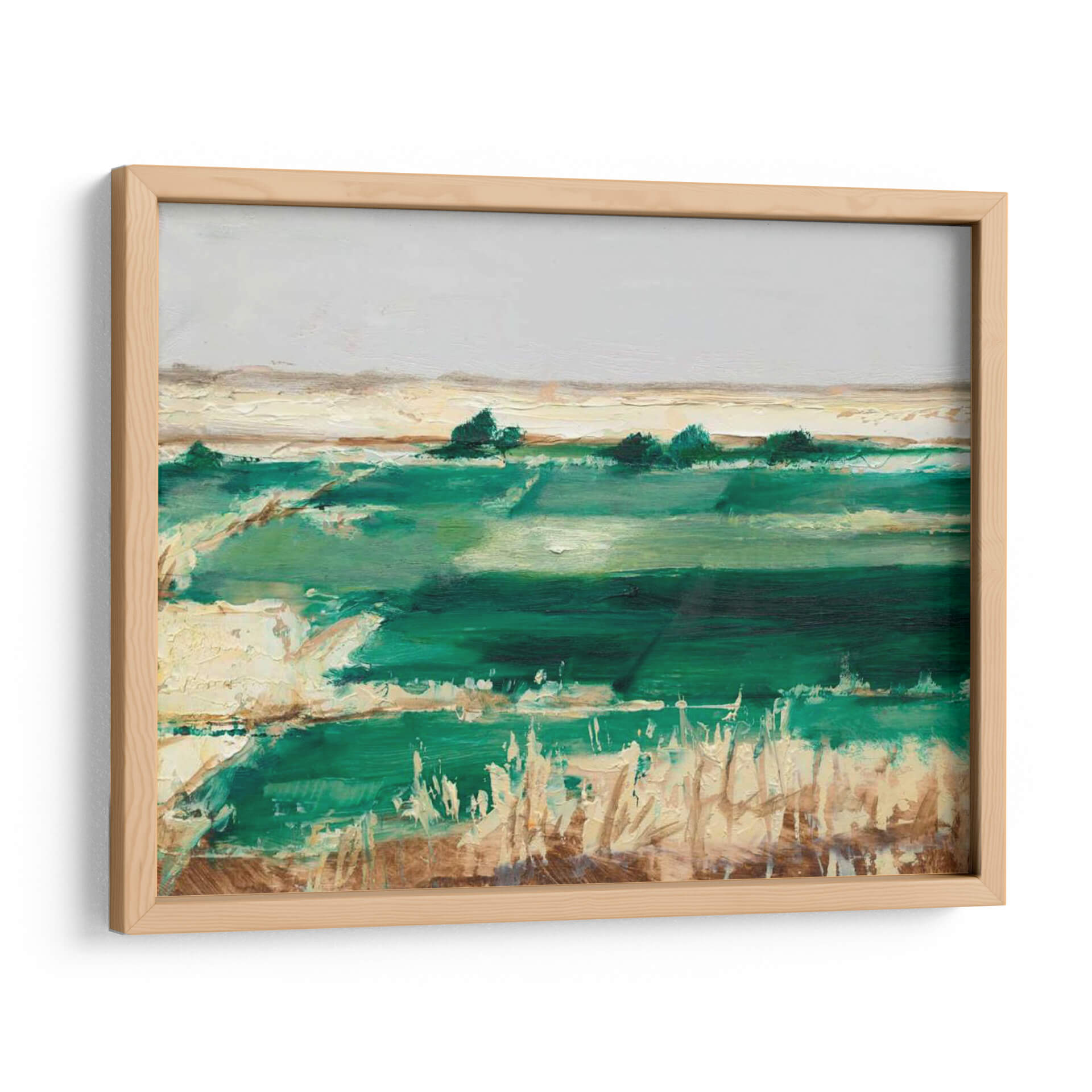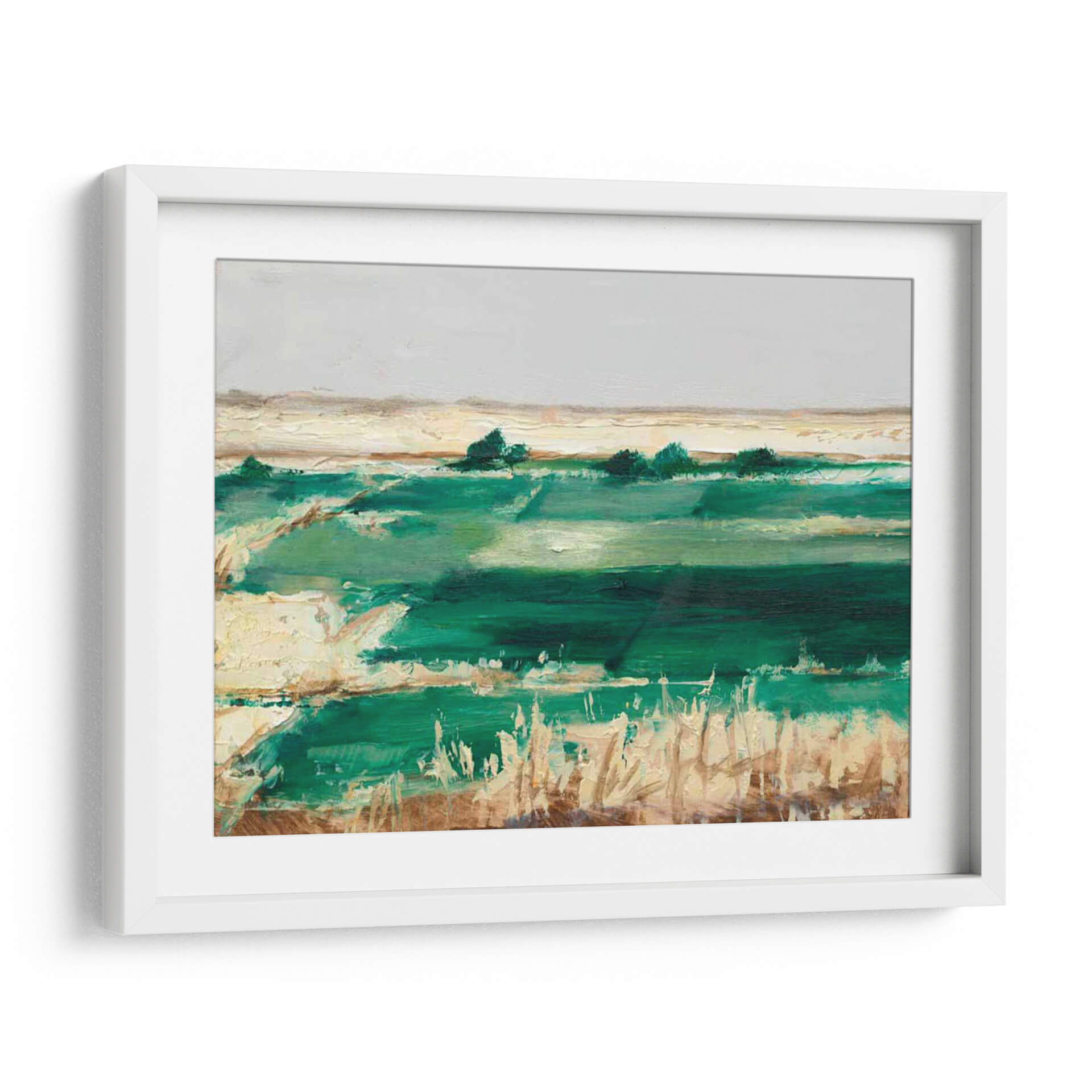 Sumérgete en la serenidad de "Emerald Fields II", una obra de arte contemporáneo que captura la esencia vibrante de un paisaje natural con un toque abstracto. El artista Ethan Harper nos transporta a través de un lienzo dominado por intensos verdes esmeralda, que fluyen en capas y texturas, evocando la frescura de campos exuberantes y el susurro del viento entre la hierba alta. La paleta de colores, aunque centrada en el verde, se complementa con toques de ocres y blancos cálidos, creando un contraste sutil pero efectivo que aporta profundidad y realismo a la escena. La composición, con sus horizontes definidos y la pincelada expresiva, transmite una sensación de calma y conexión con la naturaleza, ideal para quienes buscan un refugio visual en sus espacios. Este cuadro decorativo es perfecto para añadir un punto de interés natural y sofisticado a salas de estar, dormitorios u oficinas, transformando cualquier ambiente en un oasis de tranquilidad y belleza artística. Su estilo abstracto-impresionista invita a la contemplación, permitiendo que cada espectador descubra sus propias interpretaciones en las formas y colores.