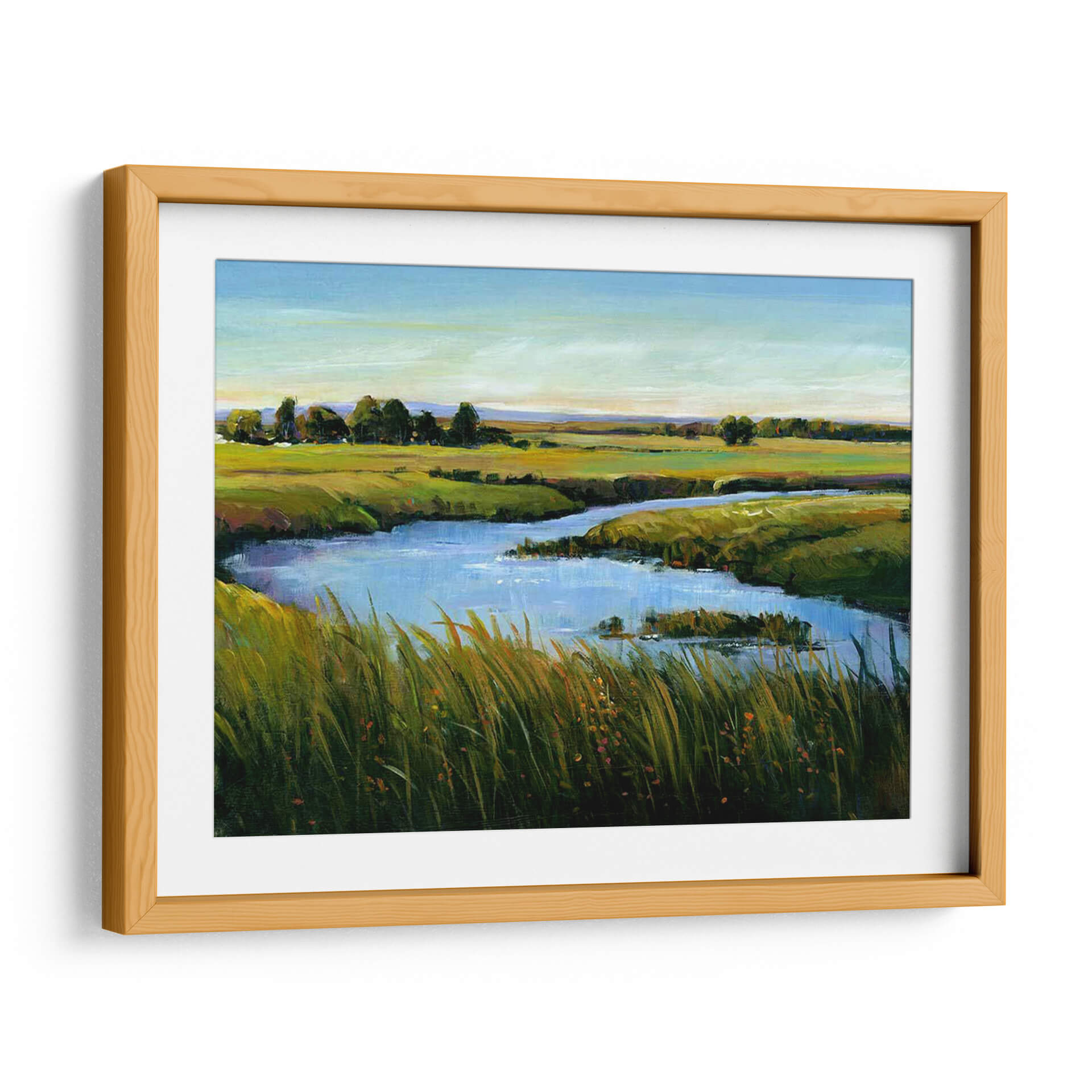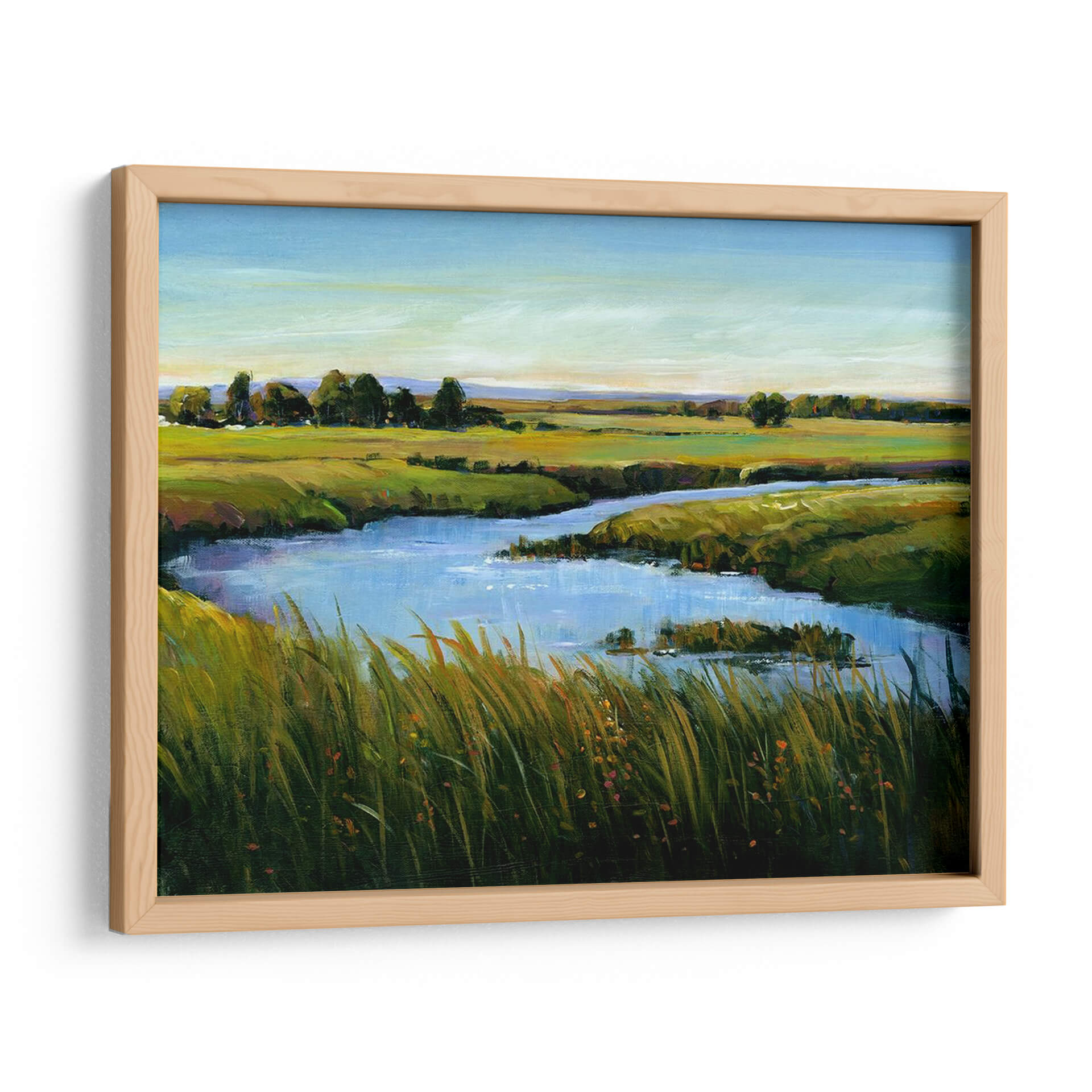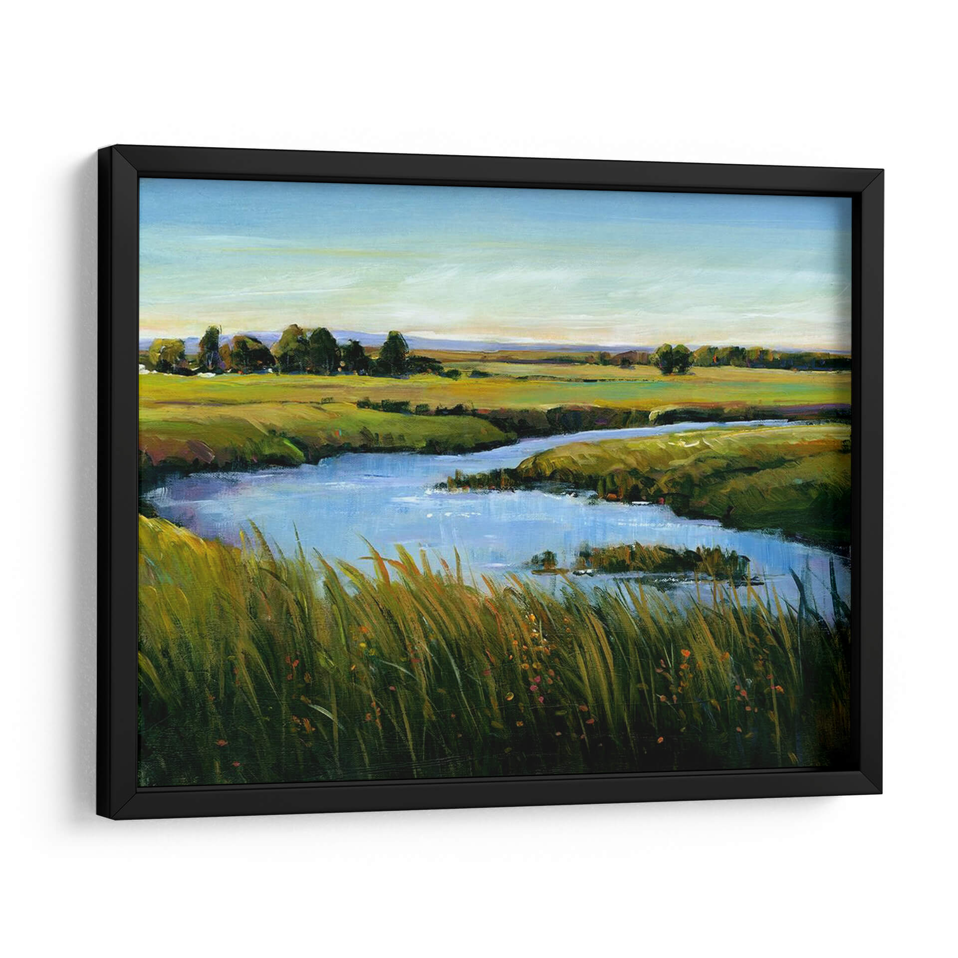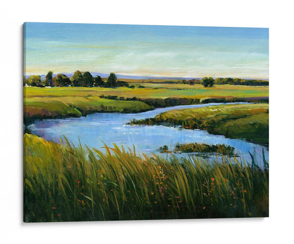 Sumérgete en la serenidad de "En El Borde Ii", una cautivadora obra de arte que captura la esencia de un paisaje natural vibrante y tranquilo. El artista Tim O'Toole nos transporta a un escenario donde un río de aguas cristalinas serpentea a través de exuberantes campos verdes, bordeado por una vegetación alta y dorada que se mece suavemente con la brisa. La paleta de colores, dominada por azules celestes, verdes intensos y toques cálidos de amarillo y ocre, crea una atmósfera de paz y armonía. La técnica pictórica, con pinceladas visibles pero equilibradas, añade textura y profundidad a la composición, invitando al espectador a explorar cada detalle de este idílico rincón de la naturaleza. Este cuadro decorativo es ideal para infundir calma y conexión con el entorno en cualquier espacio, desde una sala de estar moderna hasta un sereno dormitorio o una oficina que busque un toque de inspiración natural. "En El Borde Ii" no es solo una imagen, es una ventana a la tranquilidad, un recordatorio del poder restaurador de la naturaleza, listo para transformar tu hogar en un santuario de paz y belleza.