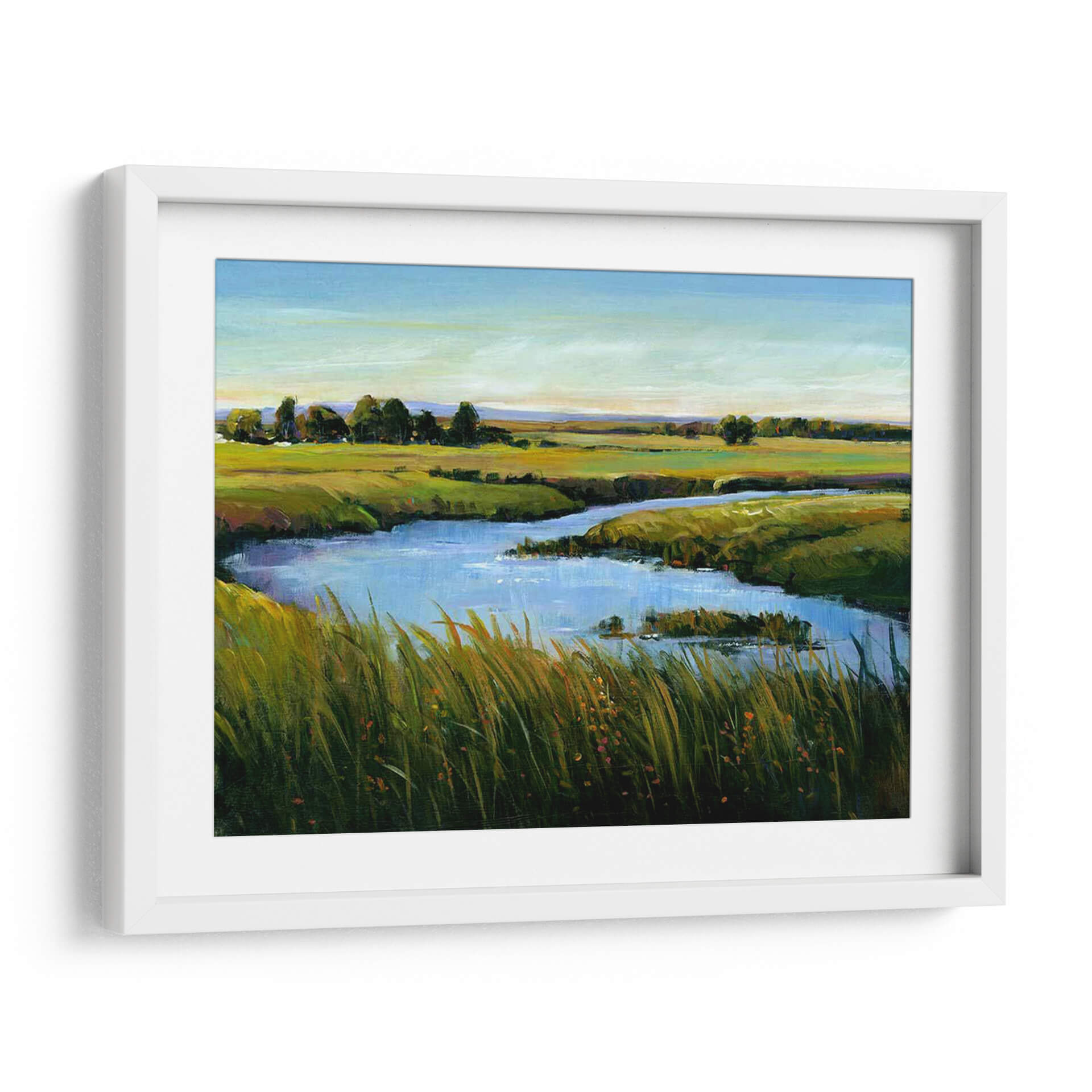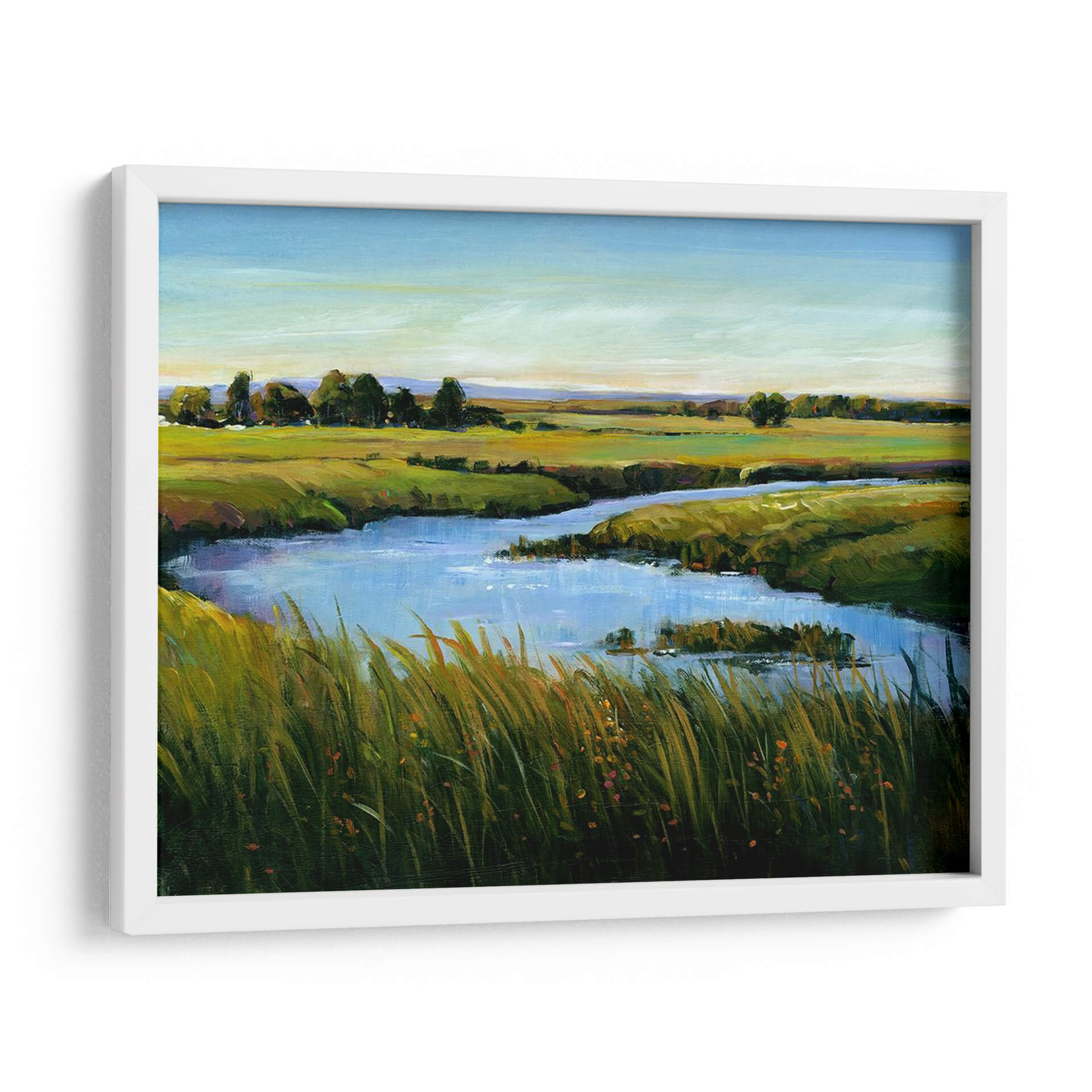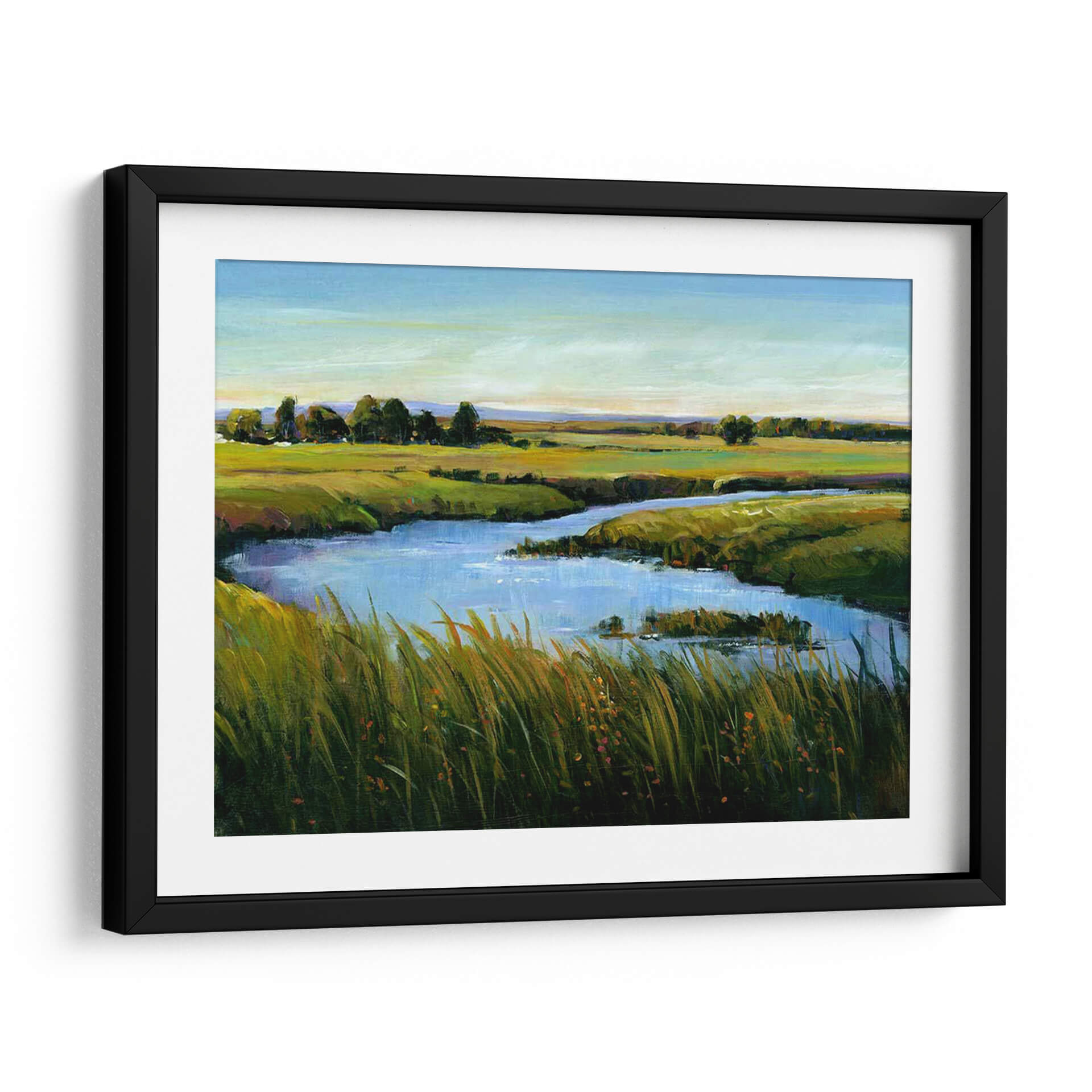 Sumérgete en la serenidad de "En El Borde Ii", una cautivadora obra de arte que captura la esencia de un paisaje natural vibrante y tranquilo. El artista Tim O'Toole nos transporta a un escenario donde un río de aguas cristalinas serpentea a través de exuberantes campos verdes, bordeado por una vegetación alta y dorada que se mece suavemente con la brisa. La paleta de colores, dominada por azules celestes, verdes intensos y toques cálidos de amarillo y ocre, crea una atmósfera de paz y armonía. La técnica pictórica, con pinceladas visibles pero equilibradas, añade textura y profundidad a la composición, invitando al espectador a explorar cada detalle de este idílico rincón de la naturaleza. Este cuadro decorativo es ideal para infundir calma y conexión con el entorno en cualquier espacio, desde una sala de estar moderna hasta un sereno dormitorio o una oficina que busque un toque de inspiración natural. "En El Borde Ii" no es solo una imagen, es una ventana a la tranquilidad, un recordatorio del poder restaurador de la naturaleza, listo para transformar tu hogar en un santuario de paz y belleza.