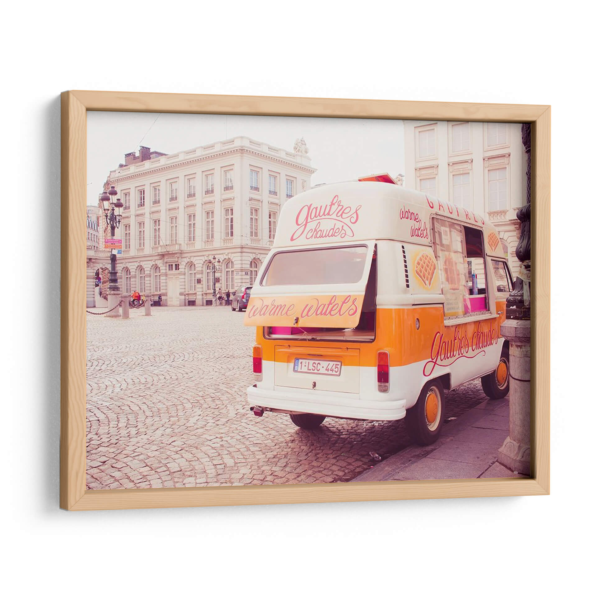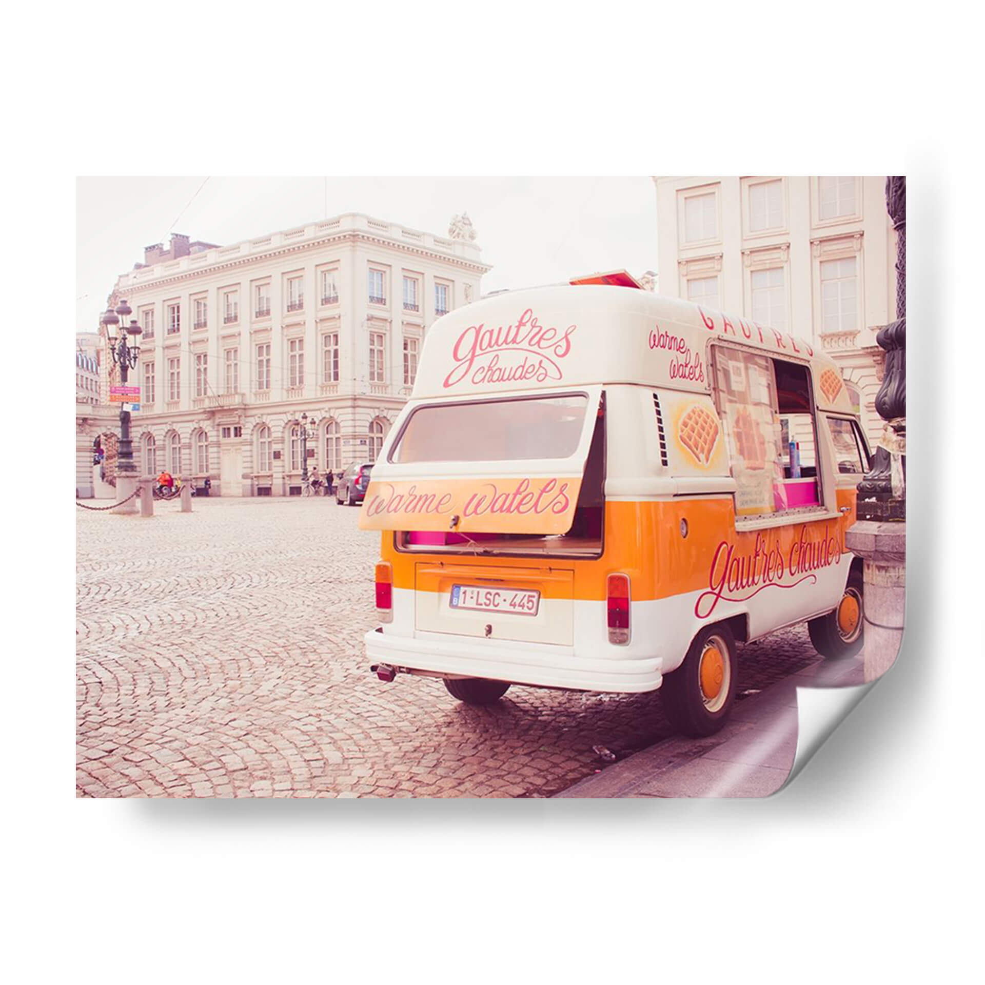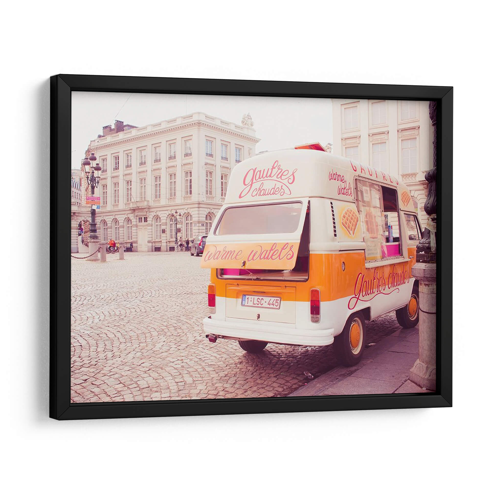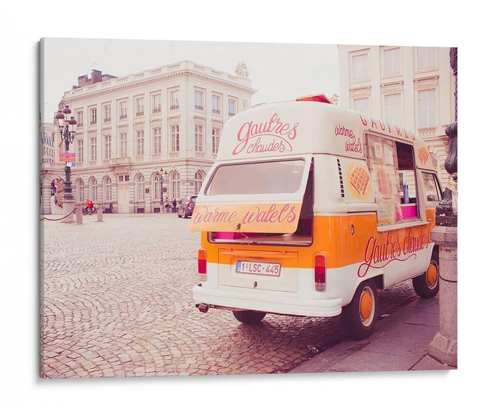 Este cautivador cuadro decorativo, titulado 'Encantos Europeos I' de Sonja Quintero, captura la esencia de una pintoresca escena urbana con un toque nostálgico. La obra presenta un icónico food truck de gofres, vibrante en tonos naranja y blanco, estacionado en una calle adoquinada de Europa. Detrás, se alza una majestuosa edificación de arquitectura clásica, aportando un aire de sofisticación y historia al conjunto. La paleta de colores pastel, con predominancia de ocres, cremas y toques rosados, baña la escena en una luz suave y etérea, evocando una sensación de calidez y tranquilidad. La composición, con el food truck como punto focal y el edificio histórico de fondo, crea una narrativa visual que transporta al espectador a un momento de dulzura y encanto cotidiano. Ideal para añadir un aire de sofisticación europea y un toque de dulzura a la decoración de tu sala de estar, cocina o comedor, este cuadro es perfecto para aquellos que aprecian el arte que combina lo urbano con lo idílico.