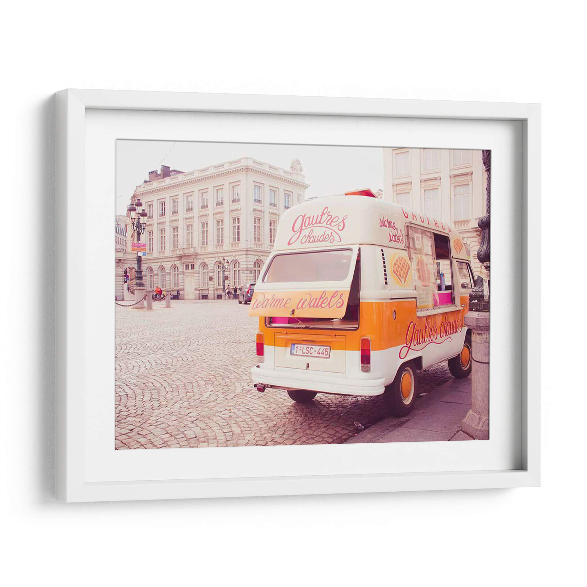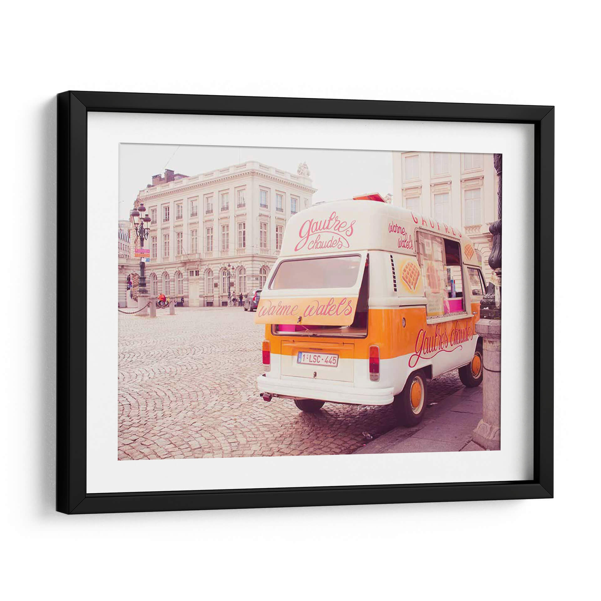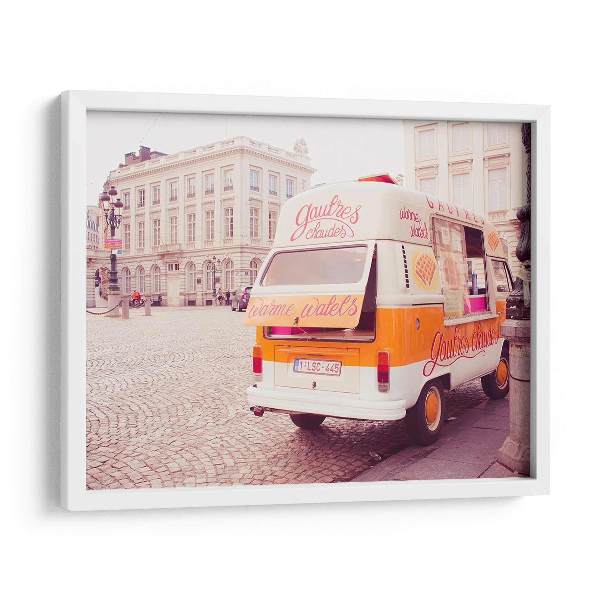 Este cautivador cuadro decorativo, titulado 'Encantos Europeos I' de Sonja Quintero, captura la esencia de una pintoresca escena urbana con un toque nostálgico. La obra presenta un icónico food truck de gofres, vibrante en tonos naranja y blanco, estacionado en una calle adoquinada de Europa. Detrás, se alza una majestuosa edificación de arquitectura clásica, aportando un aire de sofisticación y historia al conjunto. La paleta de colores pastel, con predominancia de ocres, cremas y toques rosados, baña la escena en una luz suave y etérea, evocando una sensación de calidez y tranquilidad. La composición, con el food truck como punto focal y el edificio histórico de fondo, crea una narrativa visual que transporta al espectador a un momento de dulzura y encanto cotidiano. Ideal para añadir un aire de sofisticación europea y un toque de dulzura a la decoración de tu sala de estar, cocina o comedor, este cuadro es perfecto para aquellos que aprecian el arte que combina lo urbano con lo idílico.