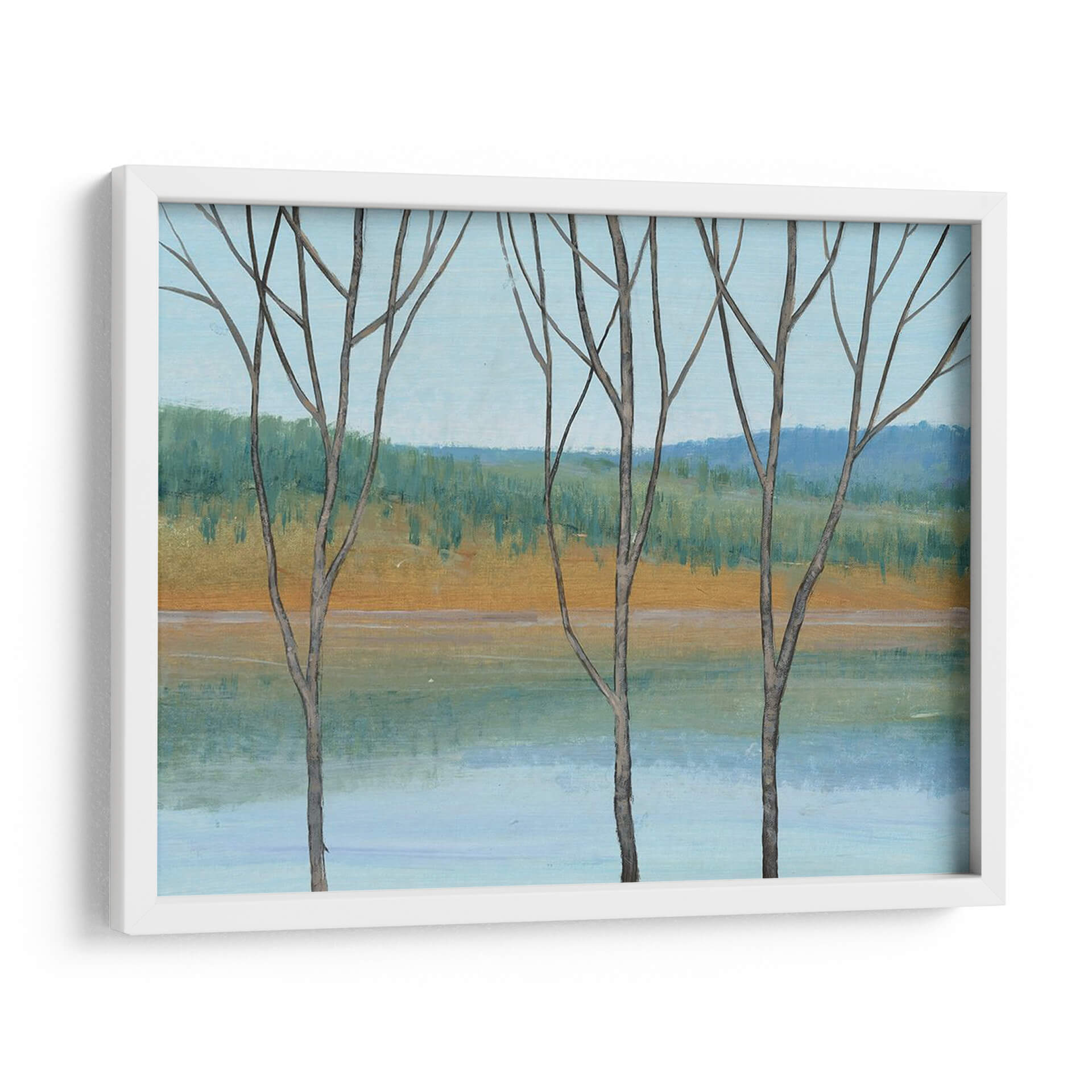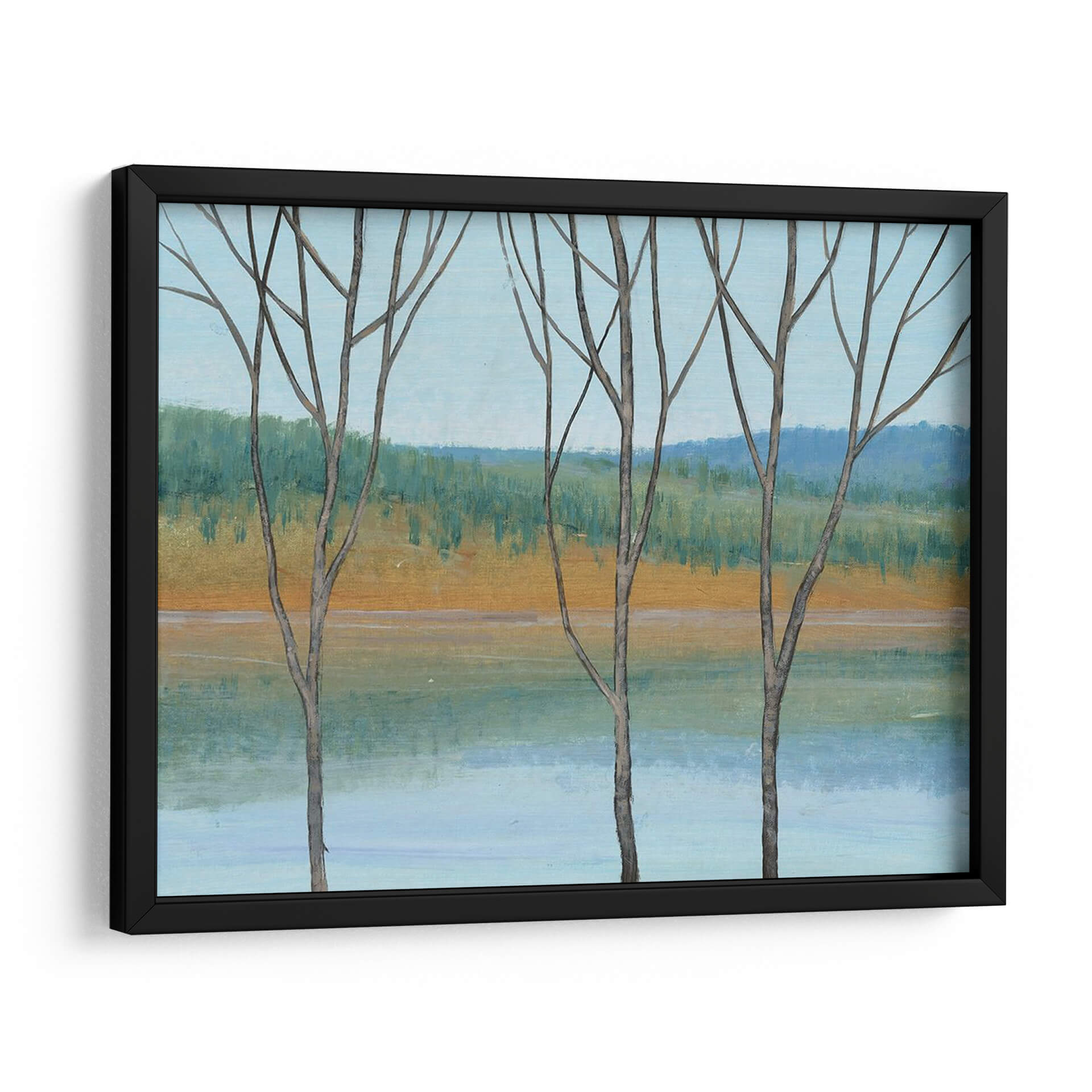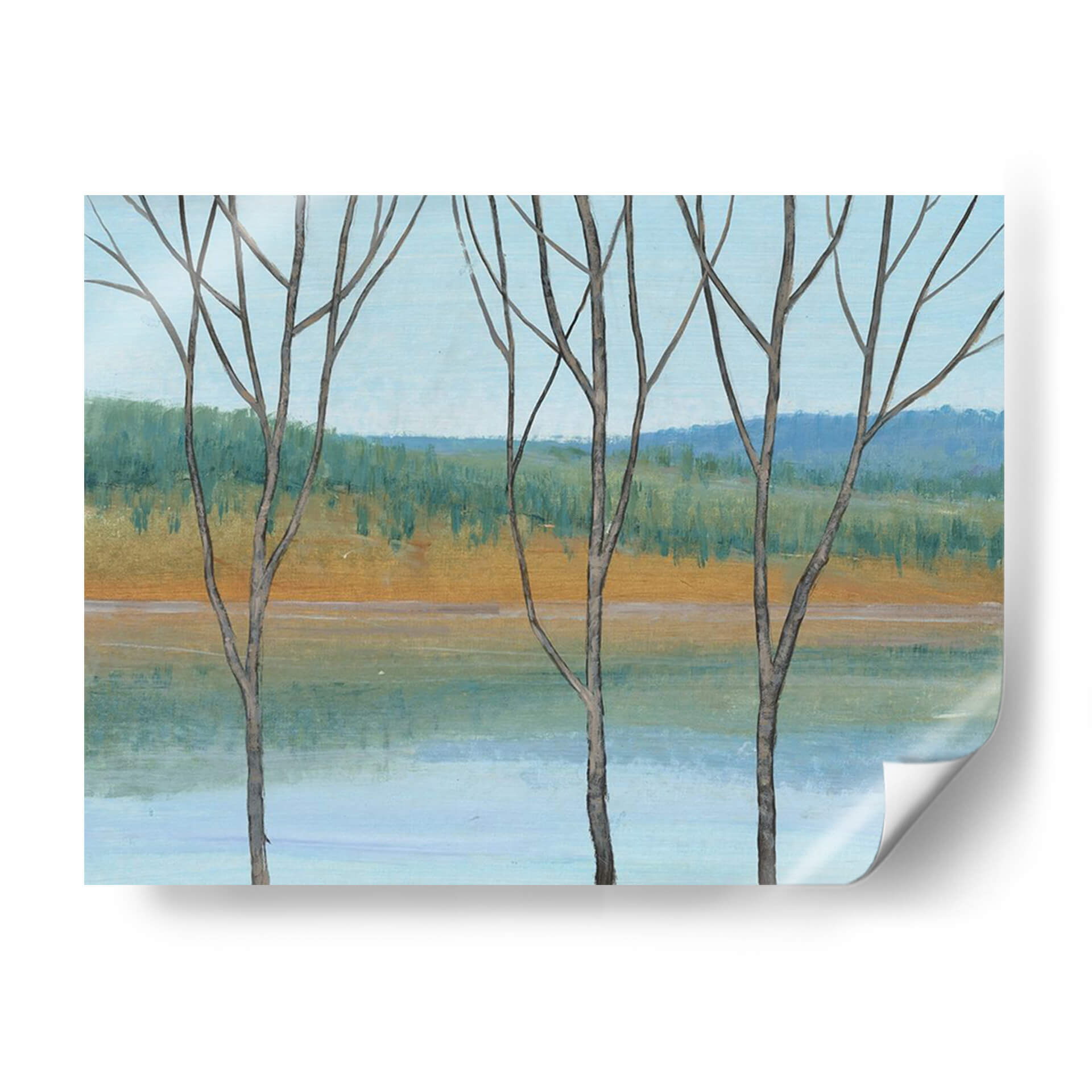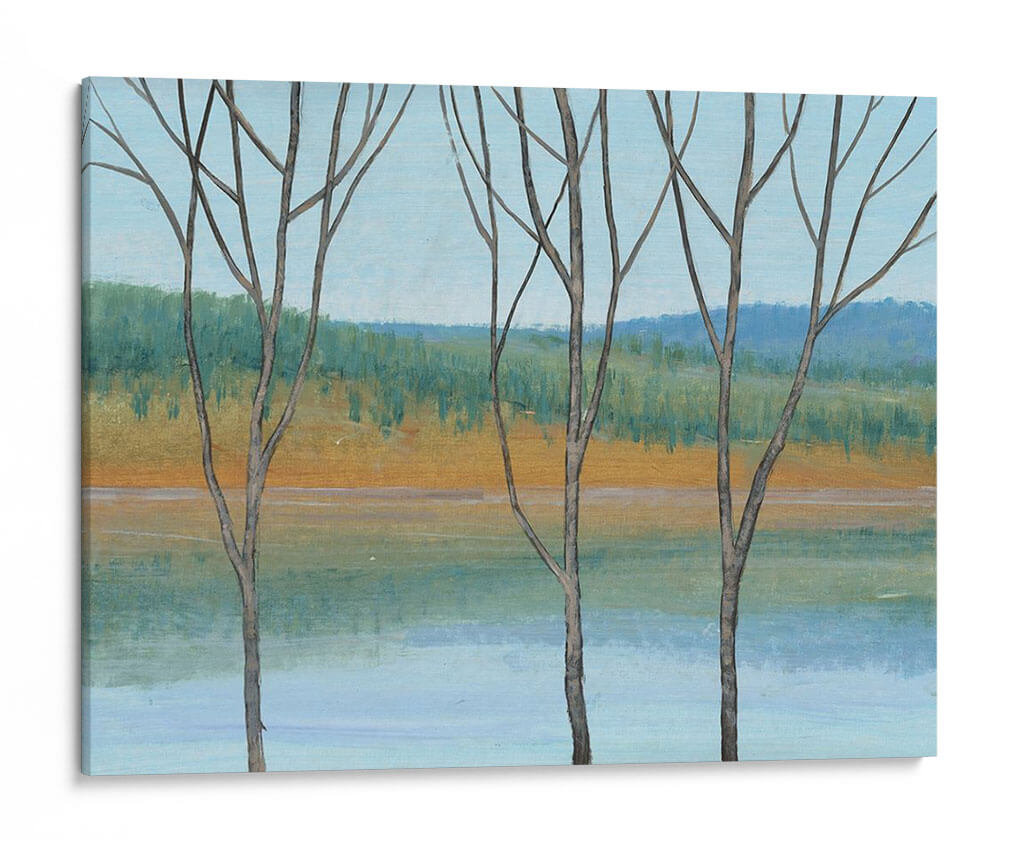Sumérgete en la serenidad de "Entre El Agua Iii", una obra cautivadora del artista Tim O'Toole. Este cuadro decorativo presenta un paisaje evocador que captura la delicada belleza de la naturaleza en una paleta de colores armoniosos. Tres siluetas de árboles estilizados se alzan en primer plano, sus ramas desnudas contrastando suavemente con el fondo. El artista emplea trazos expresivos para definir una orilla dorada que se funde con un agua serena de tonos celestes y turquesas, mientras que el horizonte se tiñe de un verde frondoso y azules profundos, evocando una sensación de paz y tranquilidad. El estilo, que se inclina hacia el impresionismo moderno con toques de abstracción, permite al espectador interpretar la escena a través de sus propias emociones. La composición equilibrada y la atmósfera contemplativa hacen de "Entre El Agua Iii" una pieza ideal para añadir un toque de calma y sofisticación a cualquier espacio, ya sea una sala de estar, un dormitorio o una oficina que busque un refugio visual de la vida cotidiana. Este cuadro decorativo es perfecto para quienes aprecian el arte inspirado en la naturaleza y buscan infundir sus entornos con una vibra relajante y estéticamente agradable, transformando cualquier pared en una ventana a la serenidad.