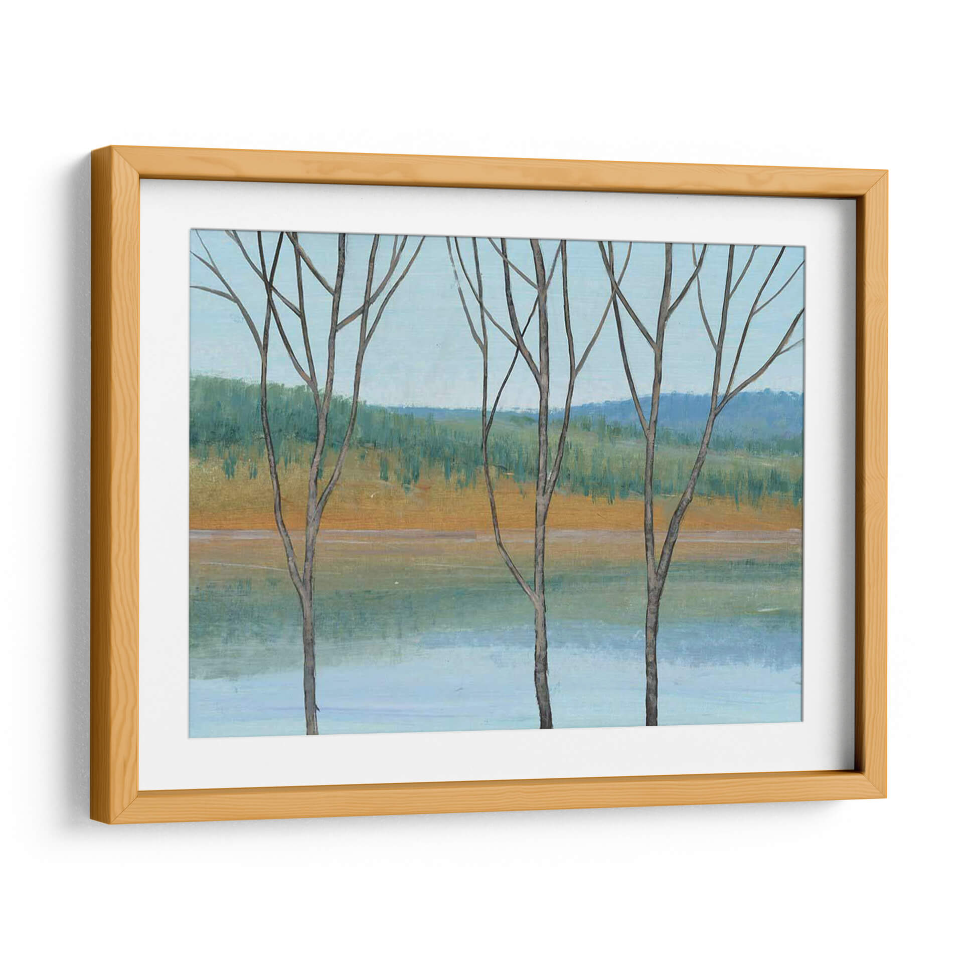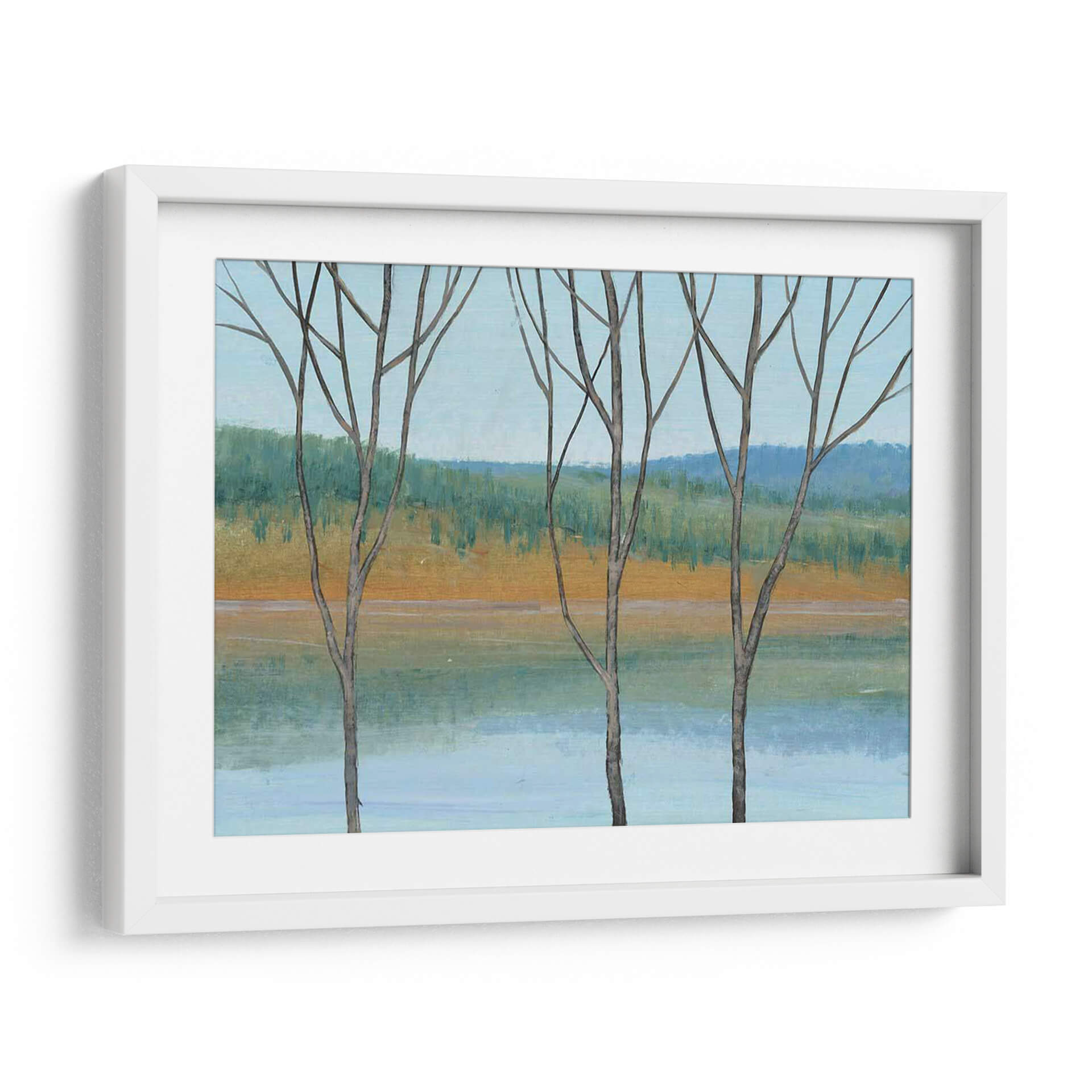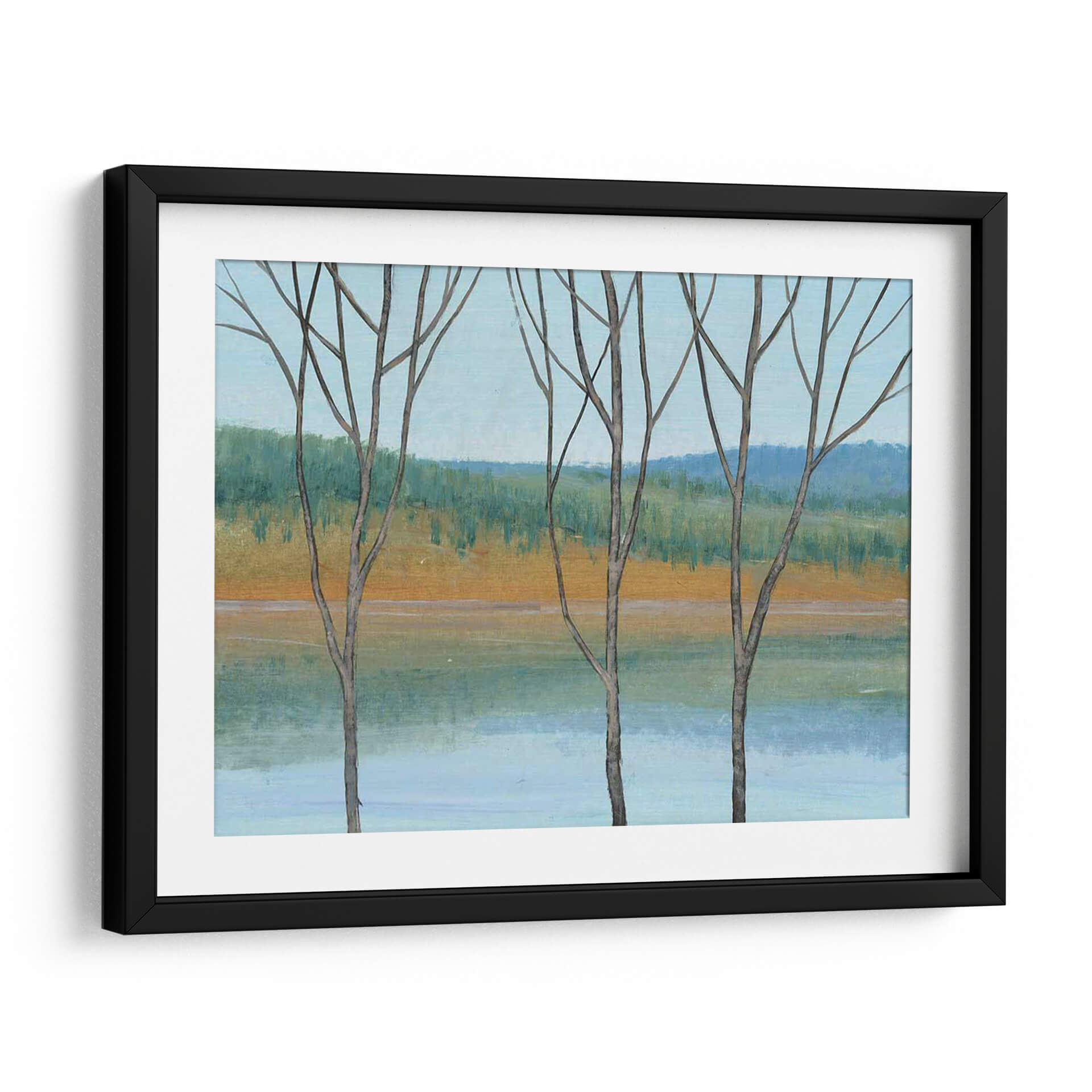 Sumérgete en la serenidad de "Entre El Agua Iii", una obra cautivadora del artista Tim O'Toole. Este cuadro decorativo presenta un paisaje evocador que captura la delicada belleza de la naturaleza en una paleta de colores armoniosos. Tres siluetas de árboles estilizados se alzan en primer plano, sus ramas desnudas contrastando suavemente con el fondo. El artista emplea trazos expresivos para definir una orilla dorada que se funde con un agua serena de tonos celestes y turquesas, mientras que el horizonte se tiñe de un verde frondoso y azules profundos, evocando una sensación de paz y tranquilidad. El estilo, que se inclina hacia el impresionismo moderno con toques de abstracción, permite al espectador interpretar la escena a través de sus propias emociones. La composición equilibrada y la atmósfera contemplativa hacen de "Entre El Agua Iii" una pieza ideal para añadir un toque de calma y sofisticación a cualquier espacio, ya sea una sala de estar, un dormitorio o una oficina que busque un refugio visual de la vida cotidiana. Este cuadro decorativo es perfecto para quienes aprecian el arte inspirado en la naturaleza y buscan infundir sus entornos con una vibra relajante y estéticamente agradable, transformando cualquier pared en una ventana a la serenidad.