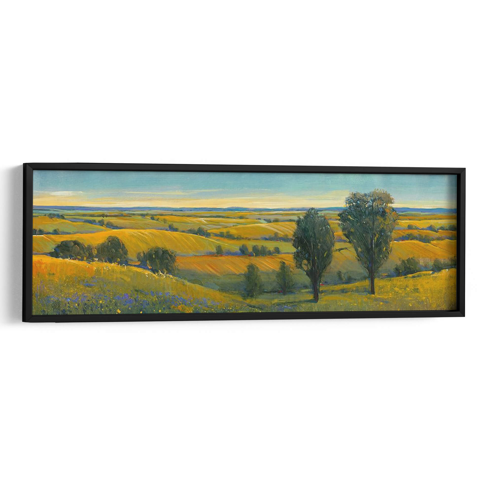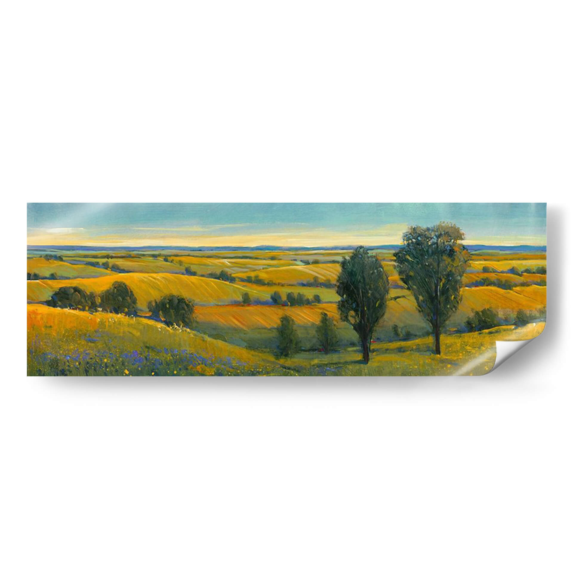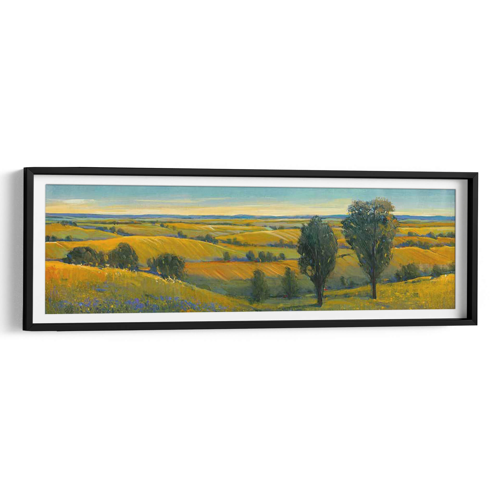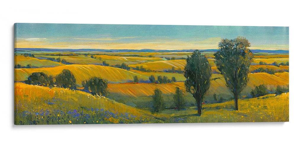 Sumérgete en la serena belleza de "Escena Pintoresca II", una obra maestra de Tim O'Toole que captura la esencia de un paisaje rural bañado por el sol. Este cuadro decorativo, pintado con una técnica impresionista vibrante, transporta al espectador a un campo dorado donde las colinas ondulantes se extienden hasta el horizonte bajo un cielo azul claro. Los tonos cálidos de amarillo y ocre dominan la paleta, evocando una sensación de calidez, abundancia y tranquilidad. La composición, dividida sutilmente por la línea del horizonte y acentuada por la presencia de dos árboles imponentes en primer plano, crea una profundidad visual cautivadora. Las pinceladas expresivas y el juego de luces y sombras añaden textura y vida a la escena, invitando a la contemplación. "Escena Pintoresca II" es ideal para infundir paz y un toque de naturaleza a cualquier espacio, ya sea una sala de estar, un comedor o un estudio, convirtiéndose en un punto focal que inspira calma y conexión con la tierra. Añade esta pieza artística única a tu colección y transforma tu hogar en un refugio de serenidad y belleza.
