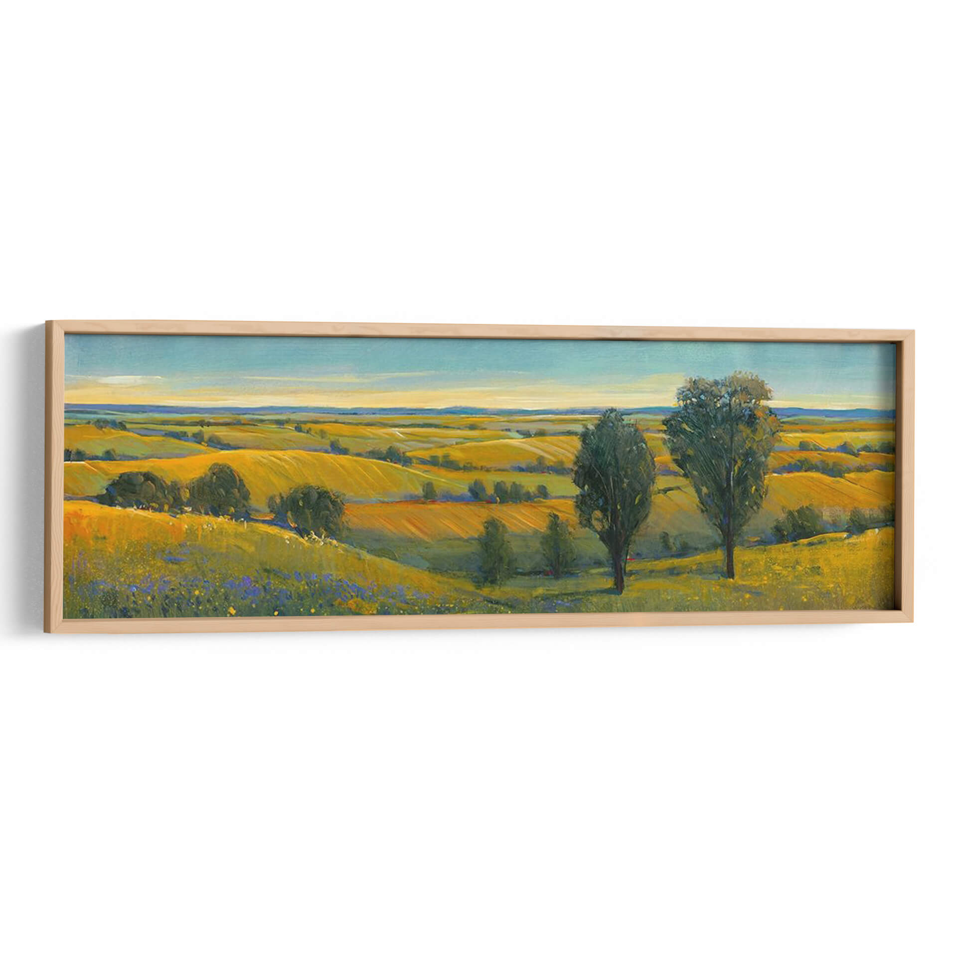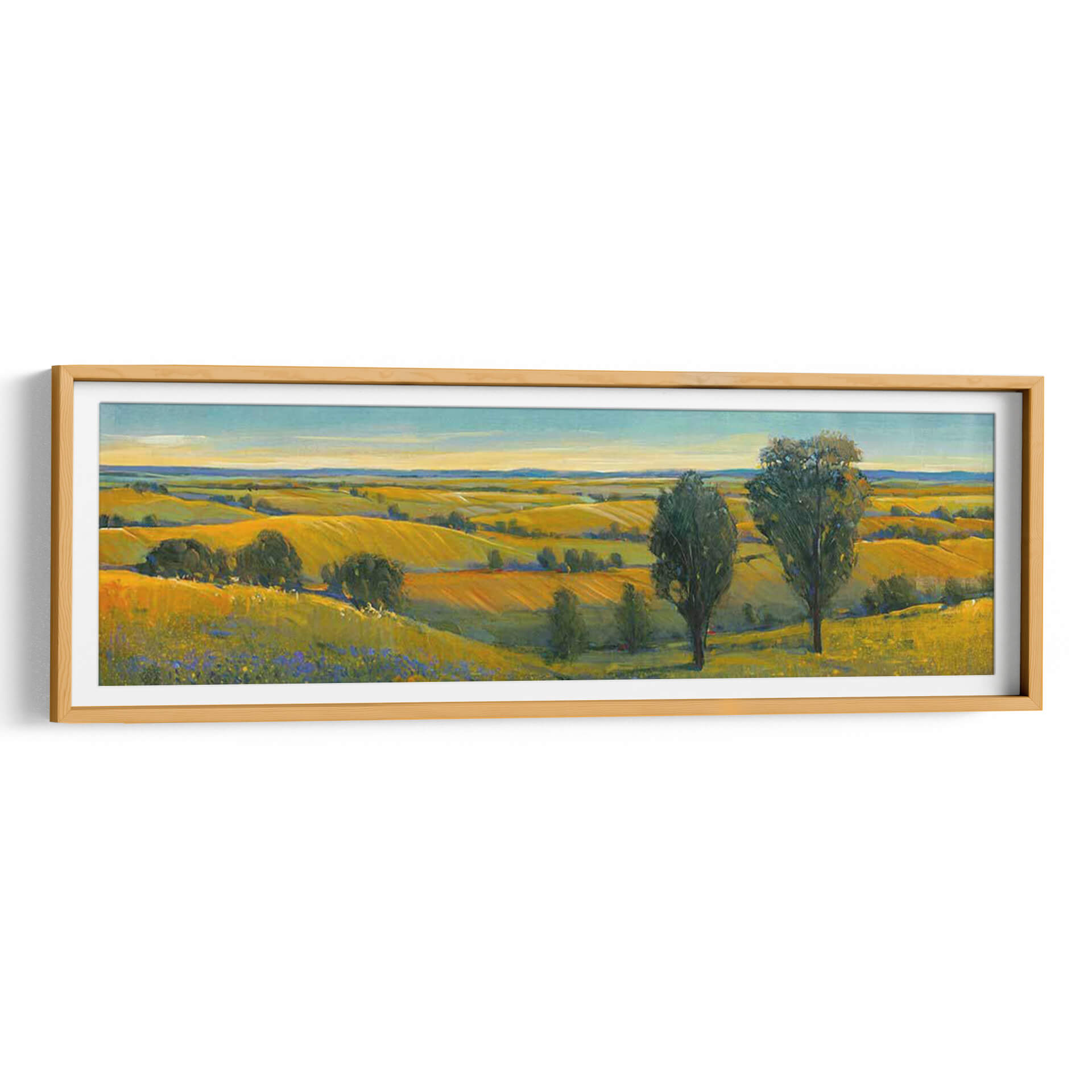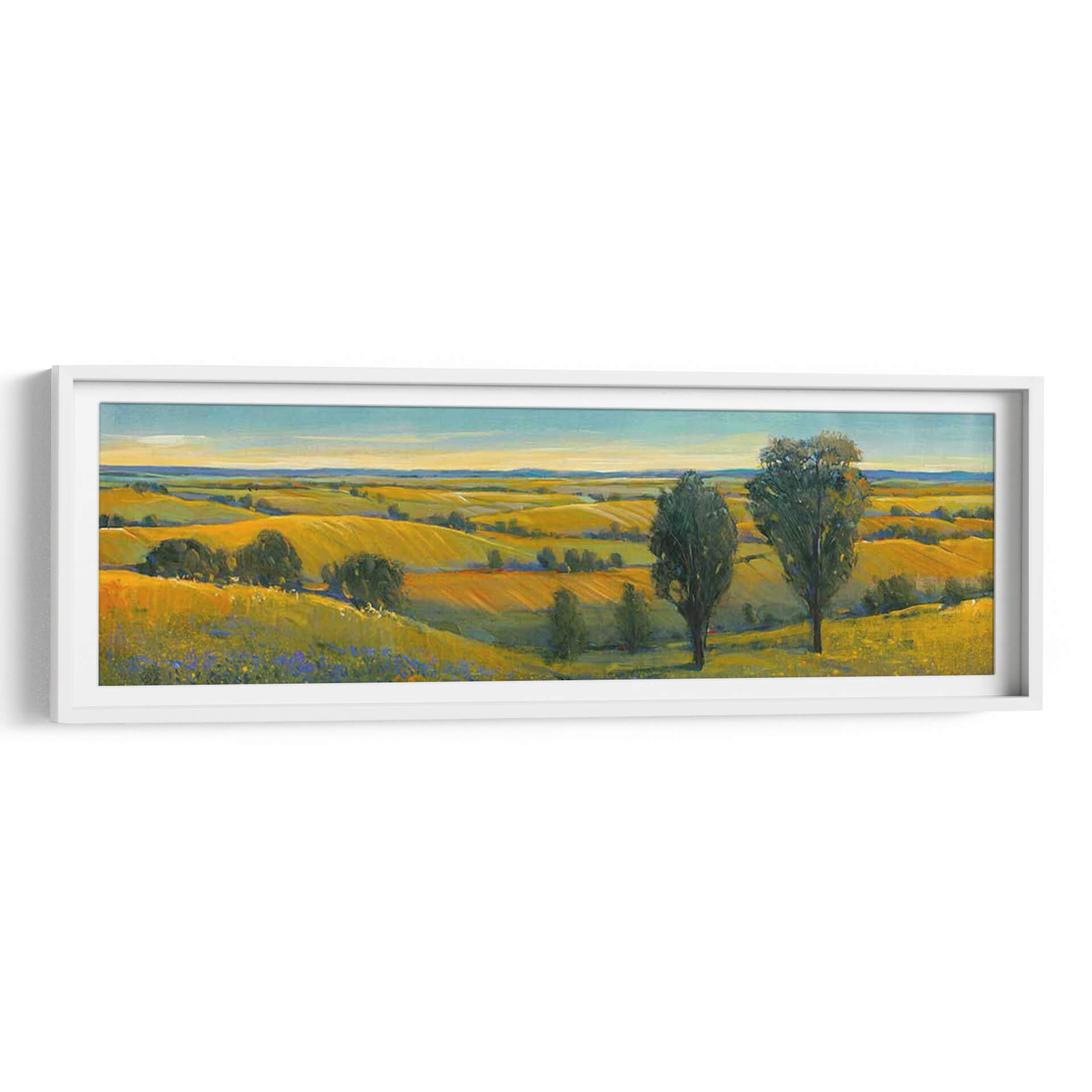 Sumérgete en la serena belleza de "Escena Pintoresca II", una obra maestra de Tim O'Toole que captura la esencia de un paisaje rural bañado por el sol. Este cuadro decorativo, pintado con una técnica impresionista vibrante, transporta al espectador a un campo dorado donde las colinas ondulantes se extienden hasta el horizonte bajo un cielo azul claro. Los tonos cálidos de amarillo y ocre dominan la paleta, evocando una sensación de calidez, abundancia y tranquilidad. La composición, dividida sutilmente por la línea del horizonte y acentuada por la presencia de dos árboles imponentes en primer plano, crea una profundidad visual cautivadora. Las pinceladas expresivas y el juego de luces y sombras añaden textura y vida a la escena, invitando a la contemplación. "Escena Pintoresca II" es ideal para infundir paz y un toque de naturaleza a cualquier espacio, ya sea una sala de estar, un comedor o un estudio, convirtiéndose en un punto focal que inspira calma y conexión con la tierra. Añade esta pieza artística única a tu colección y transforma tu hogar en un refugio de serenidad y belleza.