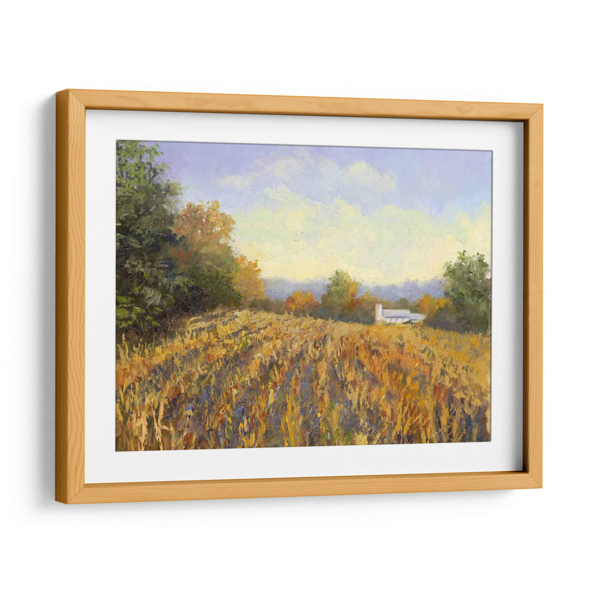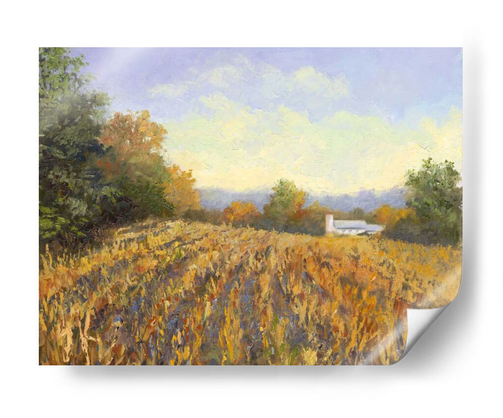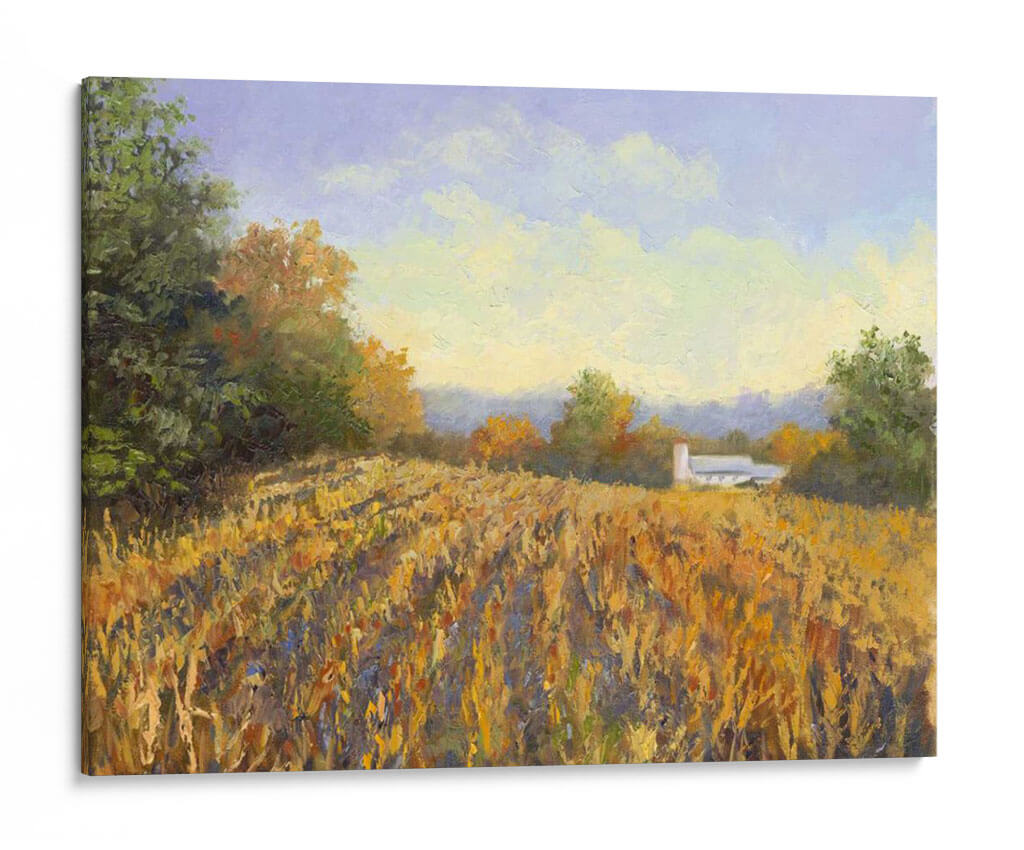 Sumérgete en la serenidad del campo con "Filas de Maíz", una obra de arte que captura la esencia de un atardecer dorado en un paisaje rural. Mary Jean Weber nos transporta a través de pinceladas expresivas y una paleta de colores cálidos que evocan la tranquilidad de la naturaleza en otoño. El primer plano muestra un campo de maíz maduro, con sus espigas doradas y ocres meciéndose suavemente bajo la luz del sol poniente, creando un juego de sombras y luces que aporta profundidad y textura a la pieza. Al fondo, se vislumbra una pintoresca granja de color blanco, rodeada de árboles que exhiben los vibrantes tonos rojizos y anaranjados del cambio de estación, coronando el horizonte con colinas tenues. El cielo, con sus nubes esponjosas teñidas de lavanda y amarillo pálido, completa la atmósfera pacífica y nostálgica. Este cuadro decorativo es perfecto para añadir un toque de calidez rústica y serenidad a tu sala de estar, comedor o incluso a un estudio. Su estilo impresionista y su composición paisajística invitan a la contemplación, convirtiéndolo en un punto focal inspirador que evoca la belleza simple y atemporal del entorno rural. Ideal para quienes buscan conectar con la naturaleza y añadir un aire de calma a su hogar.