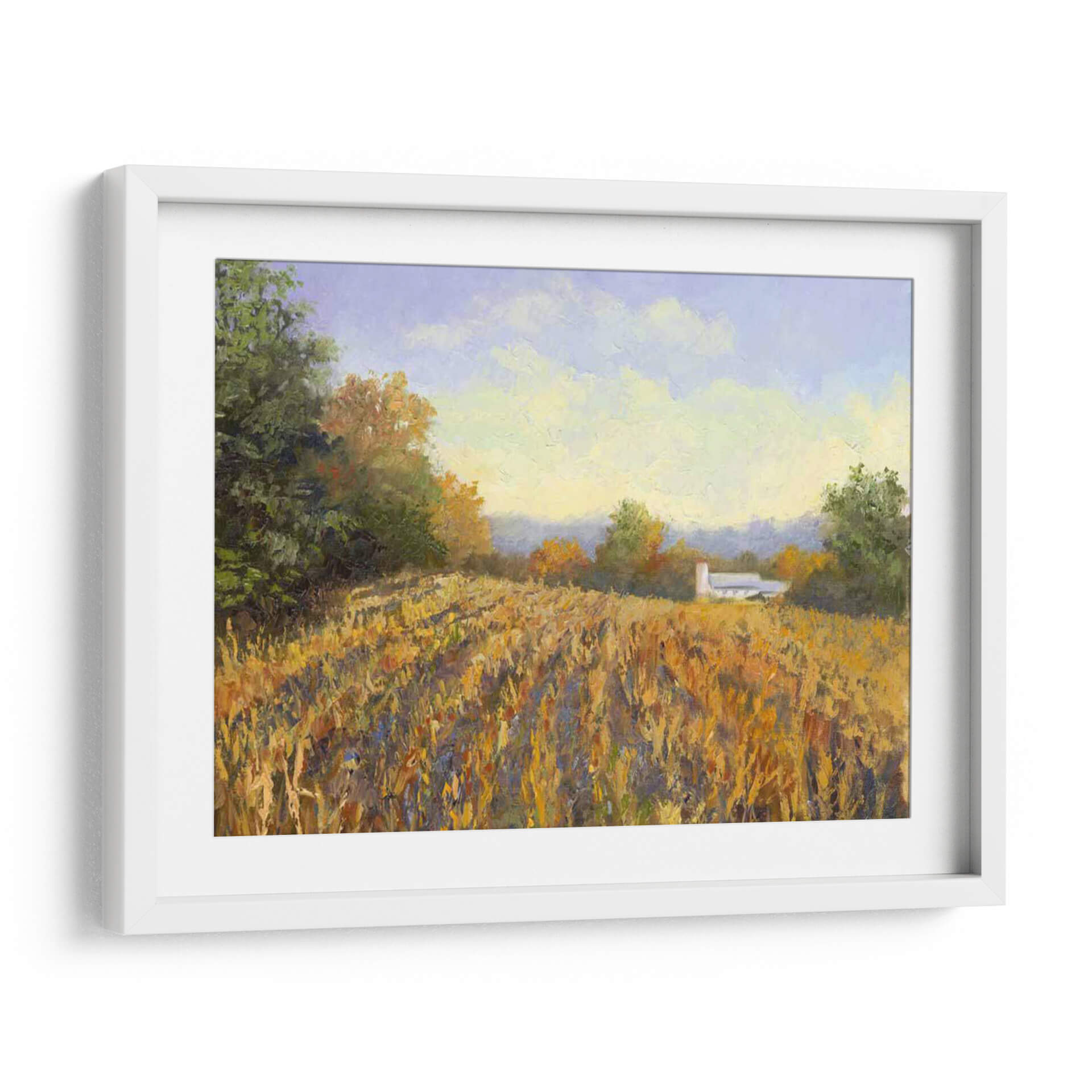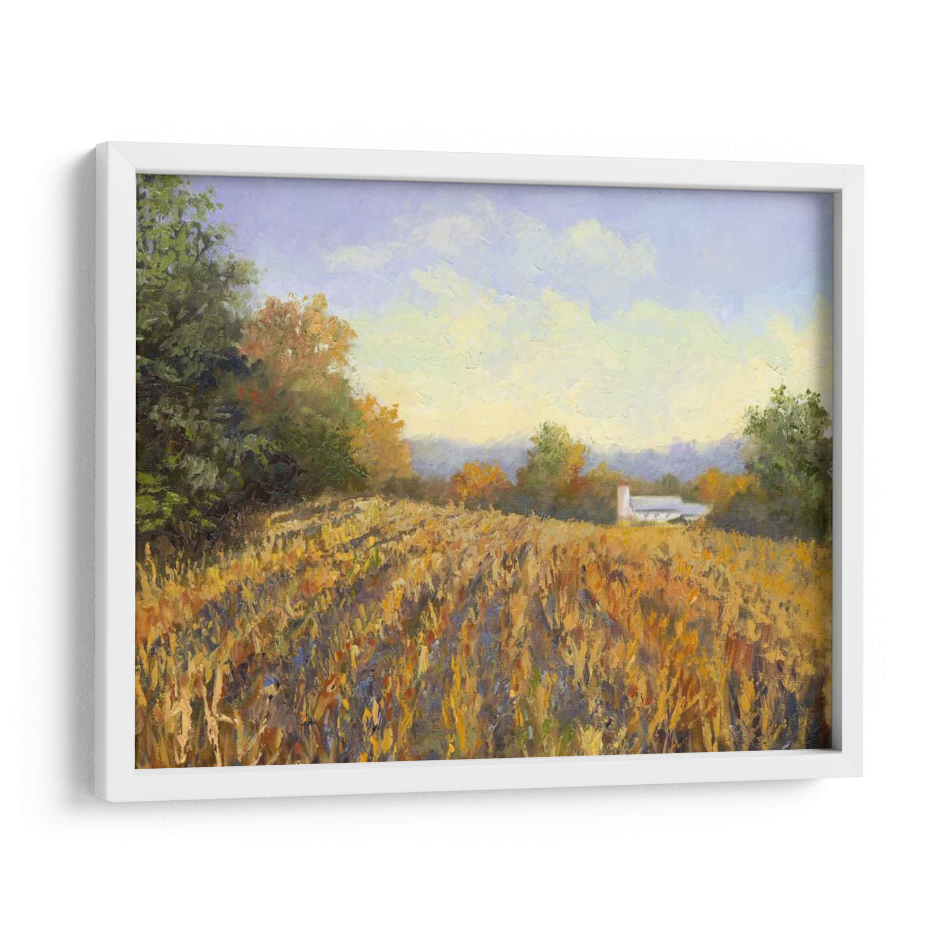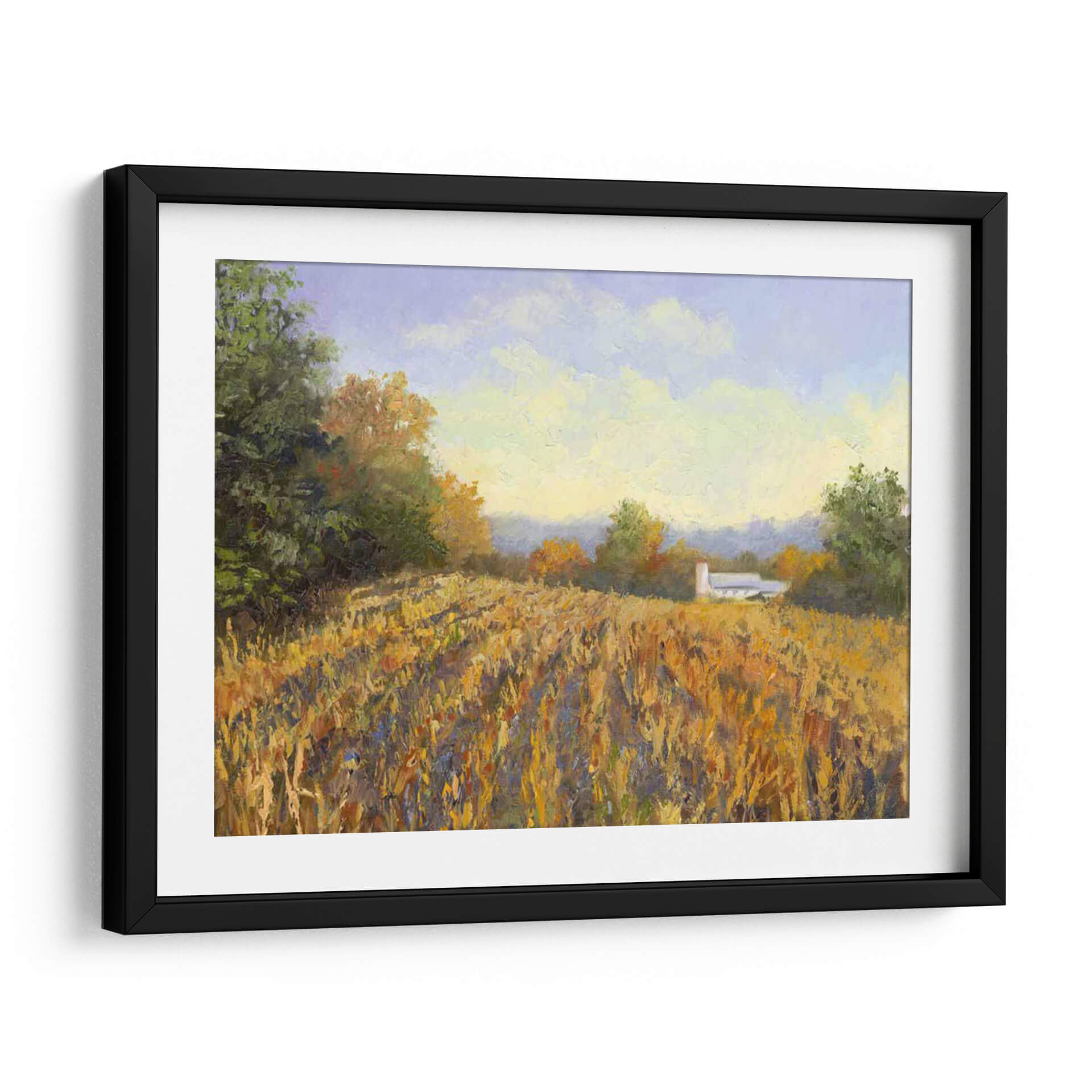 Sumérgete en la serenidad del campo con "Filas de Maíz", una obra de arte que captura la esencia de un atardecer dorado en un paisaje rural. Mary Jean Weber nos transporta a través de pinceladas expresivas y una paleta de colores cálidos que evocan la tranquilidad de la naturaleza en otoño. El primer plano muestra un campo de maíz maduro, con sus espigas doradas y ocres meciéndose suavemente bajo la luz del sol poniente, creando un juego de sombras y luces que aporta profundidad y textura a la pieza. Al fondo, se vislumbra una pintoresca granja de color blanco, rodeada de árboles que exhiben los vibrantes tonos rojizos y anaranjados del cambio de estación, coronando el horizonte con colinas tenues. El cielo, con sus nubes esponjosas teñidas de lavanda y amarillo pálido, completa la atmósfera pacífica y nostálgica. Este cuadro decorativo es perfecto para añadir un toque de calidez rústica y serenidad a tu sala de estar, comedor o incluso a un estudio. Su estilo impresionista y su composición paisajística invitan a la contemplación, convirtiéndolo en un punto focal inspirador que evoca la belleza simple y atemporal del entorno rural. Ideal para quienes buscan conectar con la naturaleza y añadir un aire de calma a su hogar.