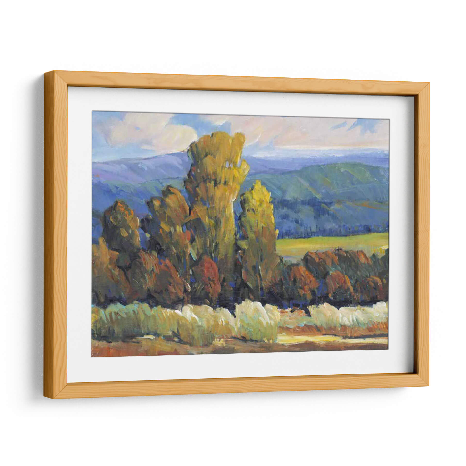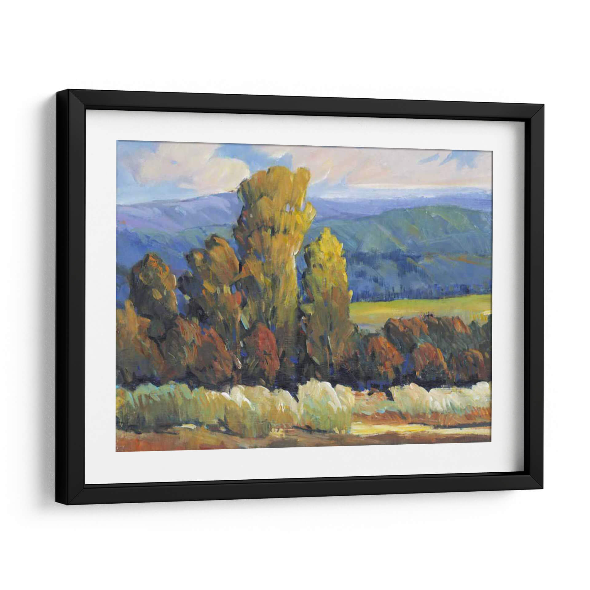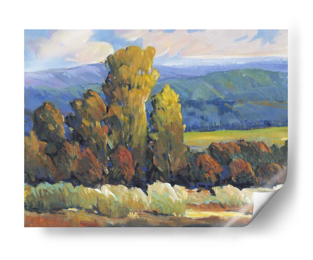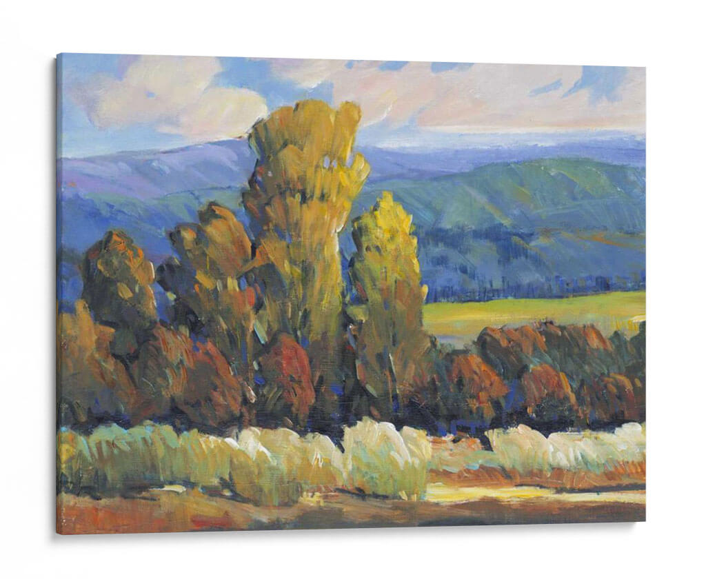 Sumérgete en la vibrante escena de "Hojas de Fuego II", una cautivadora obra de arte de Tim O'Toole que captura la esencia de un paisaje otoñal con una energía palpable. Los imponentes árboles, teñidos de tonos dorados y rojizos, se alzan majestuosamente contra un telón de fondo de colinas azuladas y un cielo con nubes algodonosas, evocando la calidez y la intensidad de los colores del otoño. La técnica impresionista de O'Toole, caracterizada por pinceladas audaces y una aplicación de color expresiva, da vida a esta composición, creando una sensación de movimiento y profundidad. El contraste entre las áreas de luz y sombra añade una dimensión dramática, invitando al espectador a perderse en la atmósfera serena pero enérgica del paisaje. Este cuadro decorativo es ideal para infundir vitalidad y un toque de naturaleza a cualquier sala de estar, estudio u oficina, transformando su espacio en un refugio acogedor y lleno de estilo. "Hojas de Fuego II" no es solo una pieza decorativa, sino una ventana a un momento de belleza natural inmortalizado con maestría.