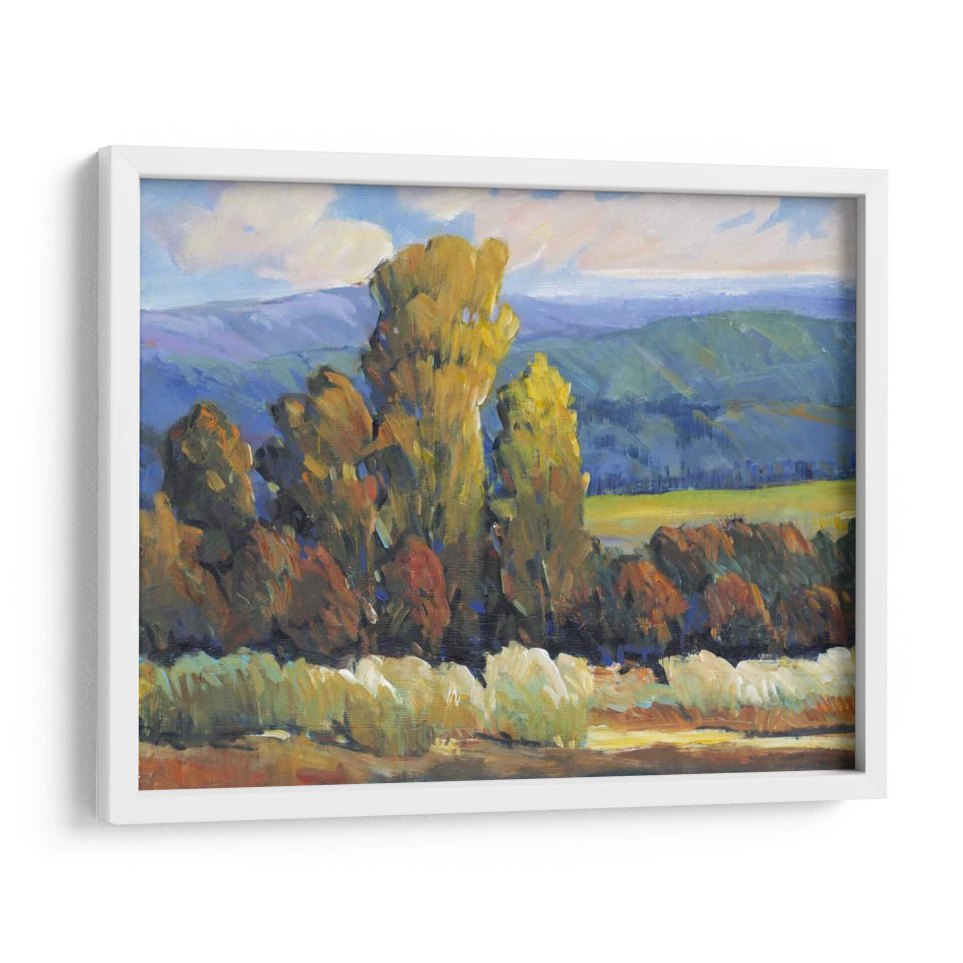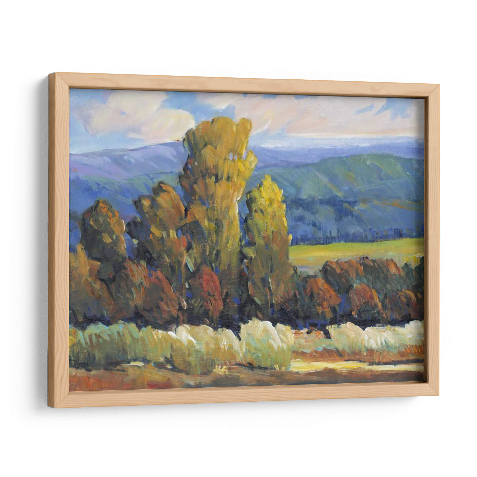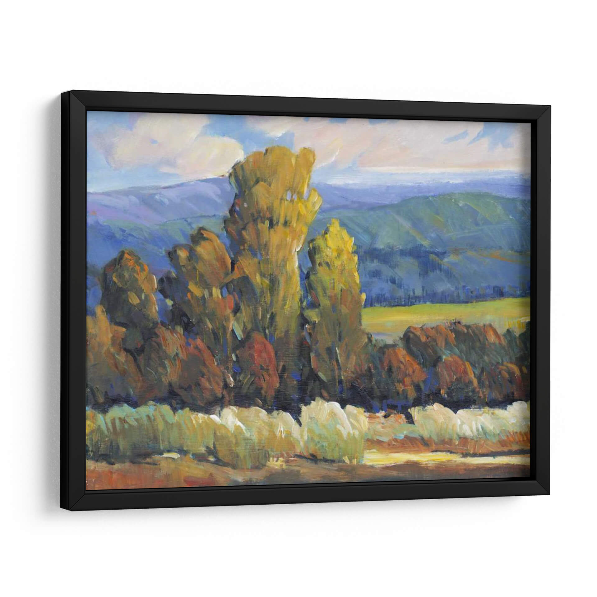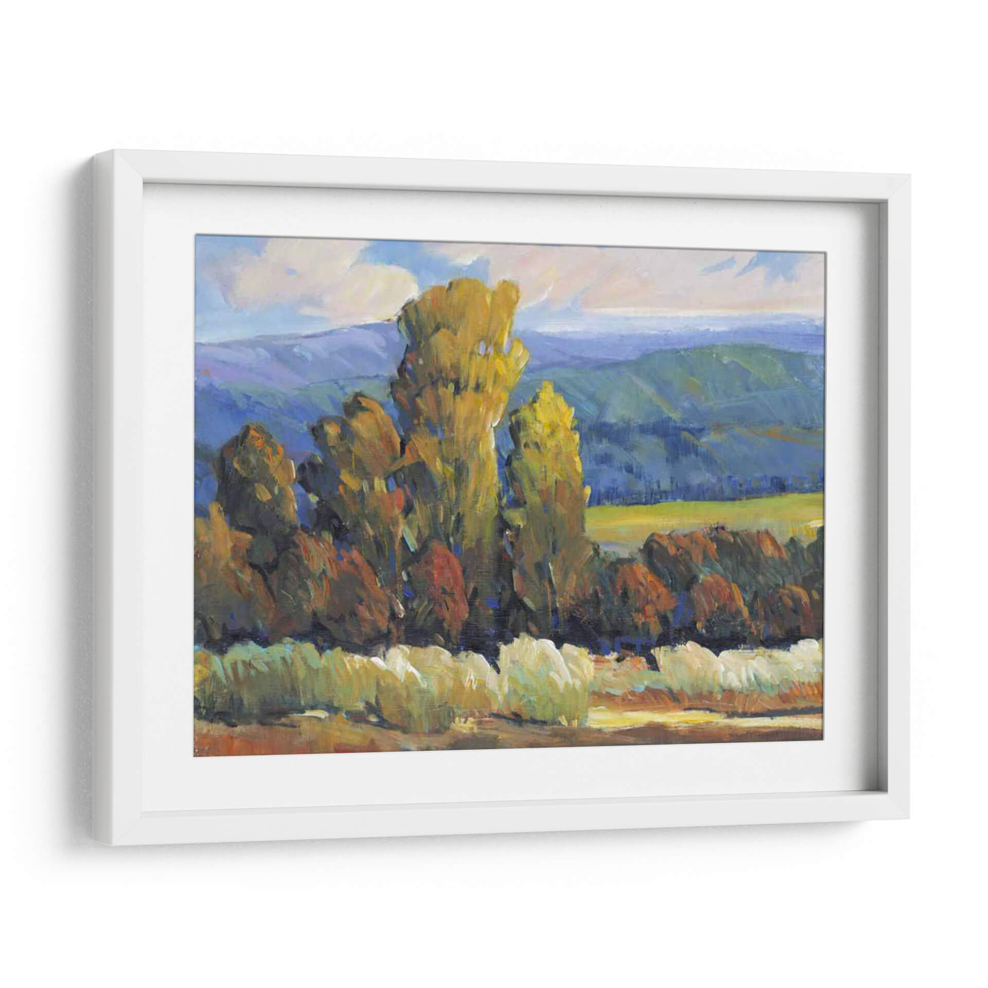 Sumérgete en la vibrante escena de "Hojas de Fuego II", una cautivadora obra de arte de Tim O'Toole que captura la esencia de un paisaje otoñal con una energía palpable. Los imponentes árboles, teñidos de tonos dorados y rojizos, se alzan majestuosamente contra un telón de fondo de colinas azuladas y un cielo con nubes algodonosas, evocando la calidez y la intensidad de los colores del otoño. La técnica impresionista de O'Toole, caracterizada por pinceladas audaces y una aplicación de color expresiva, da vida a esta composición, creando una sensación de movimiento y profundidad. El contraste entre las áreas de luz y sombra añade una dimensión dramática, invitando al espectador a perderse en la atmósfera serena pero enérgica del paisaje. Este cuadro decorativo es ideal para infundir vitalidad y un toque de naturaleza a cualquier sala de estar, estudio u oficina, transformando su espacio en un refugio acogedor y lleno de estilo. "Hojas de Fuego II" no es solo una pieza decorativa, sino una ventana a un momento de belleza natural inmortalizado con maestría.