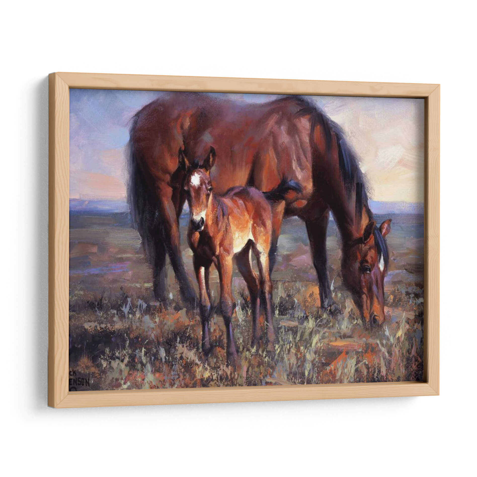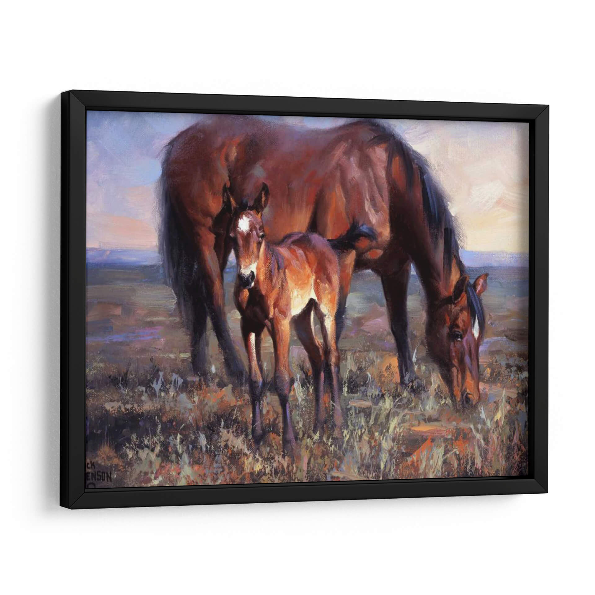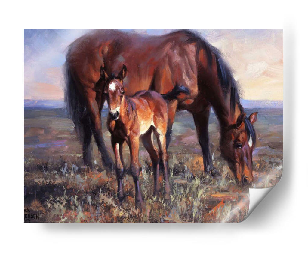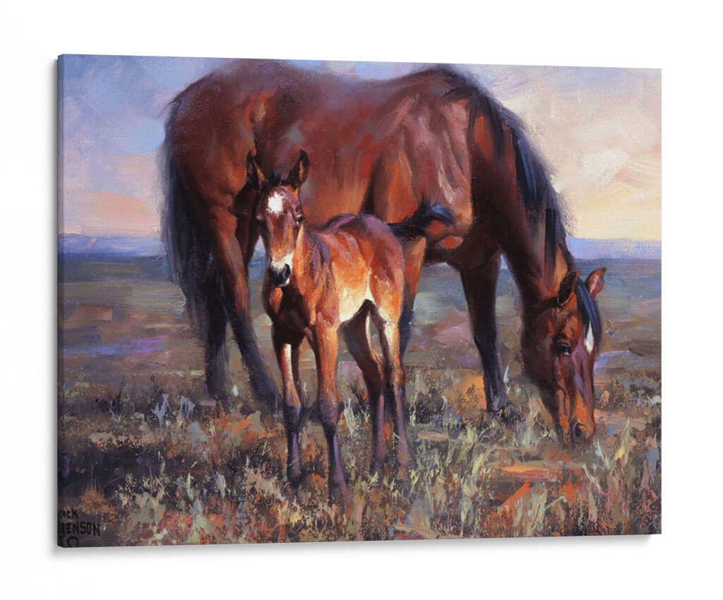 Captura la esencia de la naturaleza y el vínculo materno con "La Bahía de la Bahía", una obra de arte impresionante del artista Jack Sorenson. Este cuadro decorativo presenta a una majestuosa yegua junto a su tierno potrillo en un paisaje abierto. La paleta de colores cálidos, dominada por tonos tierra y ocres, evoca una sensación de calidez y serenidad, acentuada por un cielo suave en tonos pastel. La pincelada expresiva y el estilo realista le confieren a la obra una vitalidad palpable, invitando al espectador a sumergirse en la tranquilidad del campo. Los detalles en el pelaje de los caballos y la textura de la vegetación son representados con maestría, creando una imagen llena de vida y movimiento sutil. Ideal para añadir un toque de elegancia rústica y conexión emocional a tu salón, dormitorio o despacho. Este lienzo es perfecto para amantes de los animales y de las piezas que transmiten paz y armonía. Descubre la belleza atemporal de la naturaleza a través de la mirada artística de Sorenson y transforma tu espacio con esta pieza inspiradora.