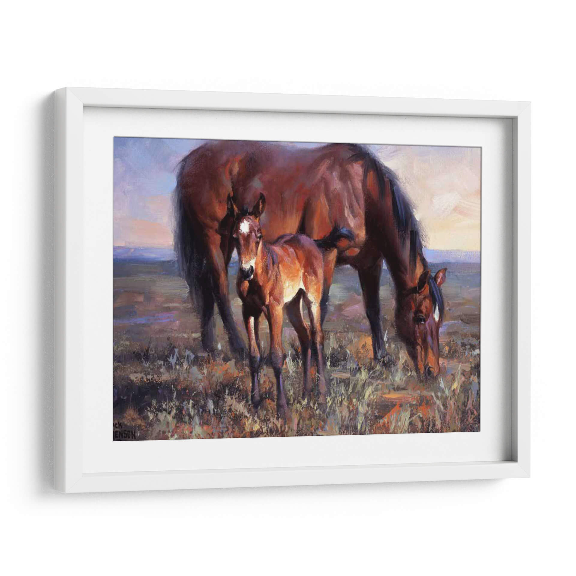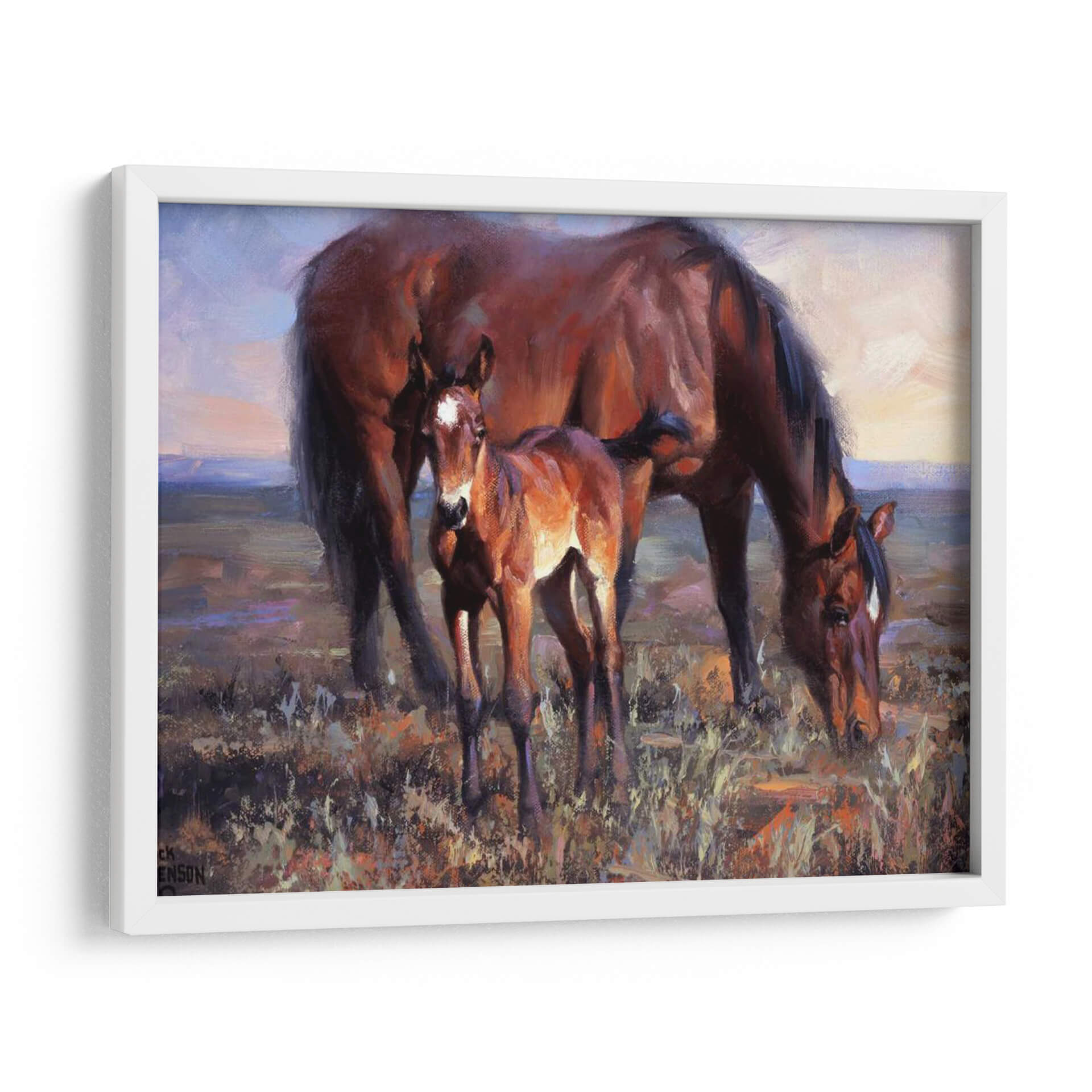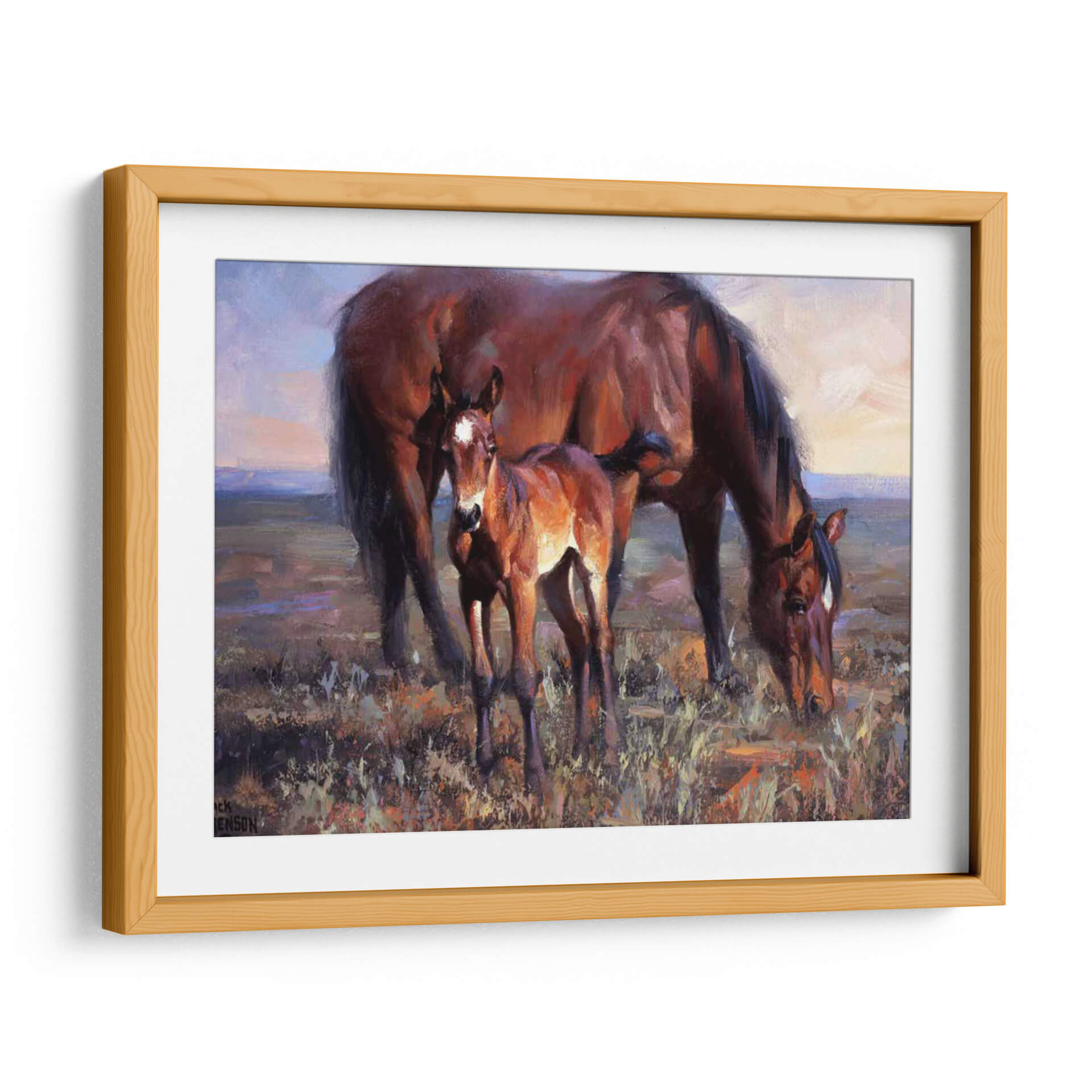 Captura la esencia de la naturaleza y el vínculo materno con "La Bahía de la Bahía", una obra de arte impresionante del artista Jack Sorenson. Este cuadro decorativo presenta a una majestuosa yegua junto a su tierno potrillo en un paisaje abierto. La paleta de colores cálidos, dominada por tonos tierra y ocres, evoca una sensación de calidez y serenidad, acentuada por un cielo suave en tonos pastel. La pincelada expresiva y el estilo realista le confieren a la obra una vitalidad palpable, invitando al espectador a sumergirse en la tranquilidad del campo. Los detalles en el pelaje de los caballos y la textura de la vegetación son representados con maestría, creando una imagen llena de vida y movimiento sutil. Ideal para añadir un toque de elegancia rústica y conexión emocional a tu salón, dormitorio o despacho. Este lienzo es perfecto para amantes de los animales y de las piezas que transmiten paz y armonía. Descubre la belleza atemporal de la naturaleza a través de la mirada artística de Sorenson y transforma tu espacio con esta pieza inspiradora.