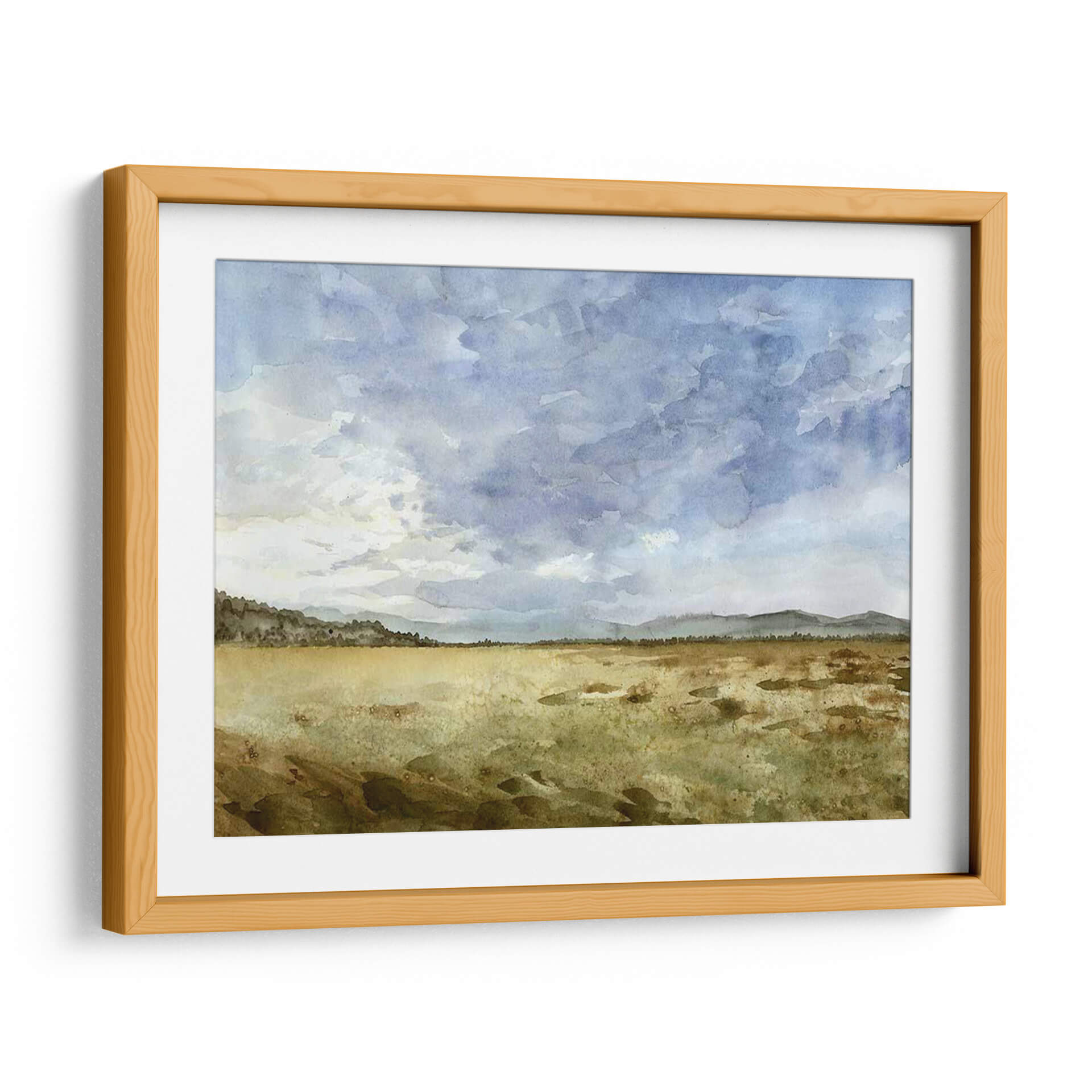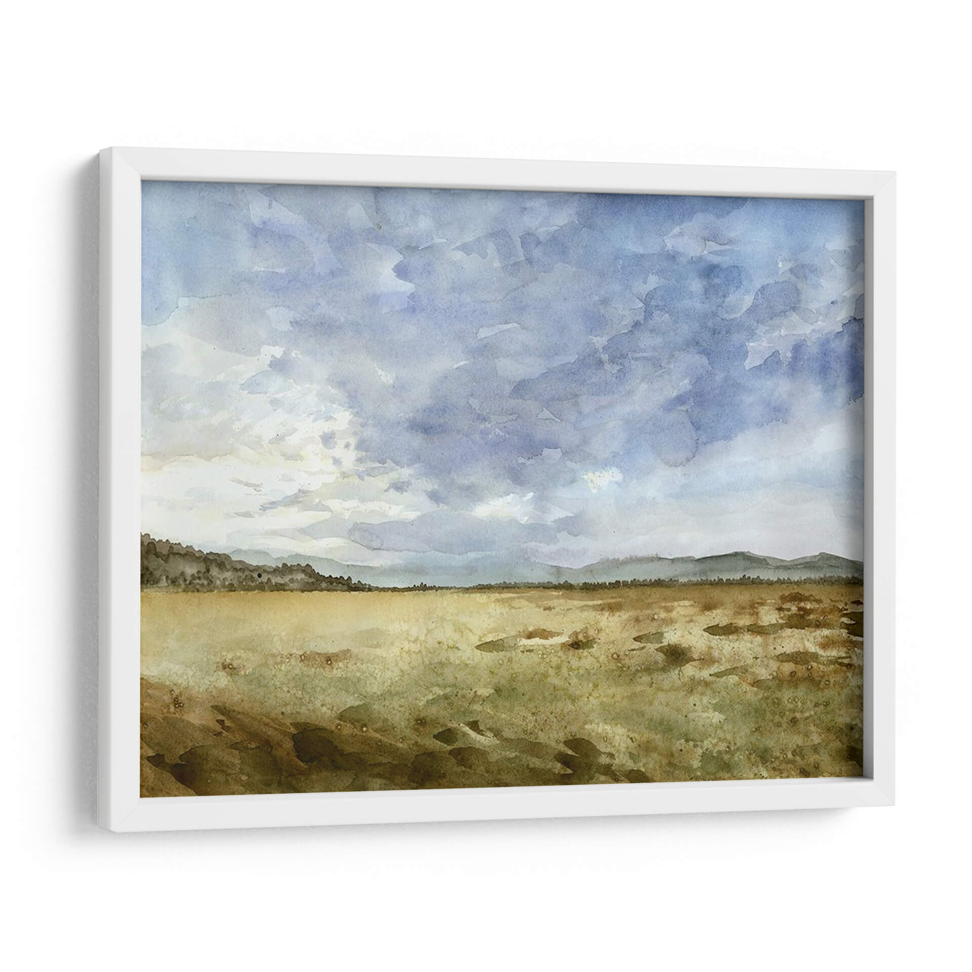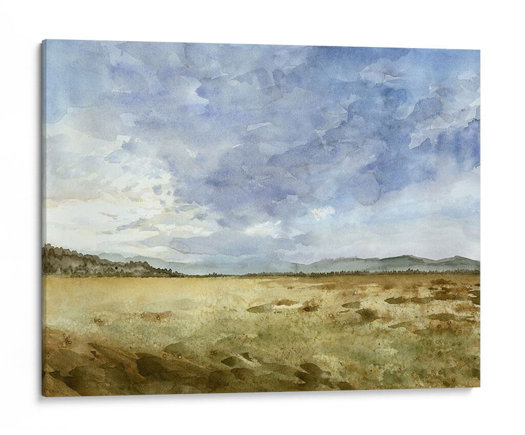Captura la esencia serena de la naturaleza con "Montana Horizon II", una obra de arte que evoca la vastedad y la tranquilidad de un paisaje expansivo. Megan Meagher nos transporta a un horizonte donde el cielo nublado y dramático se encuentra con una llanura dorada y texturizada. La paleta de colores, dominada por azules celestes y grises en el cielo, contrasta maravillosamente con los tonos tierra, ocres y verdes apagados del terreno, creando una atmósfera contemplativa y pacífica. La técnica de acuarela, con sus pinceladas sueltas y la delicada fusión de colores, aporta una cualidad etérea a la pieza, invitando a la reflexión y al descanso visual. Este cuadro decorativo es ideal para quienes buscan infundir calma y una conexión con la naturaleza en sus espacios. Su composición horizontal y la profundidad sutil lo hacen perfecto para salas de estar, dormitorios o estudios, añadiendo un toque de sofisticación sutil y un recordatorio de la belleza del mundo natural. "Montana Horizon II" no es solo una decoración, es una ventana a un momento de paz y contemplación.