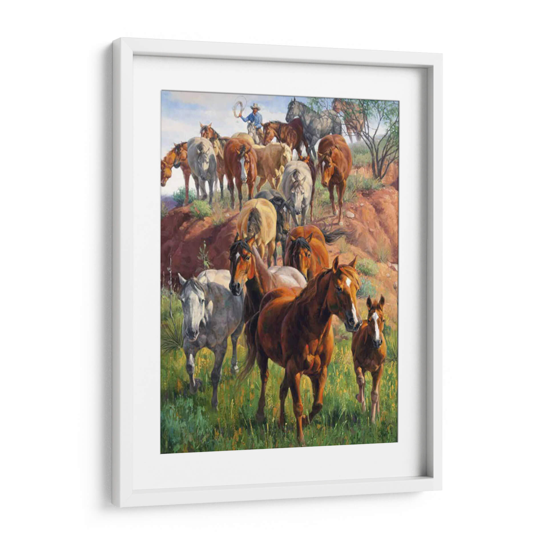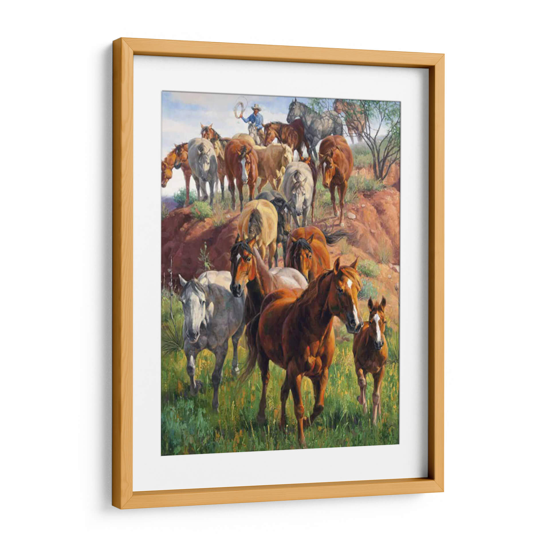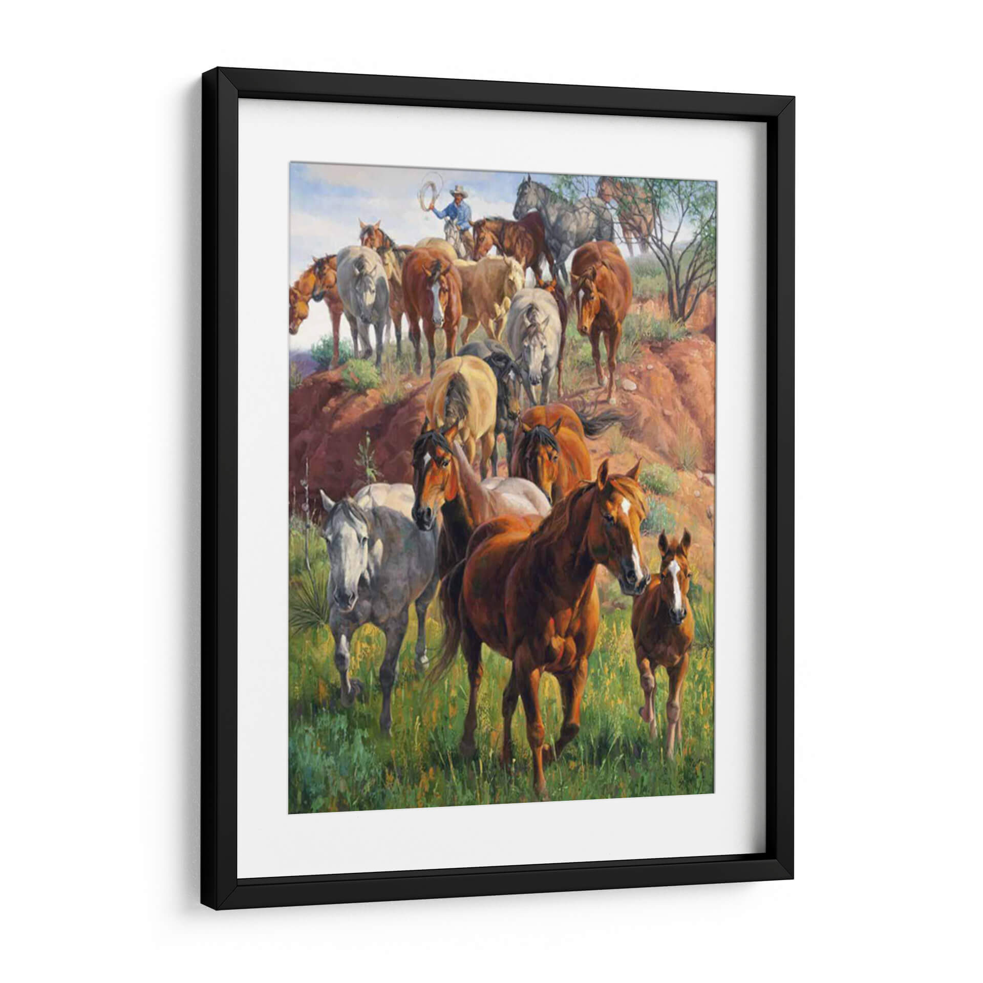Captura la esencia indómita y la majestuosidad del oeste americano con el cuadro decorativo "Mujeres Primero" de Jack Sorenson. Esta obra maestra evoca la fuerza y la libertad de una manada de caballos salvajes pastando en un paisaje árido y soleado. La paleta de colores cálidos, dominada por tonos tierra, ocres y verdes vibrantes, crea una atmósfera de autenticidad y vitalidad. Sorenson, a través de su estilo realista y detallado, da vida a cada caballo, capturando su musculatura, sus melenas al viento y la expresión en sus ojos. La composición dinámica, con los caballos moviéndose en diferentes direcciones y un vaquero solitario al fondo con su lazo, transmite una sensación de movimiento y aventura. "Mujeres Primero" es ideal para añadir un toque de carácter y energía a un salón rústico, una oficina con temática western o cualquier espacio que busque inspirar audacia y conexión con la naturaleza. Este cuadro decorativo no solo embellece tu hogar, sino que también cuenta una historia de resistencia, trabajo en equipo y la belleza salvaje del espíritu libre. Un regalo perfecto para amantes de los caballos, la cultura vaquera y el arte figurativo realista. Transforma tu pared en una ventana al salvaje oeste.
