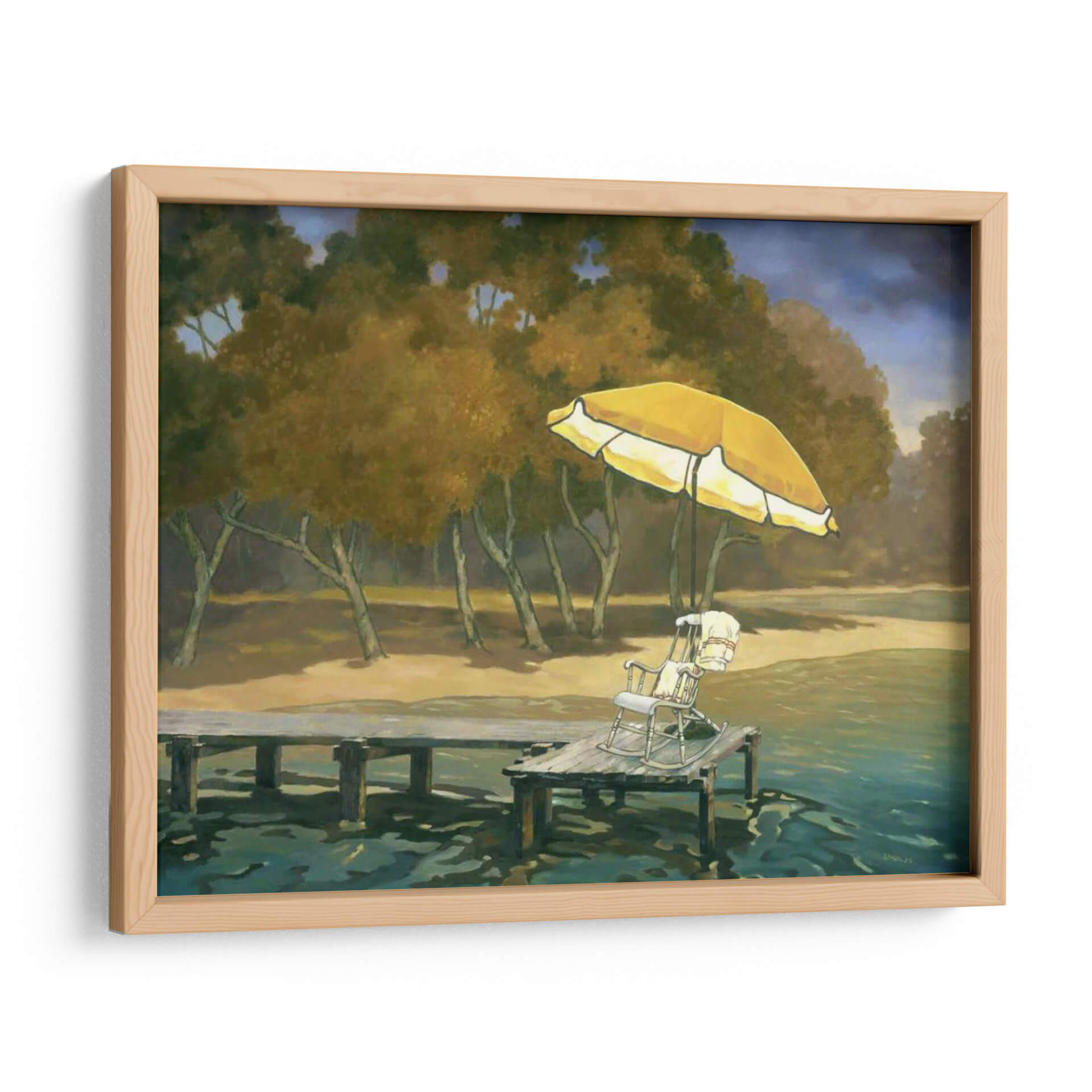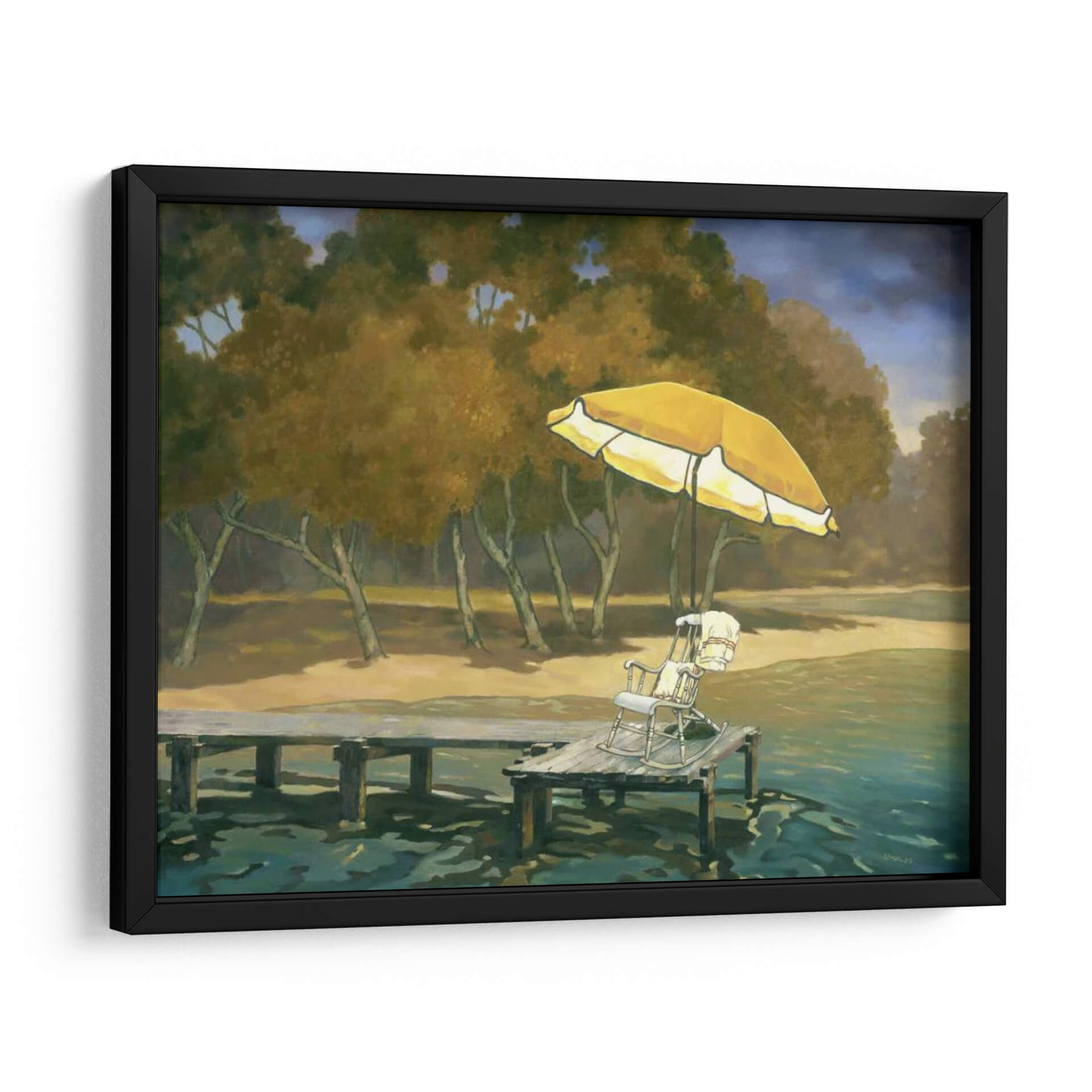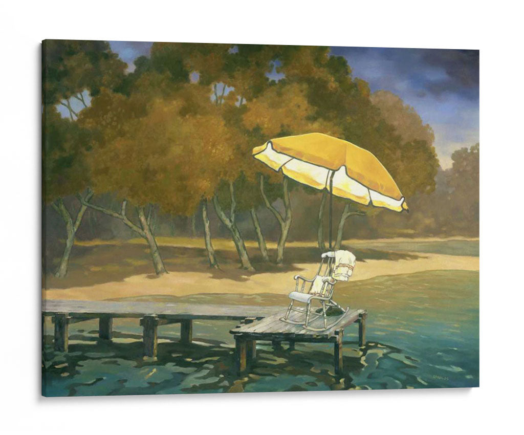 Sumérgete en la serenidad de "Nadada Nocturna II", una obra de Graham Reynolds que captura un momento de tranquilidad junto al agua. Este cuadro decorativo te transporta a un muelle de madera desgastada, donde una mecedora invita al descanso bajo un vibrante parasol amarillo. El contraste entre la calidez del sol, simbolizado por el amarillo del parasol y la arena, y las sombras profundas del agua y el cielo crea una atmósfera introspectiva y apacible. Los árboles otoñales, con sus tonos ocres y dorados, enmarcan la escena, sugiriendo una transición o un momento de pausa. La pincelada suelta y expresiva del artista añade una cualidad pictórica que realza la sensación de calma y contemplación. "Nadada Nocturna II" es ideal para espacios que buscan un toque de sosiego y belleza natural, como un dormitorio, una sala de estar o un rincón de lectura. Este cuadro decorativo es una invitación a desconectar y disfrutar de la belleza simple de un atardecer junto al lago. Añade una pieza de arte que inspire paz y reflexión a tu hogar.