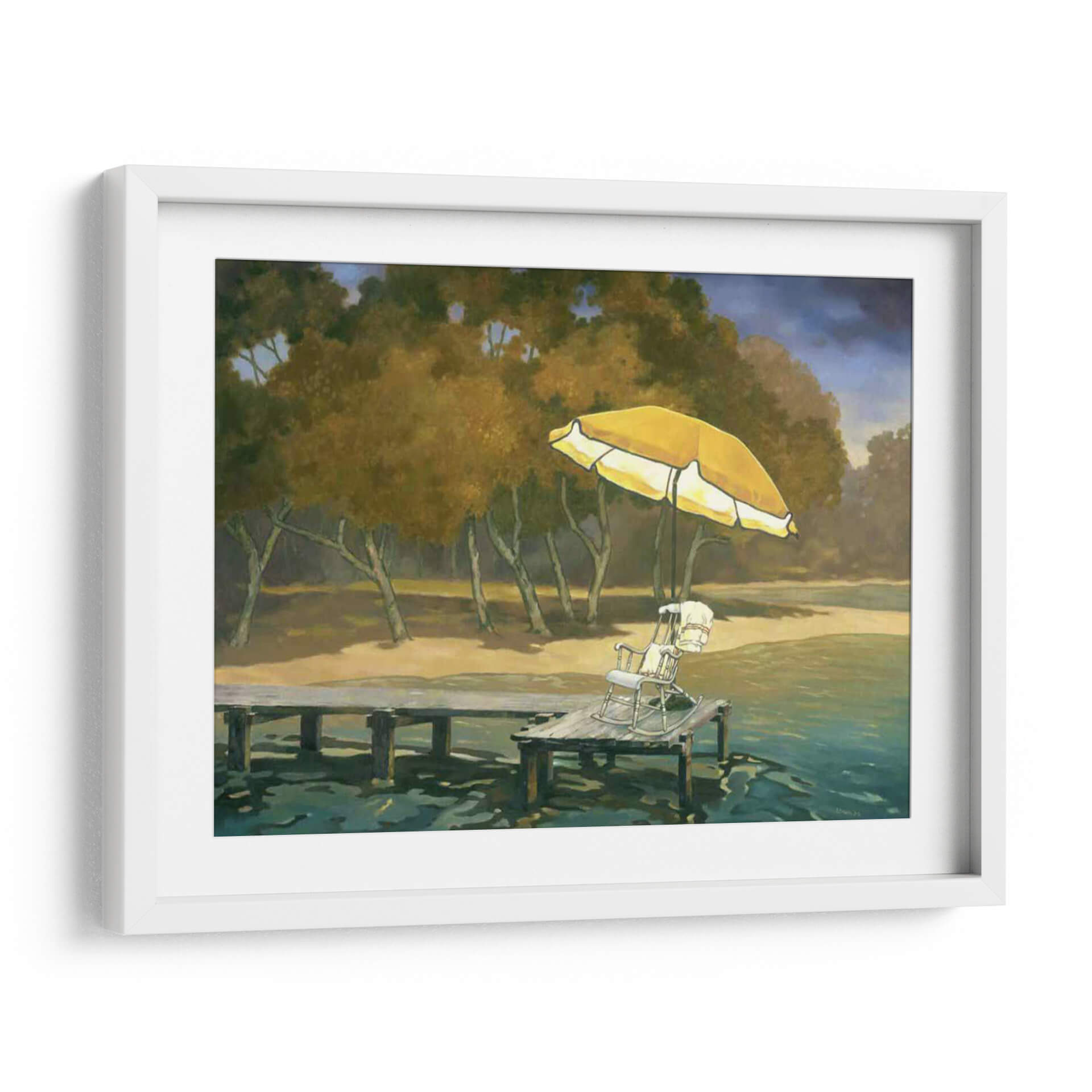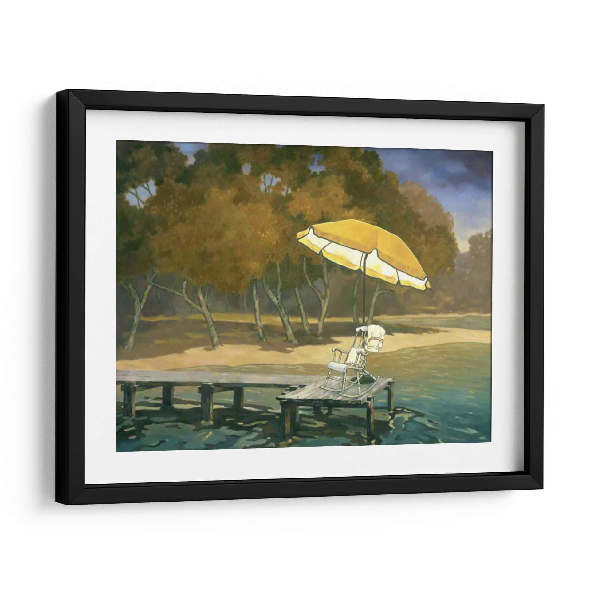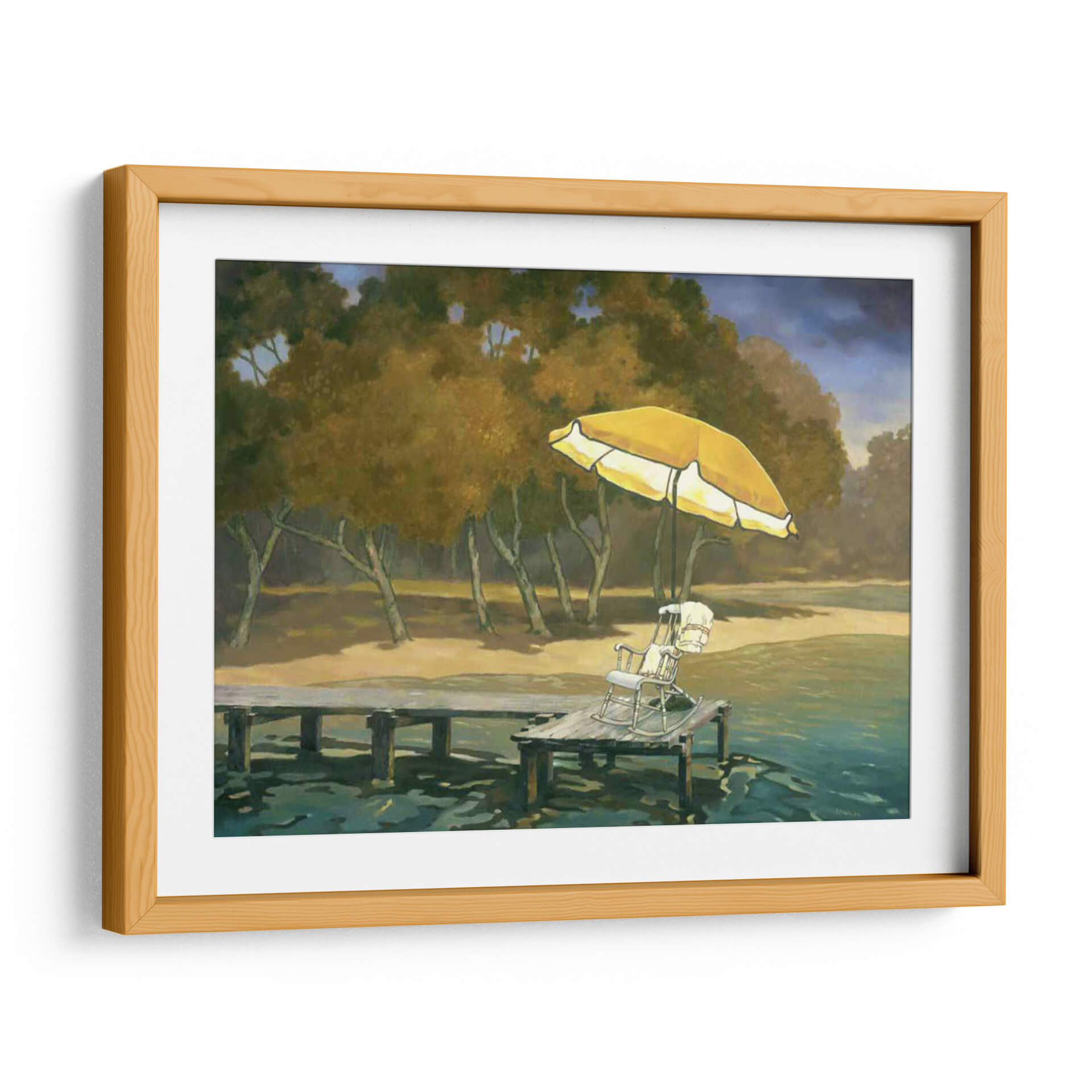 Sumérgete en la serenidad de "Nadada Nocturna II", una obra de Graham Reynolds que captura un momento de tranquilidad junto al agua. Este cuadro decorativo te transporta a un muelle de madera desgastada, donde una mecedora invita al descanso bajo un vibrante parasol amarillo. El contraste entre la calidez del sol, simbolizado por el amarillo del parasol y la arena, y las sombras profundas del agua y el cielo crea una atmósfera introspectiva y apacible. Los árboles otoñales, con sus tonos ocres y dorados, enmarcan la escena, sugiriendo una transición o un momento de pausa. La pincelada suelta y expresiva del artista añade una cualidad pictórica que realza la sensación de calma y contemplación. "Nadada Nocturna II" es ideal para espacios que buscan un toque de sosiego y belleza natural, como un dormitorio, una sala de estar o un rincón de lectura. Este cuadro decorativo es una invitación a desconectar y disfrutar de la belleza simple de un atardecer junto al lago. Añade una pieza de arte que inspire paz y reflexión a tu hogar.