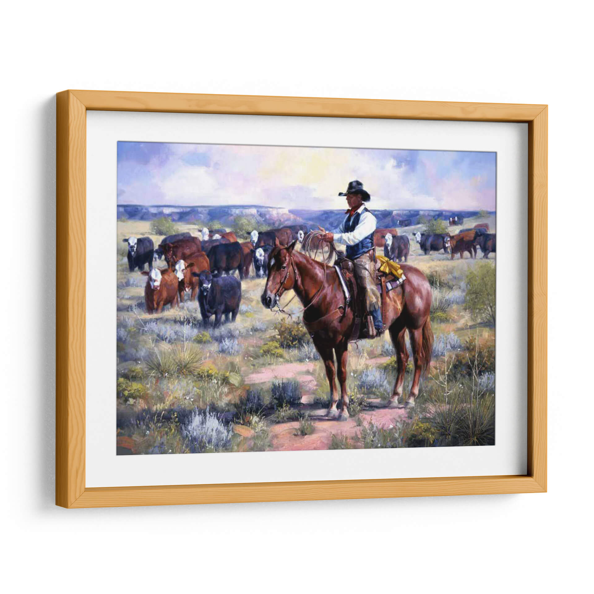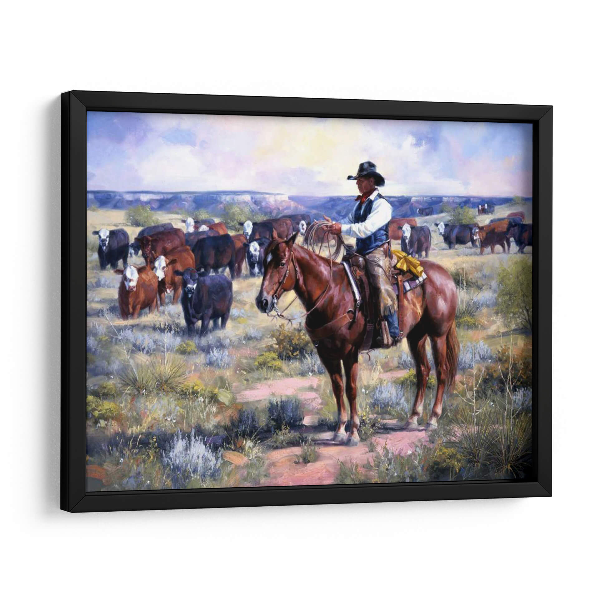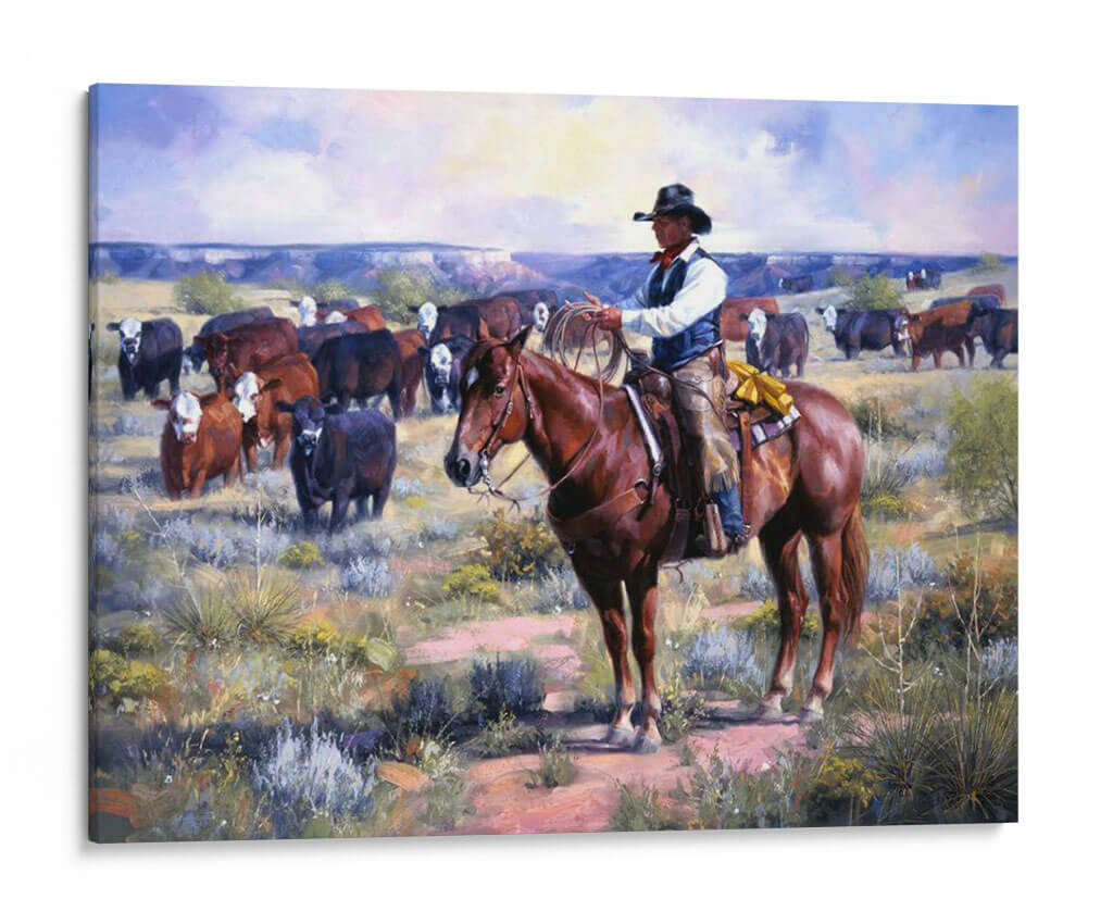 Sumérgete en la esencia del Oeste americano con "Observó", una obra maestra del artista Jack Sorenson. Este cuadro decorativo captura la soledad y la conexión profunda entre un vaquero y su rebaño en un vasto paisaje. La pintura, con un estilo que evoca el realismo clásico y toques impresionistas, presenta una paleta de colores cálidos y terrosos, dominada por los tonos ocres del suelo, los verdes apacibles de la vegetación y los azules y blancos celestiales de un cielo despejado, acentuados por la presencia vibrante del caballo y el ganado. La composición centra la atención en el vaquero, con su mirada reflexiva y su sutil movimiento, invitando a la contemplación. La atmósfera es de calma, diligencia y una profunda apreciación por la vida rural. "Observó" es ideal para añadir un toque de carácter rústico y narrativo a tu sala de estar, estudio u oficina, creando un punto focal que inspira historias y evoca la dureza y la belleza del trabajo en el campo. Esta pieza no es solo una decoración, sino una ventana a un mundo de tradición y resiliencia.