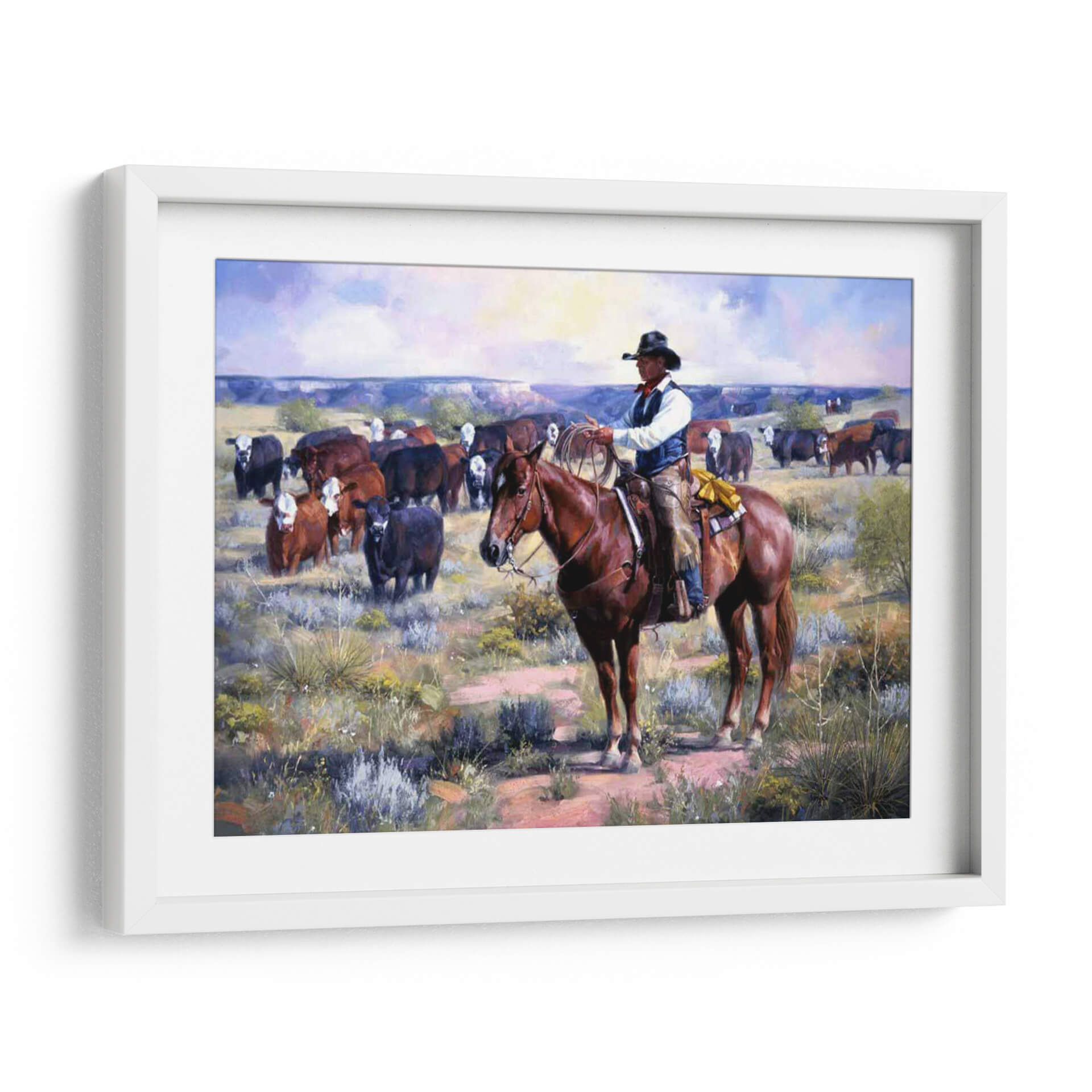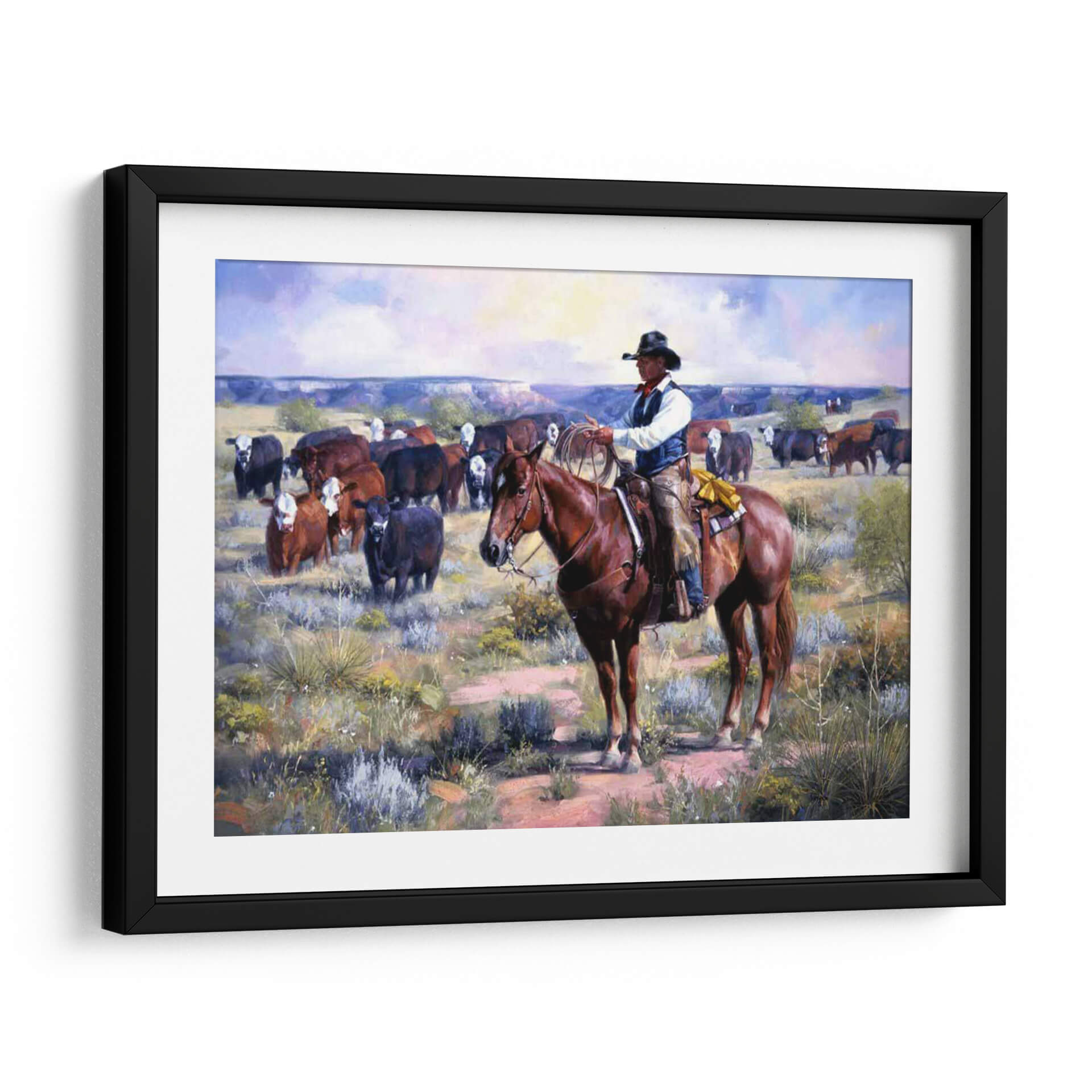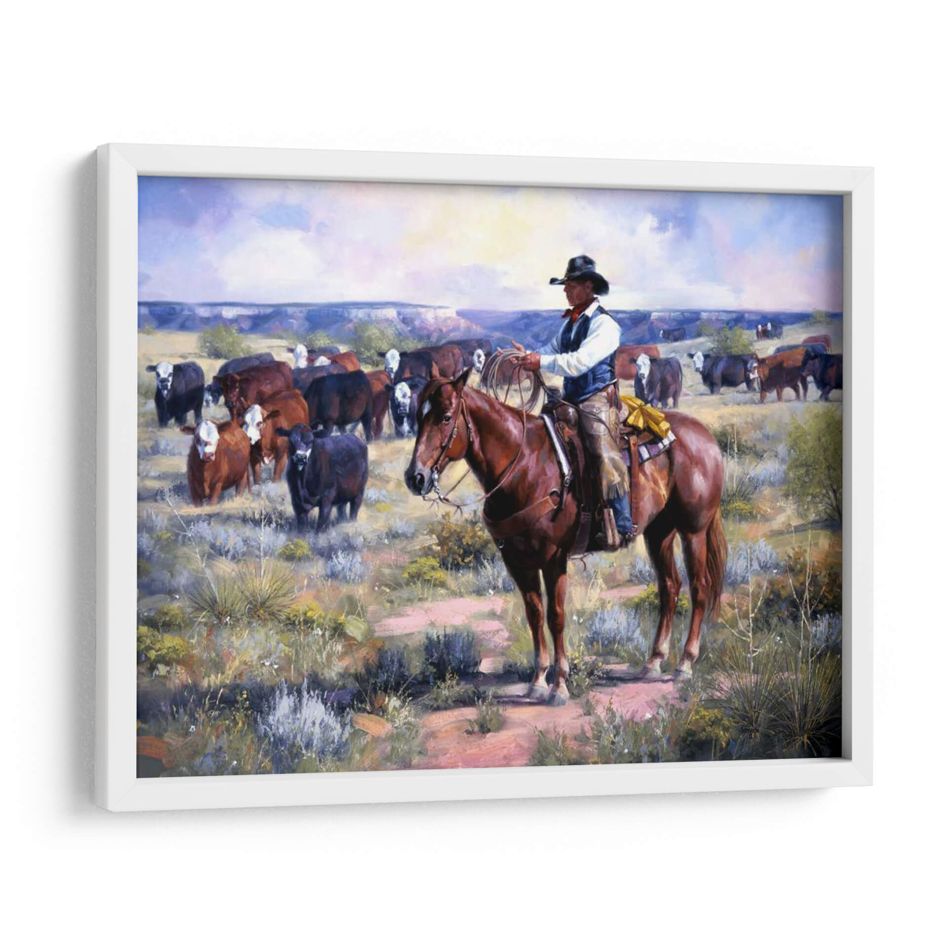 Sumérgete en la esencia del Oeste americano con "Observó", una obra maestra del artista Jack Sorenson. Este cuadro decorativo captura la soledad y la conexión profunda entre un vaquero y su rebaño en un vasto paisaje. La pintura, con un estilo que evoca el realismo clásico y toques impresionistas, presenta una paleta de colores cálidos y terrosos, dominada por los tonos ocres del suelo, los verdes apacibles de la vegetación y los azules y blancos celestiales de un cielo despejado, acentuados por la presencia vibrante del caballo y el ganado. La composición centra la atención en el vaquero, con su mirada reflexiva y su sutil movimiento, invitando a la contemplación. La atmósfera es de calma, diligencia y una profunda apreciación por la vida rural. "Observó" es ideal para añadir un toque de carácter rústico y narrativo a tu sala de estar, estudio u oficina, creando un punto focal que inspira historias y evoca la dureza y la belleza del trabajo en el campo. Esta pieza no es solo una decoración, sino una ventana a un mundo de tradición y resiliencia.