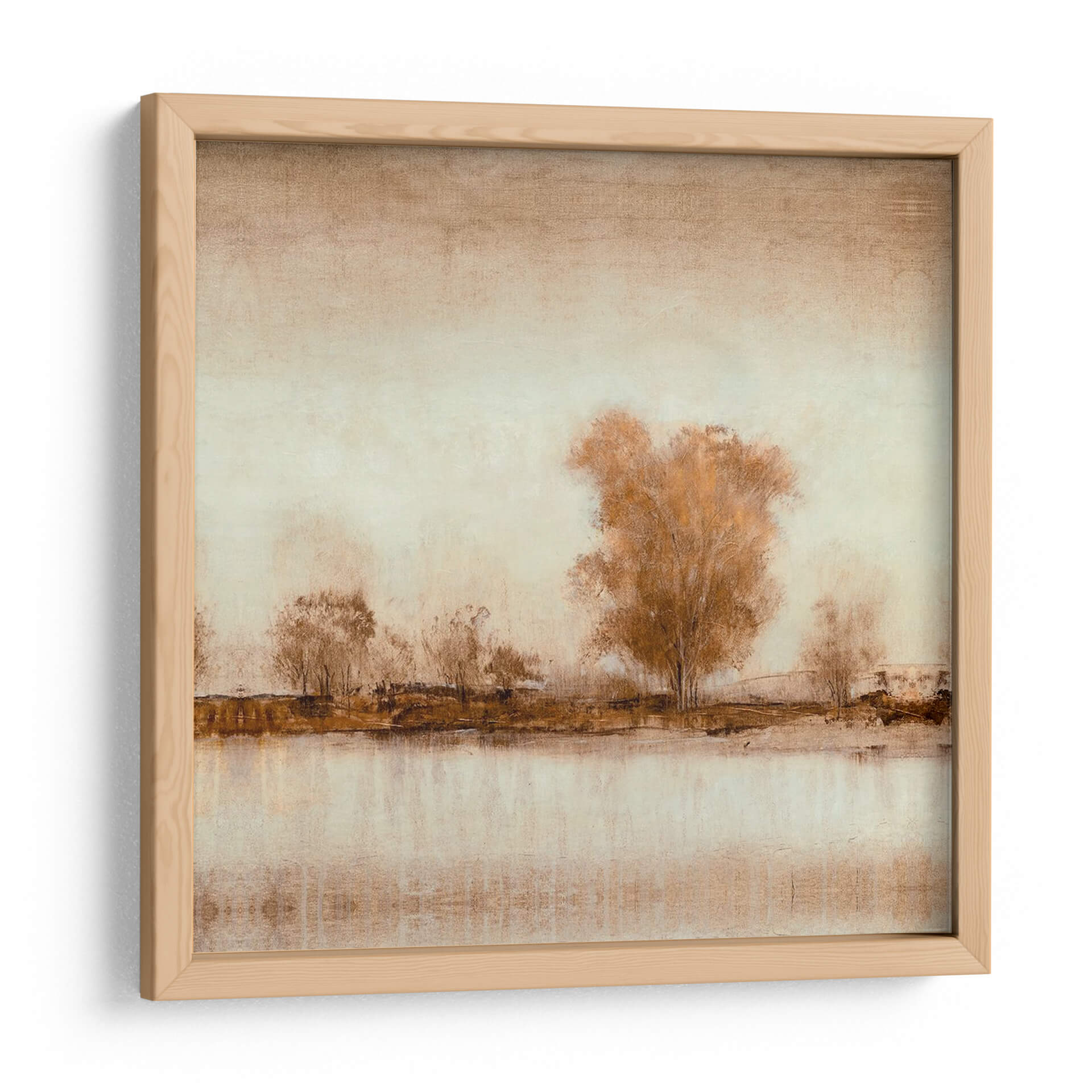 Sumérgete en la serena belleza de "Orilla Soñadora I", una obra de arte que evoca la tranquilidad de un paisaje acuático al atardecer. Los tonos cálidos y terrosos dominan la paleta, creando una atmósfera acogedora y reflexiva. El cuadro presenta una línea de horizonte sutilmente definida, flanqueada por árboles estilizados que parecen bailar en la brisa suave. El agua refleja los colores del cielo y la arboleda, añadiendo una capa de profundidad y misterio a la composición. La técnica pictórica, con sus pinceladas visibles y texturas sutiles, aporta un carácter orgánico y artístico a la pieza, invitando a la contemplación. Este cuadro decorativo es ideal para añadir un toque de calma y sofisticación a cualquier espacio, desde un salón moderno hasta un dormitorio íntimo. Su diseño atemporal y su evocadora paleta lo convierten en una elección perfecta para quienes buscan una conexión emocional con su decoración y desean crear un refugio de paz en su hogar u oficina. "Orilla Soñadora I" no es solo una imagen, es una invitación a la pausa y al disfrute de la belleza natural en su forma más poética.