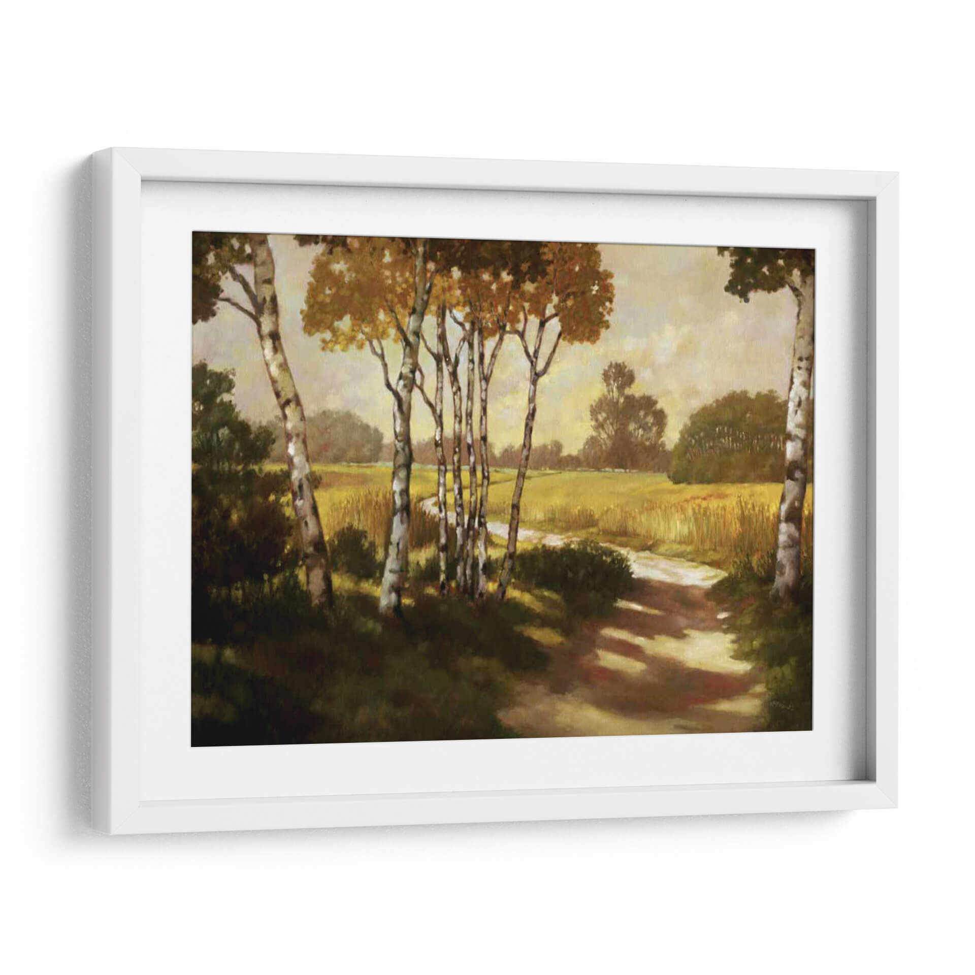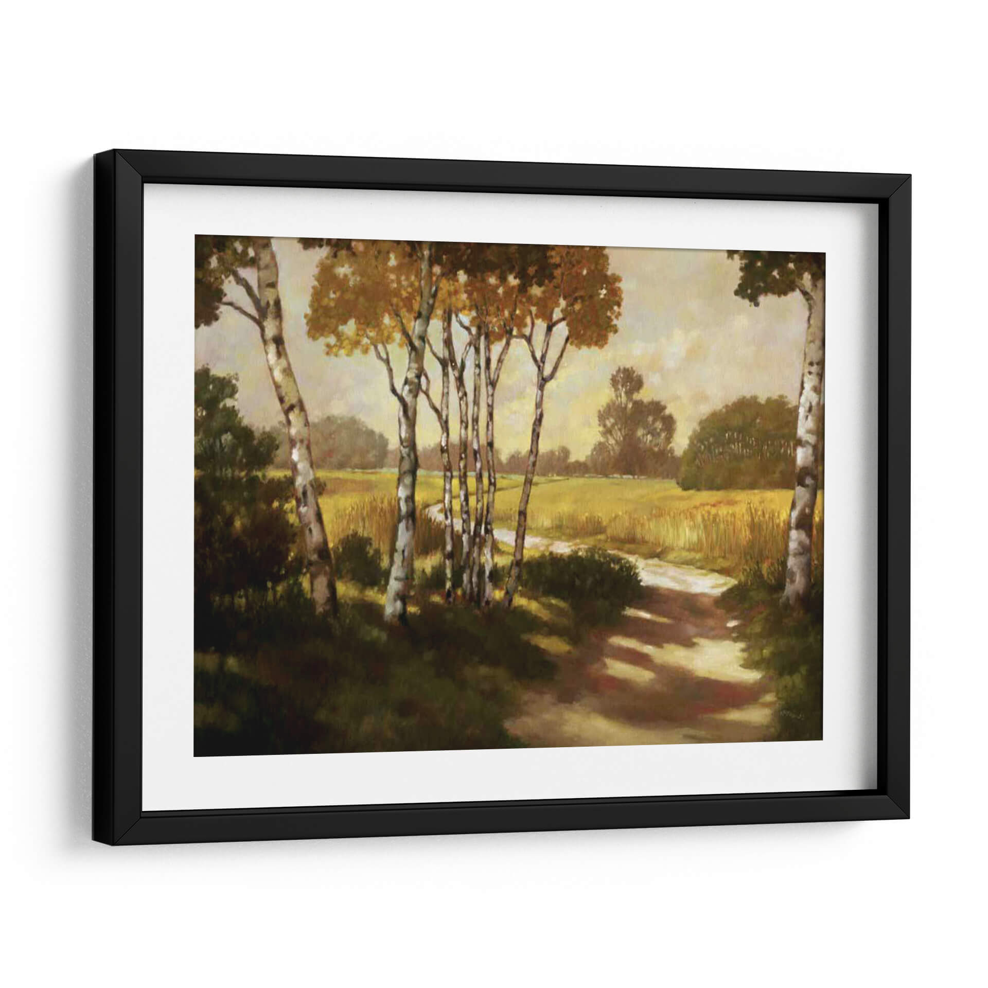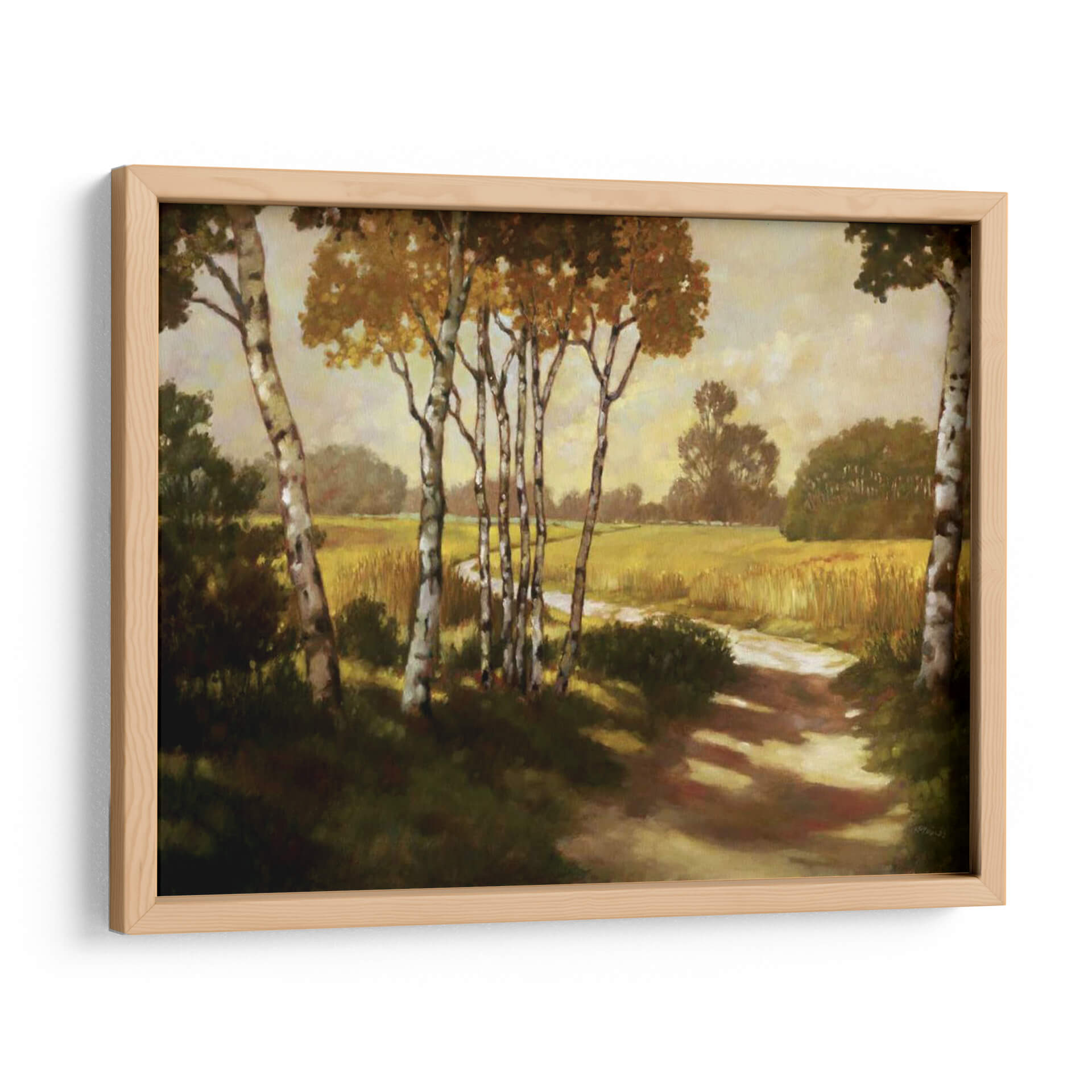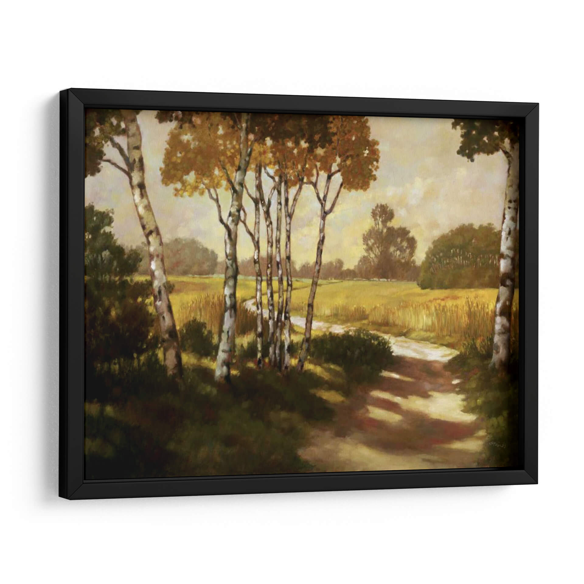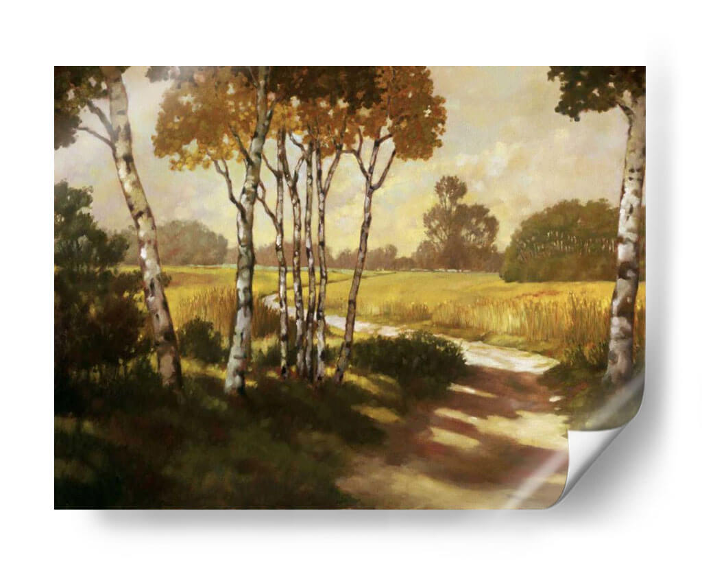 Emb e un viaje esc tico con 'Pa t Walk II', una obra de arte que captura la esencia de un paseo oto tal a trav t de un campo dorado. Este cuadro decorativo presenta una escena serena de tboles de abedul con sus caracter tsticas cortezas blancas y manchas oscuras, enmarcados por follaje en tonos ocres y dorados que evocan la tpoca m t t. Un sendero sinuoso se abre paso a trav ts de la hierba alta y dorada, proyectando sombras largas y sugerentes que invitan a la contemplaci tn. La paleta de colores, dominada por tonos tierra, amarillos c tlidos, verdes tscuros y toques de marr tn, crea una atm tfera c tlida y acogedora, ideal para cualquier espacio que busque transm tir paz y conexi tn con la naturaleza. El estilo de pintura, con pinceladas sugerentes y un enfoque en la luz y la atm tfera, recuerda a un impresionismo t tmico, aportando profundidad y textura a la composici tn. 'Pa t Walk II' es una pieza perfecta para a tadir un toque de tranquilidad y belleza natural a su sal tn, dormitorio u oficina, invitando a la reflexi tn y al bienestar en cada mirada.