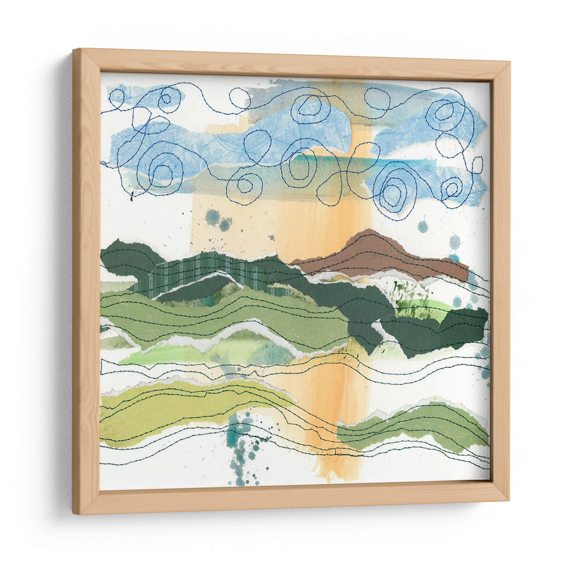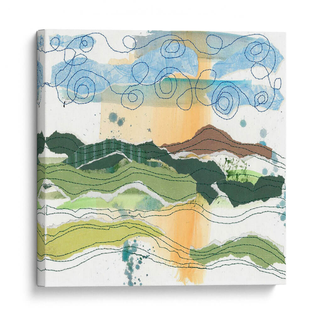 Sumérgete en la serena belleza de "Paisaje Cosido II", una obra de arte contemporáneo de Regina Moore que evoca la tranquilidad de la naturaleza a través de una técnica mixta innovadora. Esta pieza presenta capas de papel rasgado y texturas sutiles que imitan las ondulaciones de un paisaje montañoso, con verdes vibrantes y tonos tierra que contrastan suavemente con un cielo azul etéreo adornado con espirales de hilo. La pincelada suelta y la técnica de collage crean una sensación de profundidad y movimiento, invitando al espectador a perderse en sus detalles. Los acentos de color naranja y azul, junto con las salpicaduras de tinta, añaden un toque de dinamismo y vitalidad. "Paisaje Cosido II" es ideal para añadir un toque de sofisticación orgánica a tu sala de estar, dormitorio o estudio, transformando cualquier espacio en un refugio de paz y creatividad. Su estilo abstracto y evocador la convierte en una pieza versátil que complementa tanto la decoración moderna como la bohemia, inspirando calma y contemplación. Descubre la armonía visual que Regina Moore ha capturado en esta composición única.