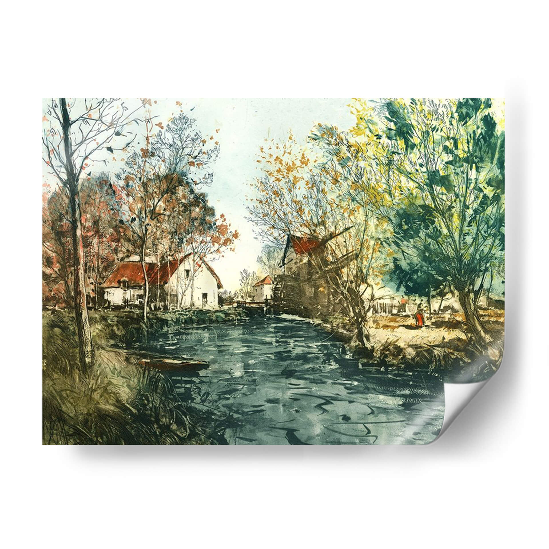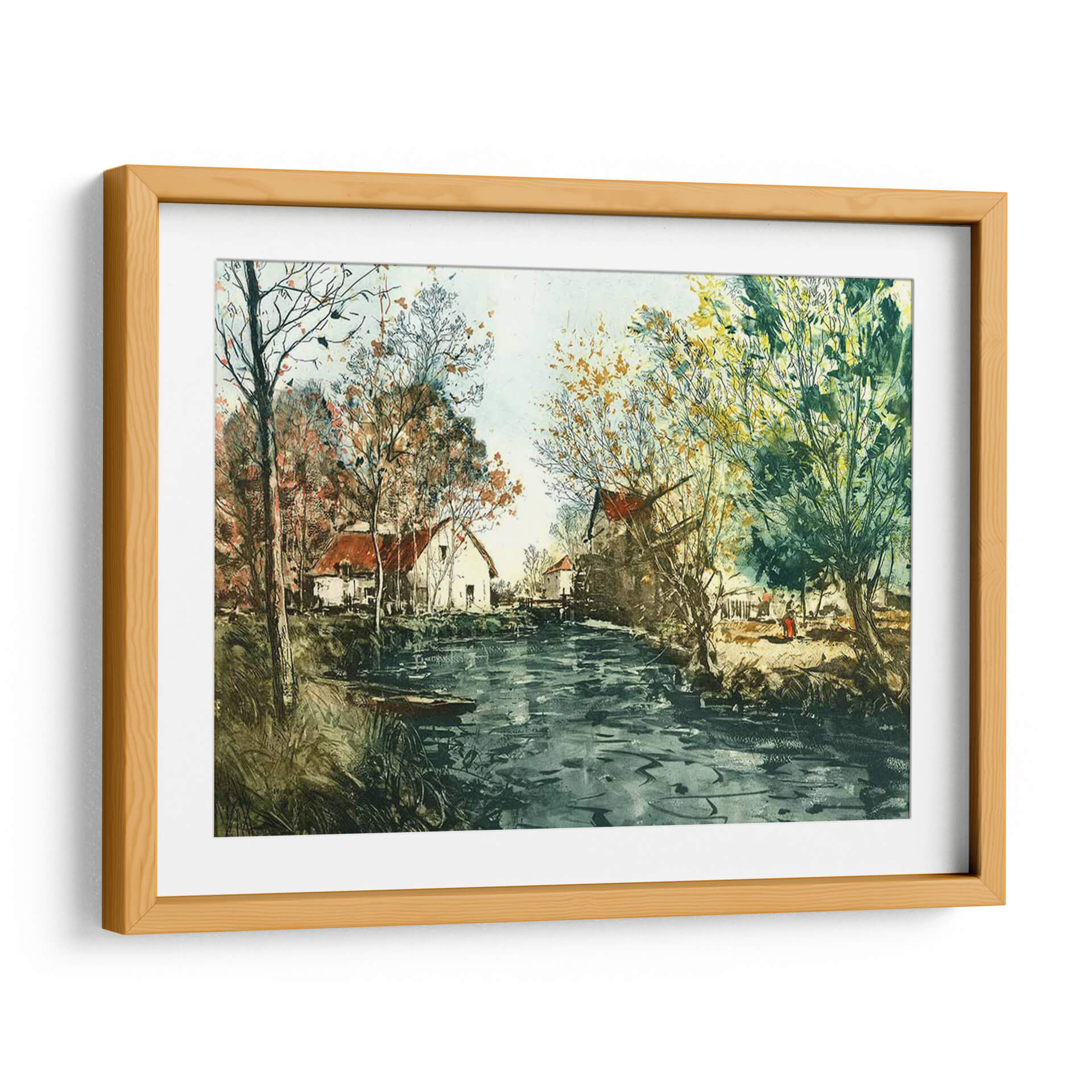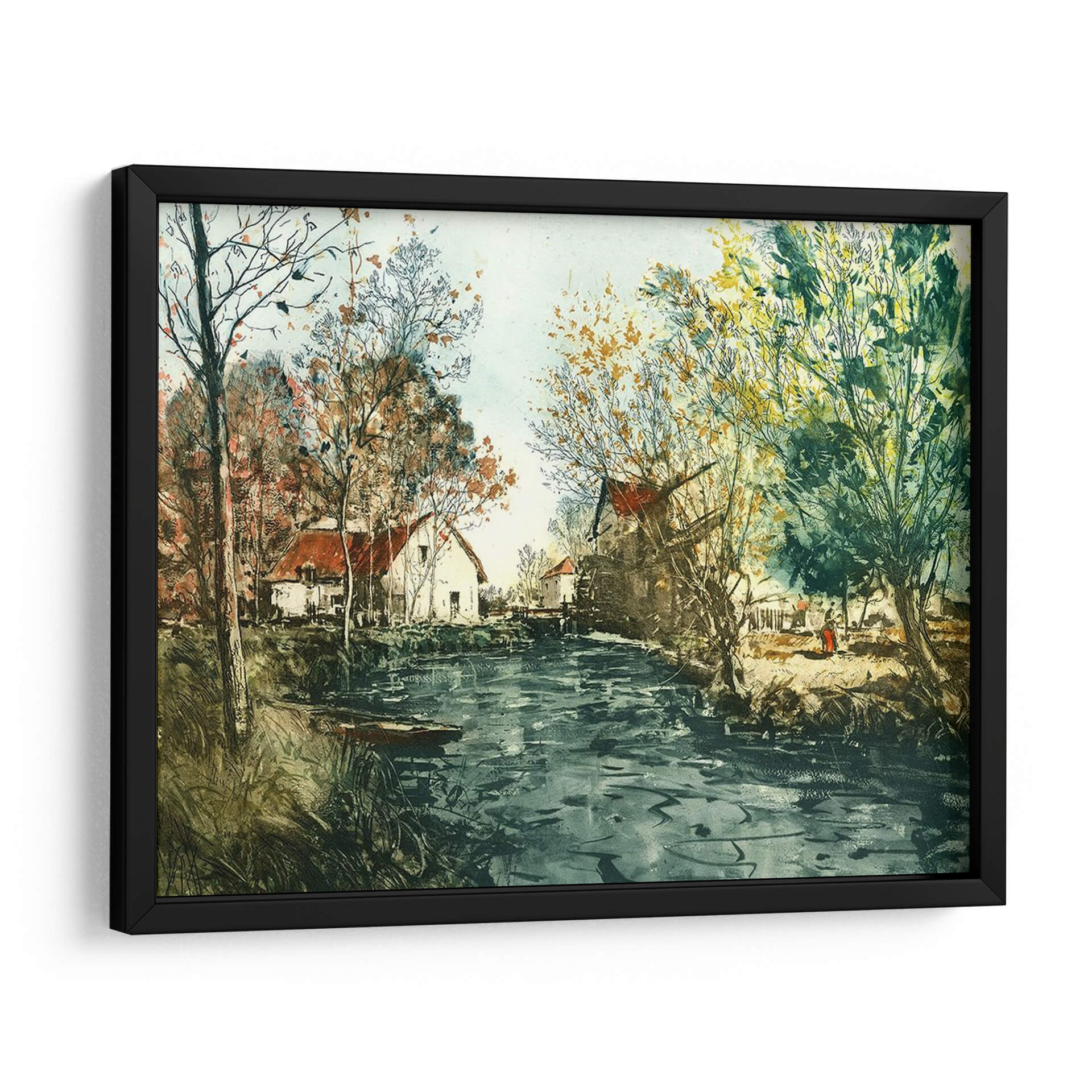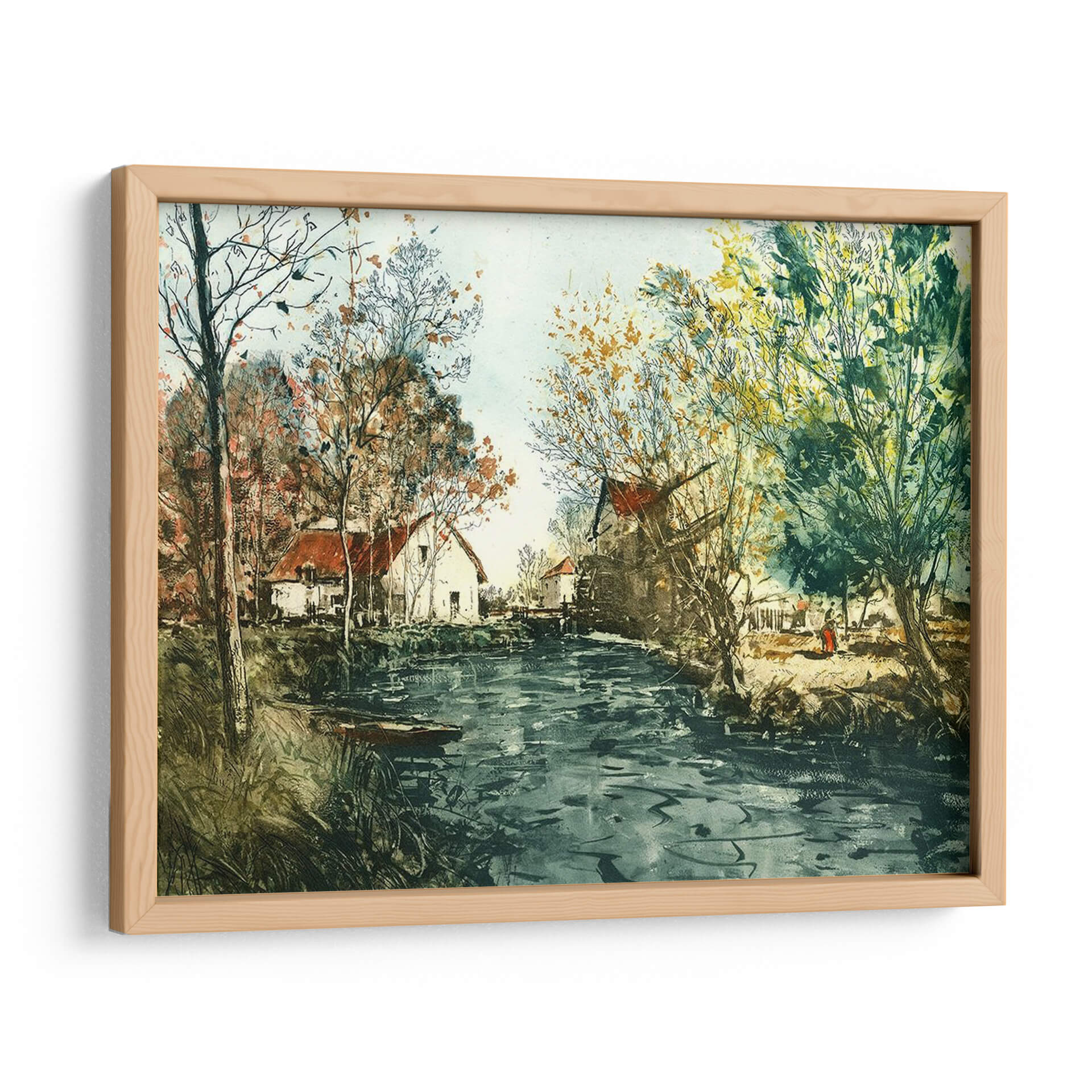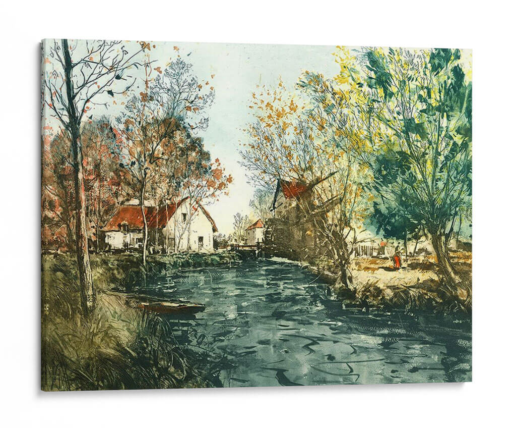 Sumérgete en la serenidad y el encanto rústico de "Paisaje de Otoño III", una obra de arte que captura la esencia de una escena campestre atemporal. Este cuadro decorativo te transporta a un día tranquilo junto a un río sereno, flanqueado por árboles que exhiben los vibrantes colores del otoño. Las hojas doradas y rojizas contrastan maravillosamente con el verde profundo del follaje y los tonos grises y azules del agua, creando una paleta rica y envolvente. La composición, con sus casas de tejados rojos y un molino pintoresco en la distancia, evoca una sensación de paz y nostalgia. La técnica pictórica sugiere un estilo impresionista o postimpresionista, con pinceladas sueltas que dan vida a la escena y capturan la luz de manera magistral. Es la pieza ideal para añadir un toque de naturaleza y tranquilidad a tu sala de estar, comedor o incluso a un estudio. Este cuadro decorativo no solo embellece tu espacio, sino que también invita a la contemplación y al disfrute de la belleza efímera de la estación otoñal. Transforma tu hogar en un refugio de calma y estilo con este evocador paisaje.