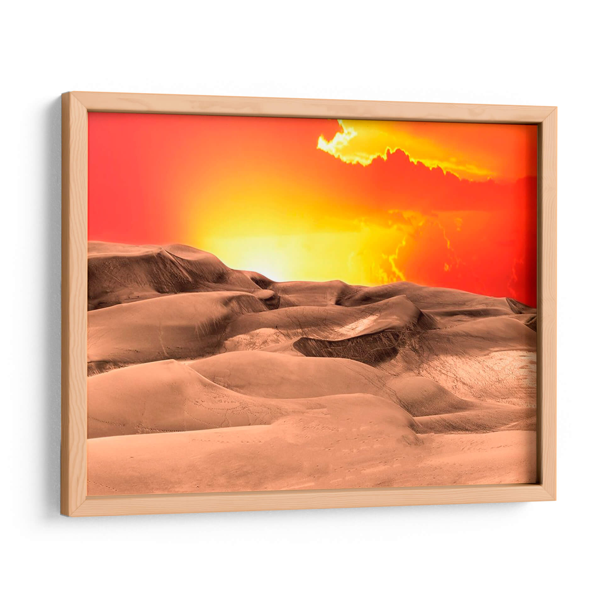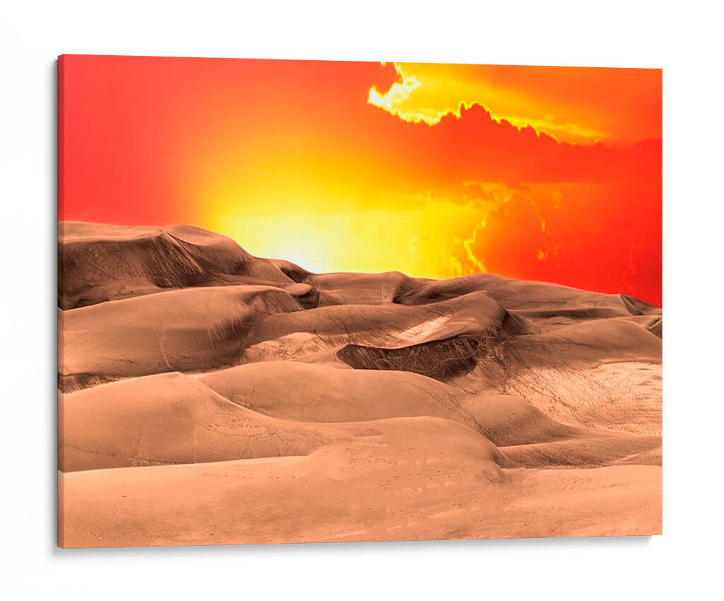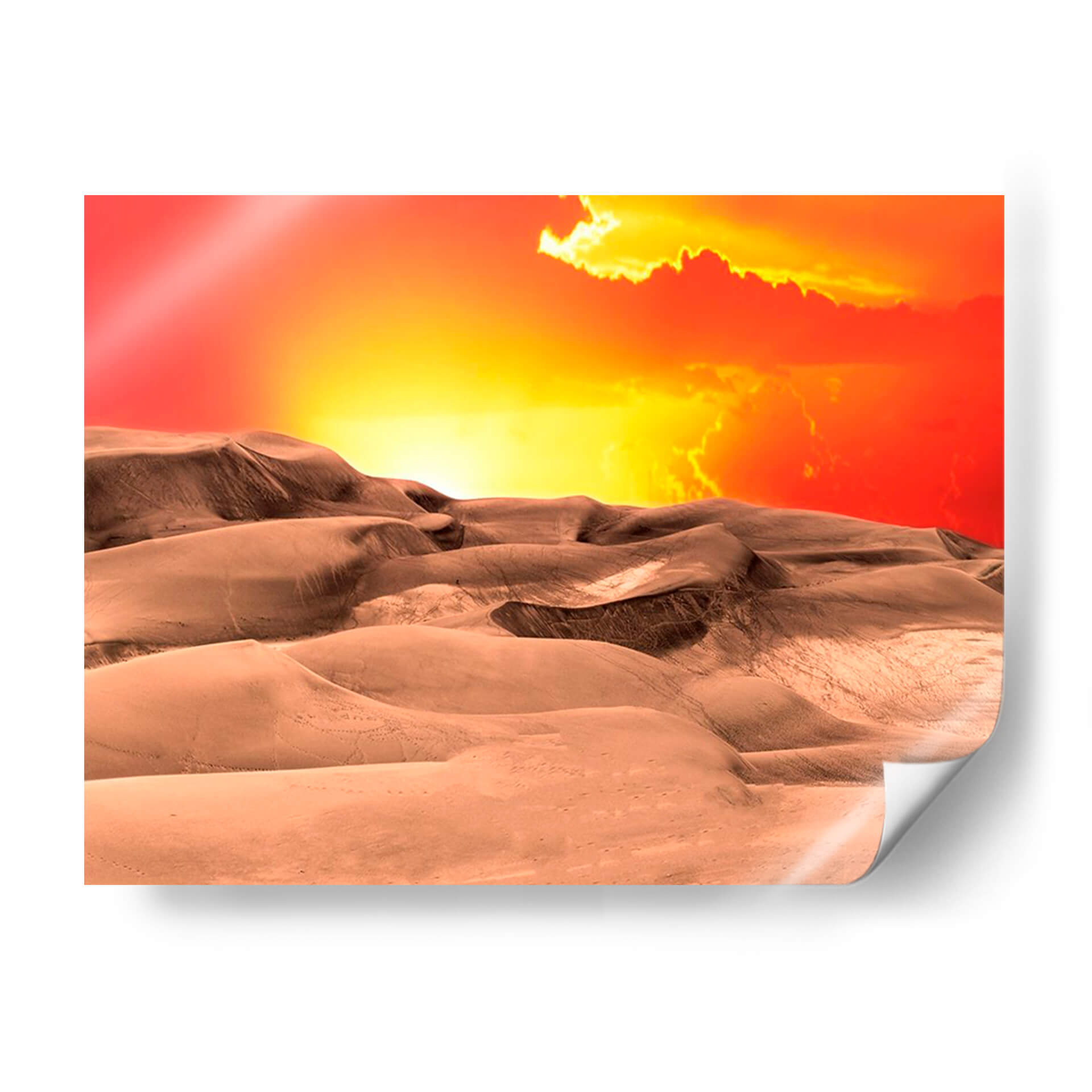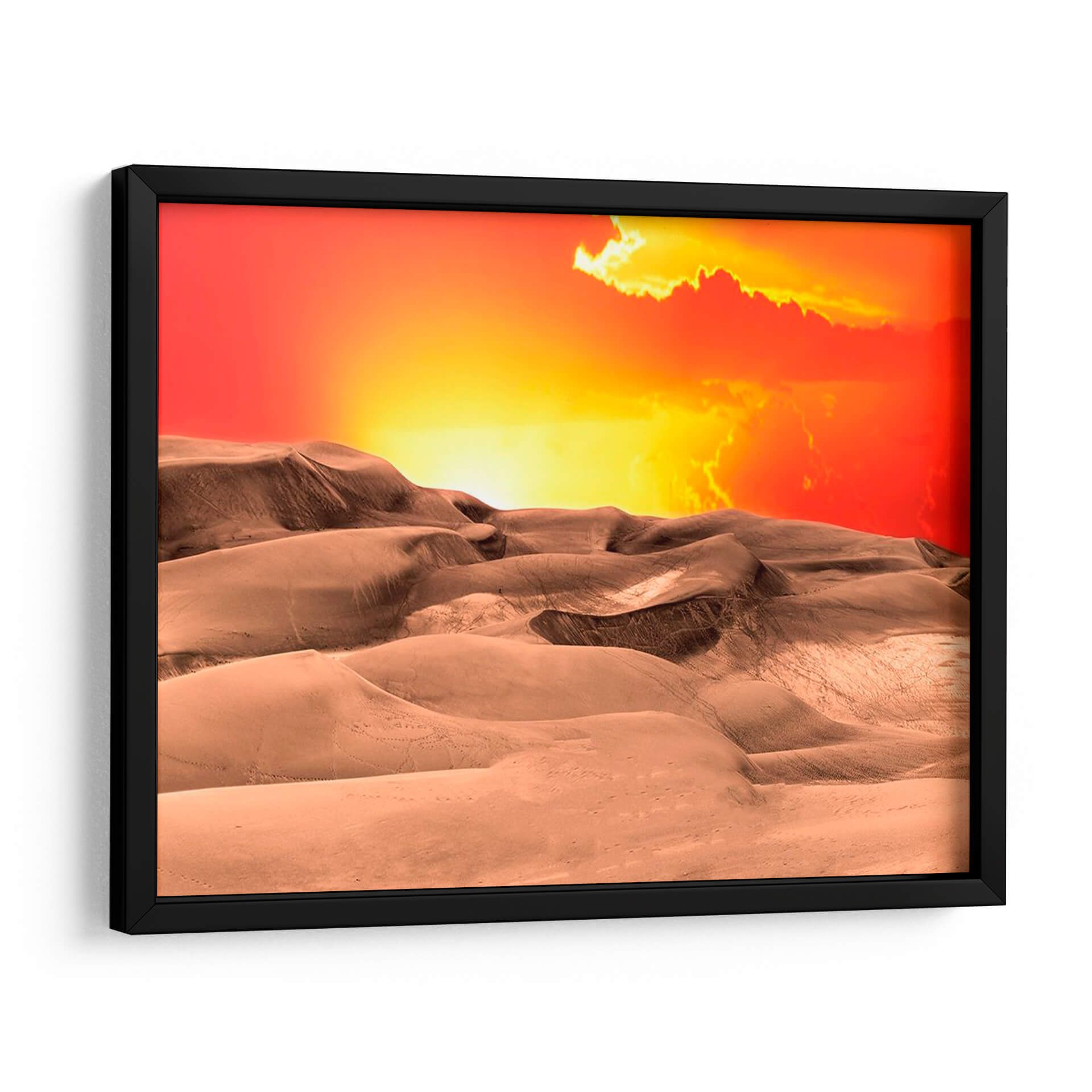 Sumérgete en la inmensidad y el calor del desierto con este impactante cuadro decorativo 'Paisaje Occidental Foto Vii' de James McLoughlin. La obra captura la majestuosidad de las dunas bajo un cielo ardiente, donde el sol se filtra entre nubes dramáticas, creando un juego de luces y sombras que realza la textura y las formas ondulantes del paisaje. Predominan los tonos cálidos, desde los ocres y terracotas de la arena hasta los intensos naranjas y rojos del atardecer o amanecer, generando una atmósfera de energía, vitalidad y una belleza cruda y atemporal. La composición se centra en la perspectiva de las dunas, invitando al espectador a perderse en su vastedad y a sentir la serenidad y el poder de la naturaleza. Este cuadro es ideal para añadir un toque de dramatismo y calidez a cualquier sala de estar, estudio u oficina, sirviendo como un punto focal que evoca aventura y la exploración de horizontes lejanos. Su estilo fotográfico con un tratamiento de color intenso lo convierte en una pieza única para aquellos que buscan una conexión con la naturaleza salvaje y paisajes evocadores.