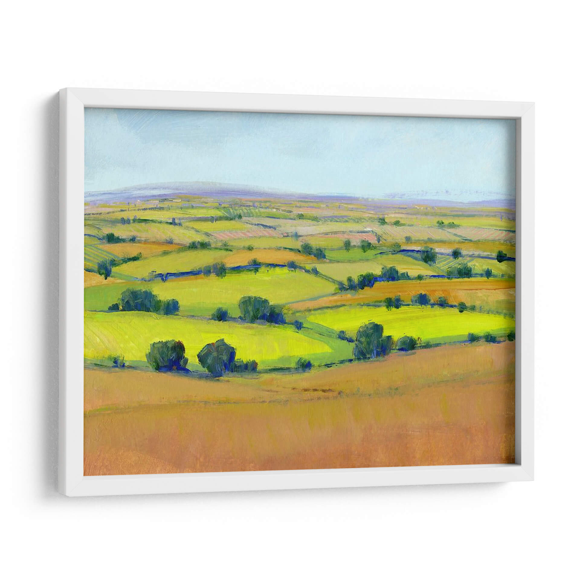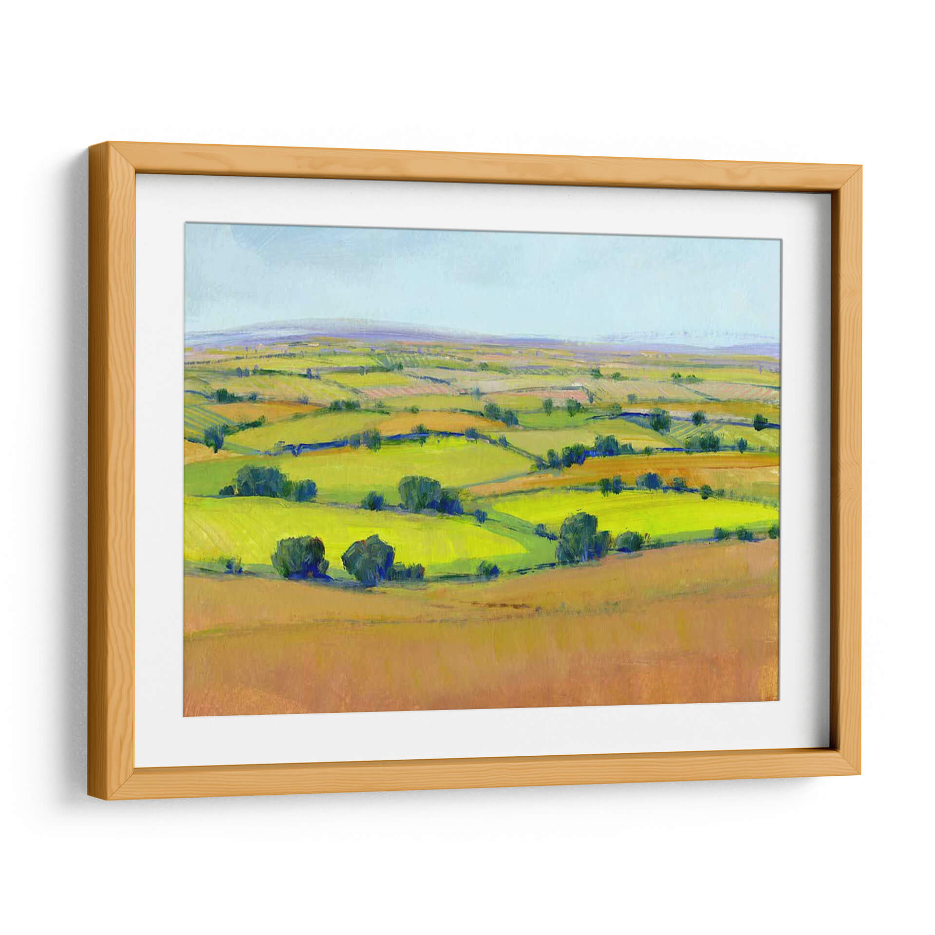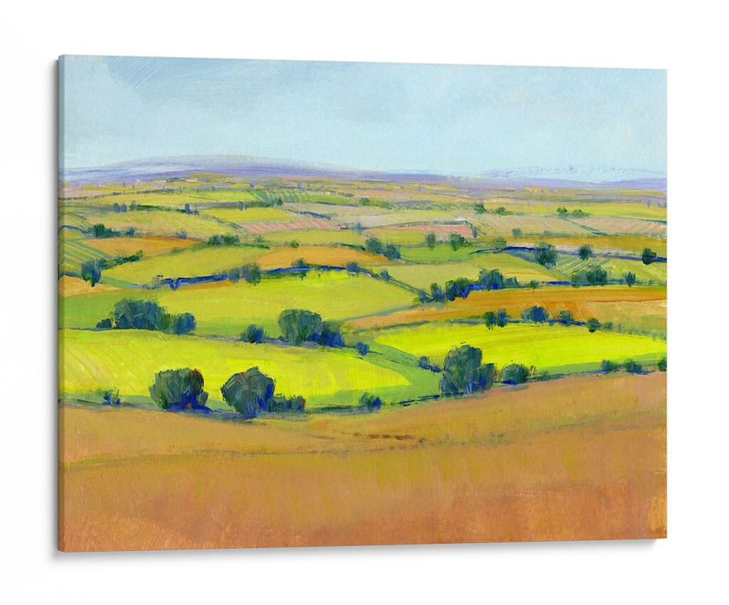 Sumérgete en la serenidad de un paisaje rural con "Patchwork Vista II" de Tim O'Toole. Este cuadro decorativo captura la esencia de un campo ondulado, dividido en retazos de vivos verdes y cálidos tonos tierra. La pincelada suelta y expresiva evoca la sensación de una brisa suave que acaricia los prados, mientras que la paleta de colores, dominada por verdes luminosos, ocres y un cielo azul sereno, transmite una atmósfera de paz y vitalidad. La composición, que se extiende hasta el horizonte con suaves colinas, invita a la contemplación y transporta al espectador a un estado de calma. Es la pieza perfecta para añadir un toque de naturaleza y luminosidad a tu hogar u oficina, ideal para salas de estar, dormitorios o estudios donde busques un refugio visual. Este lienzo es una invitación a la relajación y a la apreciación de la belleza simple y vibrante del campo.