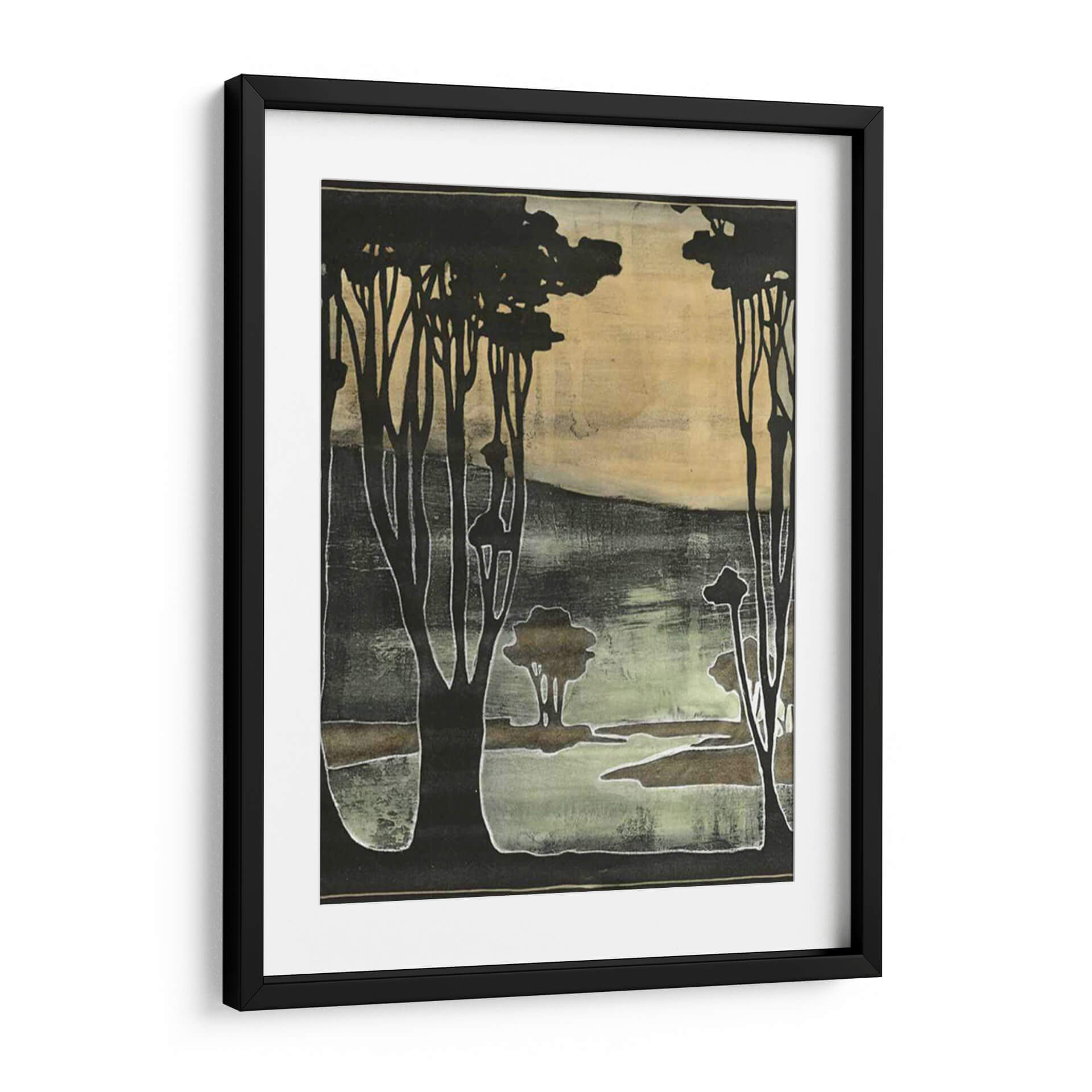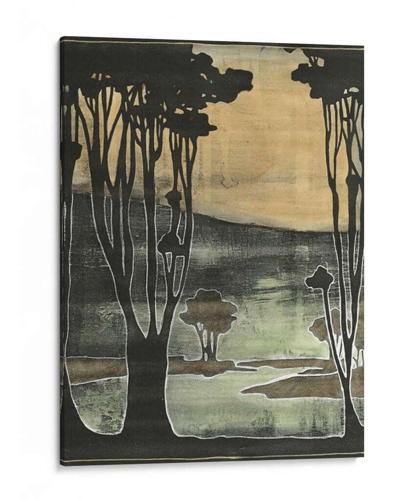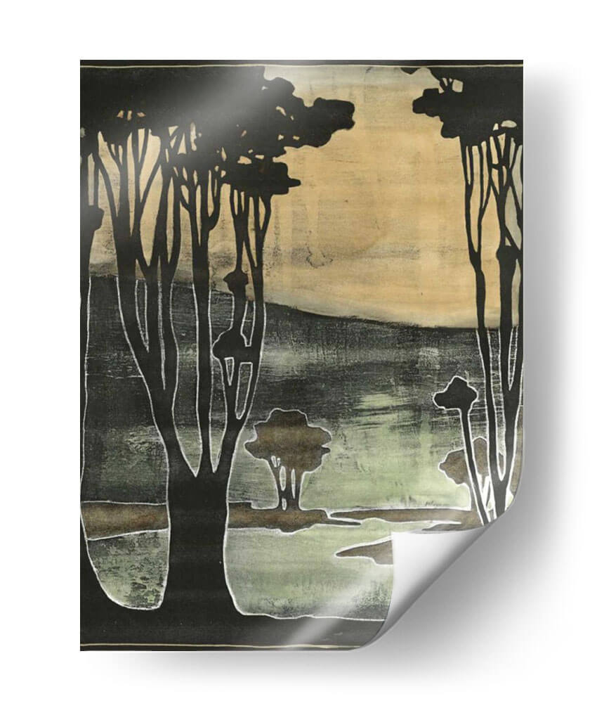 Sumérgete en la serena belleza de "Pequeños Árboles Nouveau II", una obra de arte contemporáneo que evoca la tranquilidad de un paisaje natural estilizado. Jennifer Goldberger nos presenta una composición cautivadora donde siluetas oscuras de árboles se recortan contra un fondo etéreo de tonos ocres y verdes musgo. La técnica utilizada crea una textura visual rica, casi como un grabado antiguo, con contornos nítidos y áreas de color difuminado que aportan profundidad y misterio. Esta pieza es ideal para quienes buscan añadir un toque de sofisticación natural y calma a sus espacios. El juego de luces y sombras, junto con la paleta de colores terrosos y apagados, confiere a la obra una atmósfera introspectiva y pacífica, perfecta para un rincón de lectura, un dormitorio o un estudio. "Pequeños Árboles Nouveau II" no es solo un cuadro decorativo, sino una invitación a la contemplación, capaz de transformar cualquier ambiente en un refugio de serenidad y estilo. Su diseño versátil se adapta a decoraciones modernas y clásicas, aportando un punto focal distintivo sin abrumar el espacio. Descubre la magia de este cuadro decorativo y deja que su esencia natural enriquezca tu hogar.