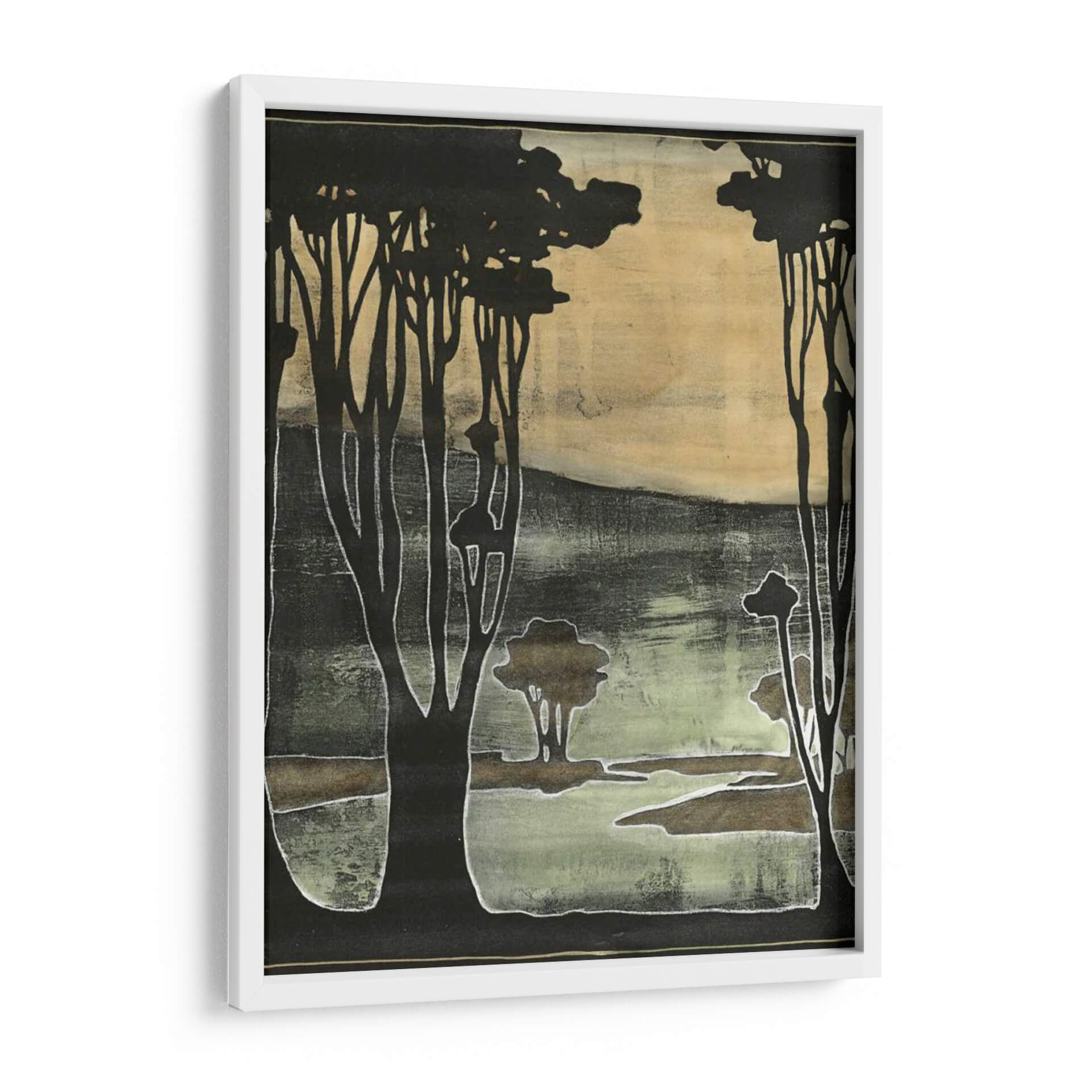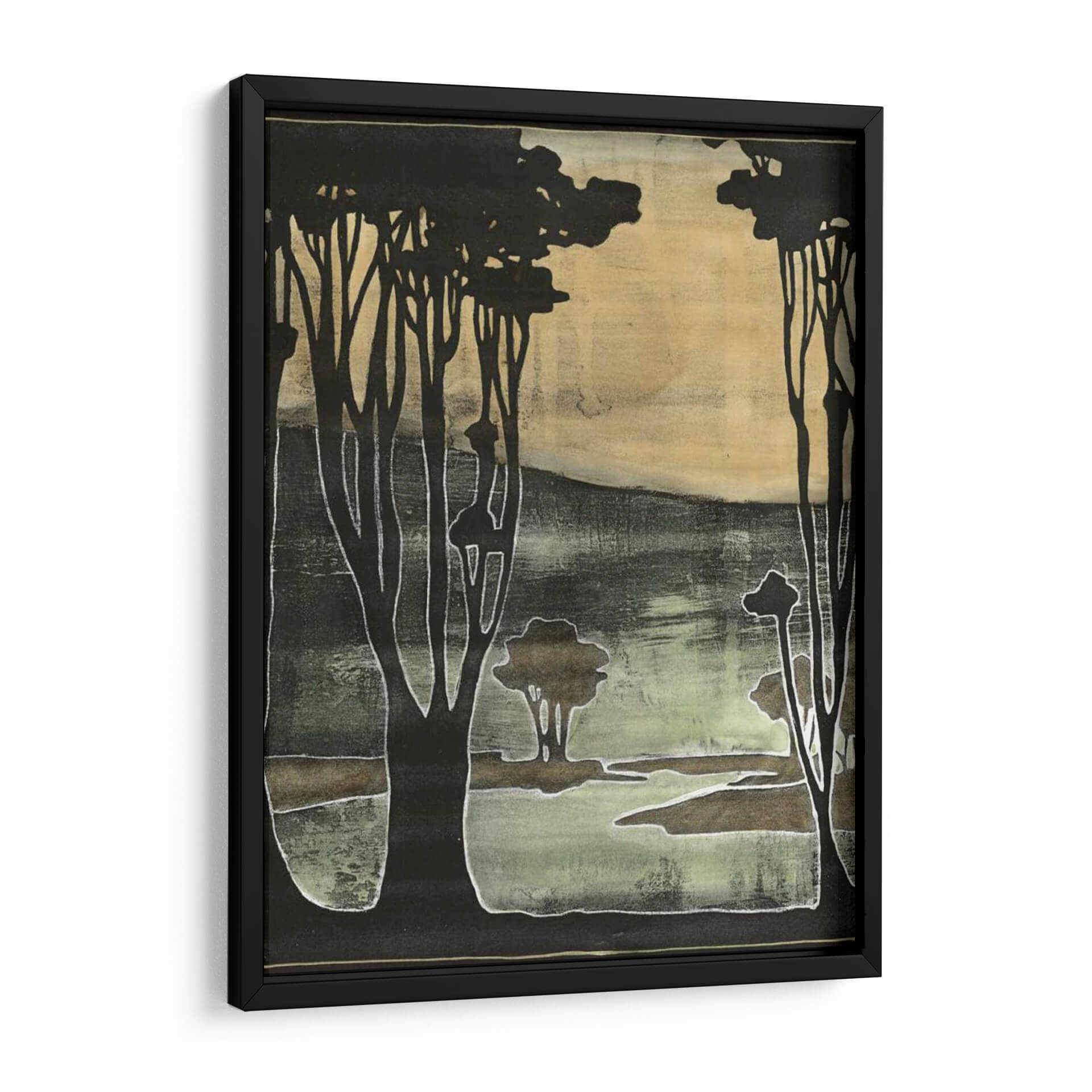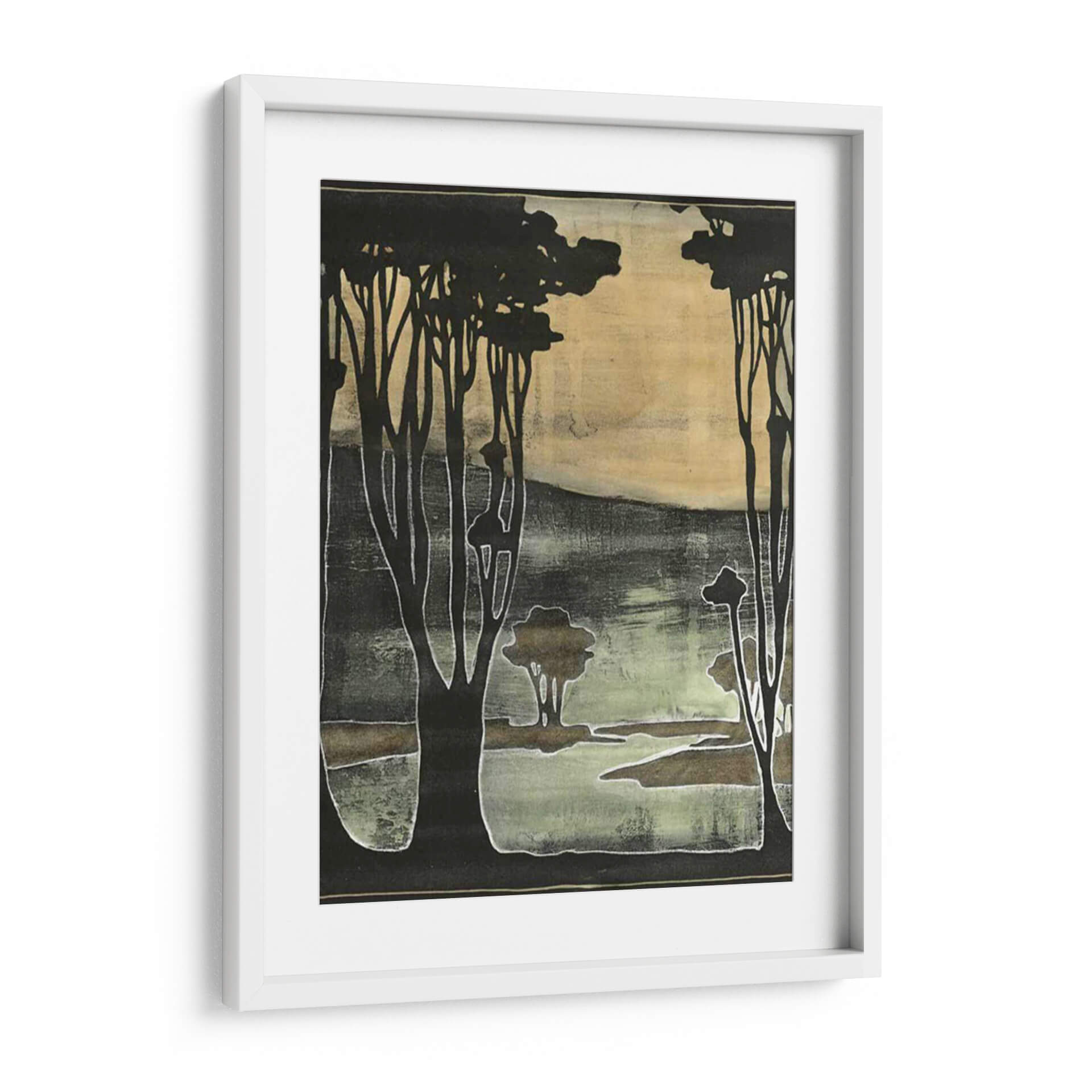 Sumérgete en la serena belleza de "Pequeños Árboles Nouveau II", una obra de arte contemporáneo que evoca la tranquilidad de un paisaje natural estilizado. Jennifer Goldberger nos presenta una composición cautivadora donde siluetas oscuras de árboles se recortan contra un fondo etéreo de tonos ocres y verdes musgo. La técnica utilizada crea una textura visual rica, casi como un grabado antiguo, con contornos nítidos y áreas de color difuminado que aportan profundidad y misterio. Esta pieza es ideal para quienes buscan añadir un toque de sofisticación natural y calma a sus espacios. El juego de luces y sombras, junto con la paleta de colores terrosos y apagados, confiere a la obra una atmósfera introspectiva y pacífica, perfecta para un rincón de lectura, un dormitorio o un estudio. "Pequeños Árboles Nouveau II" no es solo un cuadro decorativo, sino una invitación a la contemplación, capaz de transformar cualquier ambiente en un refugio de serenidad y estilo. Su diseño versátil se adapta a decoraciones modernas y clásicas, aportando un punto focal distintivo sin abrumar el espacio. Descubre la magia de este cuadro decorativo y deja que su esencia natural enriquezca tu hogar.