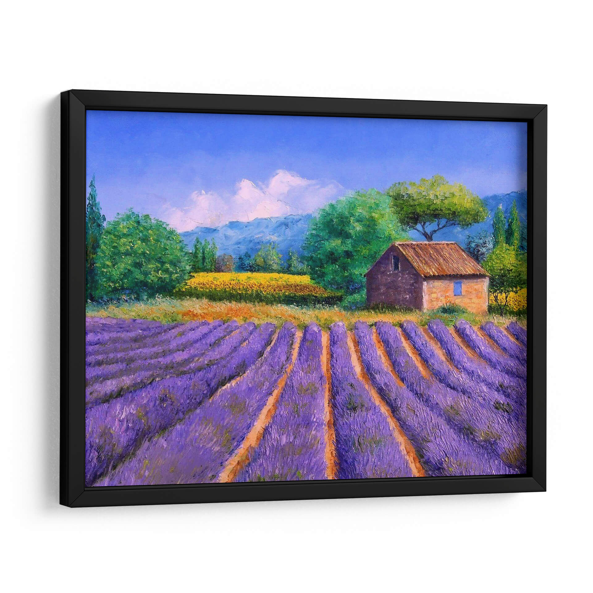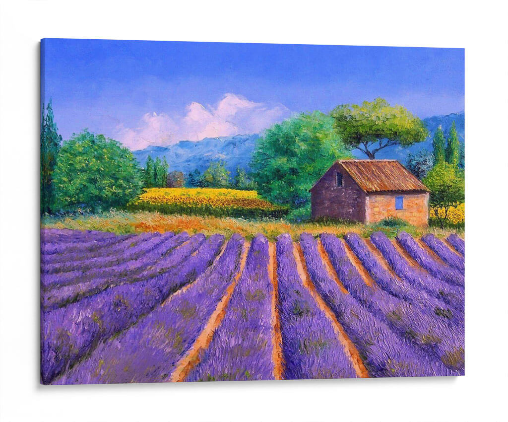 Sumérgete en la serenidad de la Provenza con este cautivador cuadro decorativo de un campo de lavanda. La obra captura la esencia de un paisaje rural francés bañado por la luz del sol, donde hileras vibrantes de lavanda morada se extienden hacia un cielo azul intenso y despejado. Una pintoresca casa de campo de piedra con un tejado de terracota y una ventana azul añade un toque de encanto rústico al idílico escenario, rodeada de exuberante vegetación y un campo de girasoles dorados que contrastan maravillosamente. El estilo pictórico, con pinceladas visibles y una rica paleta de colores, evoca una sensación de paz y tranquilidad, transportando al espectador a un remanso de calma y belleza natural. Este cuadro es ideal para infundir serenidad y un toque de color a cualquier espacio, ya sea una sala de estar, un dormitorio o una entrada. Transforma tu hogar en un refugio de paz con esta evocadora representación de la naturaleza, perfecta para quienes buscan arte que inspire relajación y una conexión con el mundo natural.