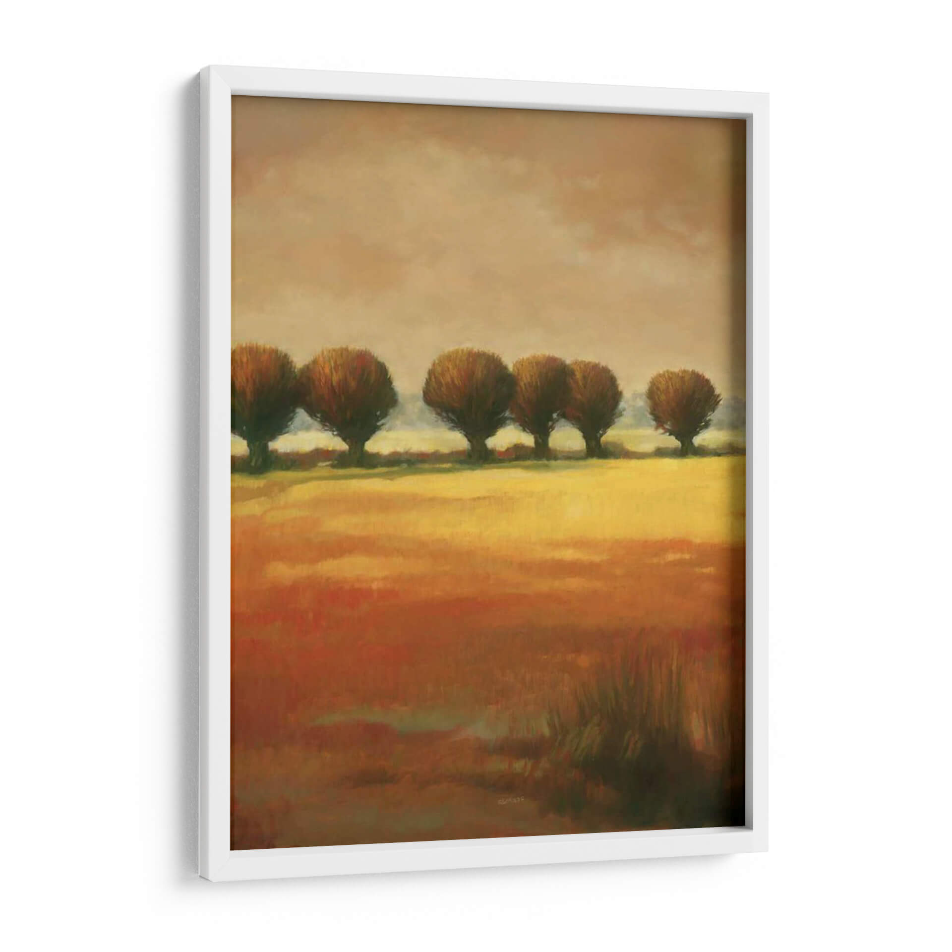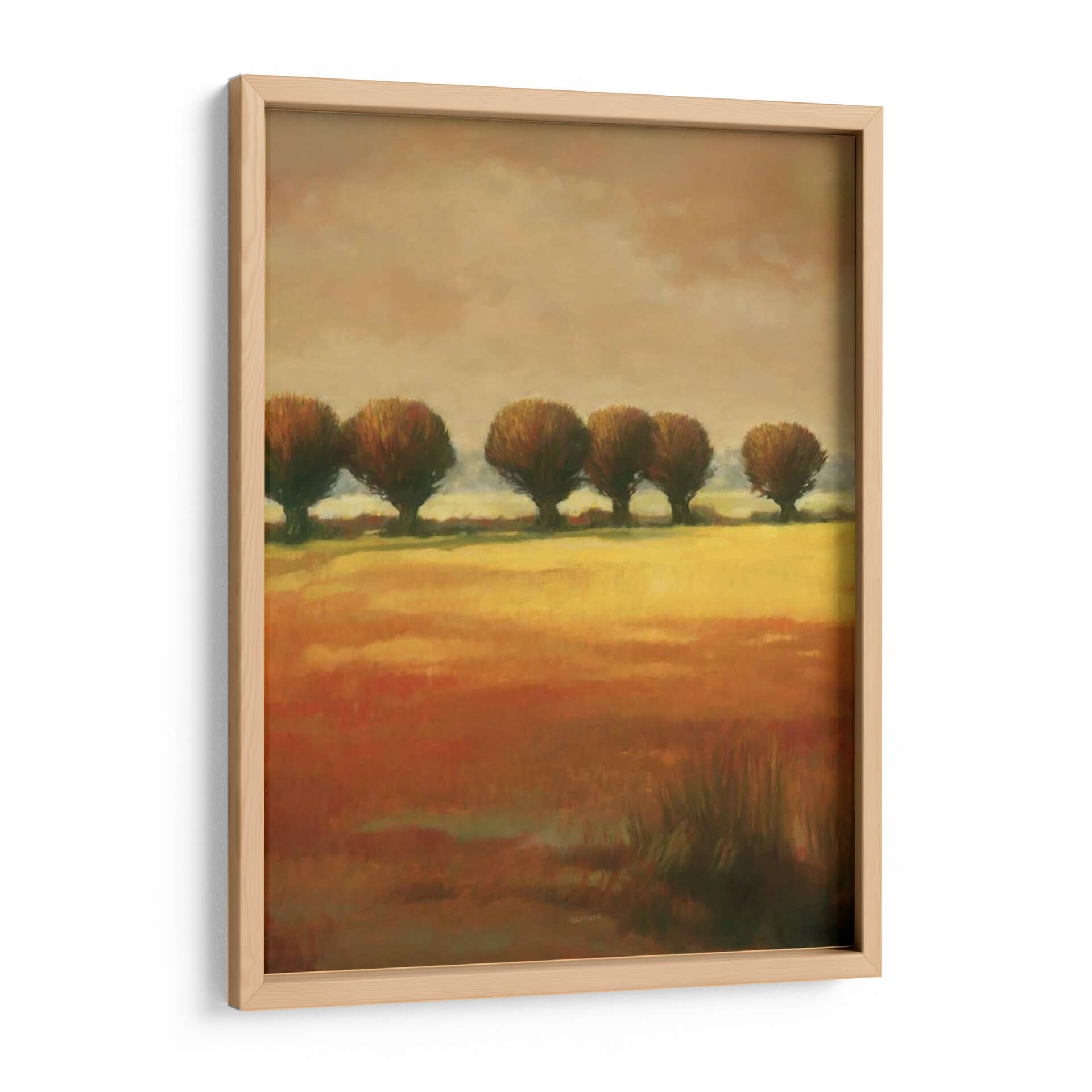 Sumérgete en la serena belleza de "Pollard Willow I", una obra de arte que captura la esencia de un paisaje otoñal bañado por una luz cálida y envolvente. Este cuadro decorativo, del artista Graham Reynolds, presenta una fila de árboles de sauce polaco, cuyas copas redondeadas y densas se alinean contra un cielo brumoso en tonos ámbar y terracota. El primer plano se despliega en un campo de colores dorados y rojizos intensos, sugiriendo la riqueza de la tierra y la hierba de secano, con toques de verde musgo que aportan profundidad y contraste. La técnica pictórica, con pinceladas visibles pero suaves, evoca una atmósfera de calma y contemplación, casi como si el tiempo se detuviera en este instante mágico. "Pollard Willow I" es ideal para añadir un toque de naturaleza evocadora y calidez a cualquier espacio, desde salones y comedores hasta estudios u oficinas, transformando el ambiente en un remanso de paz y sofisticación contemporánea. Su paleta de colores terrosos y la composición armoniosa lo convierten en una pieza versátil que complementa a la perfección decoraciones de estilo rústico, moderno o ecléctico, invitando a la reflexión y al disfrute estético.