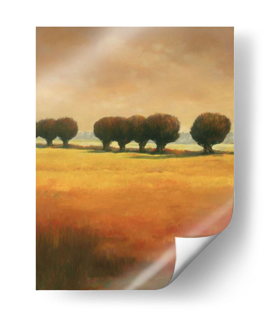 Sumérgete en la serenidad de 'Pollard Willow II', una obra de arte que captura la esencia de un paisaje tranquilo y evocador. El artista Graham Reynolds nos transporta a un campo bañado por la cálida luz dorada de un atardecer o amanecer, donde un grupo de sauces de copa redondeada se alza majestuosamente contra un cielo nublado de tonos ocres y anaranjados. La técnica pictórica, con pinceladas sueltas y una rica textura, otorga profundidad y movimiento a la escena, invitando a la contemplación. Los colores cálidos predominantes, que van desde el amarillo dorado del campo hasta los tonos tierra del cielo y los verdes oscuros de los árboles, crean una atmósfera acogedora y pacífica. Este cuadro decorativo es perfecto para añadir un toque de naturaleza y calma a tu salón, dormitorio o despacho, convirtiéndose en un punto focal que invita a la relajación y al sosiego. Su estilo figurativo, con una ligera abstracción, permite que cada espectador interprete su propia narrativa. Una pieza ideal para quienes buscan infundir armonía y calidez en su hogar, combinando la belleza del arte contemporáneo con la atemporalidad de los paisajes naturales. Descubre la magia de los campos dorados y los árboles solitarios con este impresionante cuadro.
