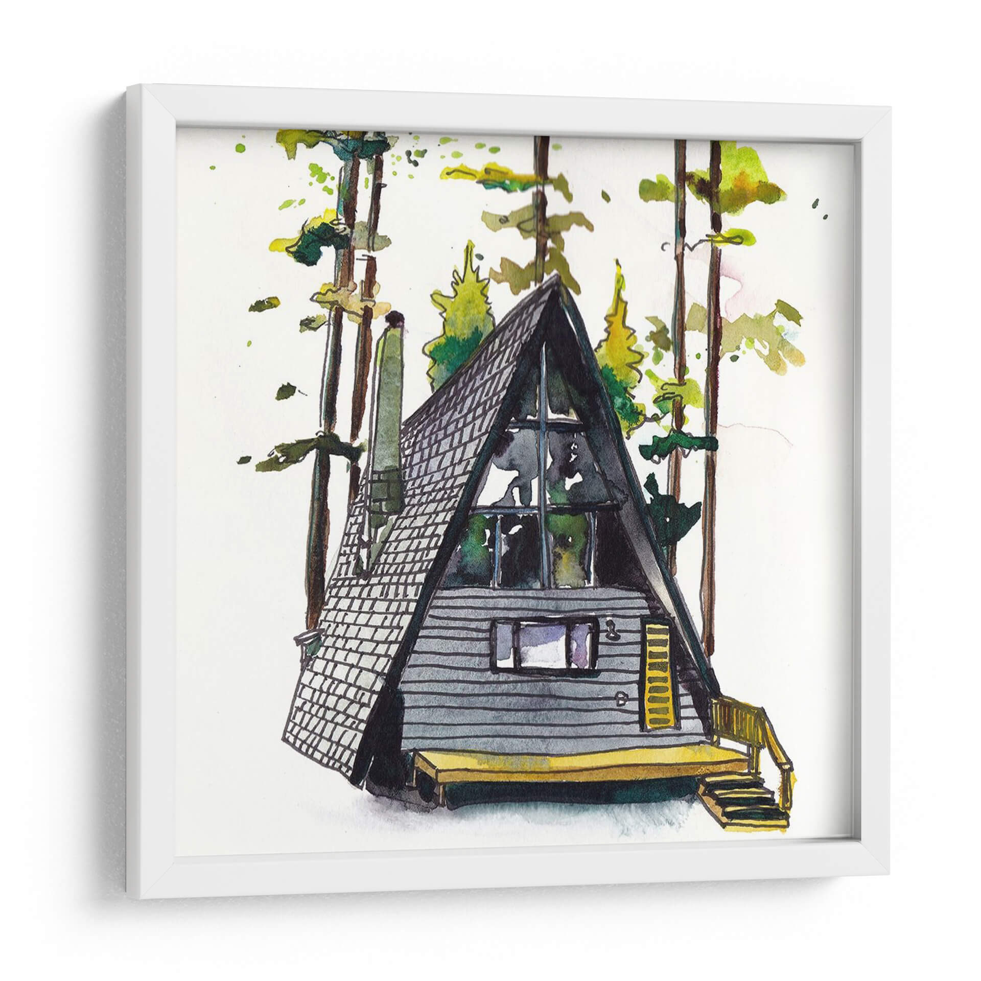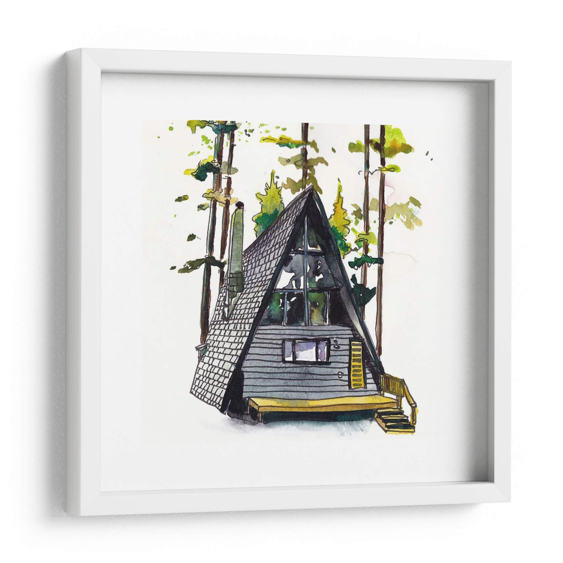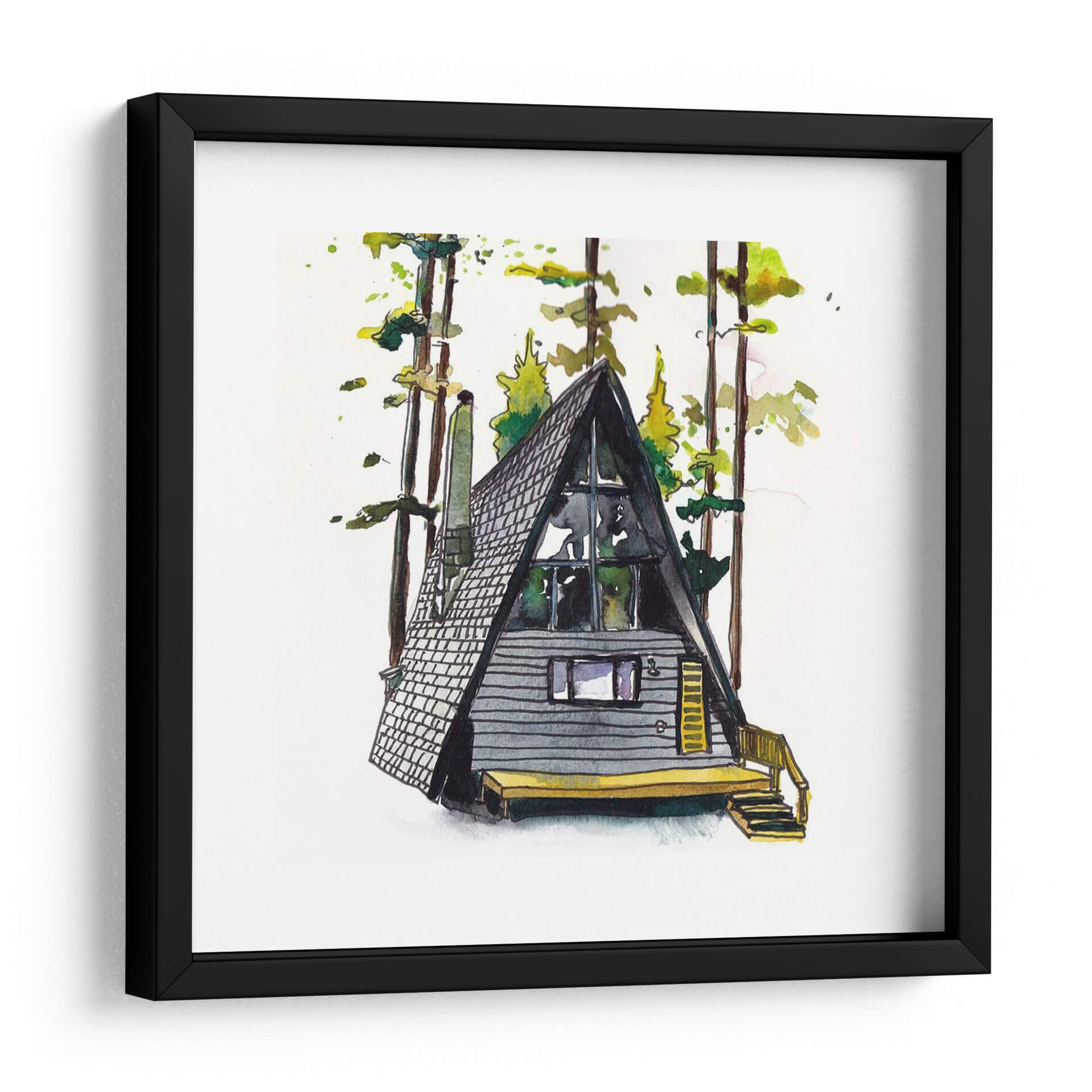 Sumérgete en la serenidad del bosque con "Rad Cabina II", una cautivadora obra de arte que captura la esencia de una cabaña acogedora rodeada de imponentes árboles. La técnica de acuarela utilizada por Scherrer Finch evoca una atmósfera etérea y tranquila, con pinceladas sueltas que dan vida a la escena. Los tonos grises y oscuros de la cabaña contrastan armoniosamente con los verdes vibrantes y los toques amarillos del follaje y la terraza, creando un equilibrio visualmente agradable. El estilo distintivo de la ilustración, con líneas definidas y toques de color vibrante, aporta un aire contemporáneo a esta pieza inspirada en la naturaleza. Perfecta para quienes buscan añadir un toque de calma y conexión con el exterior a su hogar u oficina, este cuadro decorativo es ideal para salas de estar, estudios o dormitorios, invitando a la contemplación y al descanso. Su composición centrada en la cabaña triangular, un elemento arquitectónico icónico, resalta la simplicidad y el encanto de la vida en el bosque. Este cuadro es una invitación a crear un refugio personal, un espacio donde la naturaleza y el arte se fusionan para inspirar paz y bienestar. Es una adición encantadora para cualquier amante de la decoración rústica o minimalista.