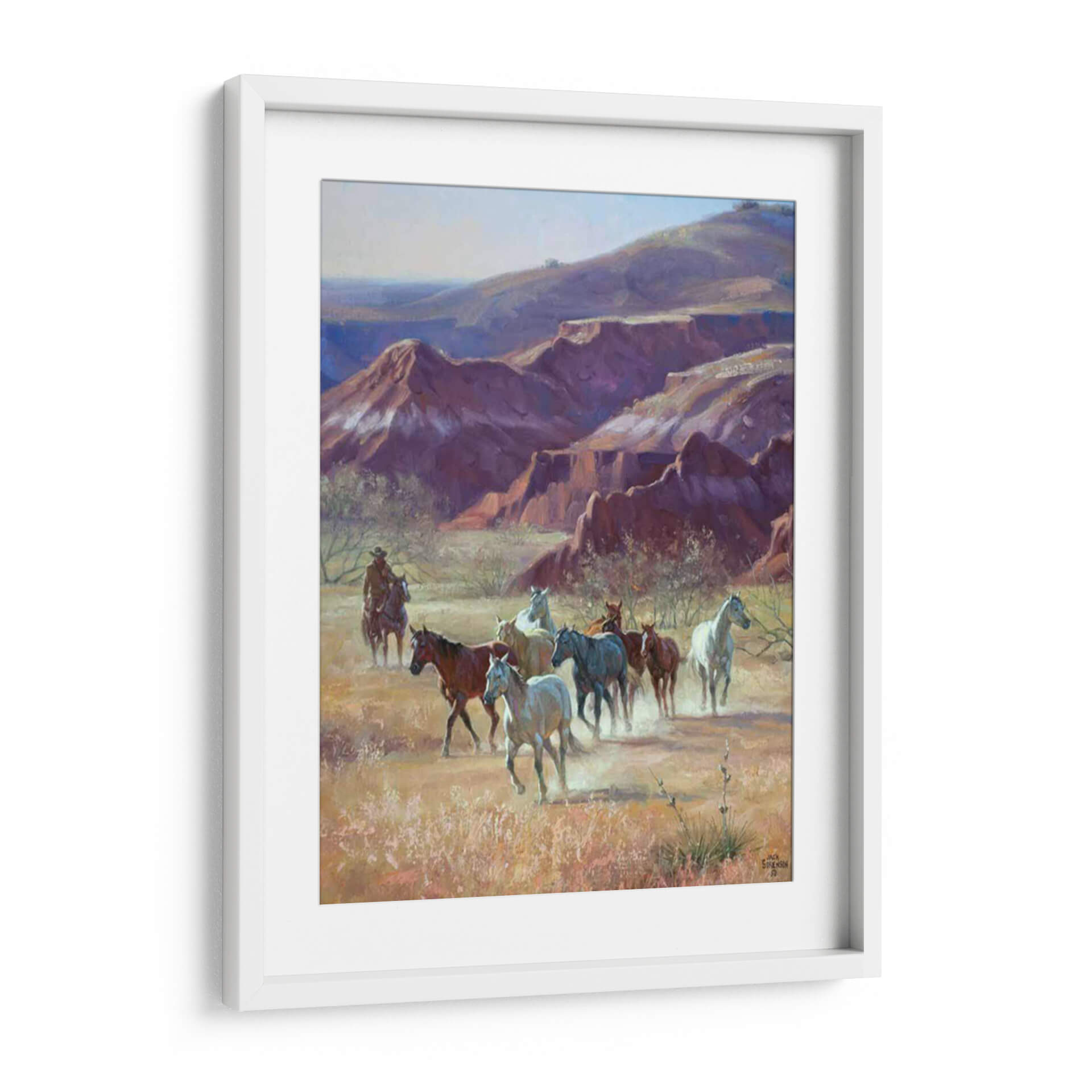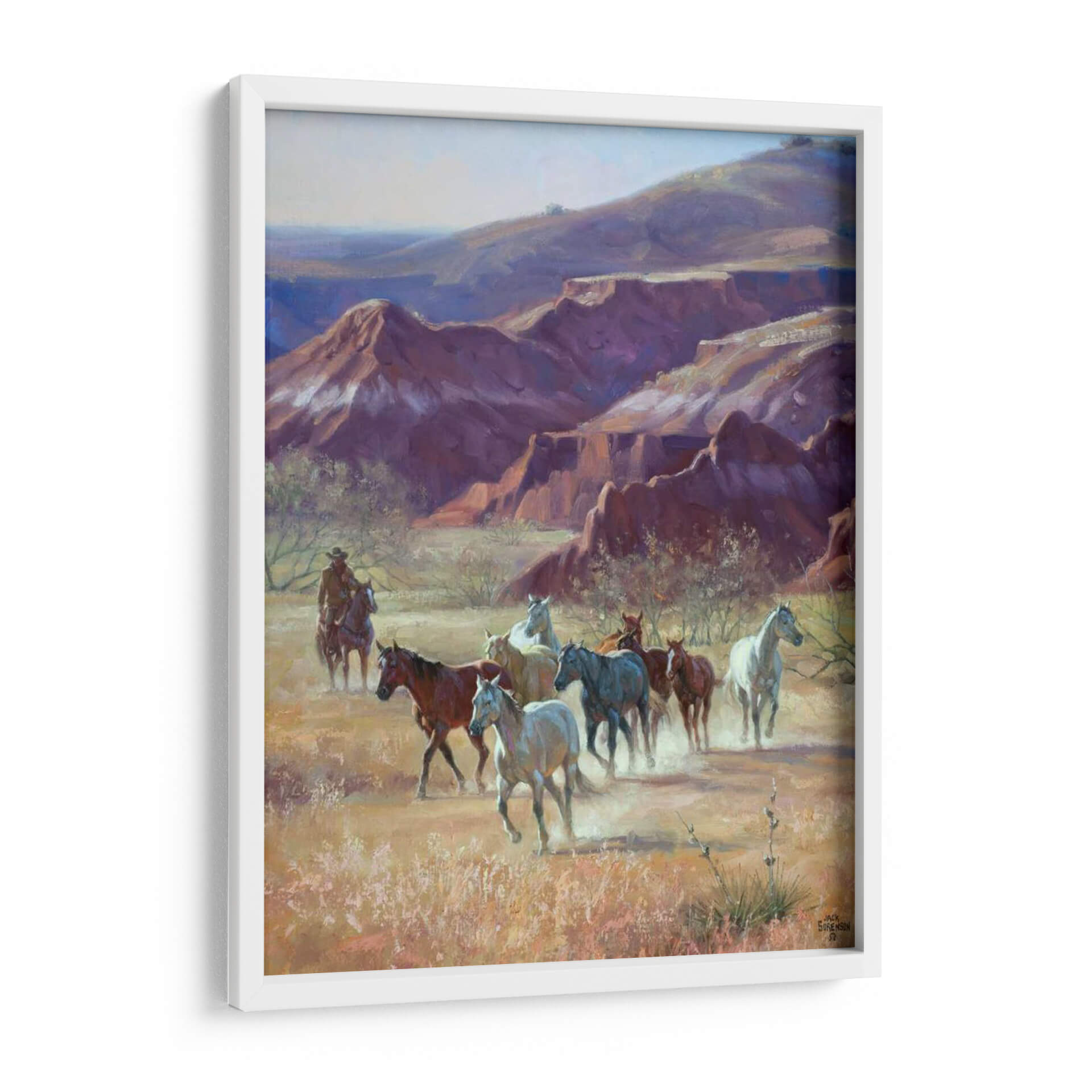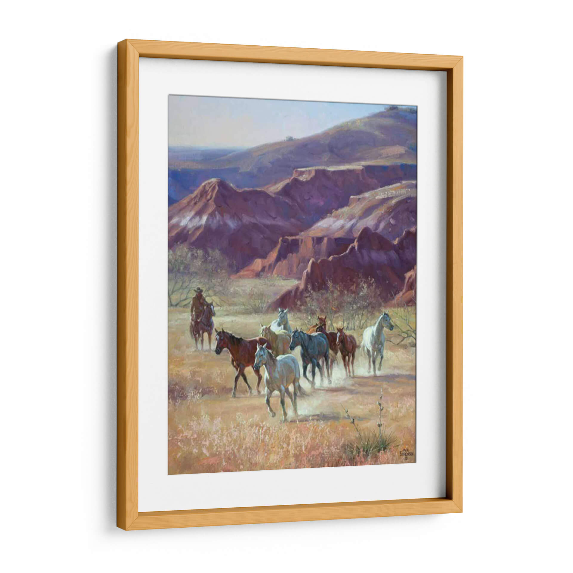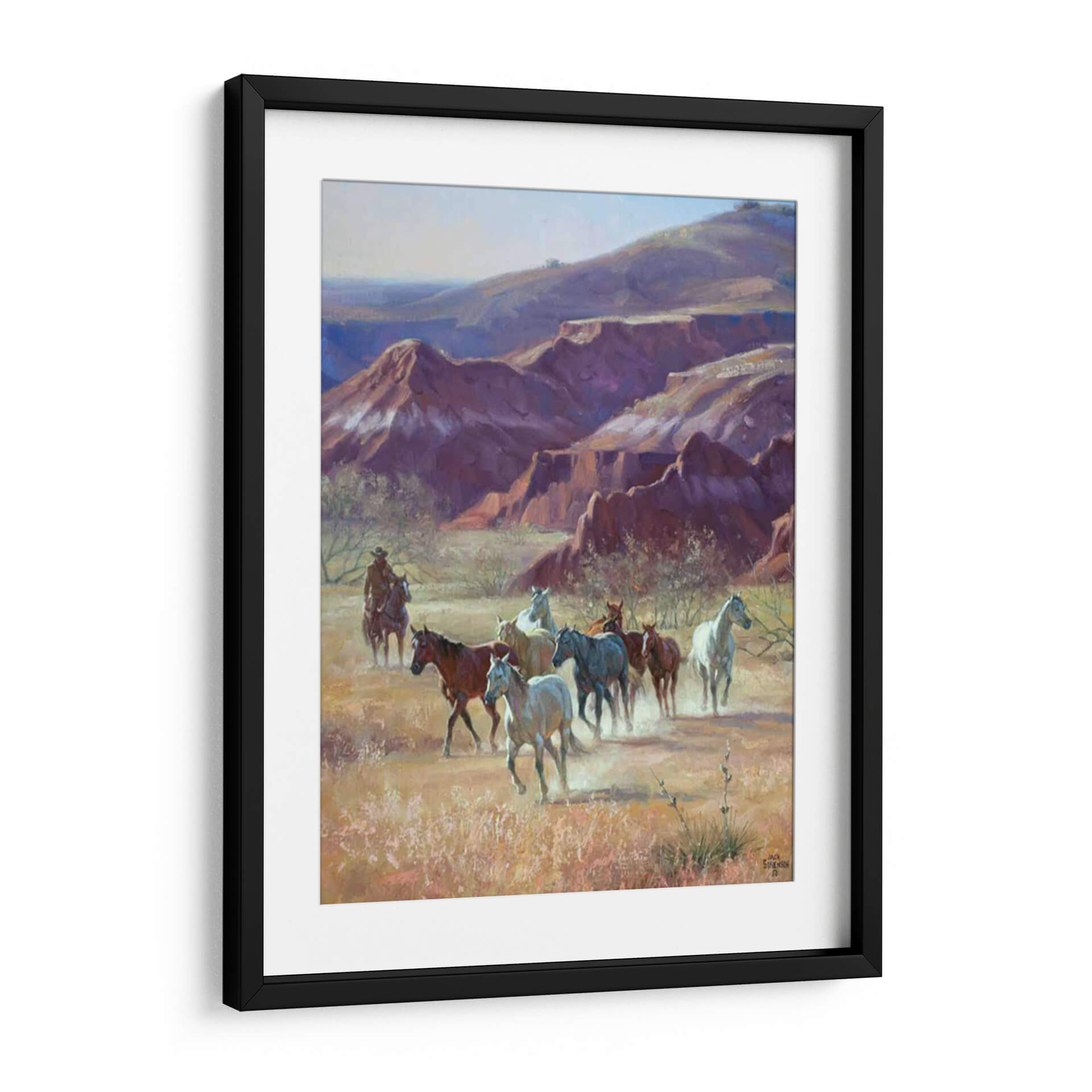 Captura la esencia salvaje del oeste con "Río Breaks Bunch", una obra maestra de Jack Sorenson que evoca la libertad y la fuerza indomable de la naturaleza. Este cuadro decorativo presenta una manada de caballos en movimiento a través de un paisaje árido y majestuoso, con formaciones rocosas escarpadas que se alzan contra un cielo teñido de tonos cálidos. La paleta de colores, dominada por ocres, rojos terrosos, azules profundos y los tonos naturales de los caballos, crea una atmósfera de realismo y vitalidad. La composición dinámicamente equilibrada guía la mirada del espectador a través de la escena, desde el vaquero solitario a lo lejos hasta la energía palpable de los caballos que avanzan. El estilo, que combina el realismo con pinceladas evocadoras, dota a la pieza de una textura y profundidad cautivadoras. "Río Breaks Bunch" es más que una simple decoración de pared; es una invitación a sentir la vastedad del paisaje y la libertad de estos magníficos animales. Ideal para un salón rústico, una oficina con temática occidental o cualquier espacio que busque un toque de aventura y conexión con la tierra.