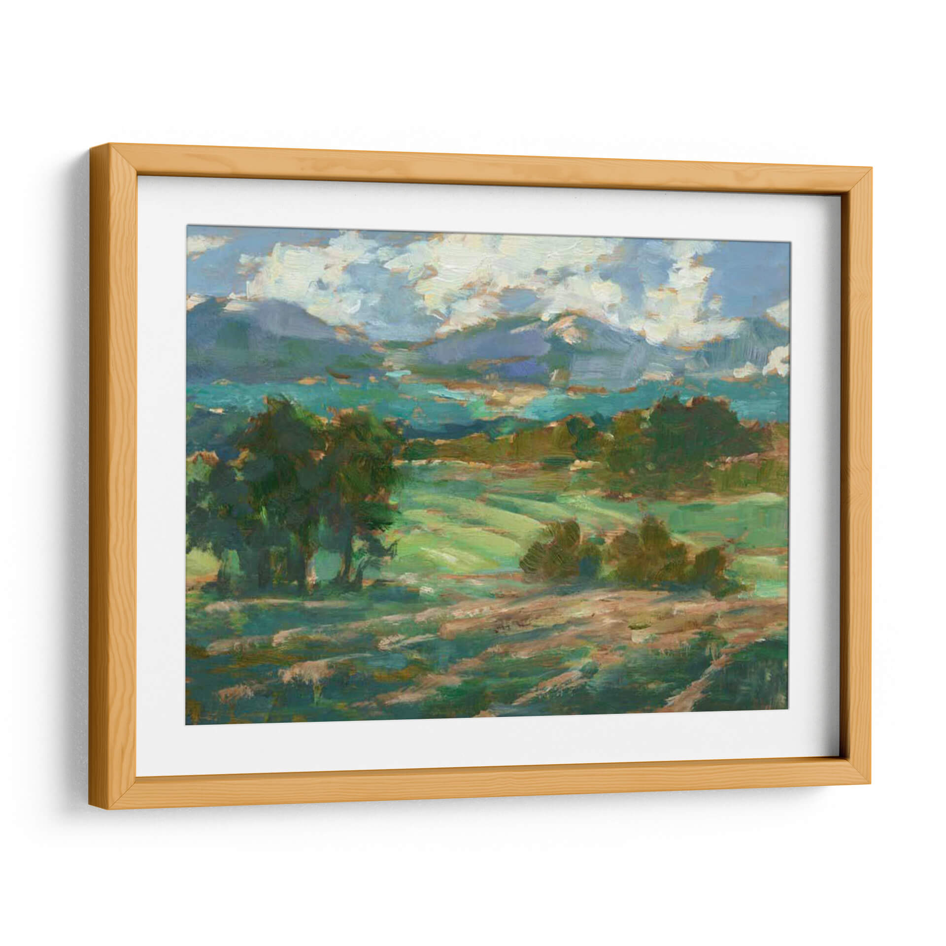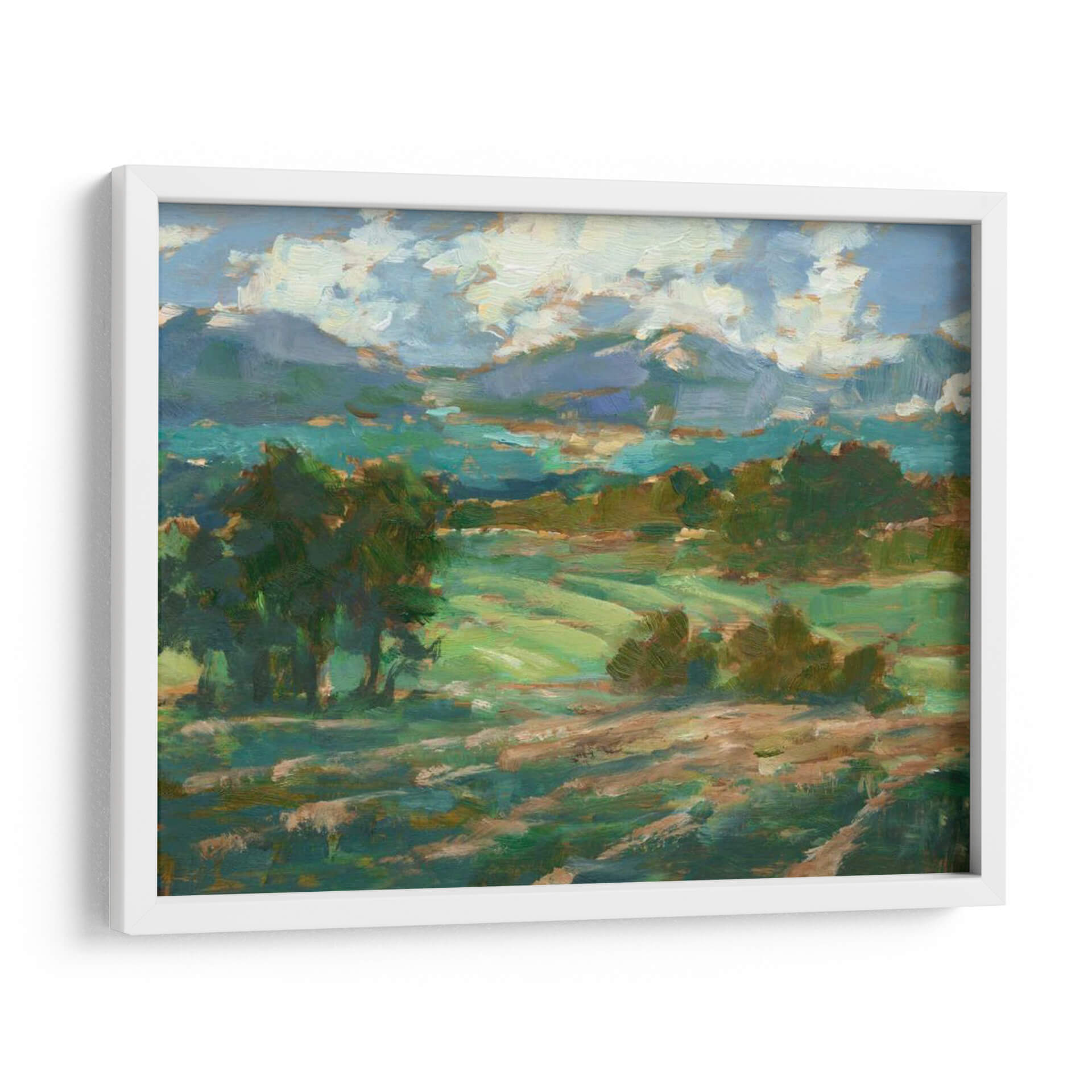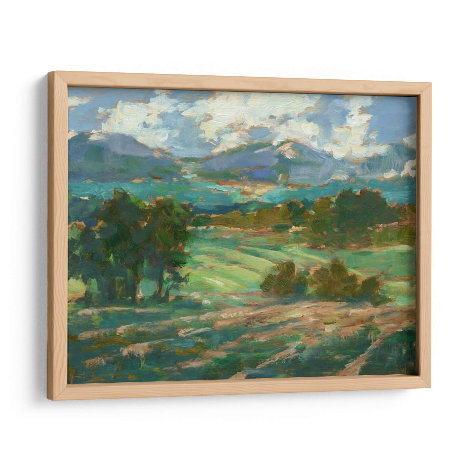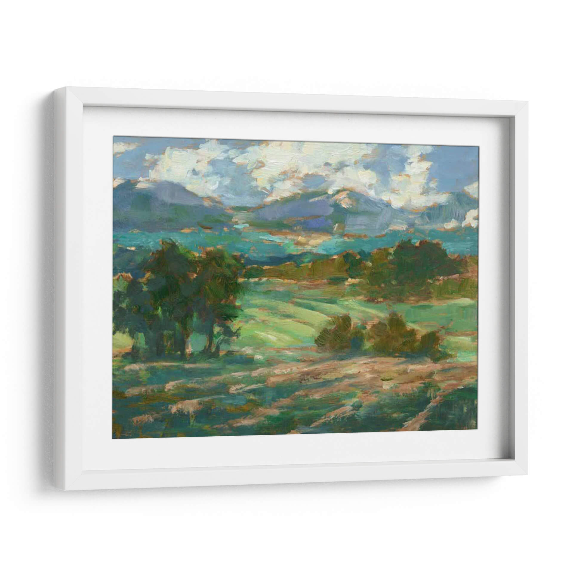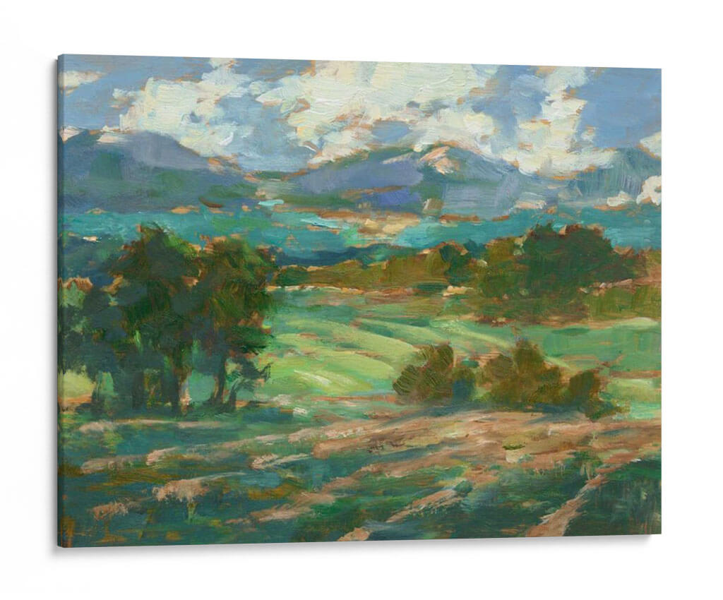Sumérgete en la serenidad de "Rolling Farmland I", una obra de arte que captura la esencia de un paisaje rural bañado por la luz. Este cuadro decorativo, pintado con trazos impresionistas por Ethan Harper, transporta al espectador a través de ondulantes campos verdes y colinas suavemente perfiladas, bajo un cielo vibrante lleno de nubes algodonosas. La paleta de colores, dominada por verdes intensos, azules celestes y toques de tierra cálida, crea una atmósfera de paz y conexión con la naturaleza. La composición dinámica, con árboles frondosos que enmarcan la vista y la perspectiva que se extiende hacia las montañas distantes, invita a la contemplación y al descanso visual. Ideal para añadir un toque de tranquilidad y belleza natural a tu salón, dormitorio u oficina, este cuadro es una ventana a la calma del campo. Su estilo artístico evoca la maestría de los pintores paisajistas, ofreciendo una pieza que combina la frescura contemporánea con la atemporalidad de la naturaleza. "Rolling Farmland I" es más que una decoración; es una invitación a respirar profundo y encontrar la armonía en tu espacio.