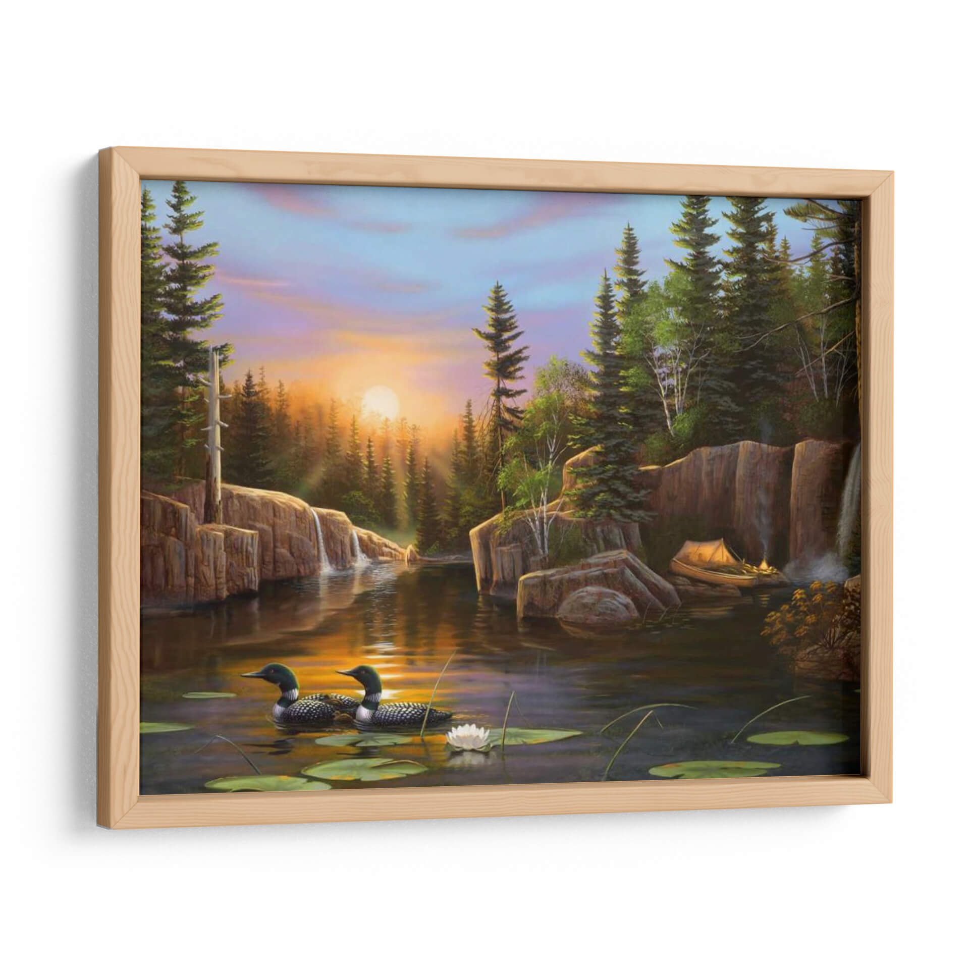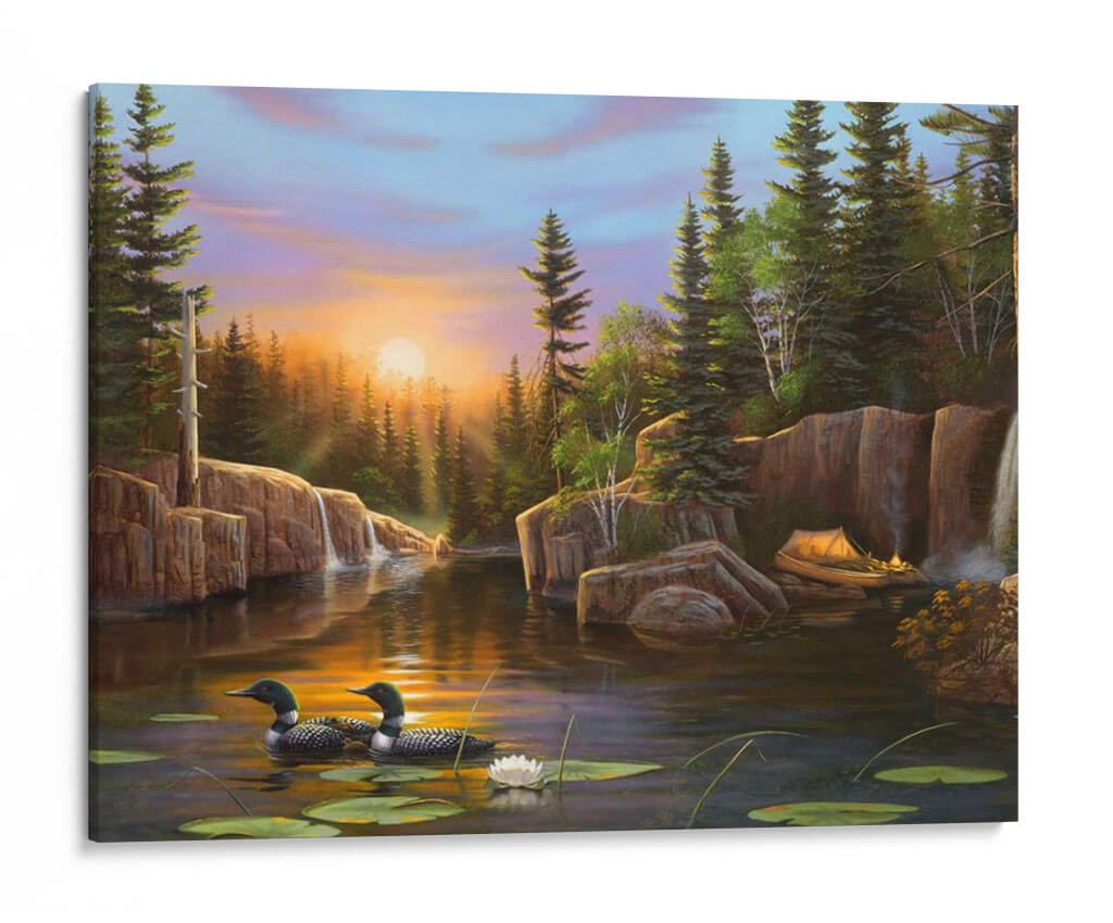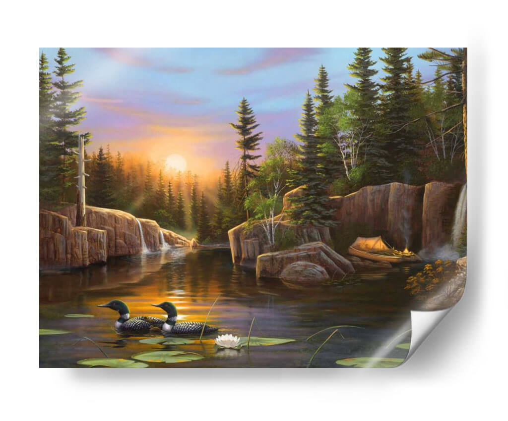 Sumérgete en la serenidad de la naturaleza con "Soledad De La Tarde", una obra de arte que captura la esencia de un atardecer idílico en un entorno natural. El cuadro decorativo presenta un paisaje sereno con un lago tranquilo reflejando los cálidos tonos anaranjados y púrpuras del cielo crepuscular. Dos patos sumergen sus cabezas en el agua, rodeados de lirios, mientras que cascadas suaves descienden por formaciones rocosas cubiertas de vegetación exuberante y árboles de pino imponentes. En la orilla, una tienda de campaña iluminada sugiere una aventura o un retiro pacífico, añadiendo un toque humano a la majestuosidad del entorno. Los colores vibrantes pero armoniosos y la composición detallada crean una atmósfera de paz y contemplación. Esta pieza es ideal para quienes buscan infundir calma y una conexión con la vida silvestre en sus hogares u oficinas, convirtiéndose en un punto focal que invita a la relajación y al disfrute de la belleza natural. Añade un toque de tranquilidad atemporal a tu espacio con este impresionante cuadro decorativo.