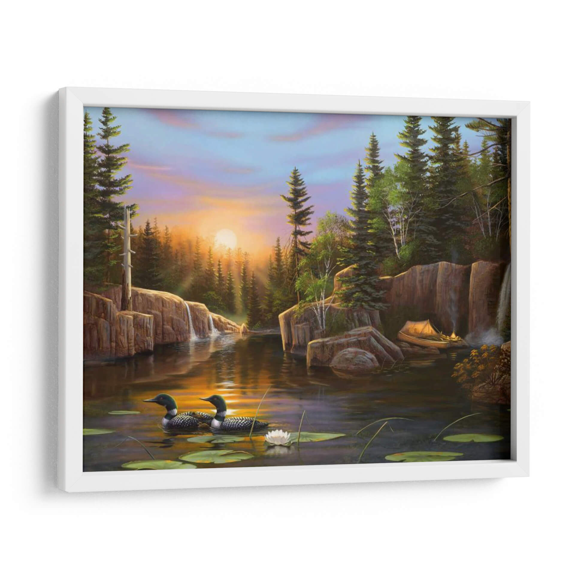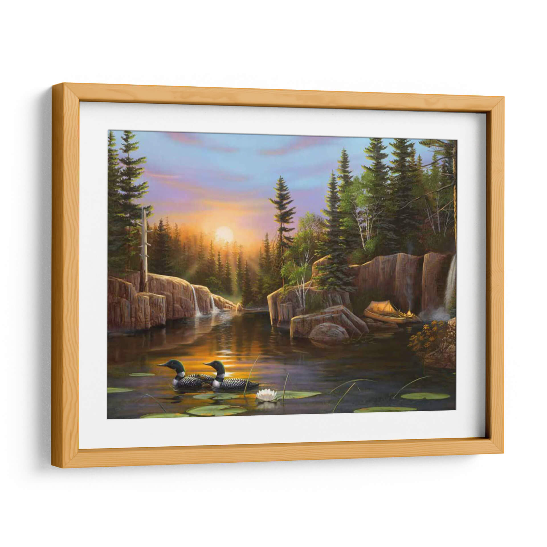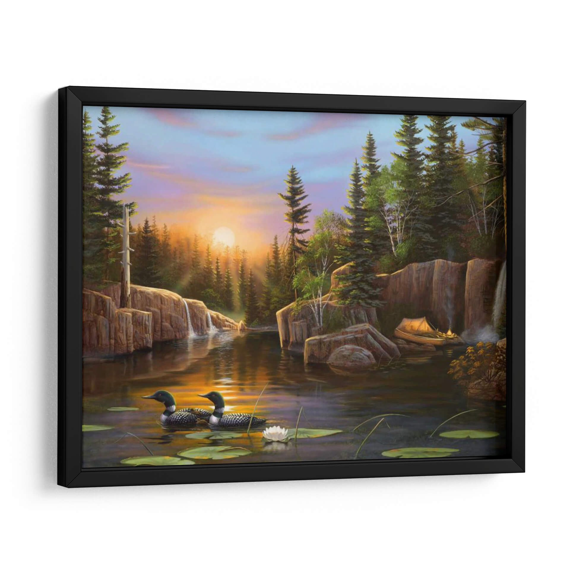 Sumérgete en la serenidad de la naturaleza con "Soledad De La Tarde", una obra de arte que captura la esencia de un atardecer idílico en un entorno natural. El cuadro decorativo presenta un paisaje sereno con un lago tranquilo reflejando los cálidos tonos anaranjados y púrpuras del cielo crepuscular. Dos patos sumergen sus cabezas en el agua, rodeados de lirios, mientras que cascadas suaves descienden por formaciones rocosas cubiertas de vegetación exuberante y árboles de pino imponentes. En la orilla, una tienda de campaña iluminada sugiere una aventura o un retiro pacífico, añadiendo un toque humano a la majestuosidad del entorno. Los colores vibrantes pero armoniosos y la composición detallada crean una atmósfera de paz y contemplación. Esta pieza es ideal para quienes buscan infundir calma y una conexión con la vida silvestre en sus hogares u oficinas, convirtiéndose en un punto focal que invita a la relajación y al disfrute de la belleza natural. Añade un toque de tranquilidad atemporal a tu espacio con este impresionante cuadro decorativo.