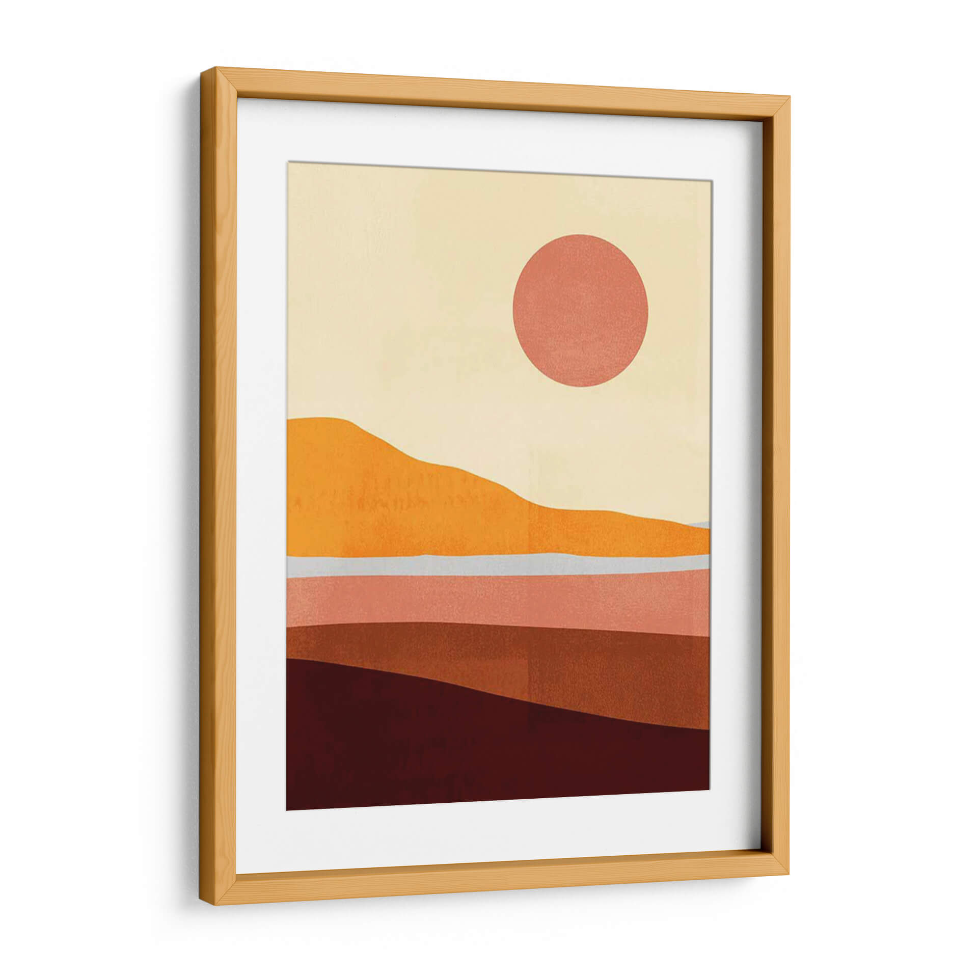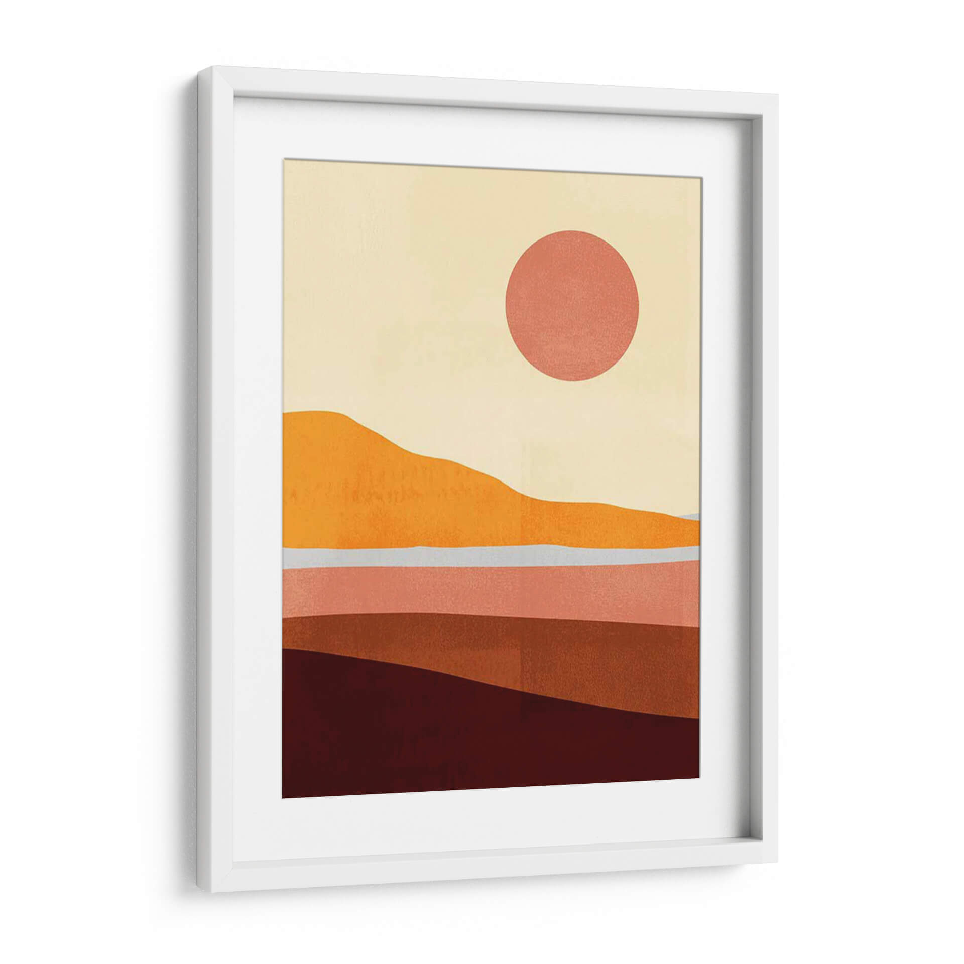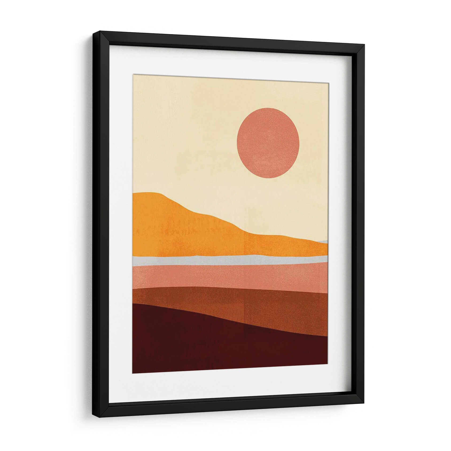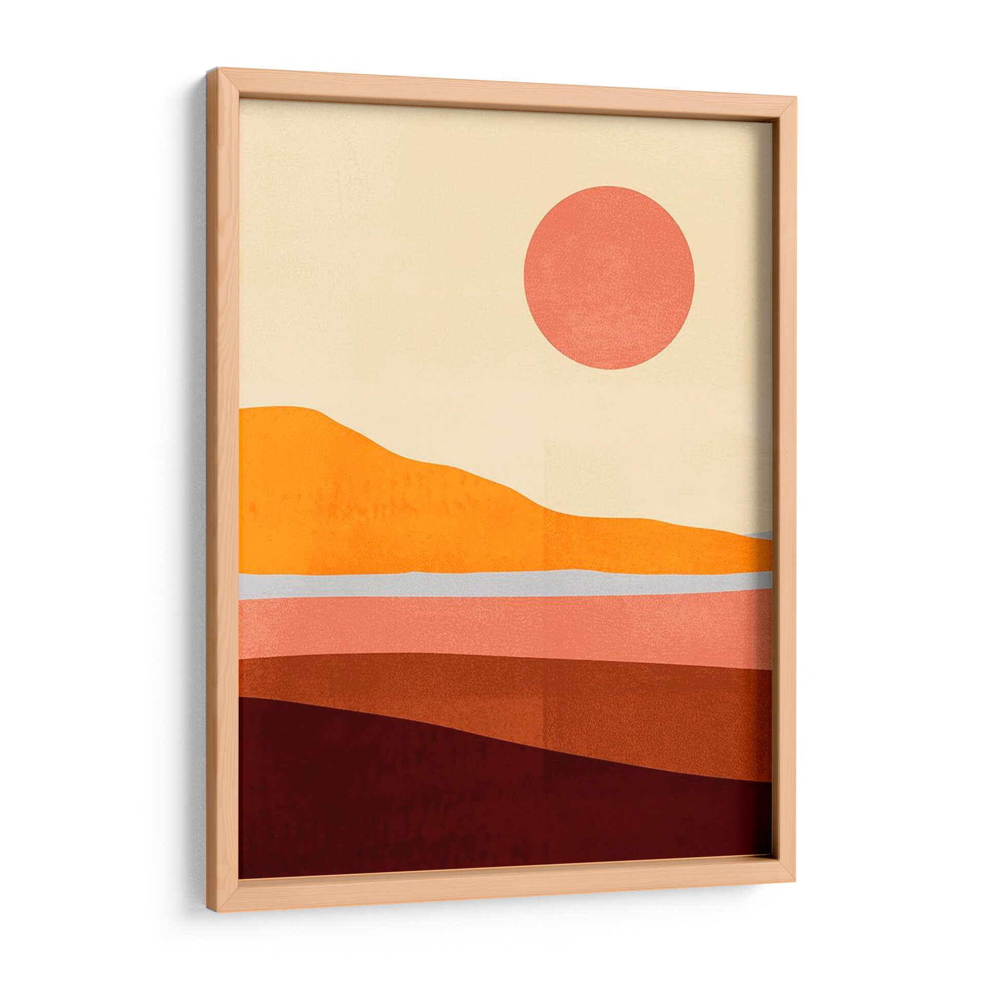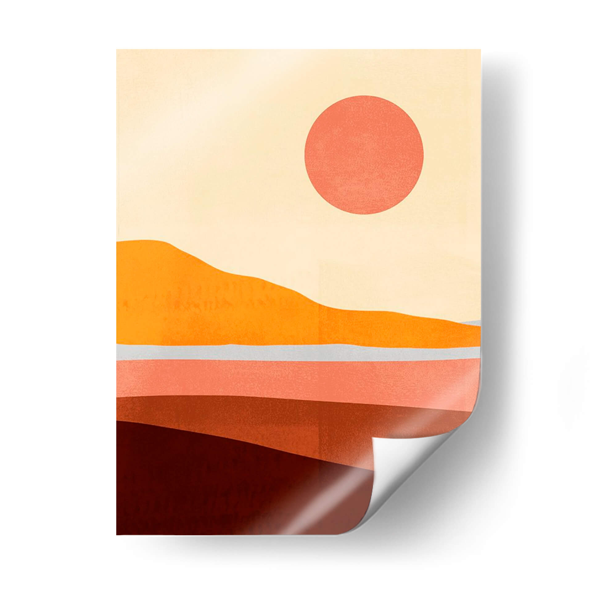 Sumérgete en la serenidad de "Sunseeker Paisaje I", una obra de arte contemporáneo de Victoria Borges que captura la esencia de un atardecer cálido y envolvente. Este cuadro decorativo presenta un paisaje minimalista y abstracto, compuesto por capas de suaves ondulaciones que evocan colinas y horizontes distantes. La paleta de colores, dominada por tonos tierra cálidos como naranjas intensos, rojizos profundos y rosas empolvados, se complementa con un cielo pálido y un sol circular de un vibrante coral. La composición estilizada y las formas orgánicas transmiten una sensación de calma y contemplación, ideal para quienes buscan añadir un toque de calidez y sofisticación a su hogar u oficina. "Sunseeker Paisaje I" es más que una simple pieza decorativa; es una invitación a la introspección y al disfrute de la belleza serena de la naturaleza, reinventada a través de una visión artística moderna. Perfecto para salones, dormitorios o espacios de trabajo que necesiten un punto focal tranquilo pero inspirador, este cuadro decorativo transformará cualquier ambiente en un refugio de paz y estilo.