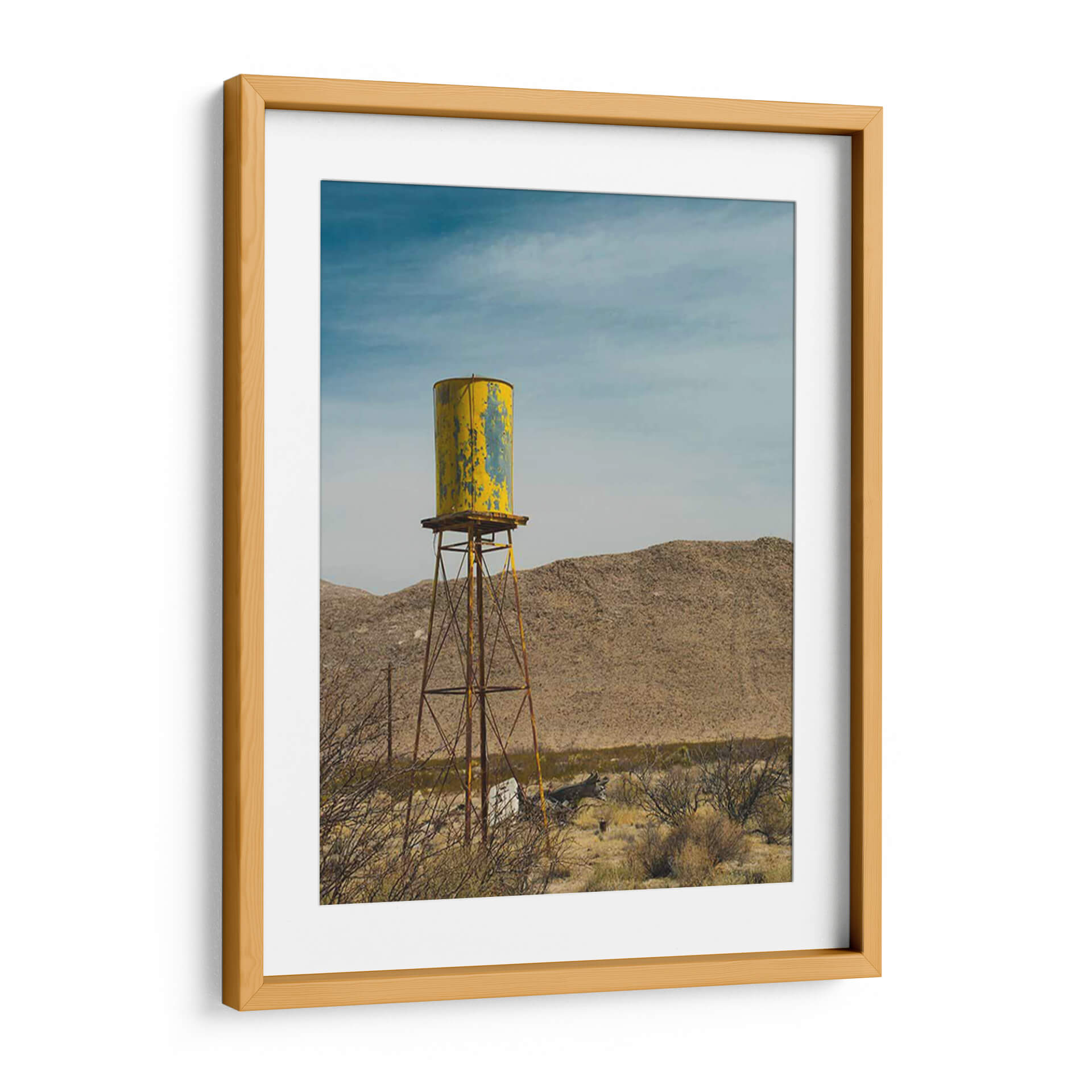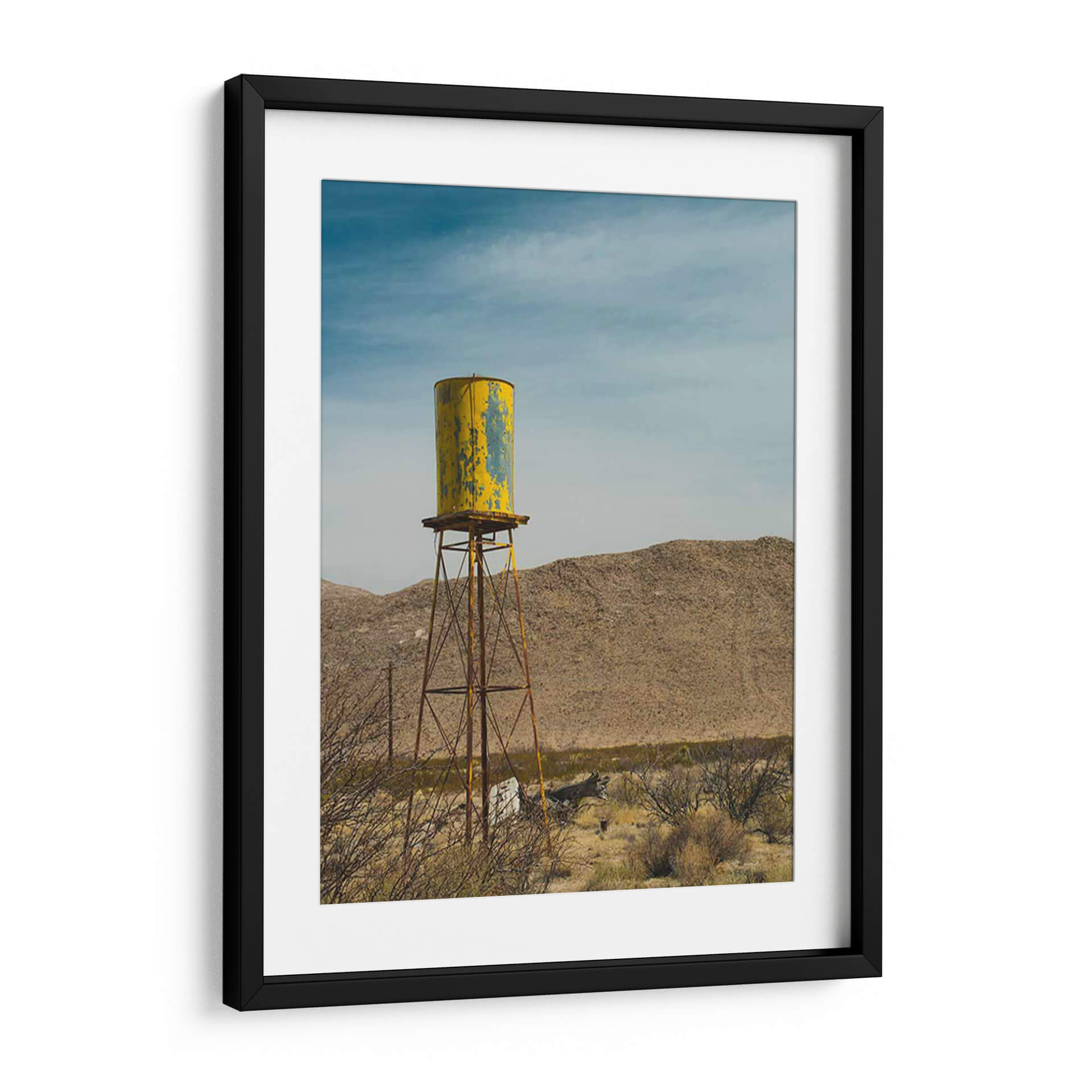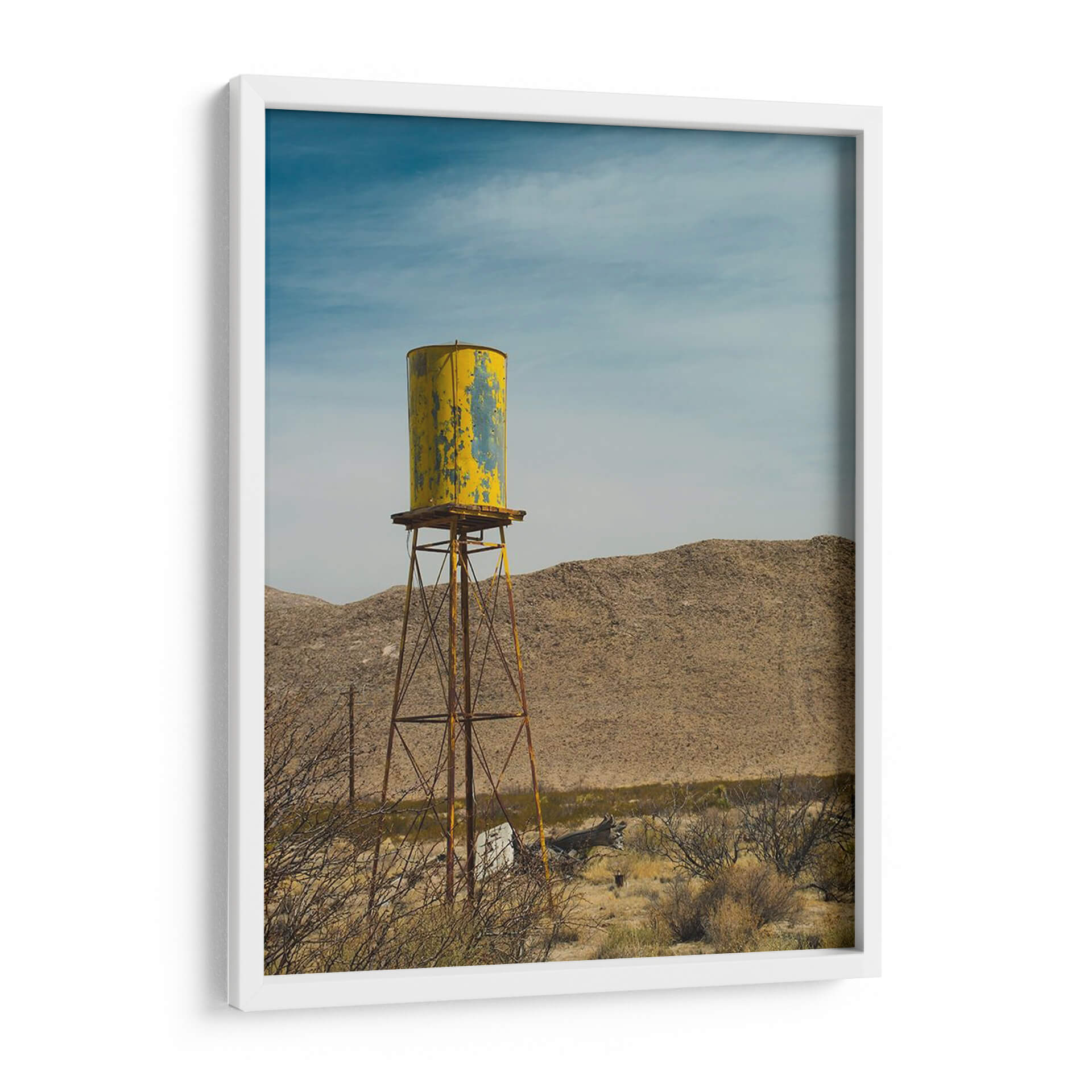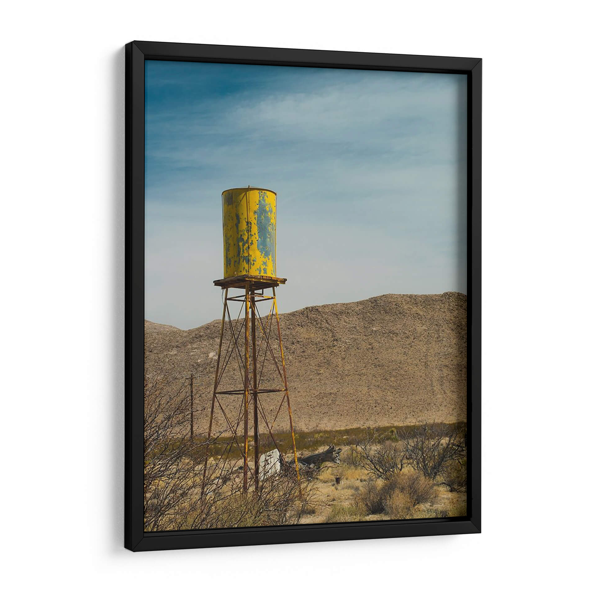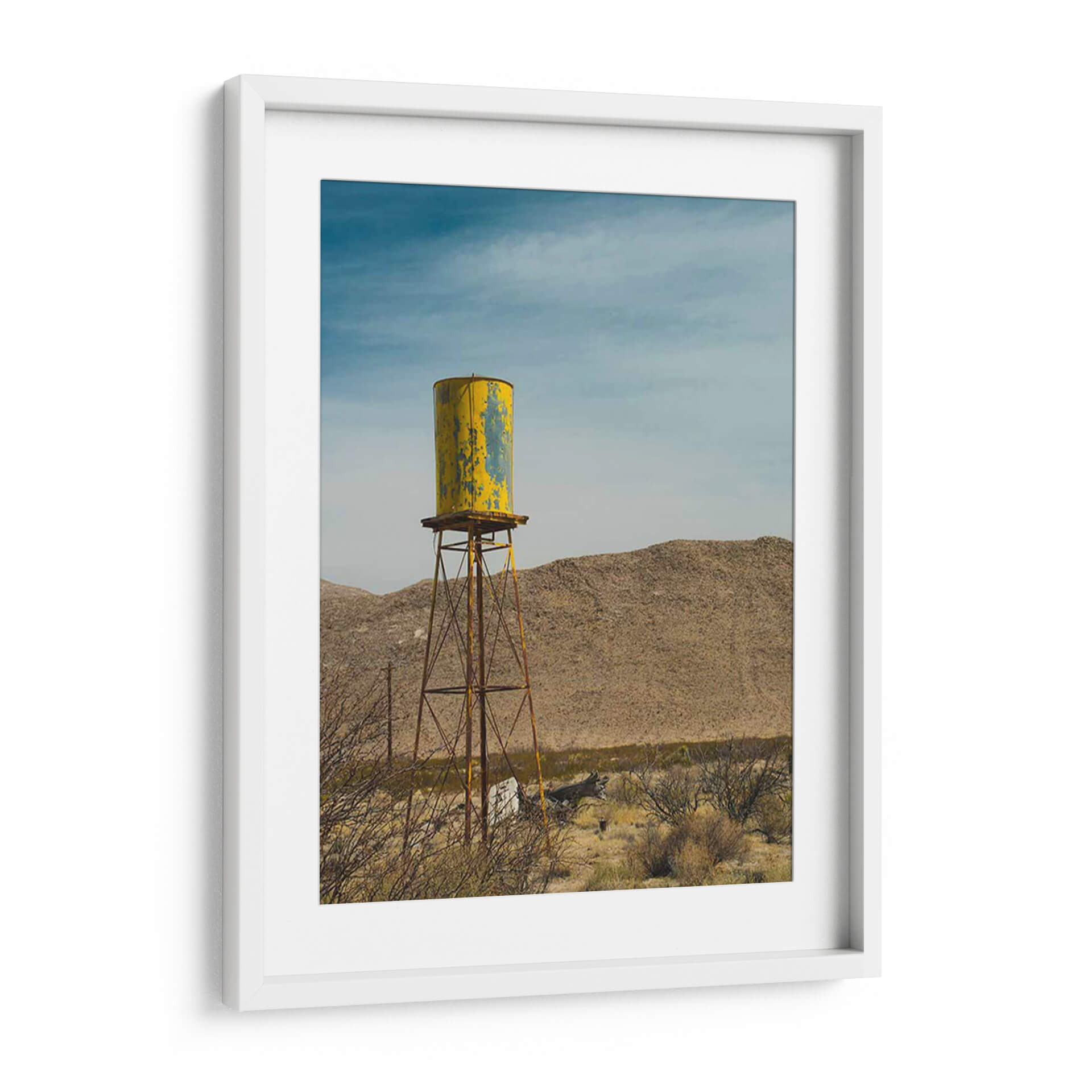 Sumérgete en la atmósfera desértica con "Torre De Agua Amarilla I", una obra de Sonja Quintero que captura la esencia de un paisaje árido con un toque nostálgico. Este cuadro decorativo presenta una icónica torre de agua, pintada en un vibrante amarillo con desgastes que cuentan historias de tiempo y resistencia, erigiéndose majestuosamente contra un cielo azul profundo y nublado. Las texturas del terreno desértico y la vegetación seca que rodea la estructura evocan una sensación de vastedad y soledad, pero también de una belleza cruda y perseverante. La paleta de colores, dominada por tonos tierra, amarillos intensos y azules celestes, crea un contraste visual cautivador que aporta carácter y profundidad a cualquier espacio. El estilo fotográfico y la composición centrada en la torre la convierten en una pieza ideal para salones modernos, oficinas con un toque industrial o estudios que buscan inspiración en la naturaleza y la arquitectura funcional. "Torre De Agua Amarilla I" no es solo una imagen, es una ventana a la resiliencia y la estética única de los paisajes olvidados, añadiendo un punto focal intrigante y lleno de personalidad a tu decoración.