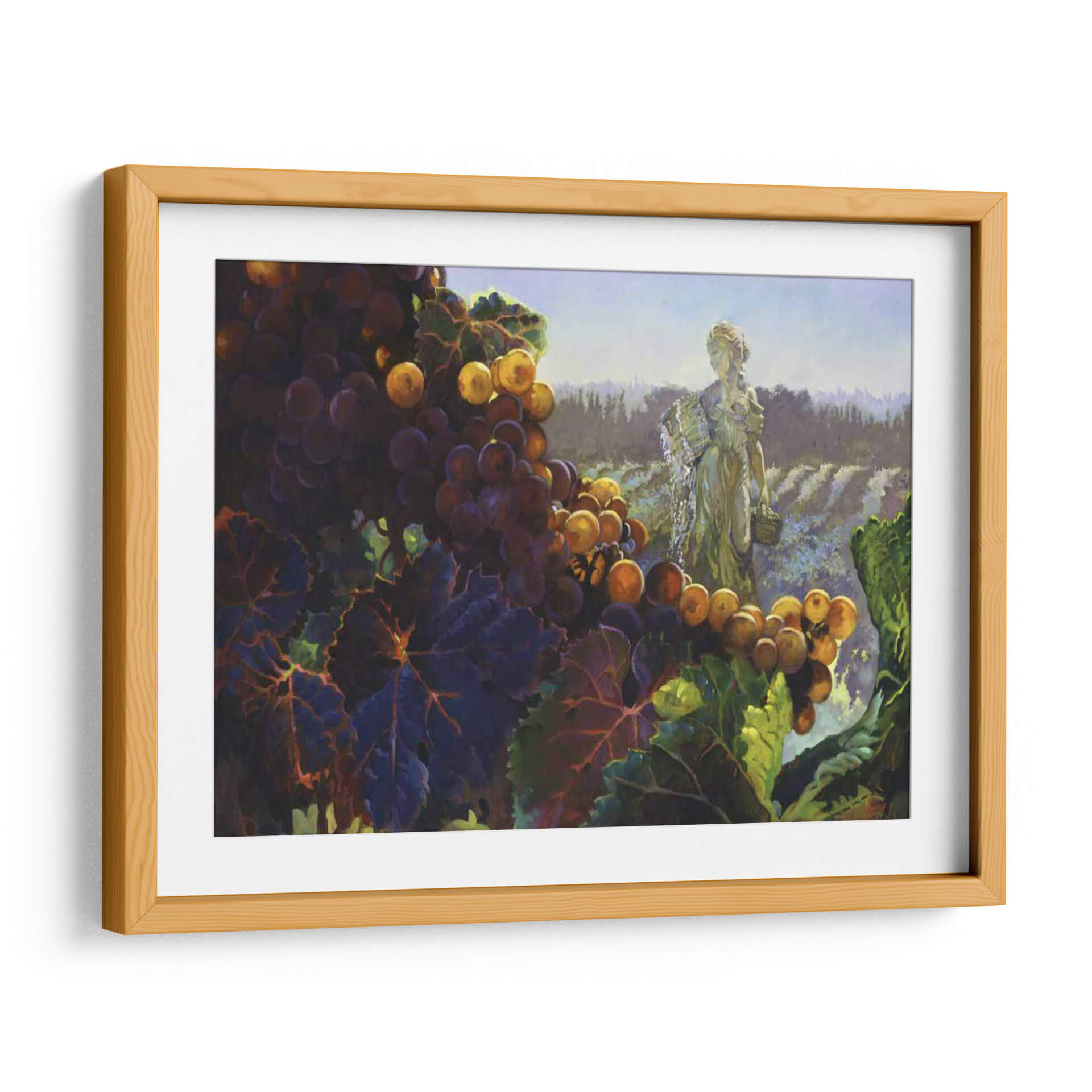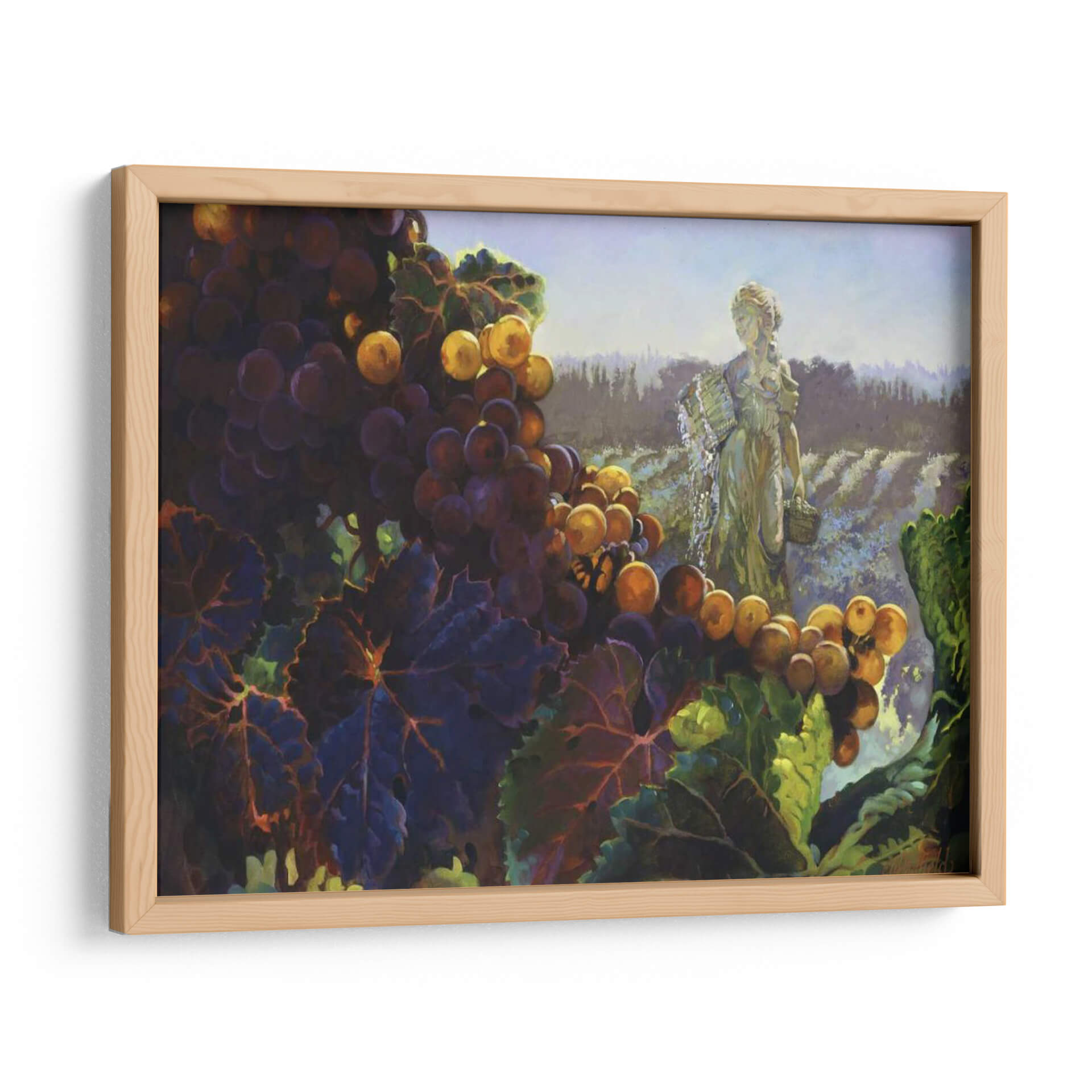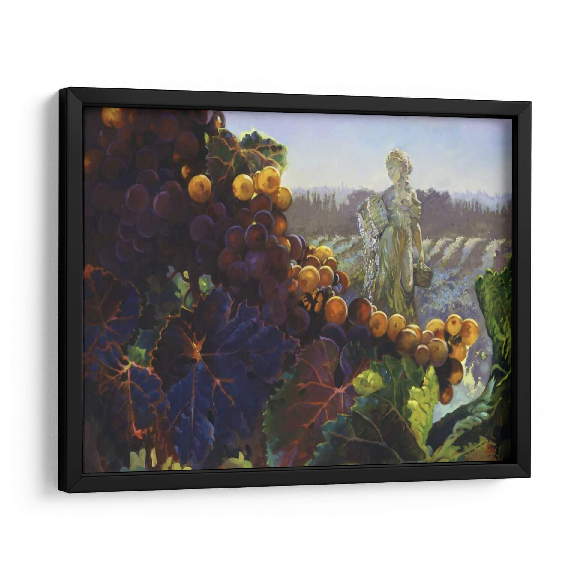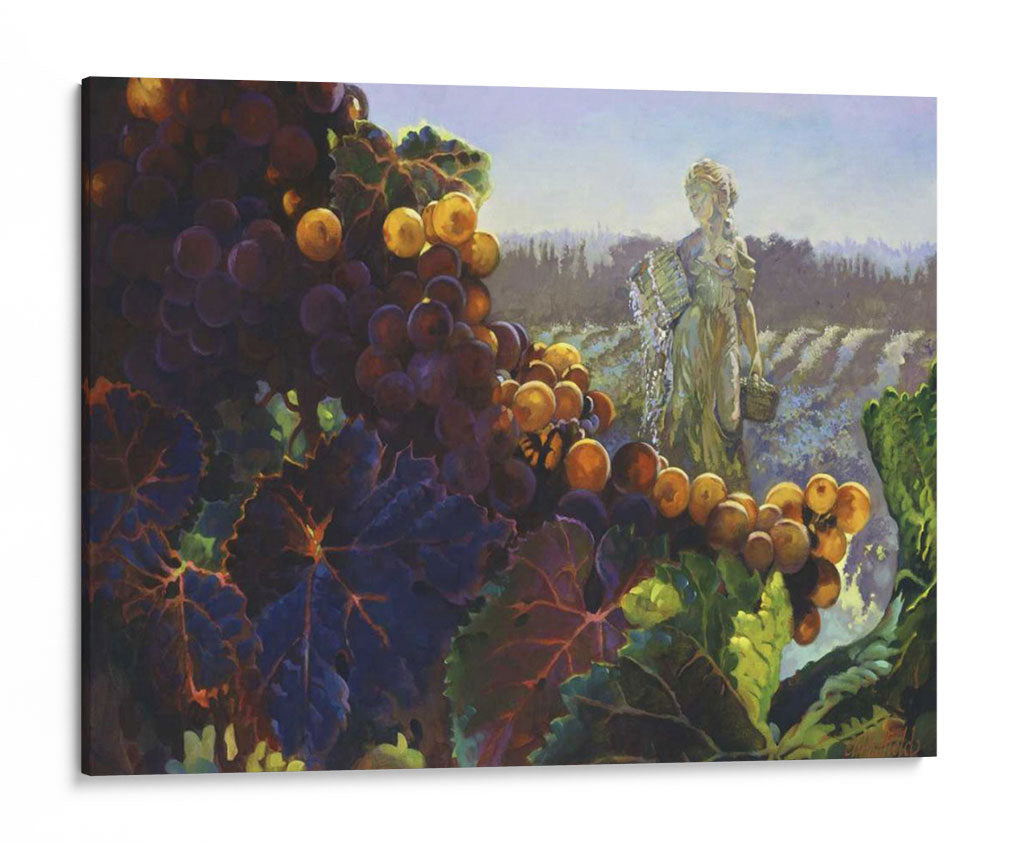 Sumérgete en la opulencia de la naturaleza con 'Toscana Bounty', una obra de arte que captura la esencia de una cosecha abundante y la serenidad de un paisaje vinícola. El cuadro presenta un primer plano detallado de racimos de uvas moradas y doradas, sus pieles brillando bajo una luz cálida que resalta su dulzura. Las hojas verdes y moradas de la vid añaden profundidad y textura, creando un contraste vibrante con el fondo etéreo. Al fondo, una figura femenina clásica, evocando a una diosa de la cosecha o una vendimiadora, se alza con gracia en medio de hileras de viñedos que se extienden hasta el horizonte. La paleta de colores, dominada por tonos tierra, púrpuras intensos y toques de dorado y verde, transmite una sensación de riqueza, tradición y conexión con la tierra. Esta pieza es ideal para añadir un toque de elegancia rústica y calidez a comedores, cocinas o cualquier espacio que se beneficie de una atmósfera acogedora y sofisticada. El estilo pictórico, con pinceladas expresivas, da vida a la escena, invitando al espectador a saborear la abundancia y la belleza de la vida.