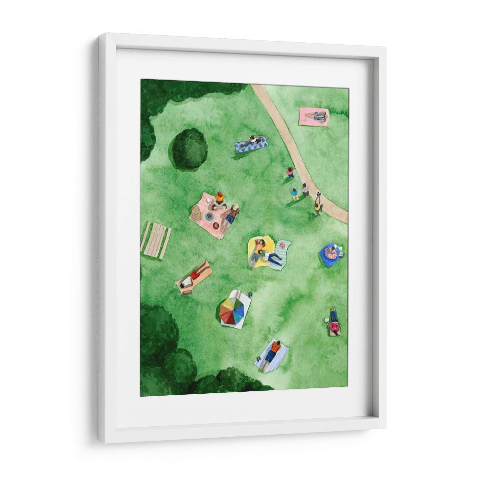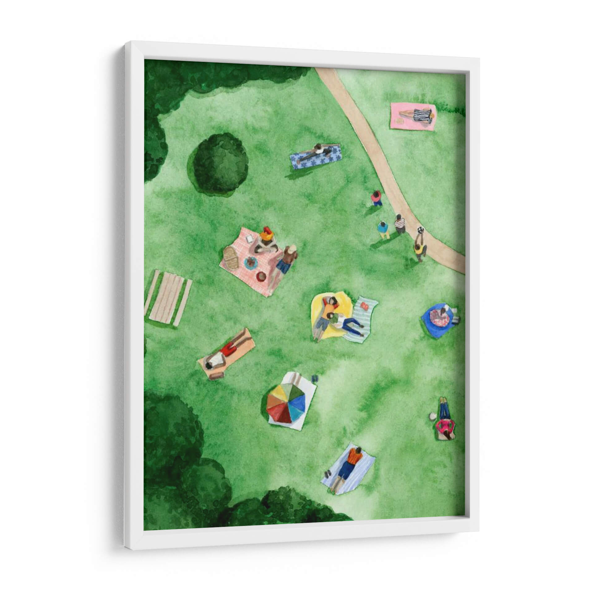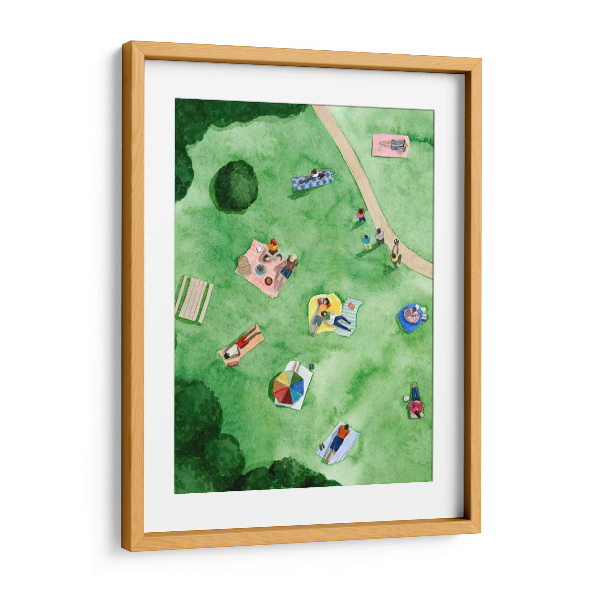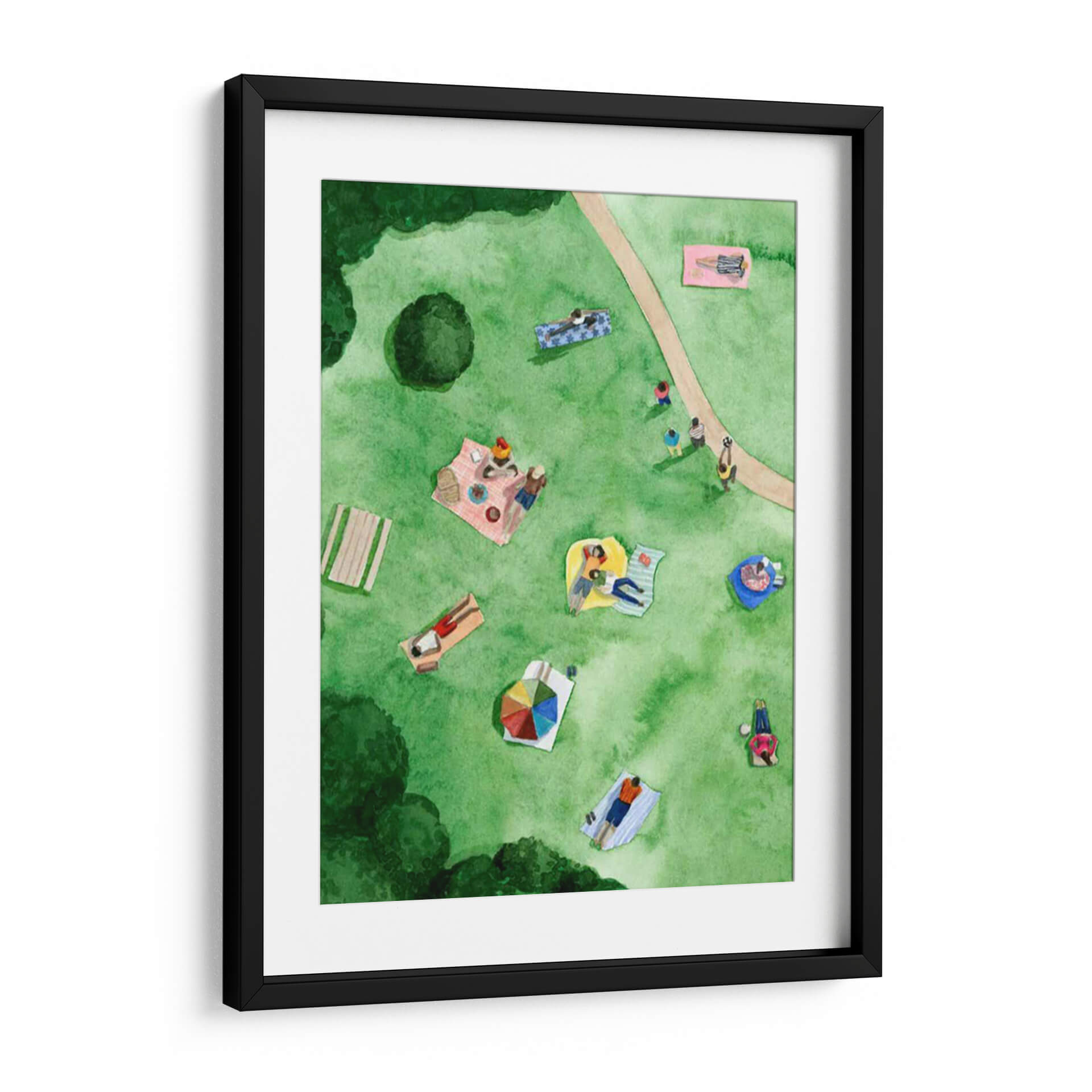 Captura la esencia de un día soleado y relajado en la naturaleza con "Un Día En El Parque I", una obra de arte evocadora de Grace Popp. Esta pieza te transporta a un prado verde vibrante, salpicado de figuras humanas disfrutando de picnics y momentos de ocio bajo un cielo radiante. La paleta de colores, dominada por intensos verdes y toques cálidos de naranjas, amarillos y azules, crea una atmósfera de tranquilidad y alegría despreocupada. El estilo, que recuerda a una acuarela fresca y fluida, con trazos sueltos pero definidos, aporta una sensación de espontaneidad y ligereza. La composición, vista desde una perspectiva aérea, permite apreciar la distribución armónica de las personas y los elementos, invitando al espectador a sumergirse en la escena. "Un Día En El Parque I" es ideal para añadir un toque de serenidad y vida a tu hogar u oficina, siendo un recordatorio visual de los placeres simples. Este cuadro decorativo contemporáneo es perfecto para salas de estar, dormitorios o cualquier espacio que necesite un respiro de color y calma.