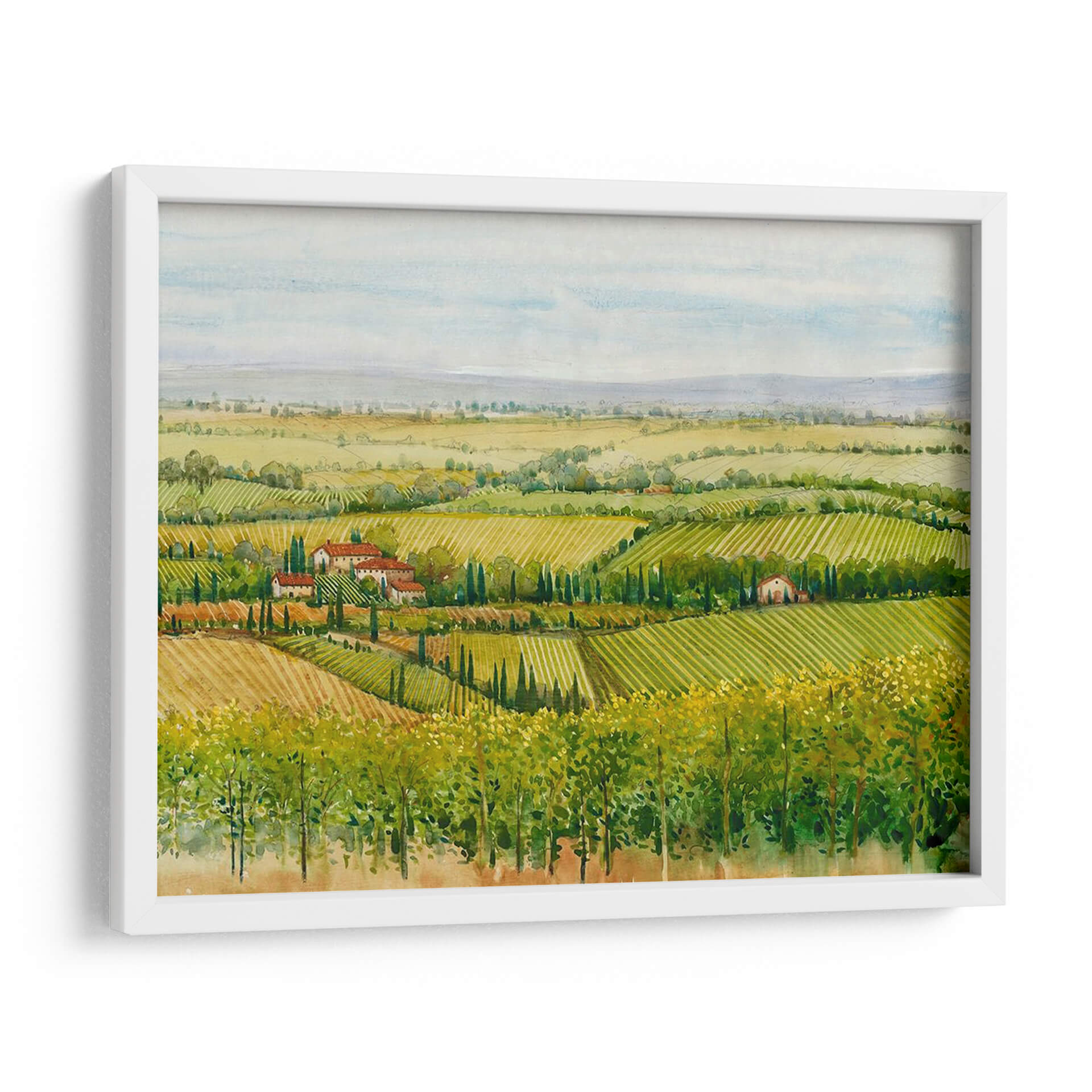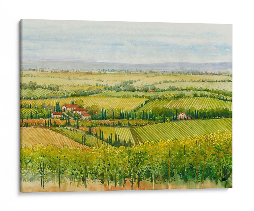 Sumérgete en la serenidad y el encanto de la campiña italiana con "Viaje De Vino Vista I", una obra de arte que captura la esencia de un viñedo en plena producción. Los campos verdes y dorados se extienden hasta el horizonte, salpicados por hileras de cipreses y casas de campo de tejas rojas, evocando una atmósfera de paz y tradición. La paleta de colores, dominada por verdes vibrantes, ocres cálidos y un cielo azul pálido, crea una sensación de profundidad y tranquilidad, perfecta para transformar cualquier espacio en un refugio de calma. El estilo pictórico, que recuerda a las acuarelas clásicas, otorga a la escena una suavidad y un romanticismo inconfundibles. Este cuadro decorativo es ideal para salones, comedores o estudios que buscan un toque de sofisticación rústica y una conexión con la naturaleza y la buena vida. Imagina disfrutar de una copa de vino mientras contemplas esta vista idílica en tu propio hogar, una invitación constante a la relajación y al disfrute de los placeres sencillos. Es la pieza perfecta para quienes aman los paisajes bucólicos y desean infundir sus paredes con la calidez y la belleza atemporal de la Toscana.