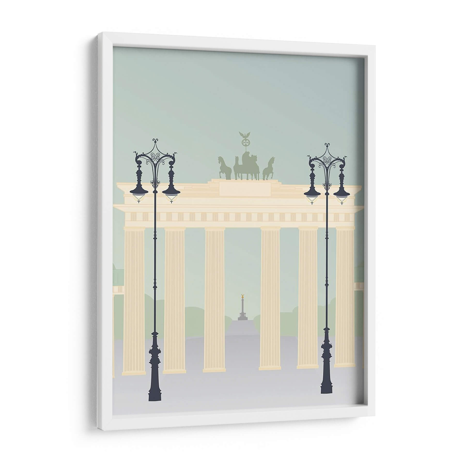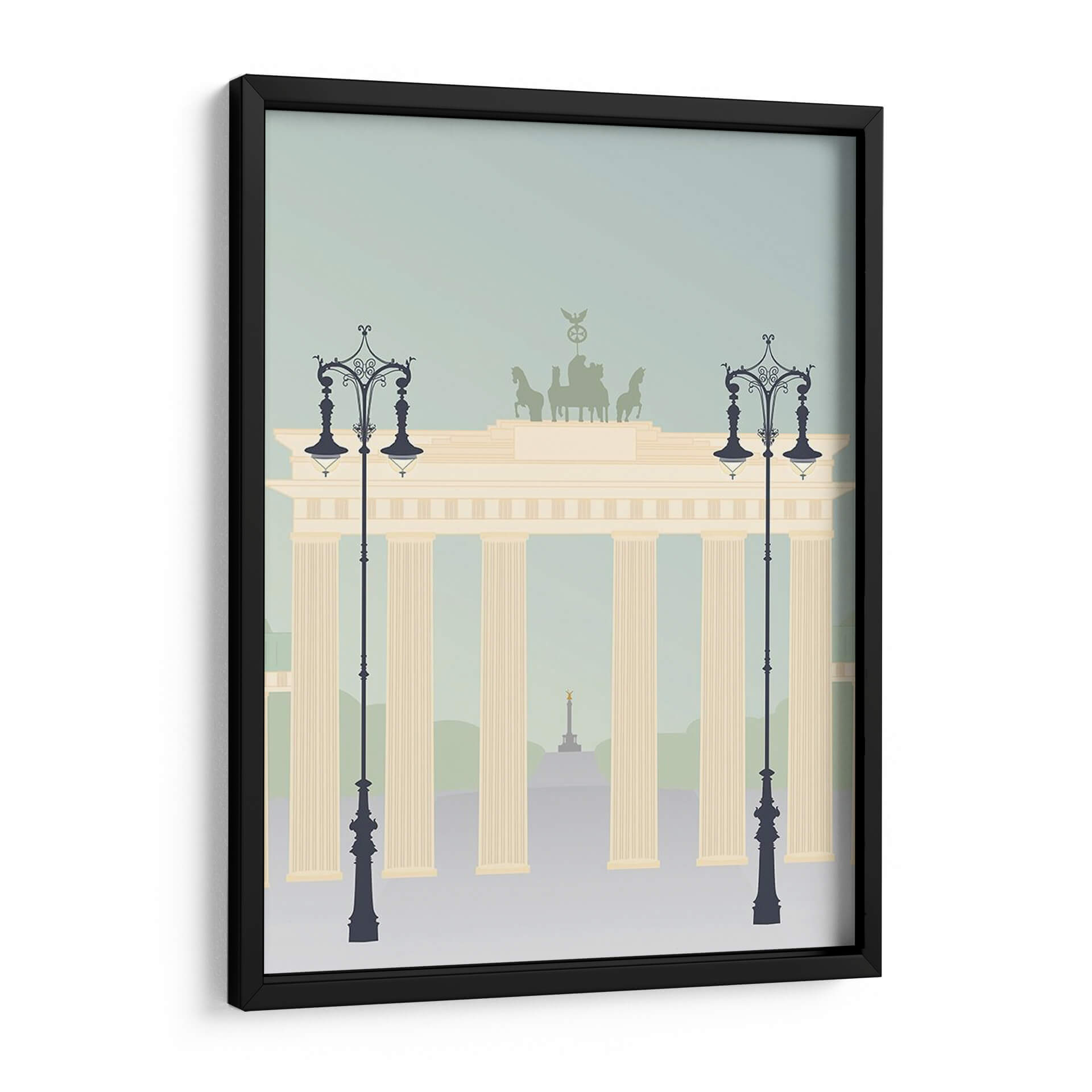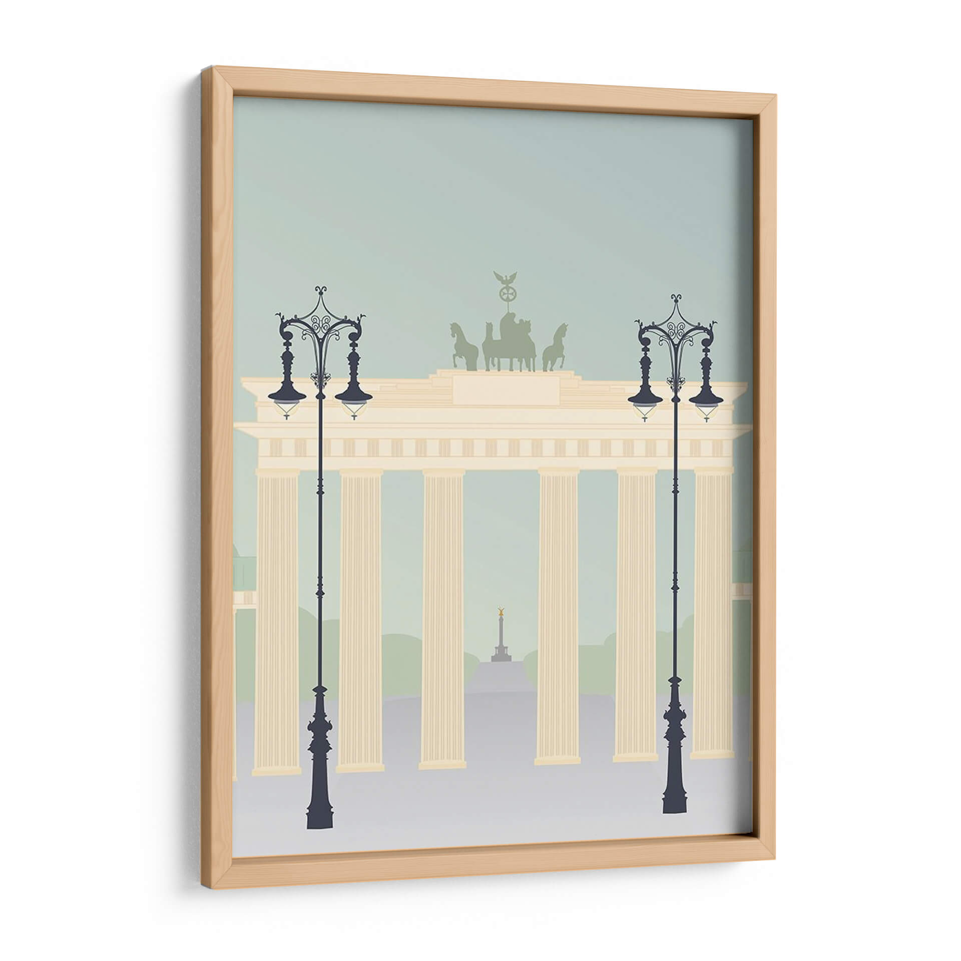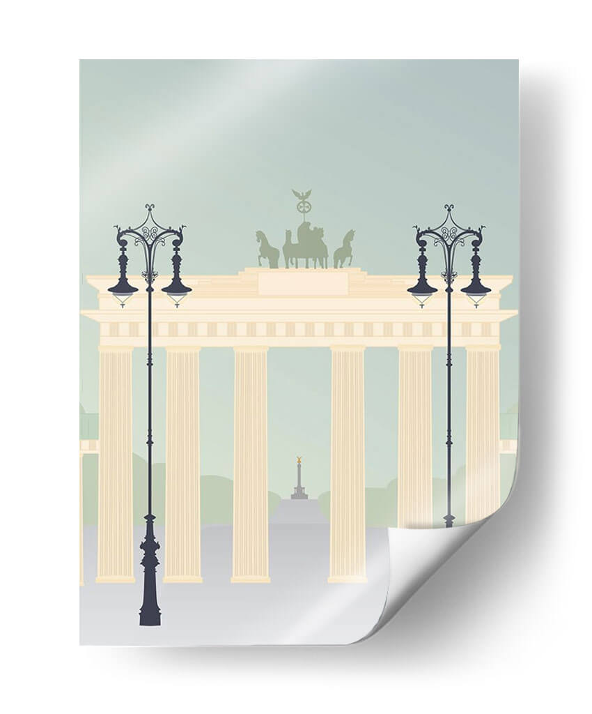 Evoca la majestuosidad arquitectónica y el espíritu viajero con "Viajes Europa - Brandenburger", una obra de arte digital que captura la icónica Puerta de Brandeburgo en un estilo gráfico moderno y estilizado. Los suaves tonos pastel, que van desde un azul cielo tenue hasta el cálido beige de la estructura principal y los acentos verdes tenues del fondo, crean una atmósfera serena y contemplativa. Las siluetas de farolas ornamentadas flanquean la imponente puerta, añadiendo un toque de elegancia clásica a la composición. En la distancia, se vislumbra un obelisco dorado, sugiriendo un paisaje urbano lleno de historia y monumentos. Este cuadro decorativo es ideal para aquellos que desean infundir en sus hogares u oficinas una sensación de sofisticación europea y recuerdos de viajes. Su diseño limpio y la paleta de colores armoniosa lo convierten en una pieza versátil, perfecta para salones modernos, estudios o recibidores, aportando un toque de distinción sin abrumar el espacio. "Viajes Europa - Brandenburger" no es solo una representación, es una invitación a la exploración y la apreciación de la belleza arquitectónica.