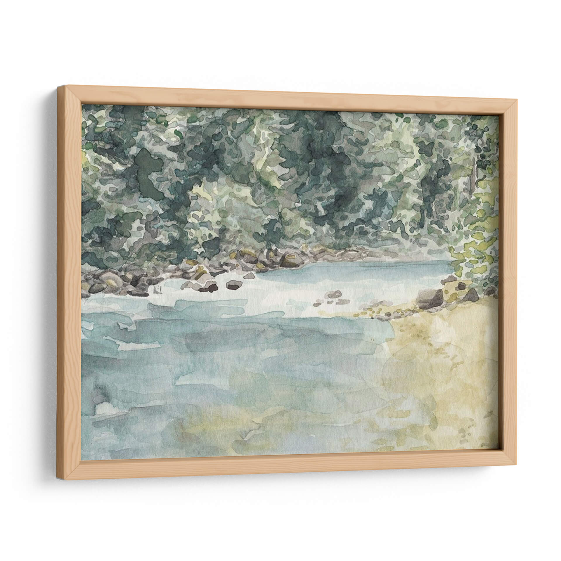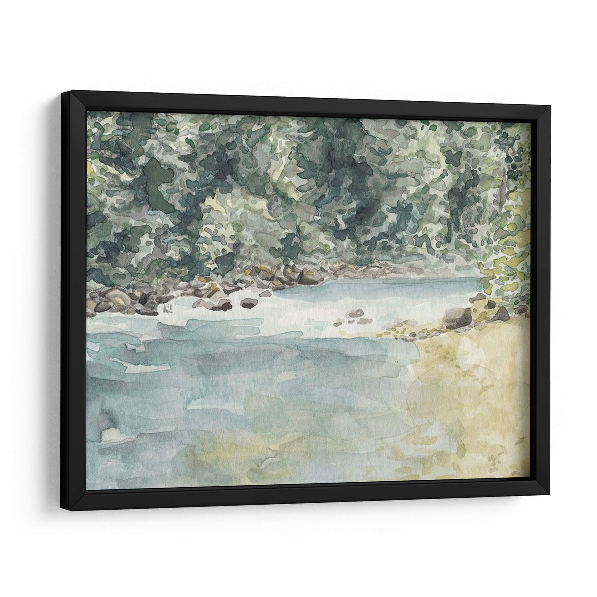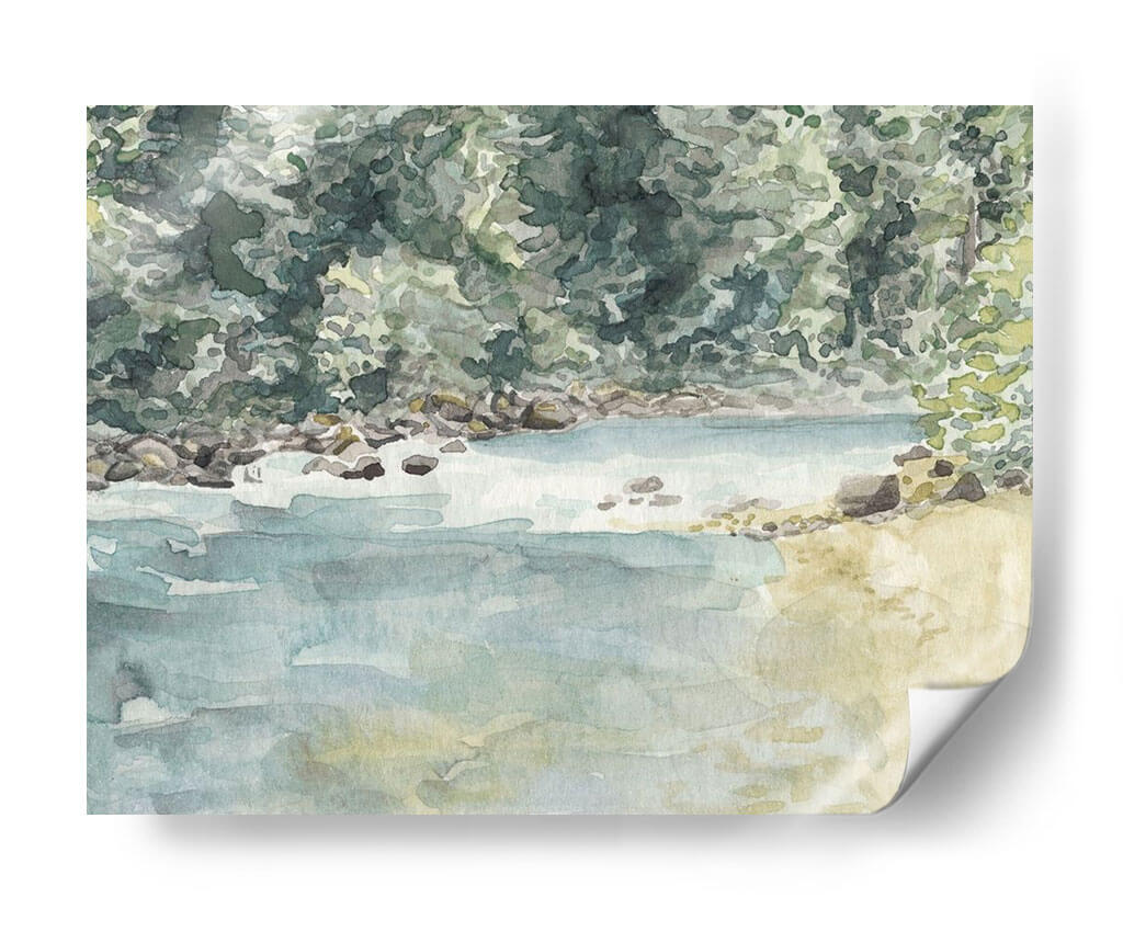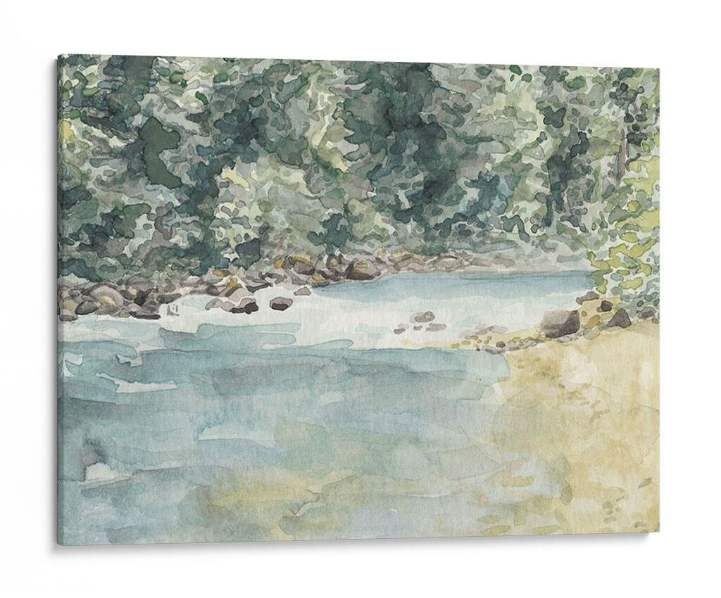 Sumérgete en la serenidad de la naturaleza con "Virginia Woods II", una obra de arte de Natasha Chabot que captura la esencia de un paisaje acuático idílico. Esta pieza evoca la tranquilidad de un día junto al agua, con una paleta de colores suaves y acuosos que transportan al espectador a un lugar de paz y contemplación. Los tonos verdes profundos y musgosos del follaje contrastan maravillosamente con los azules serenos del agua y los ocres terrosos de la orilla rocosa, creando una atmósfera de calma y armonía natural. La técnica de acuarela, con sus pinceladas fluidas y su transparencia, aporta una ligereza etérea a la escena, invitando a la reflexión y al descanso visual. "Virginia Woods II" es ideal para espacios que buscan un toque de naturaleza y serenidad, como un dormitorio, un estudio o una sala de estar donde se desee fomentar un ambiente de relajación. Este cuadro decorativo es perfecto para quienes aprecian el arte impresionista y los temas inspirados en la naturaleza, aportando una conexión tangible con el exterior al interior del hogar u oficina. Añade una dosis de frescura y calma a tu decoración con esta hermosa representación de un momento tranquilo en el bosque.