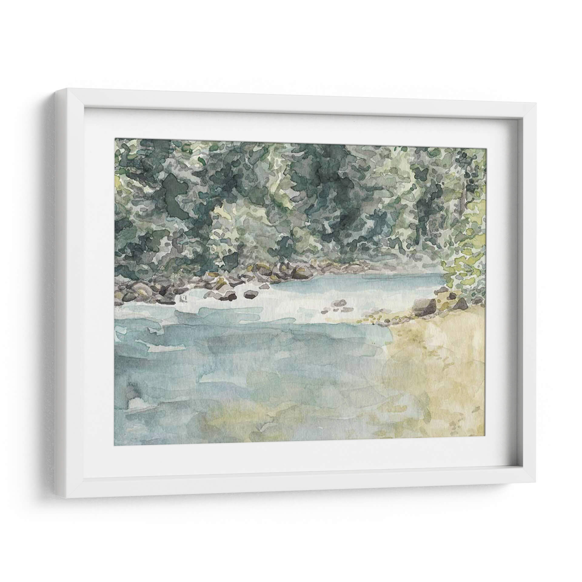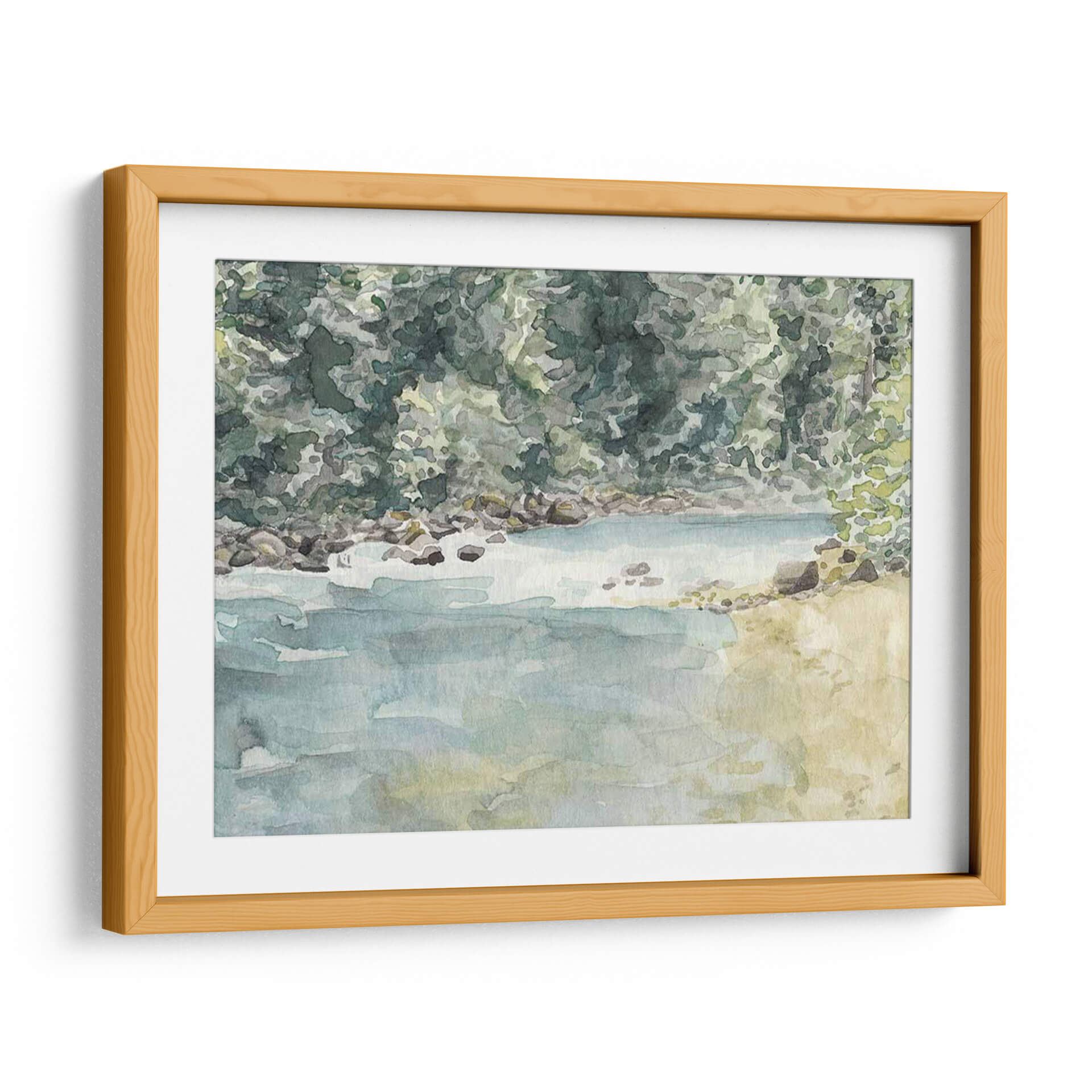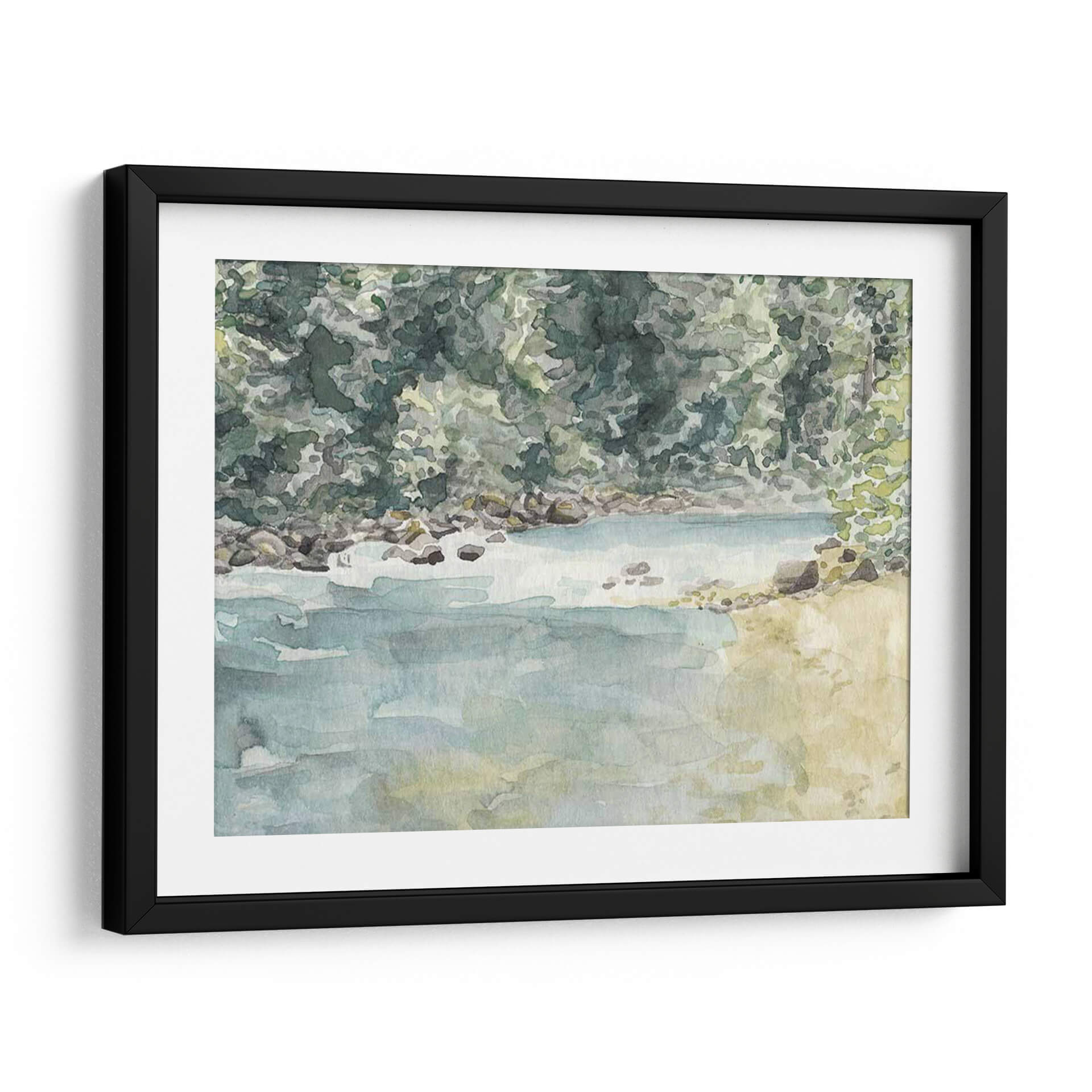 Sumérgete en la serenidad de la naturaleza con "Virginia Woods II", una obra de arte de Natasha Chabot que captura la esencia de un paisaje acuático idílico. Esta pieza evoca la tranquilidad de un día junto al agua, con una paleta de colores suaves y acuosos que transportan al espectador a un lugar de paz y contemplación. Los tonos verdes profundos y musgosos del follaje contrastan maravillosamente con los azules serenos del agua y los ocres terrosos de la orilla rocosa, creando una atmósfera de calma y armonía natural. La técnica de acuarela, con sus pinceladas fluidas y su transparencia, aporta una ligereza etérea a la escena, invitando a la reflexión y al descanso visual. "Virginia Woods II" es ideal para espacios que buscan un toque de naturaleza y serenidad, como un dormitorio, un estudio o una sala de estar donde se desee fomentar un ambiente de relajación. Este cuadro decorativo es perfecto para quienes aprecian el arte impresionista y los temas inspirados en la naturaleza, aportando una conexión tangible con el exterior al interior del hogar u oficina. Añade una dosis de frescura y calma a tu decoración con esta hermosa representación de un momento tranquilo en el bosque.