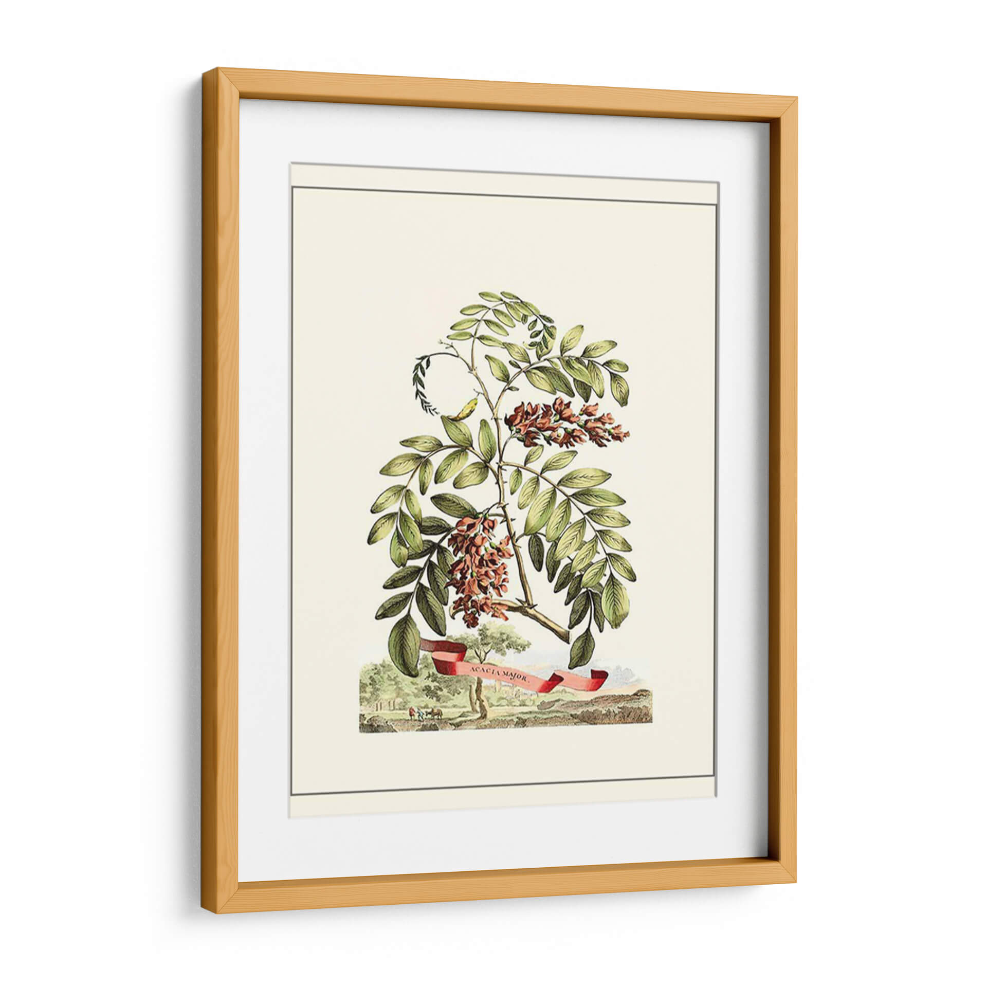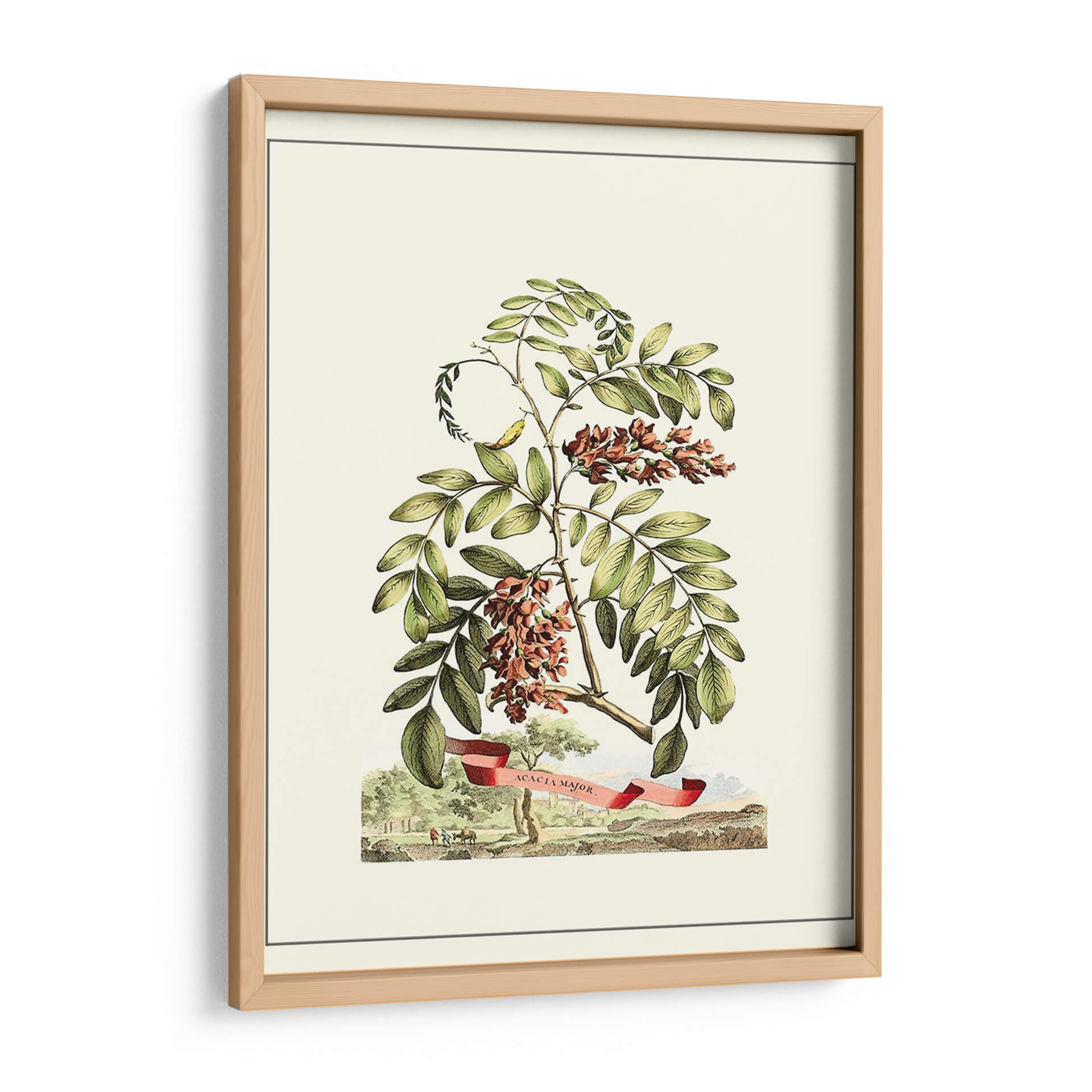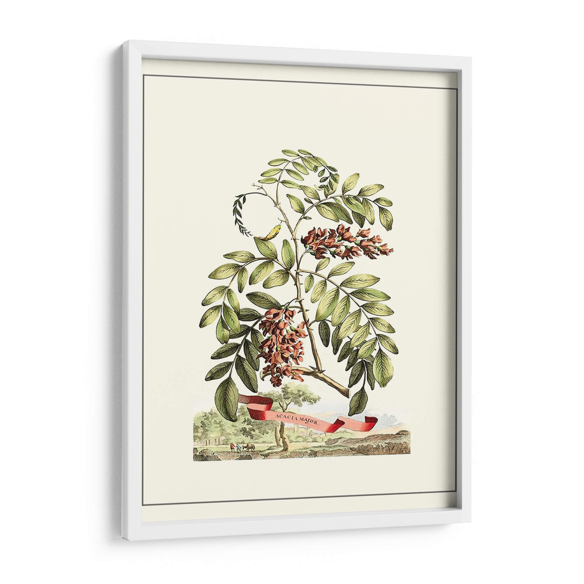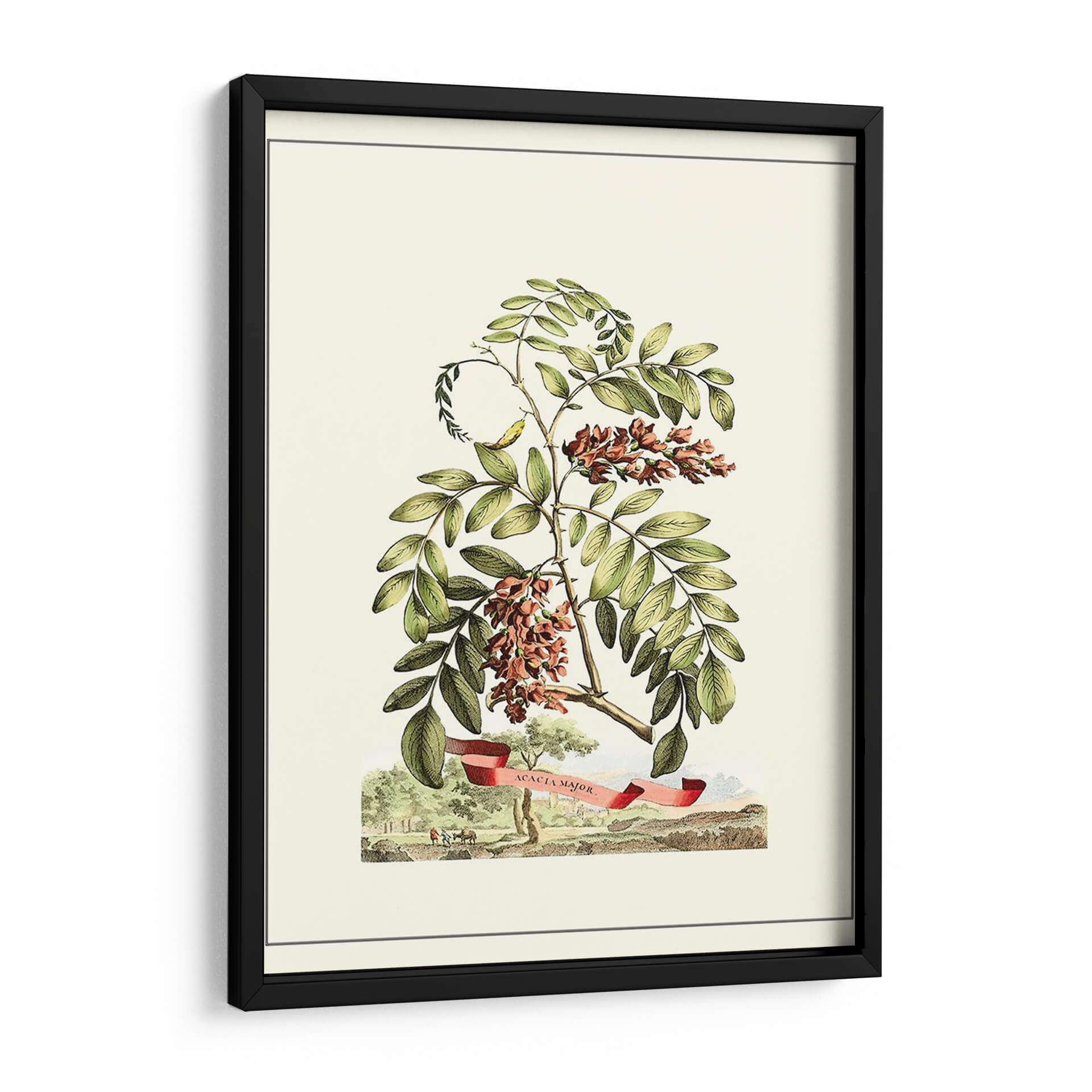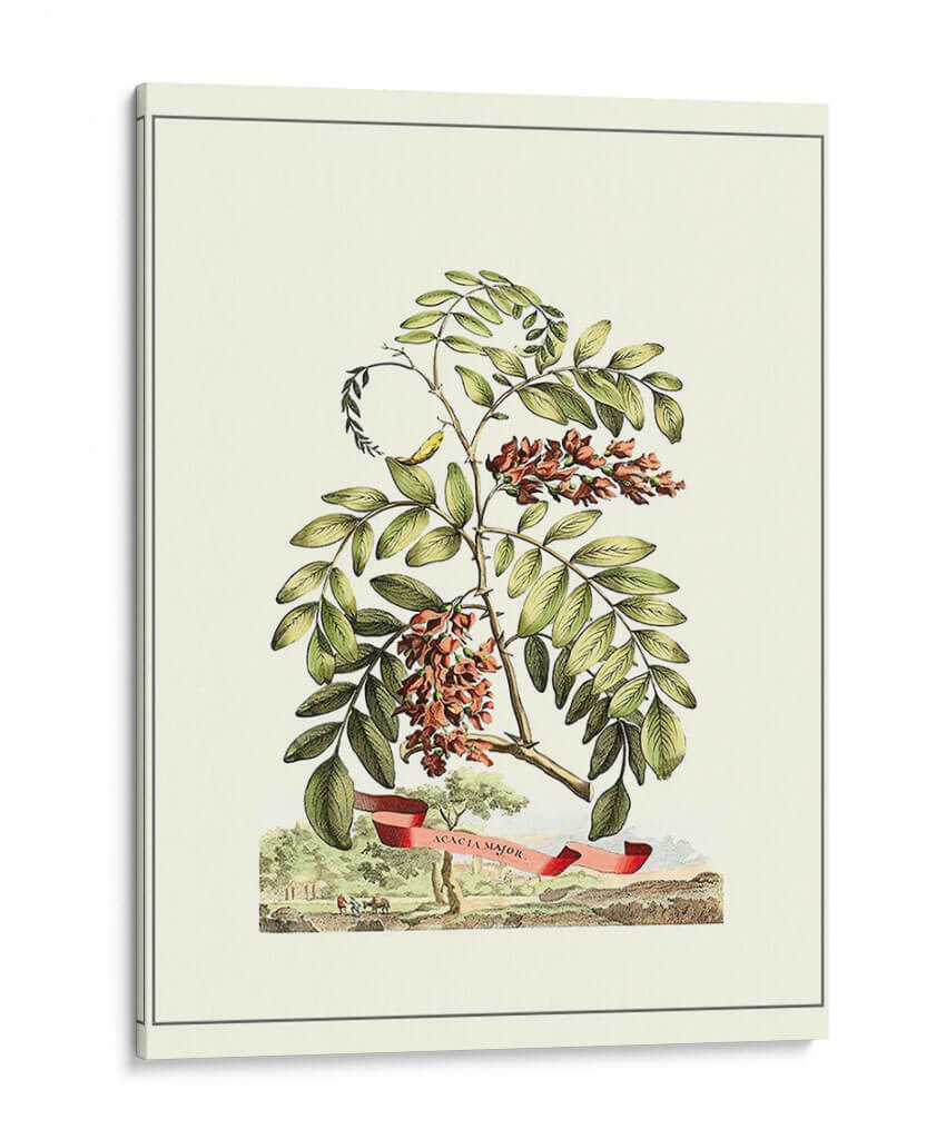Embellezca su espacio con el encanto atemporal de 'Vista Grandiosa I', una obra de arte botánica que captura la delicadeza de la naturaleza. Este cuadro decorativo presenta una detallada ilustración de ramas de acacia con sus racimos florales en tonos rojizos y marrones, rodeados de vibrantes hojas verdes. La composición se ve realzada por una cinta roja con la inscripción "Acacia Major", añadiendo un toque de elegancia y detalle histórico. En la base, una escena campestre con figuras y árboles completa la imagen, transportando la mirada a un paisaje sereno y detallado. La paleta de colores suaves, dominada por verdes, marrones y toques de rojo, crea una atmósfera de tranquilidad y sofisticación. Ideal para quienes buscan añadir un elemento natural y clásico a su decoración, este lienzo es perfecto para salas de estar, estudios o cualquier rincón que necesite un soplo de aire fresco y belleza botánica. Su estilo detallado y su temática evocan la precisión de las ilustraciones científicas antiguas, pero con la calidez suficiente para integrarse en hogares modernos.