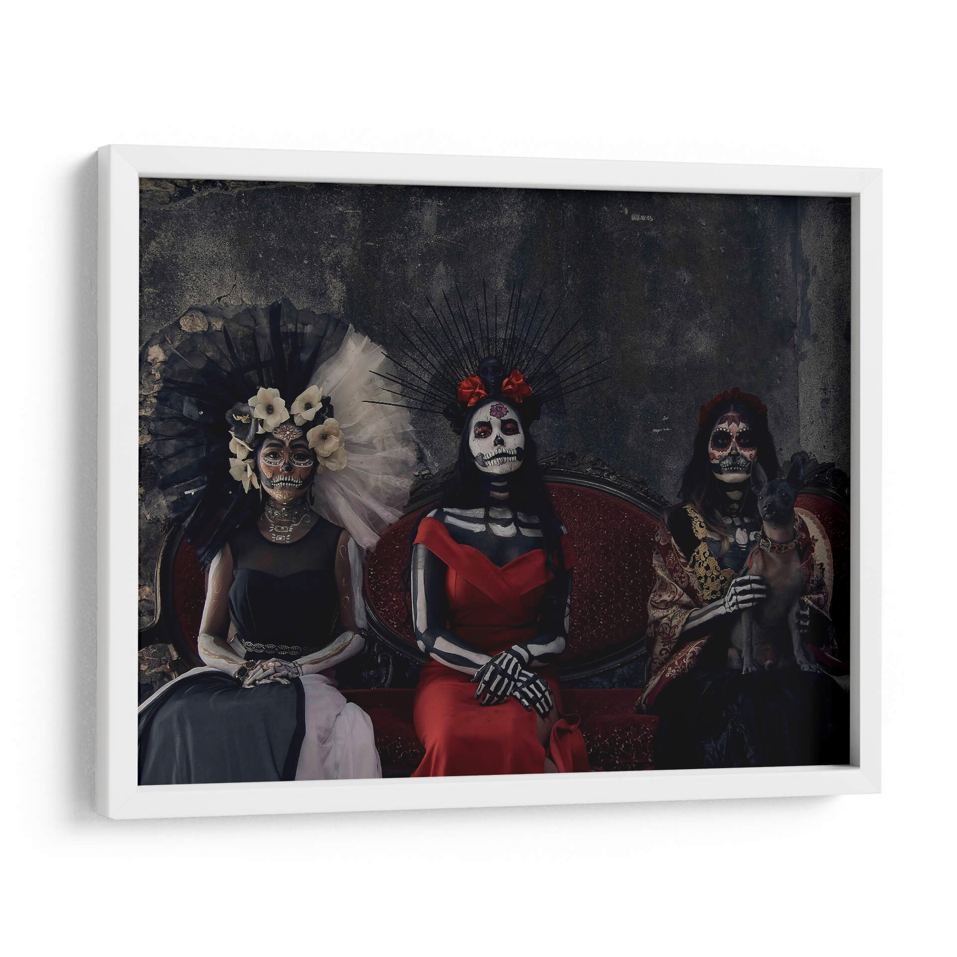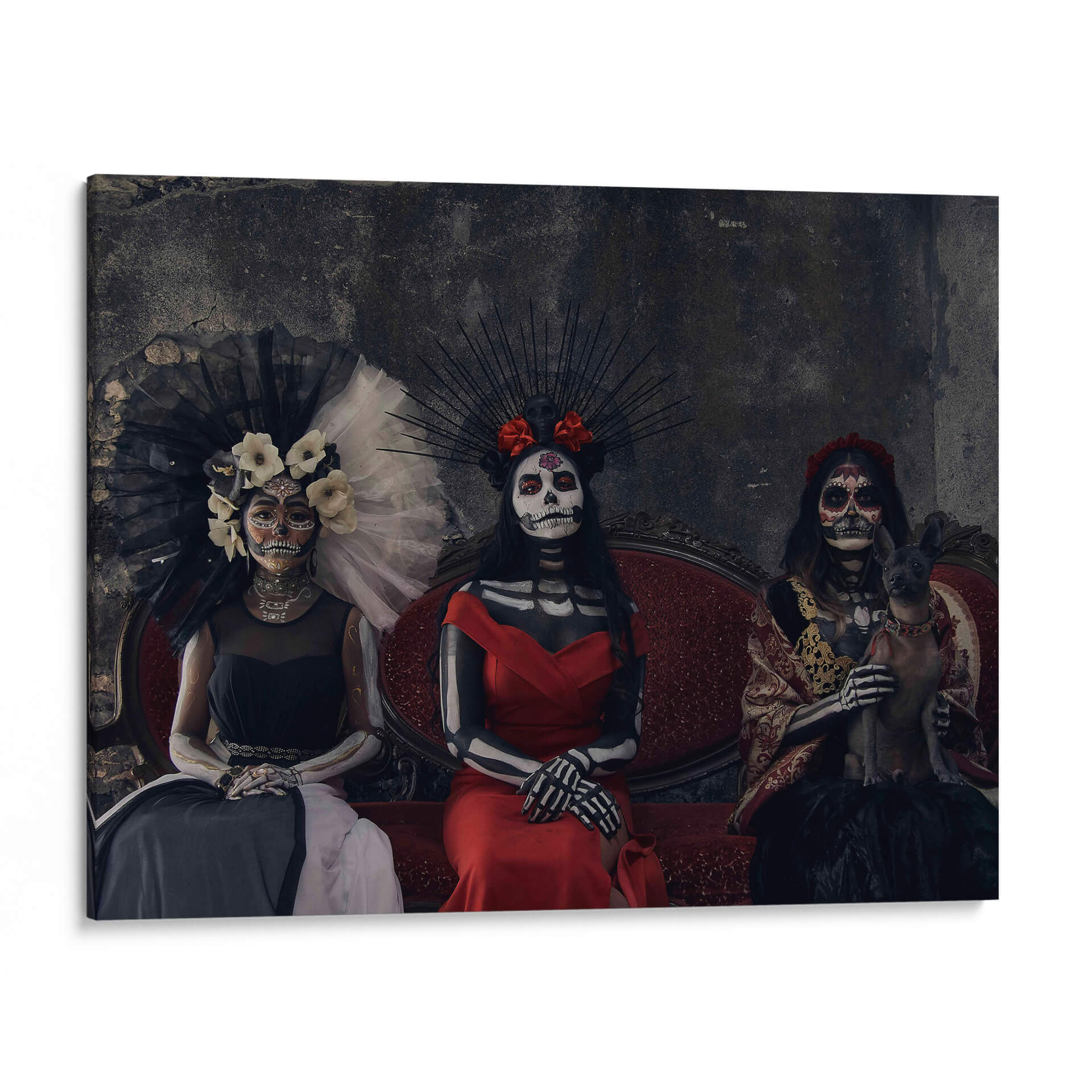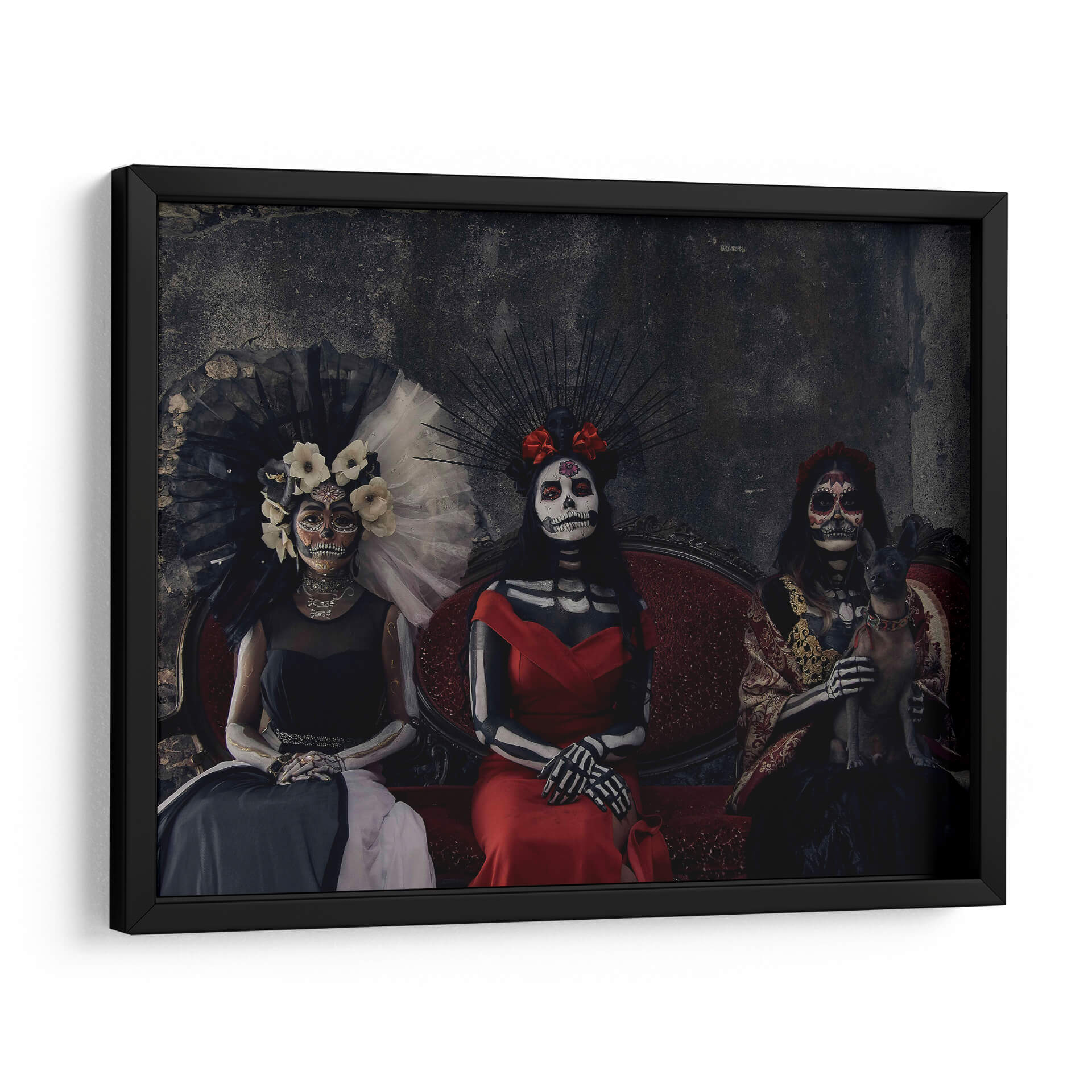 Sumérgete en la rica tradición mexicana con este cautivador cuadro decorativo "3 Catrinas y un perro sagrado" del artista Ignacio Arcas. La obra presenta tres figuras femeninas vestidas con atuendos elaborados y maquillaje de calavera, evocando la icónica tradición del Día de Muertos. Una de las figuras sostiene un pequeño perro sagrado, añadiendo un elemento inesperado y tierno a la composición. La paleta de colores se centra en tonos oscuros y ricos, con acentos vibrantes en los vestidos rojos y dorados, creando una atmósfera de misterio y solemnidad con un toque de elegancia. El fondo texturizado y oscuro realza la presencia de las Catrinas, invitando a la contemplación. Este cuadro decorativo es perfecto para añadir un toque de cultura, intriga y sofisticación a cualquier espacio, ya sea una sala de estar, un estudio o un comedor. Su estilo único y su profunda conexión con las tradiciones lo convierten en una pieza de conversación que seguramente impresionará a tus invitados y resonará con aquellos que aprecian el arte con alma y significado. Ideal para quienes buscan una decoración de pared que combine historia, arte y una estética impactante.