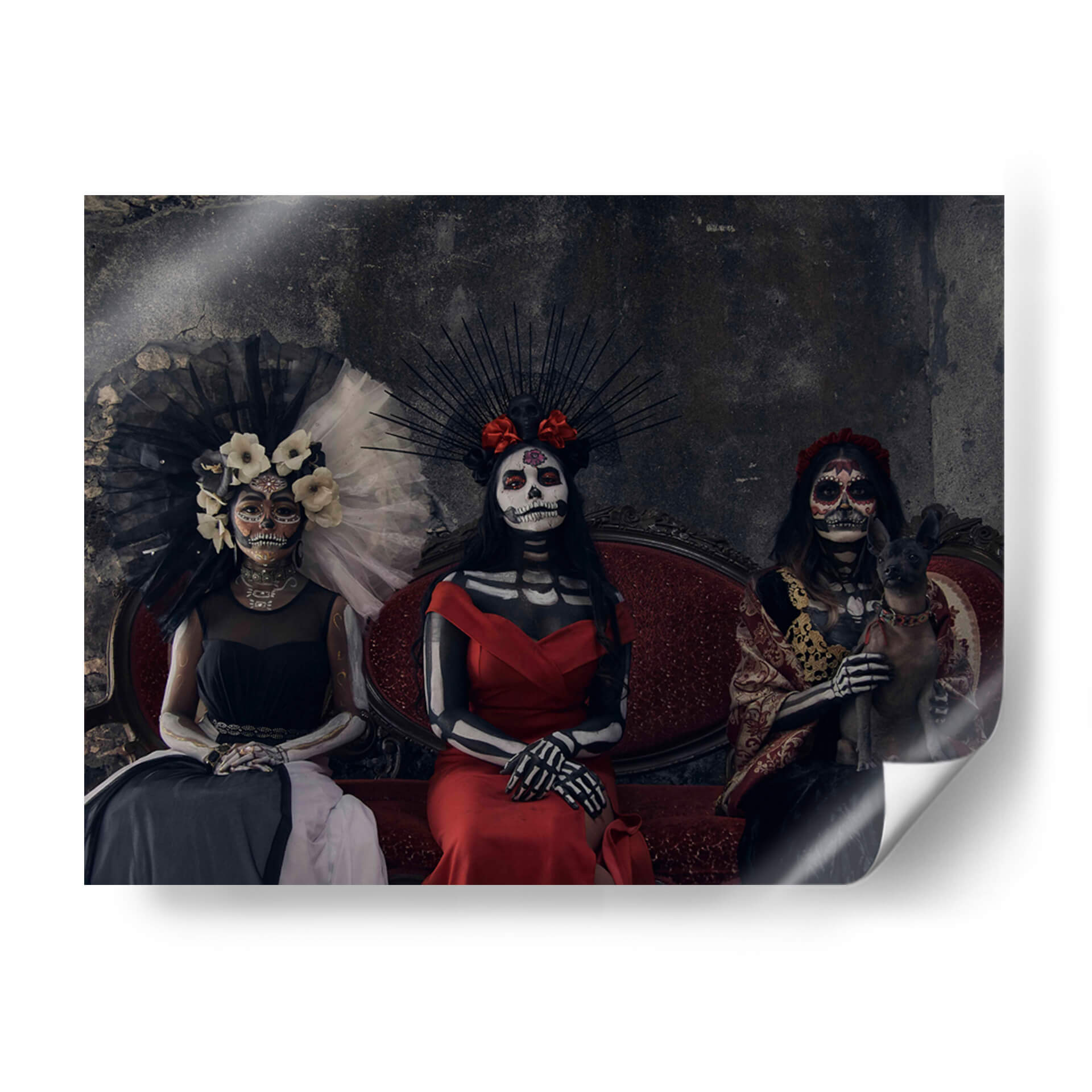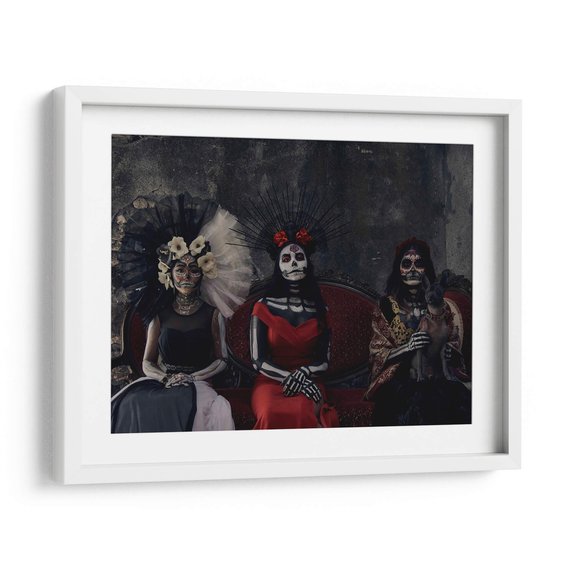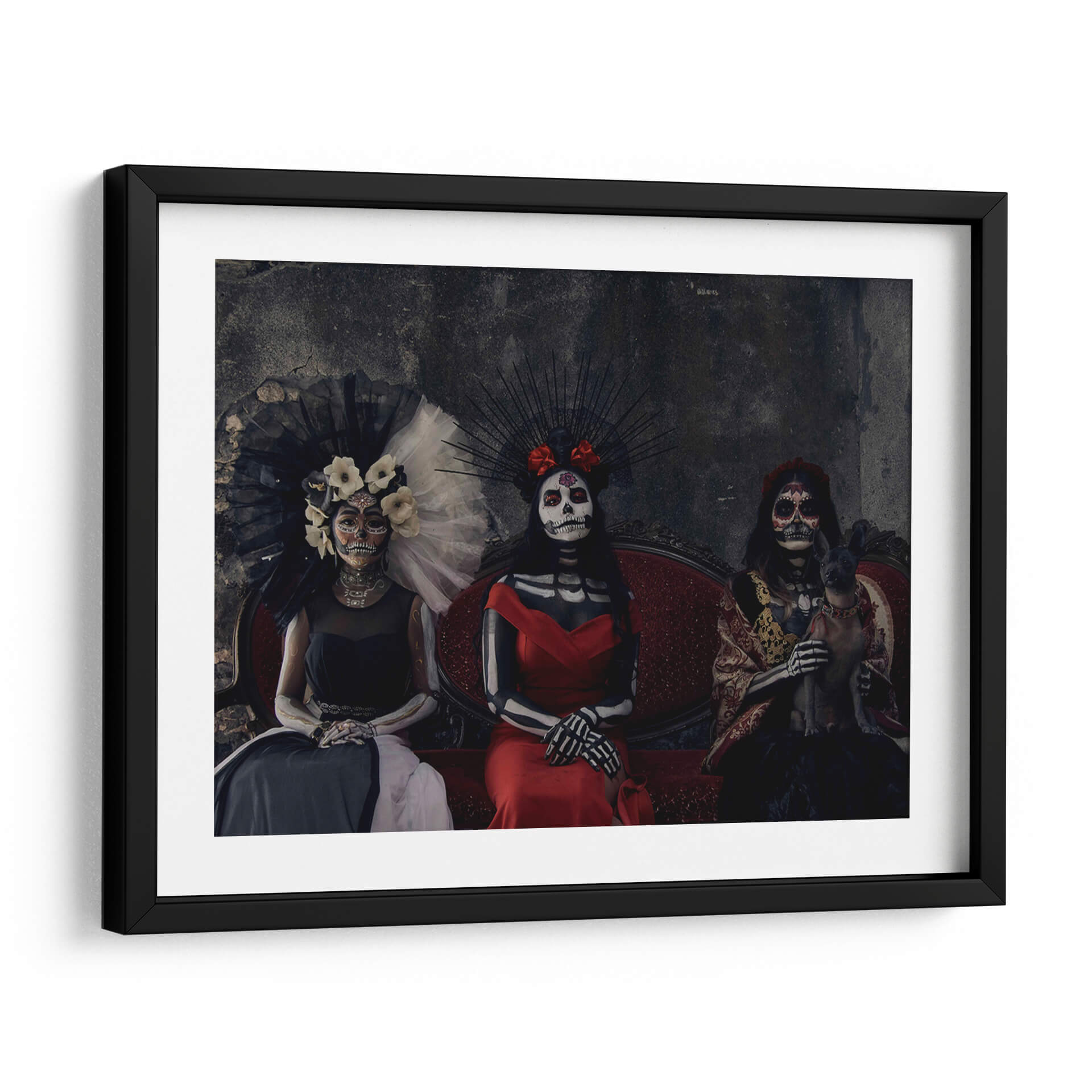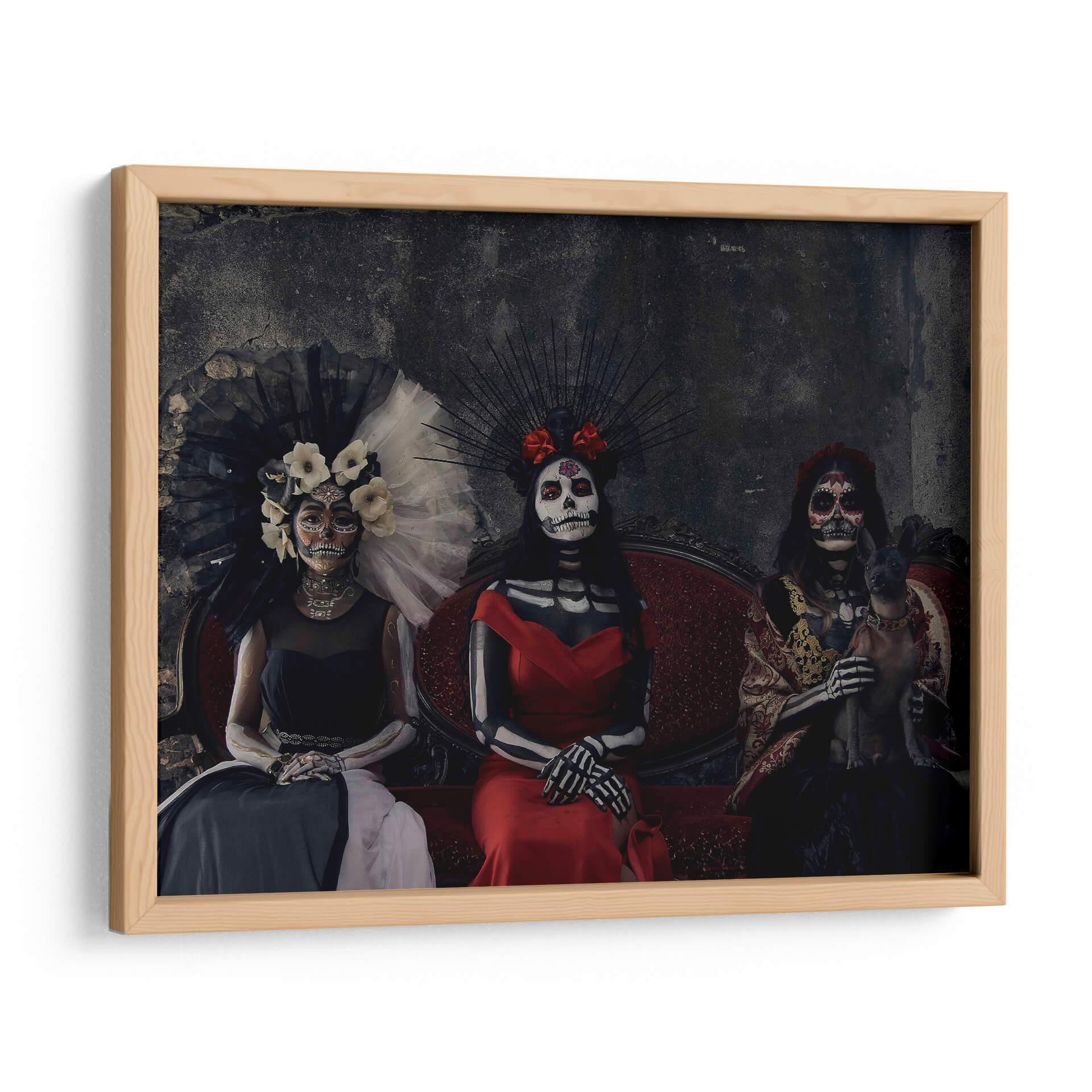 Sumérgete en la rica tradición mexicana con este cautivador cuadro decorativo "3 Catrinas y un perro sagrado" del artista Ignacio Arcas. La obra presenta tres figuras femeninas vestidas con atuendos elaborados y maquillaje de calavera, evocando la icónica tradición del Día de Muertos. Una de las figuras sostiene un pequeño perro sagrado, añadiendo un elemento inesperado y tierno a la composición. La paleta de colores se centra en tonos oscuros y ricos, con acentos vibrantes en los vestidos rojos y dorados, creando una atmósfera de misterio y solemnidad con un toque de elegancia. El fondo texturizado y oscuro realza la presencia de las Catrinas, invitando a la contemplación. Este cuadro decorativo es perfecto para añadir un toque de cultura, intriga y sofisticación a cualquier espacio, ya sea una sala de estar, un estudio o un comedor. Su estilo único y su profunda conexión con las tradiciones lo convierten en una pieza de conversación que seguramente impresionará a tus invitados y resonará con aquellos que aprecian el arte con alma y significado. Ideal para quienes buscan una decoración de pared que combine historia, arte y una estética impactante.